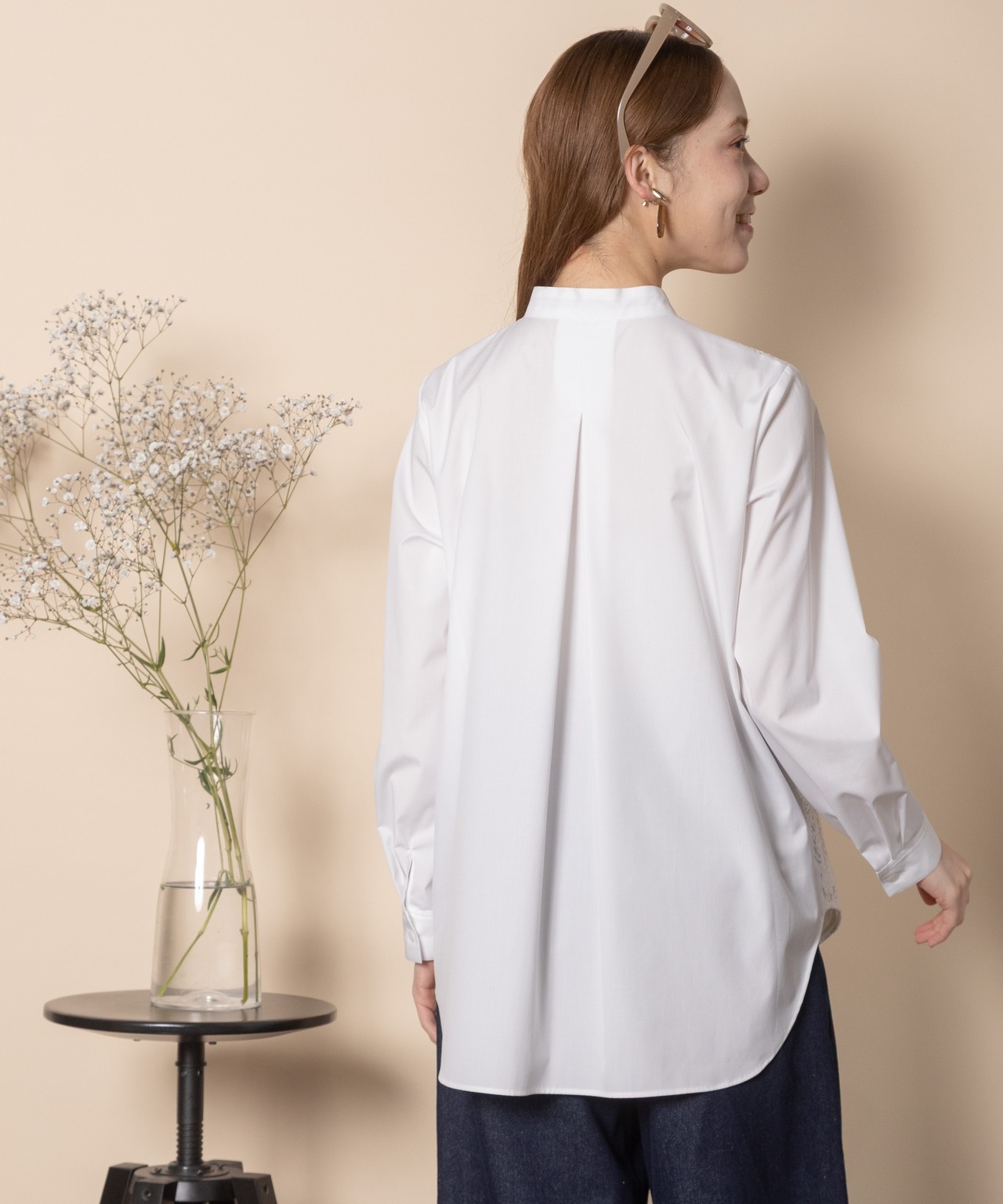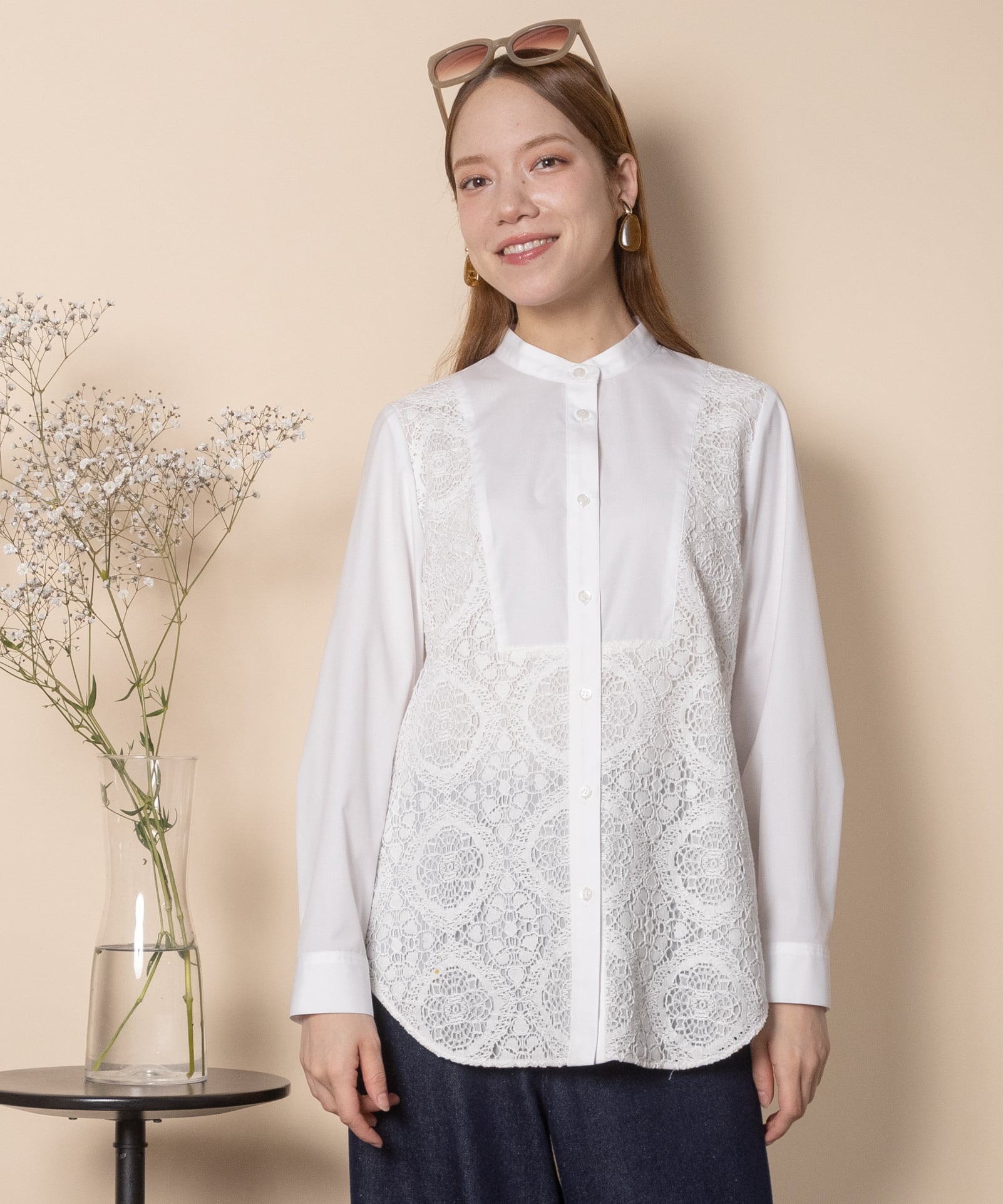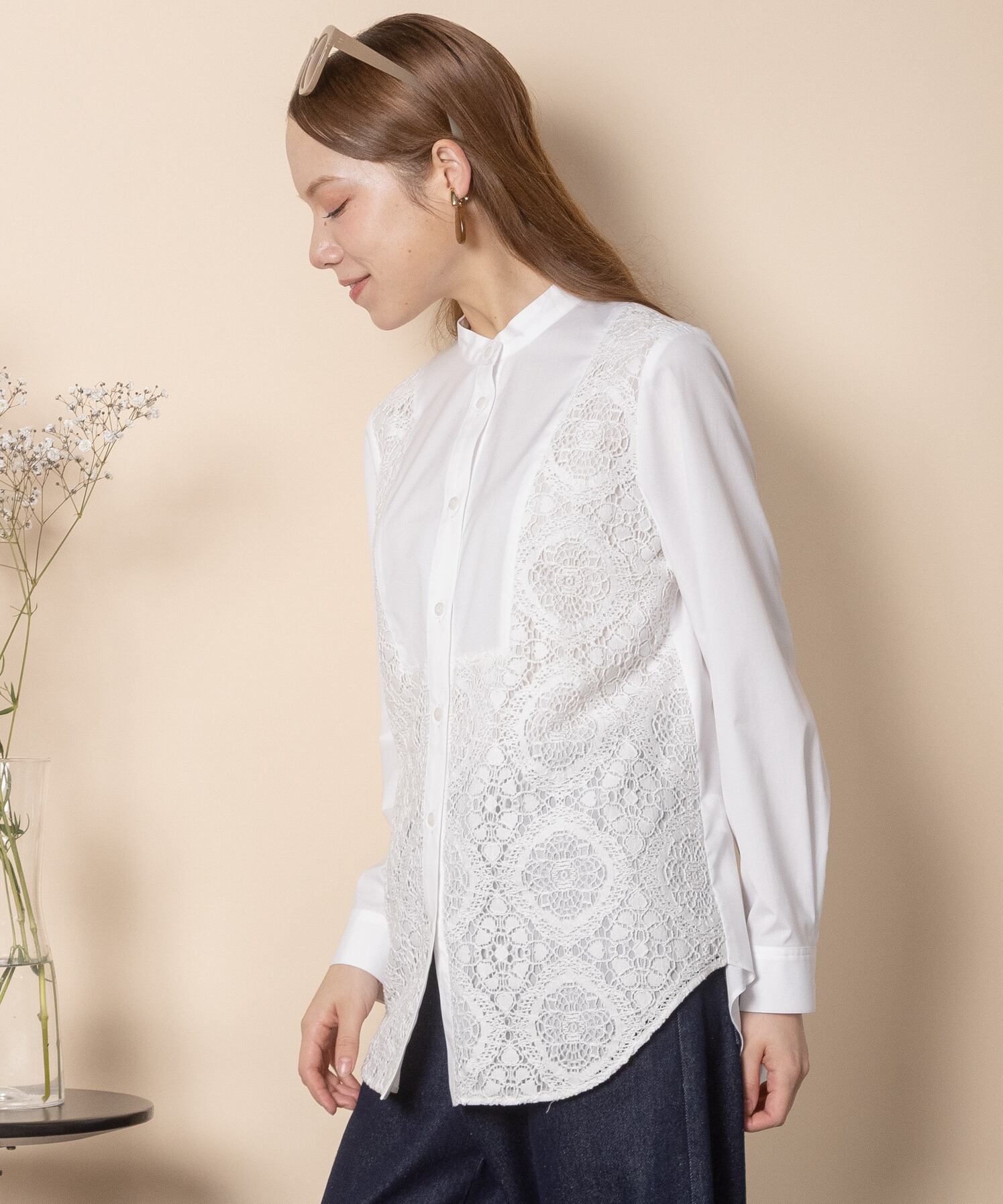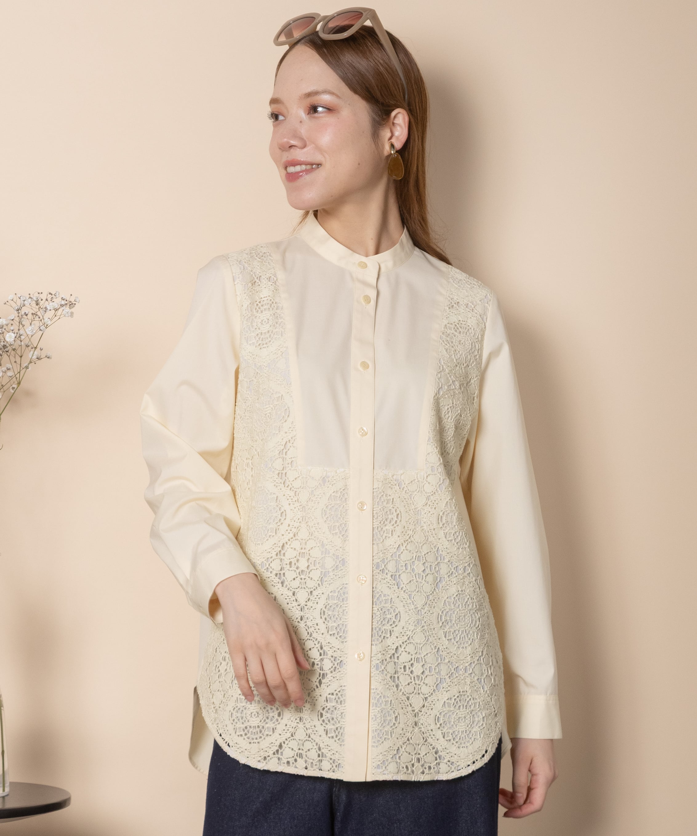 ヴィンテージ風のレースをパッチワーク風に組み合わせたシャツブラウス。首元はシンプルなバンドカラー、バックはタック使いのフレアシルエット、細部までこだわりのあるアイテム。MADE IN JAPANの美しい仕立てのおとなのブラウスです。