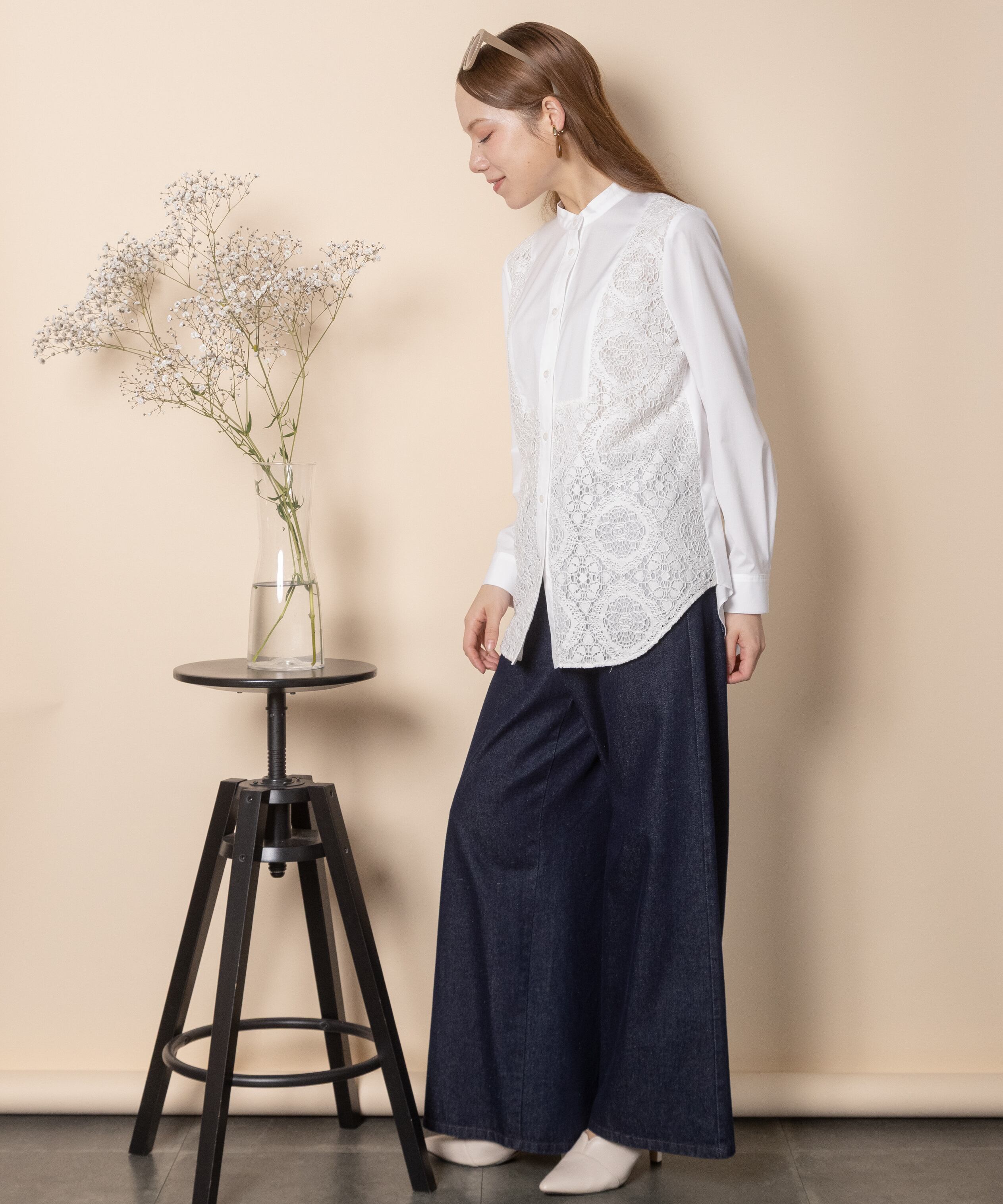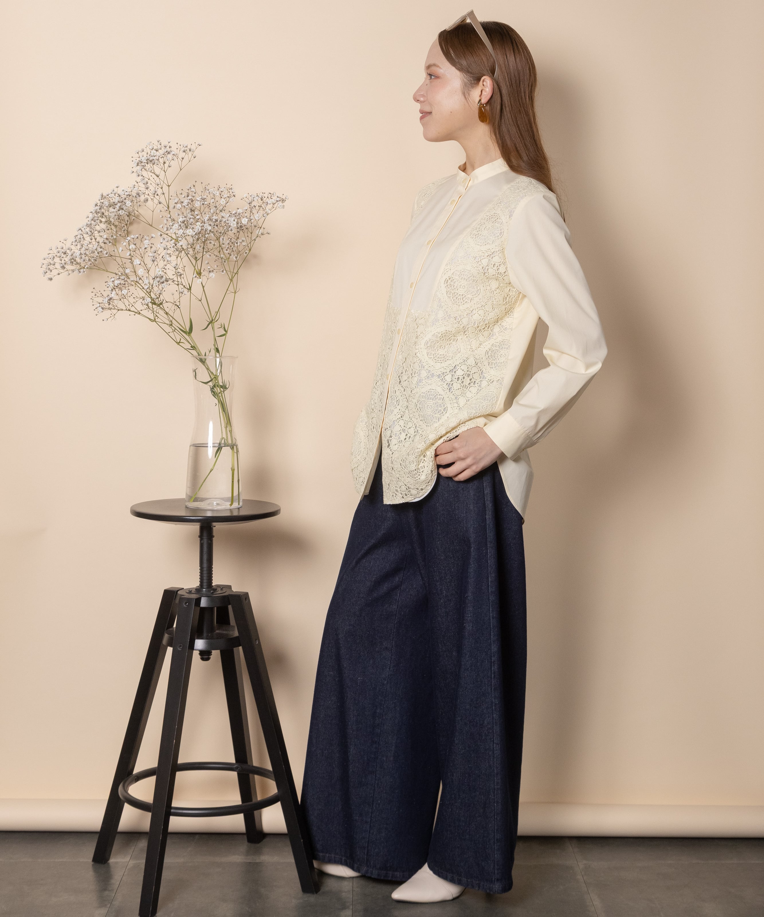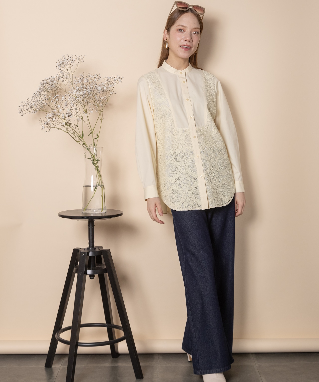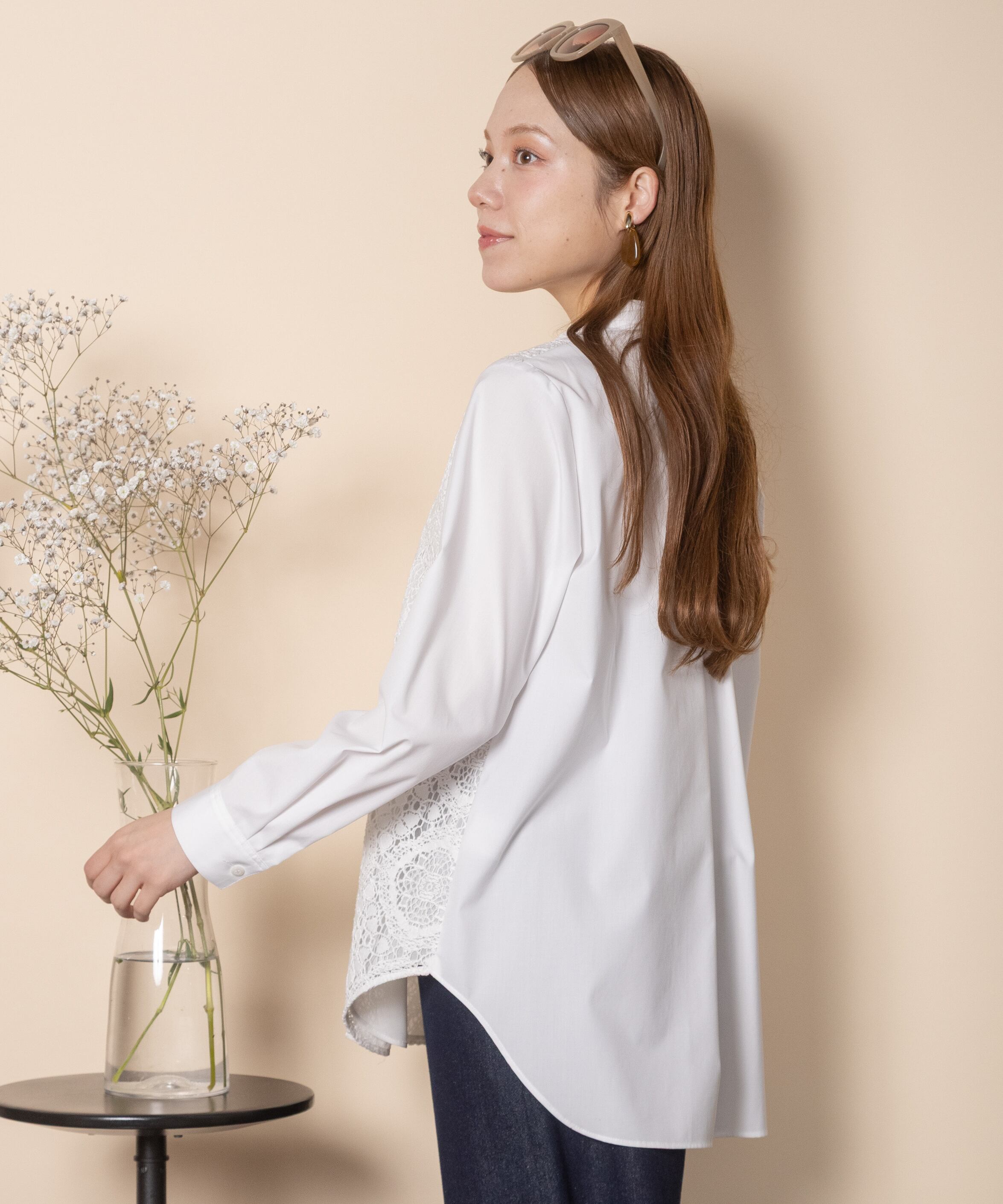 ヴィンテージ風のレースをパッチワーク風に組み合わせたシャツブラウス。首元はシンプルなバンドカラー、バックはタック使いのフレアシルエット、細部までこだわりのあるアイテム。MADE IN JAPANの美しい仕立てのおとなのブラウスです。