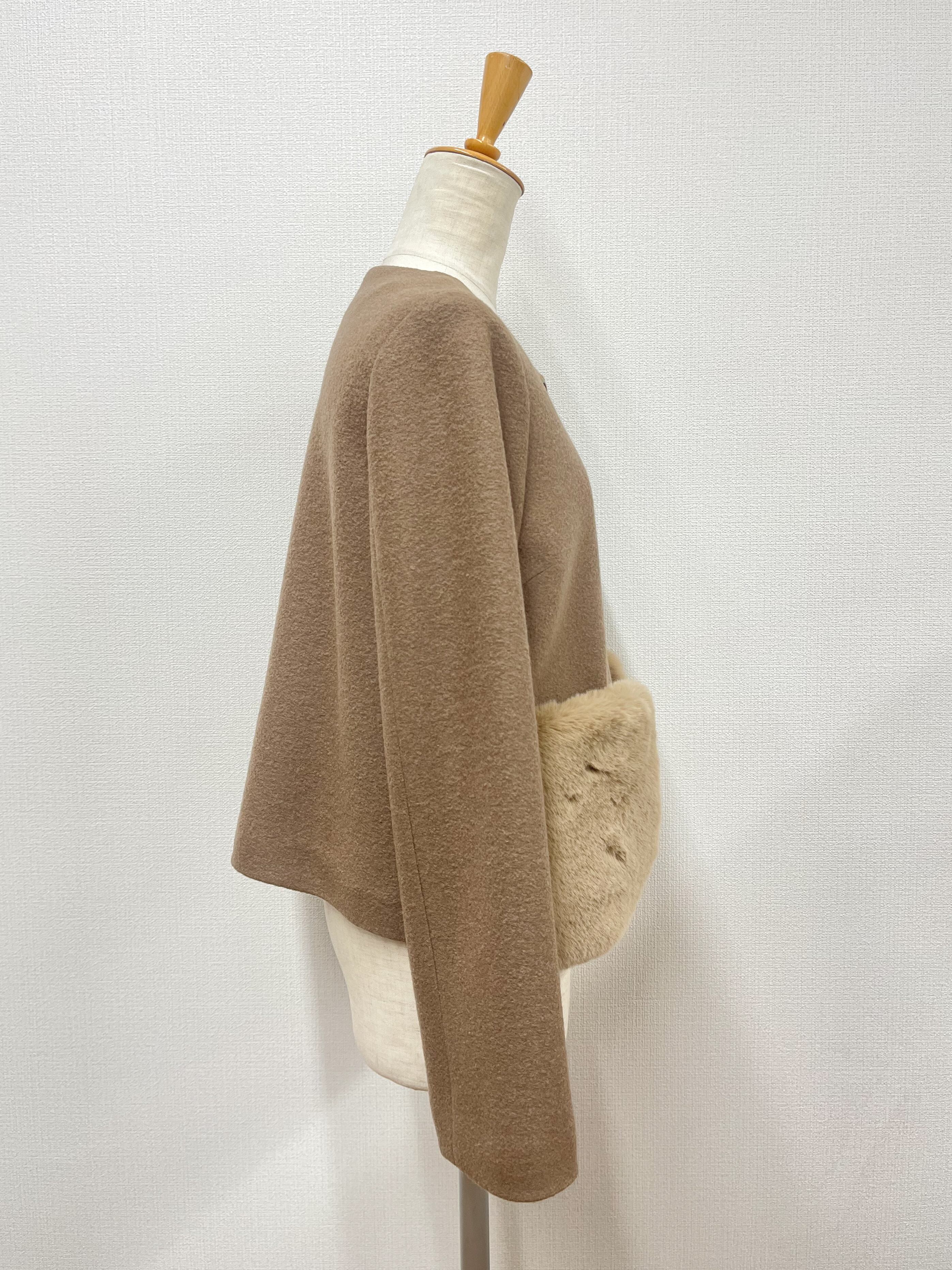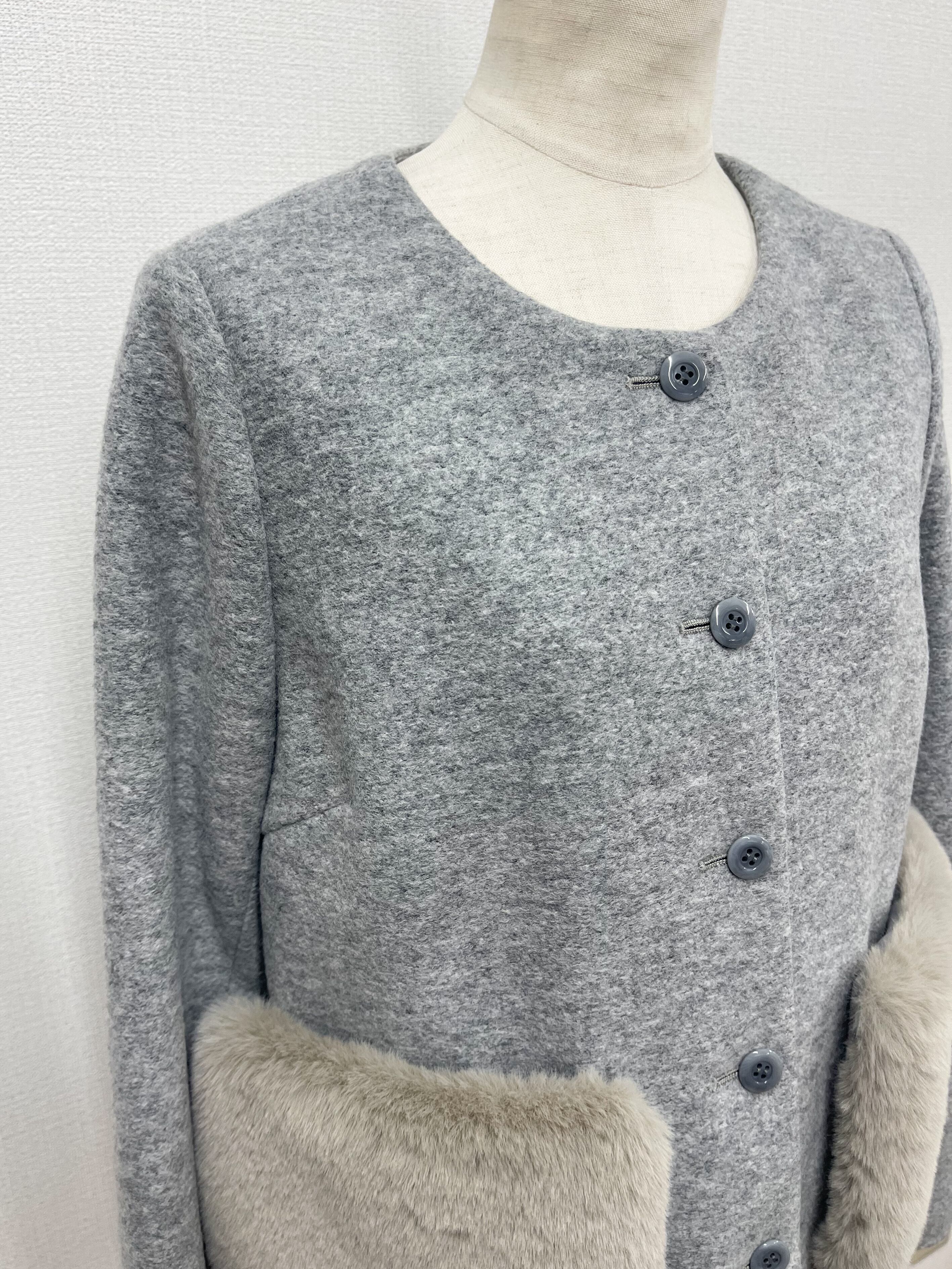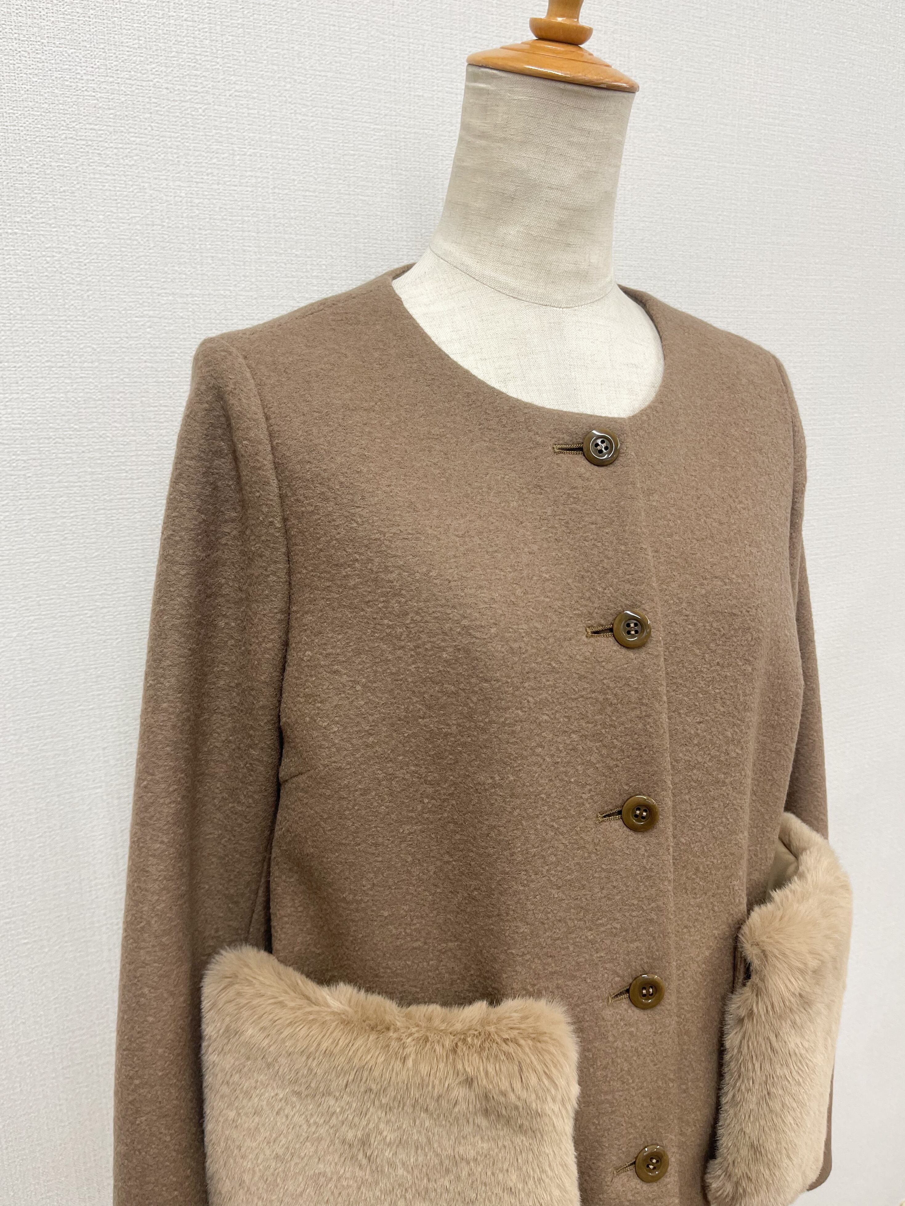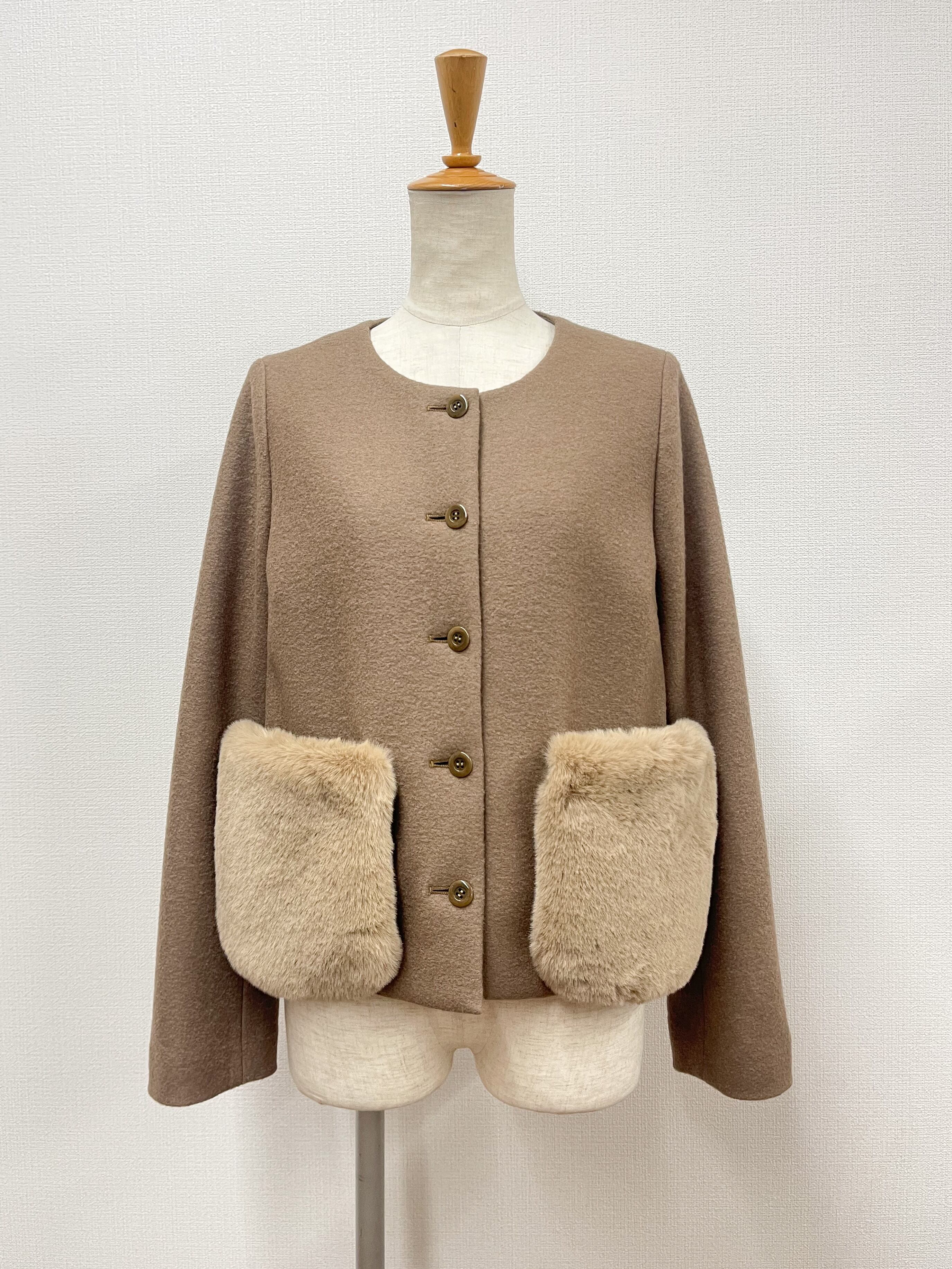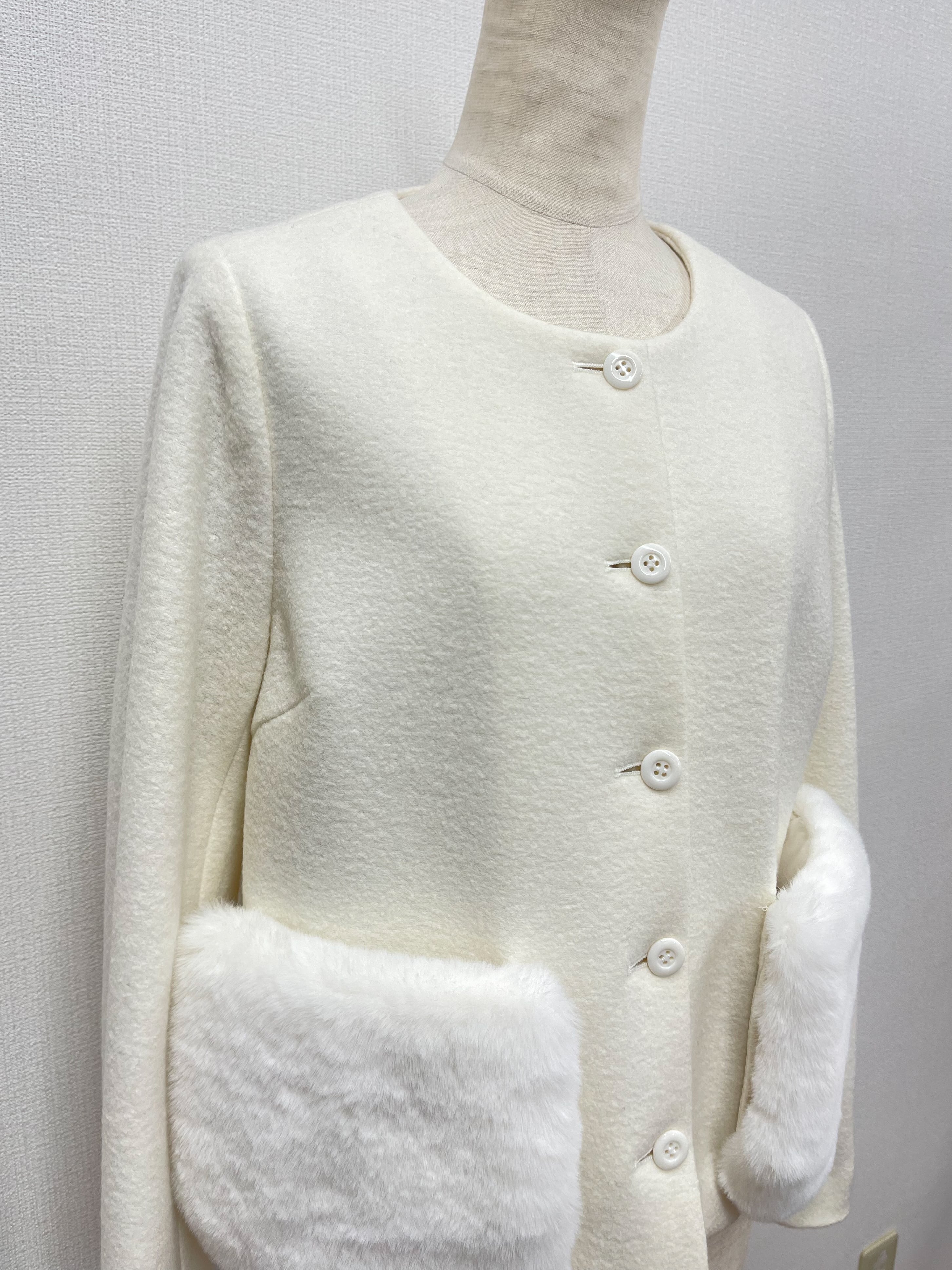 ウールの上質素材を使用したショートコート。トレンドのポケットファーは取り外し可。ベースはシンプルなノーカラーデザイン。大人カジュアル派、エレガント派どちらにもおすすめ。