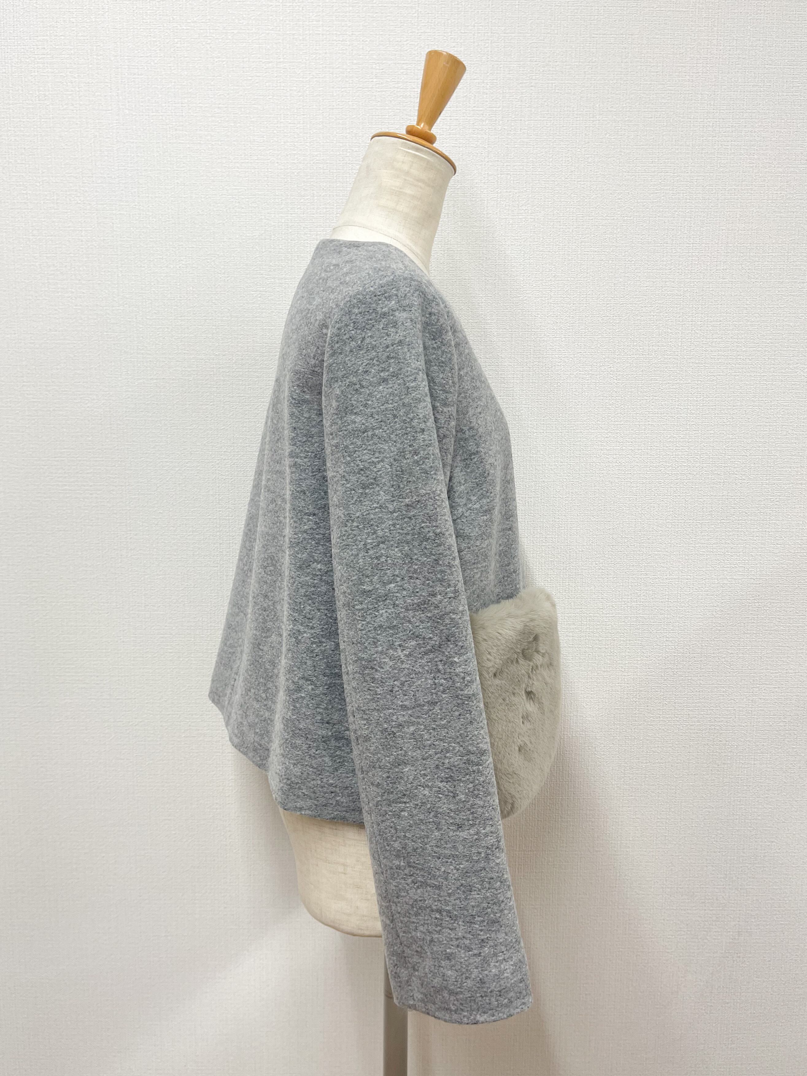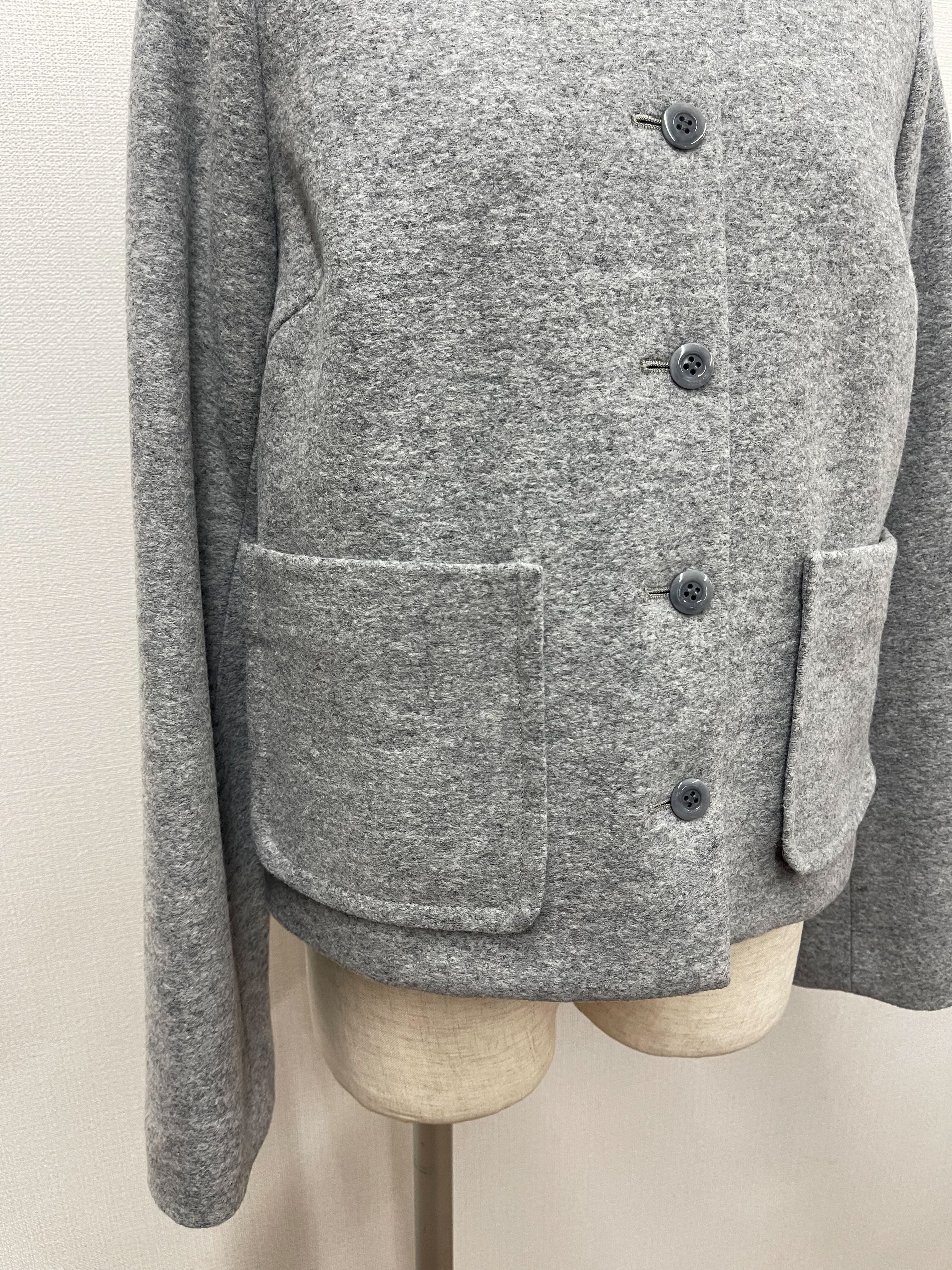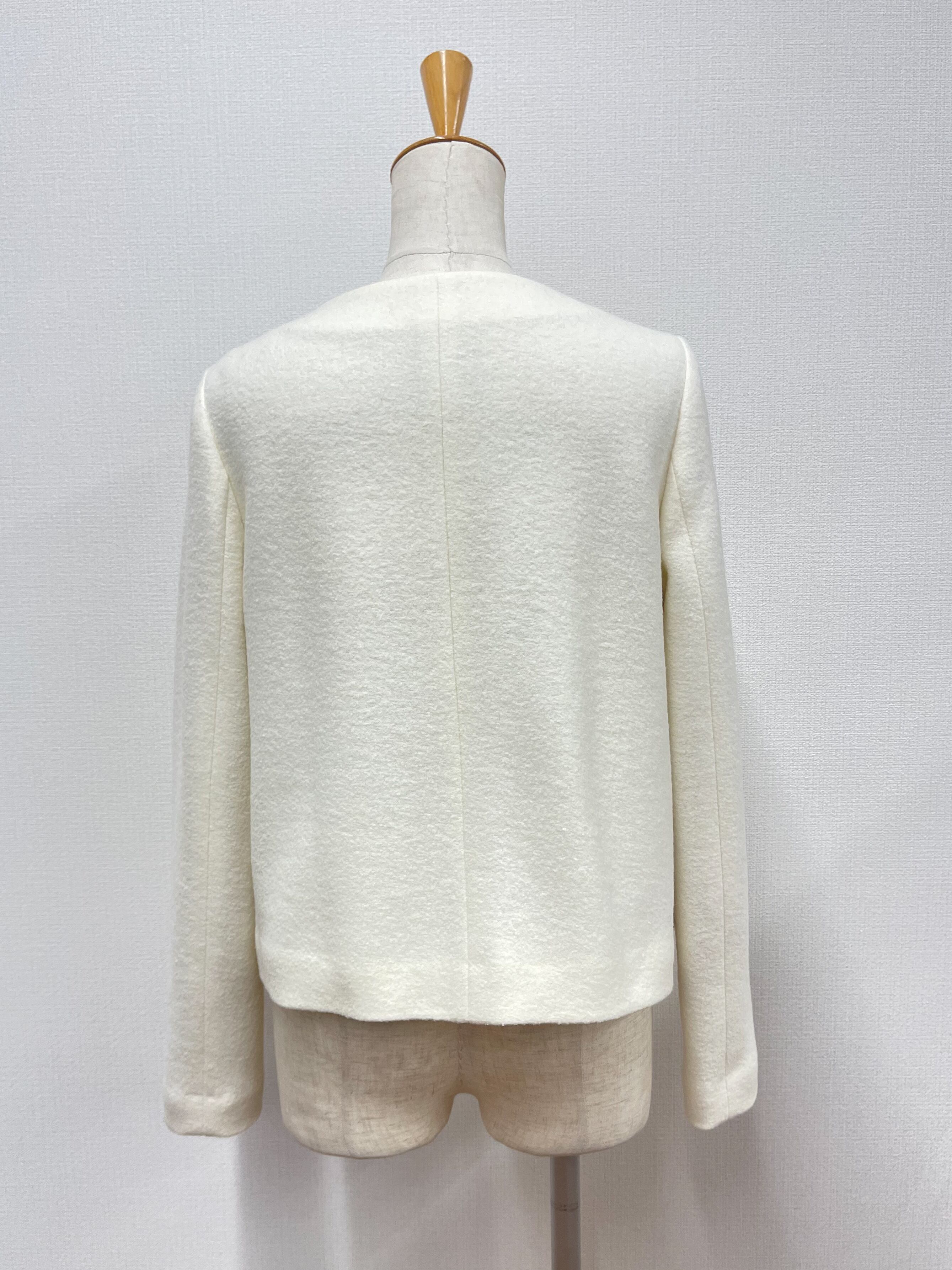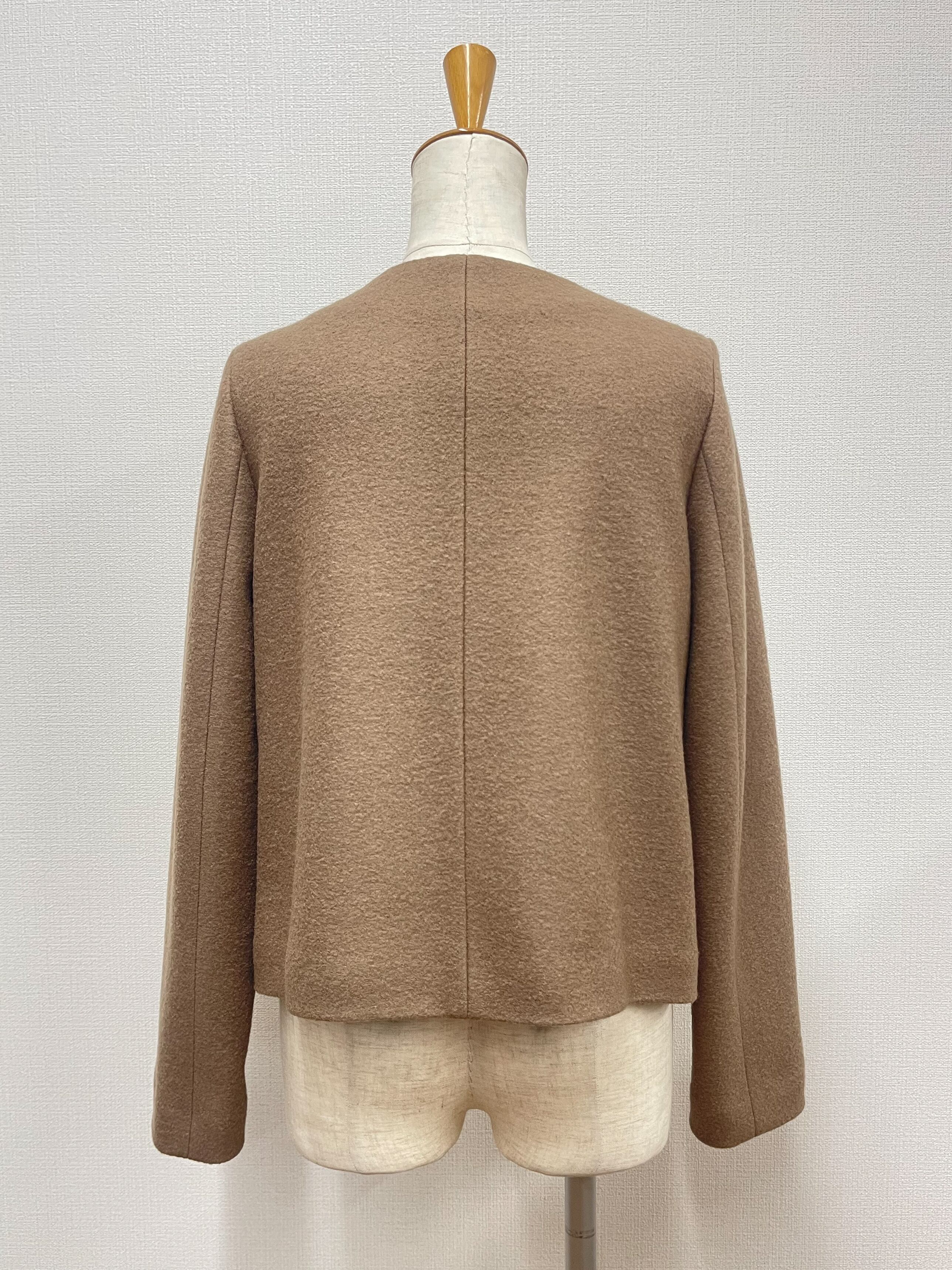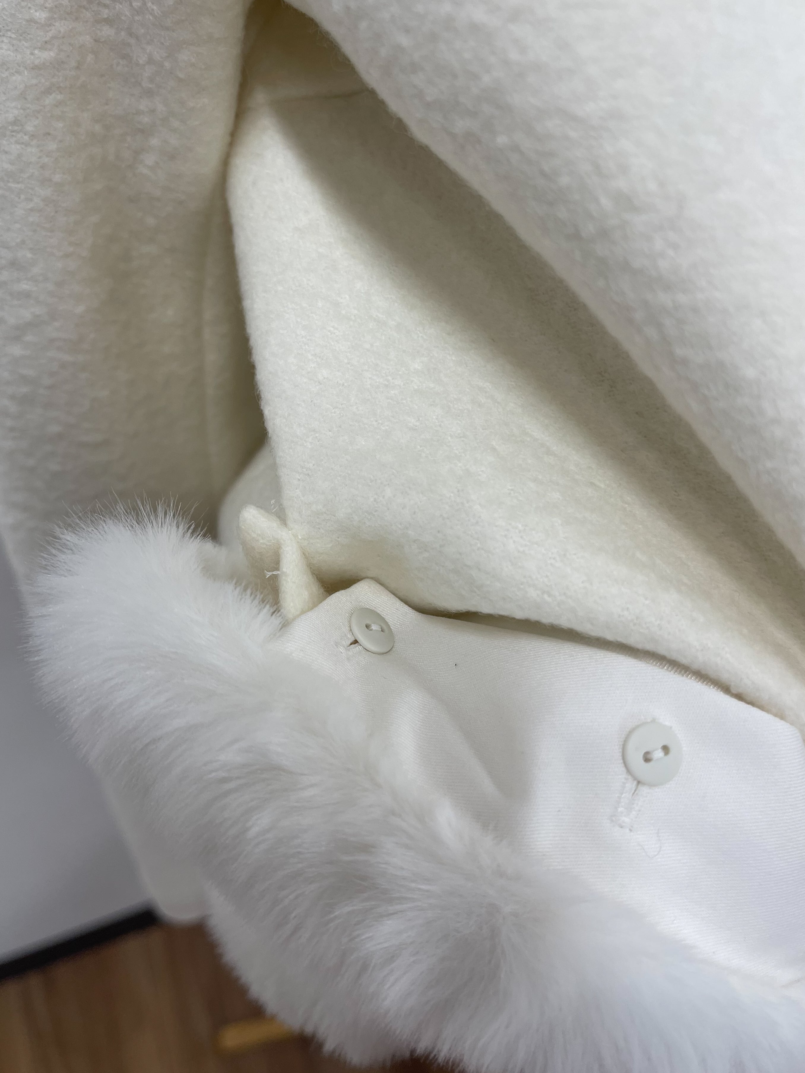 ウールの上質素材を使用したショートコート。トレンドのポケットファーは取り外し可。ベースはシンプルなノーカラーデザイン。大人カジュアル派、エレガント派どちらにもおすすめ。