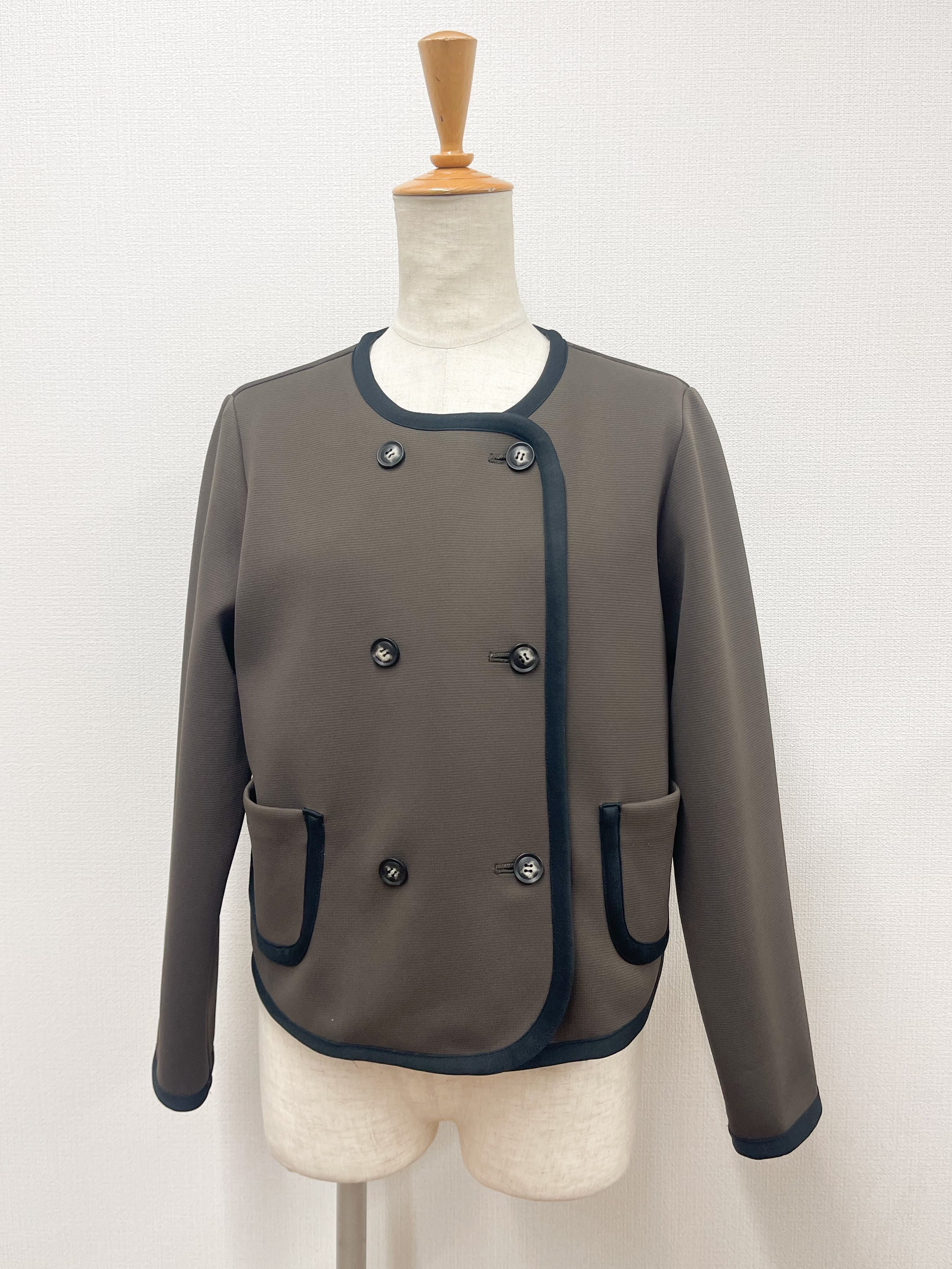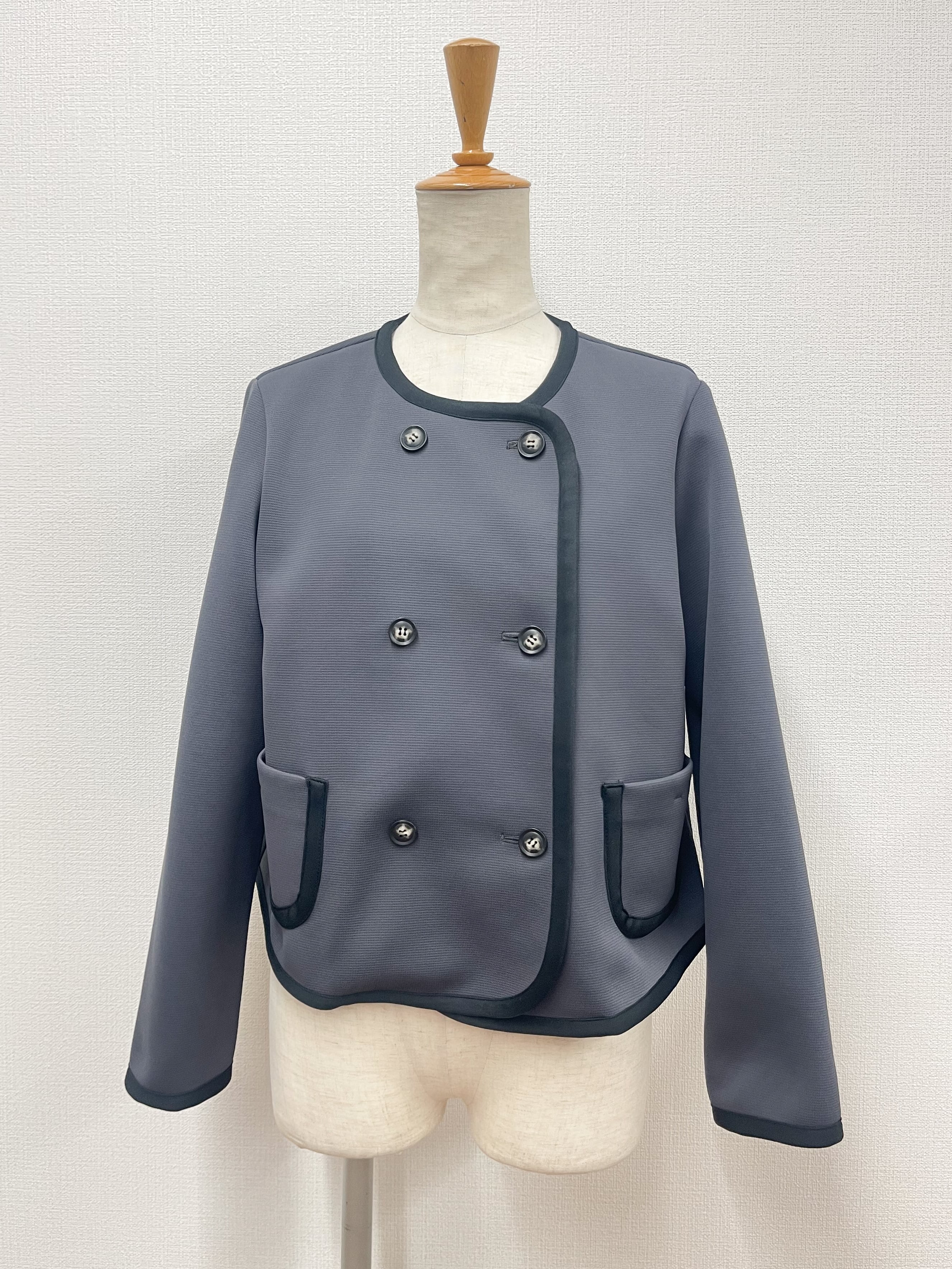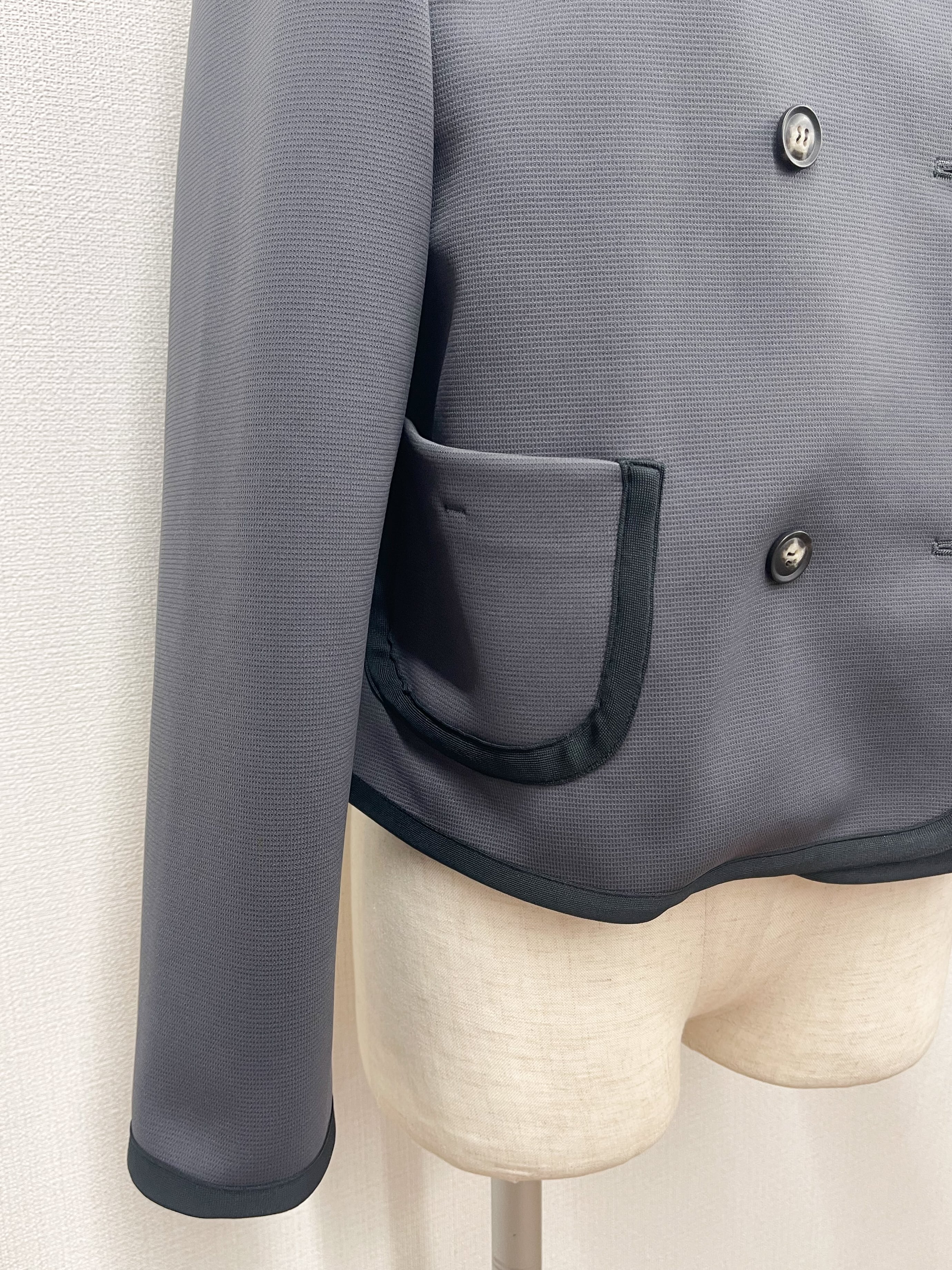 伸縮性あるカット素材のショートジャケット。ダブルボタンのノーカラー、バイカラーのサテンのトリミング、丸みのあるポケットとこだわりのデザインポイント。