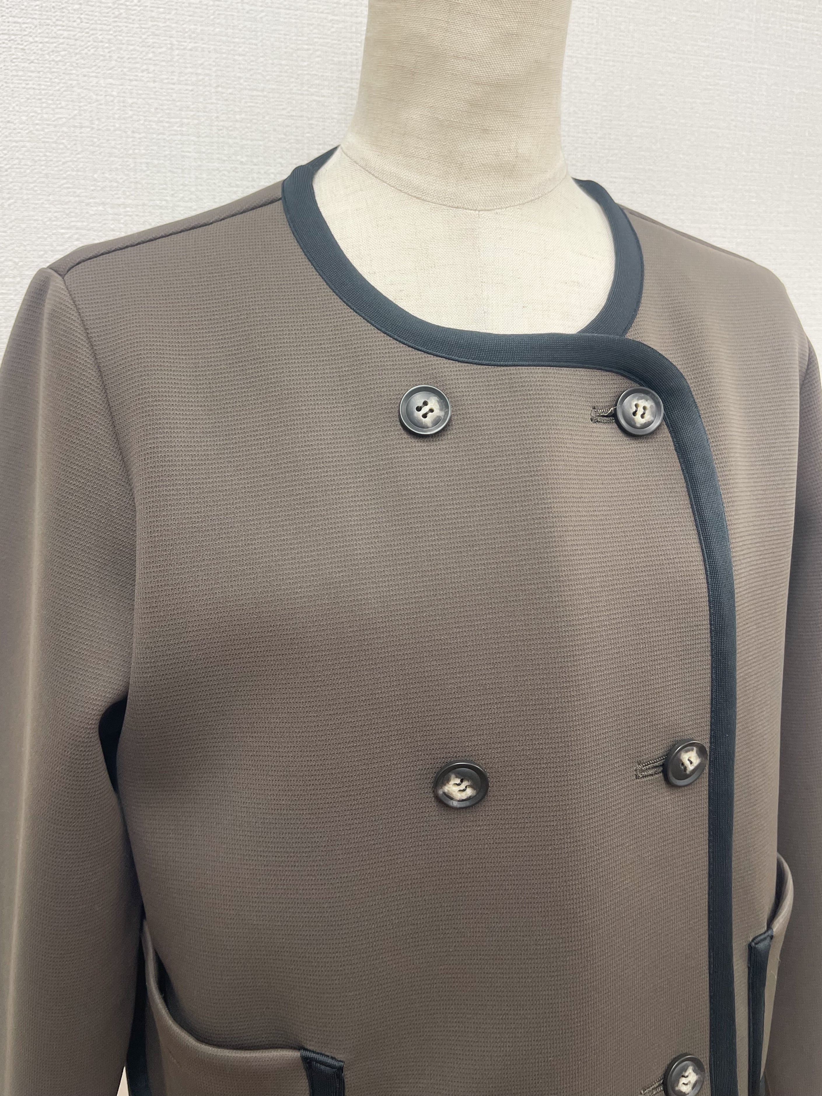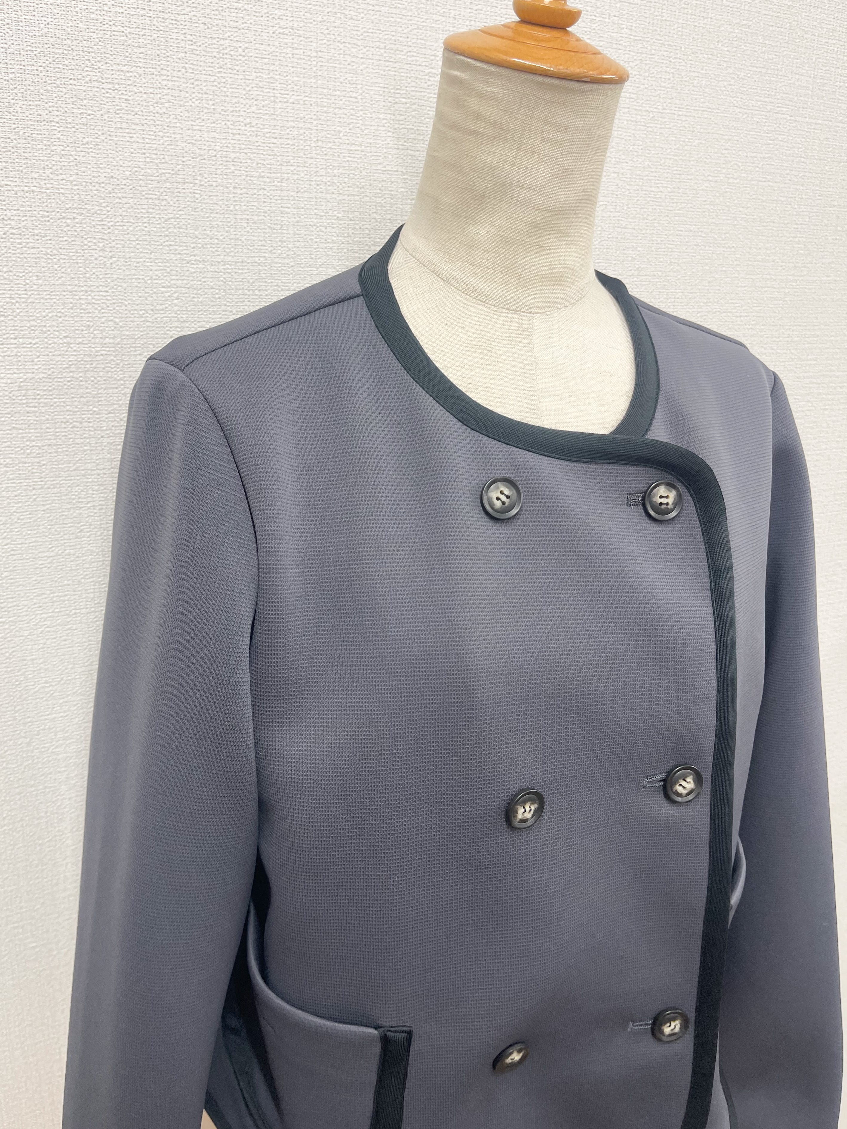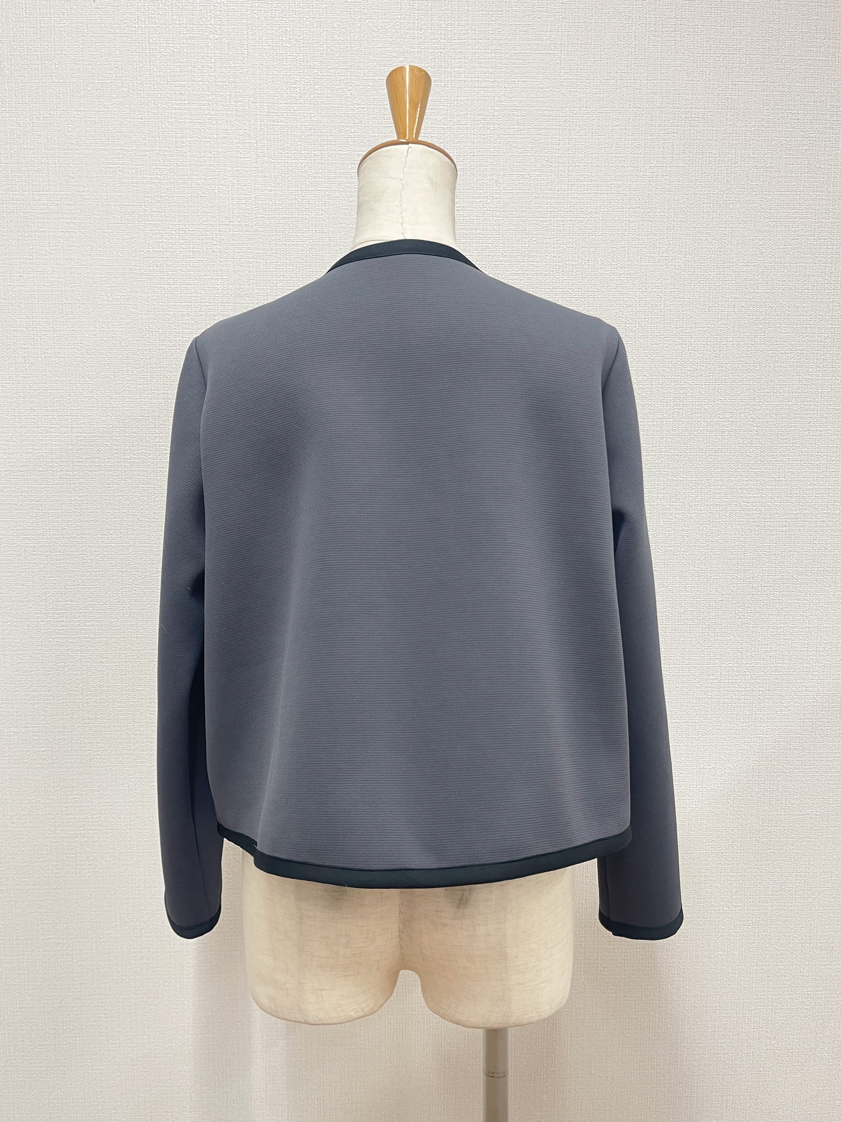 伸縮性あるカット素材のショートジャケット。ダブルボタンのノーカラー、バイカラーのサテンのトリミング、丸みのあるポケットとこだわりのデザインポイント。