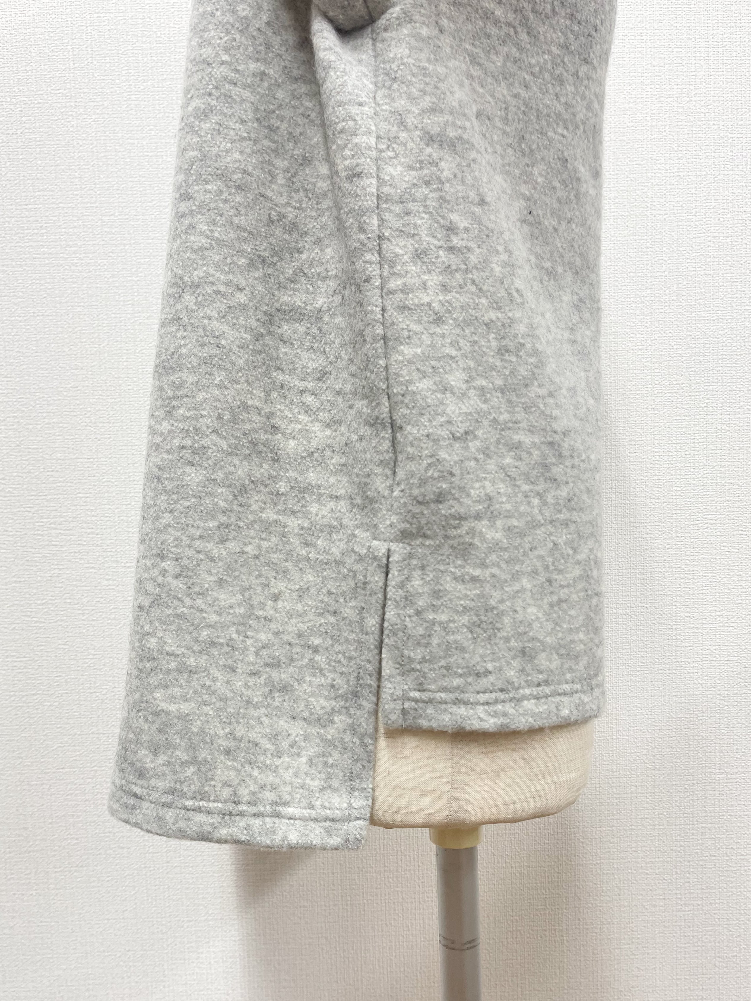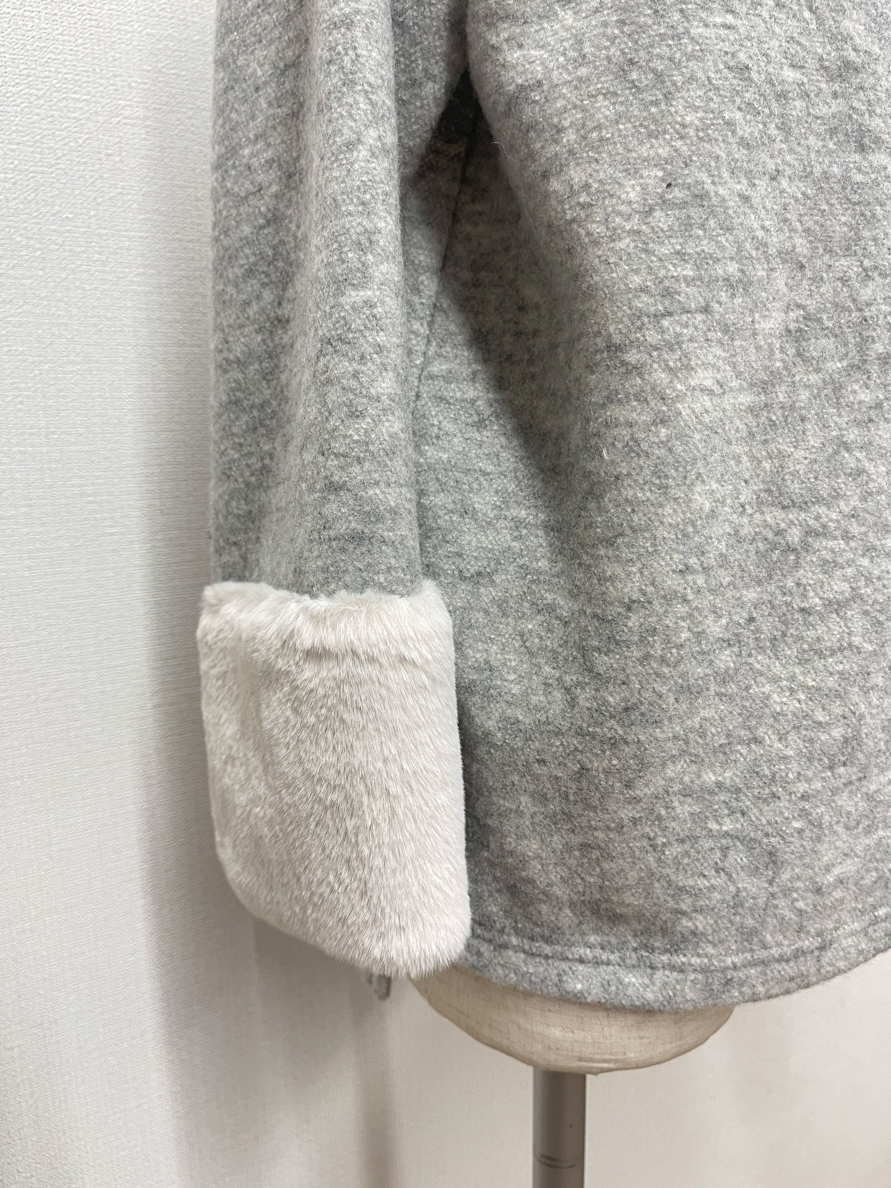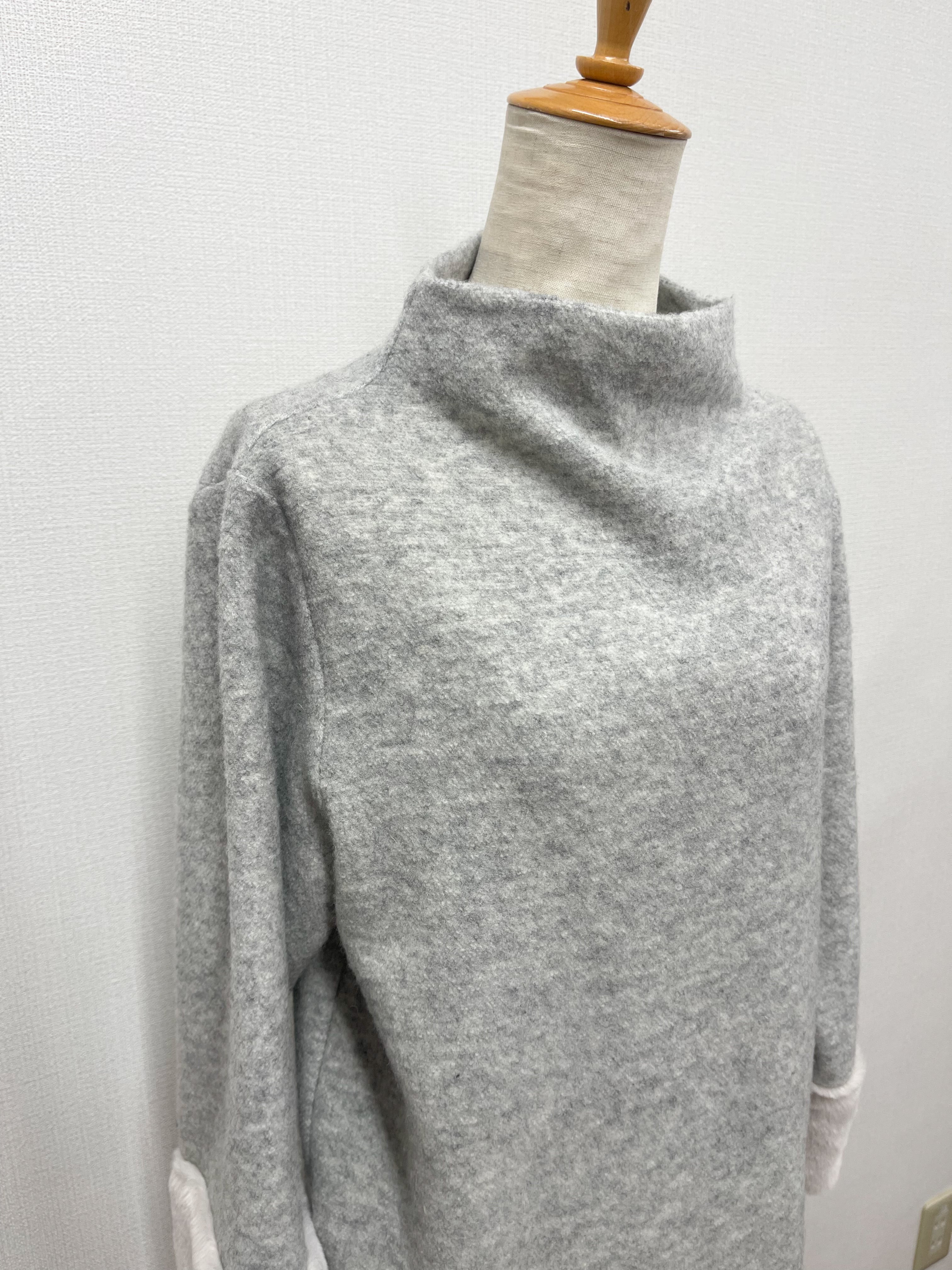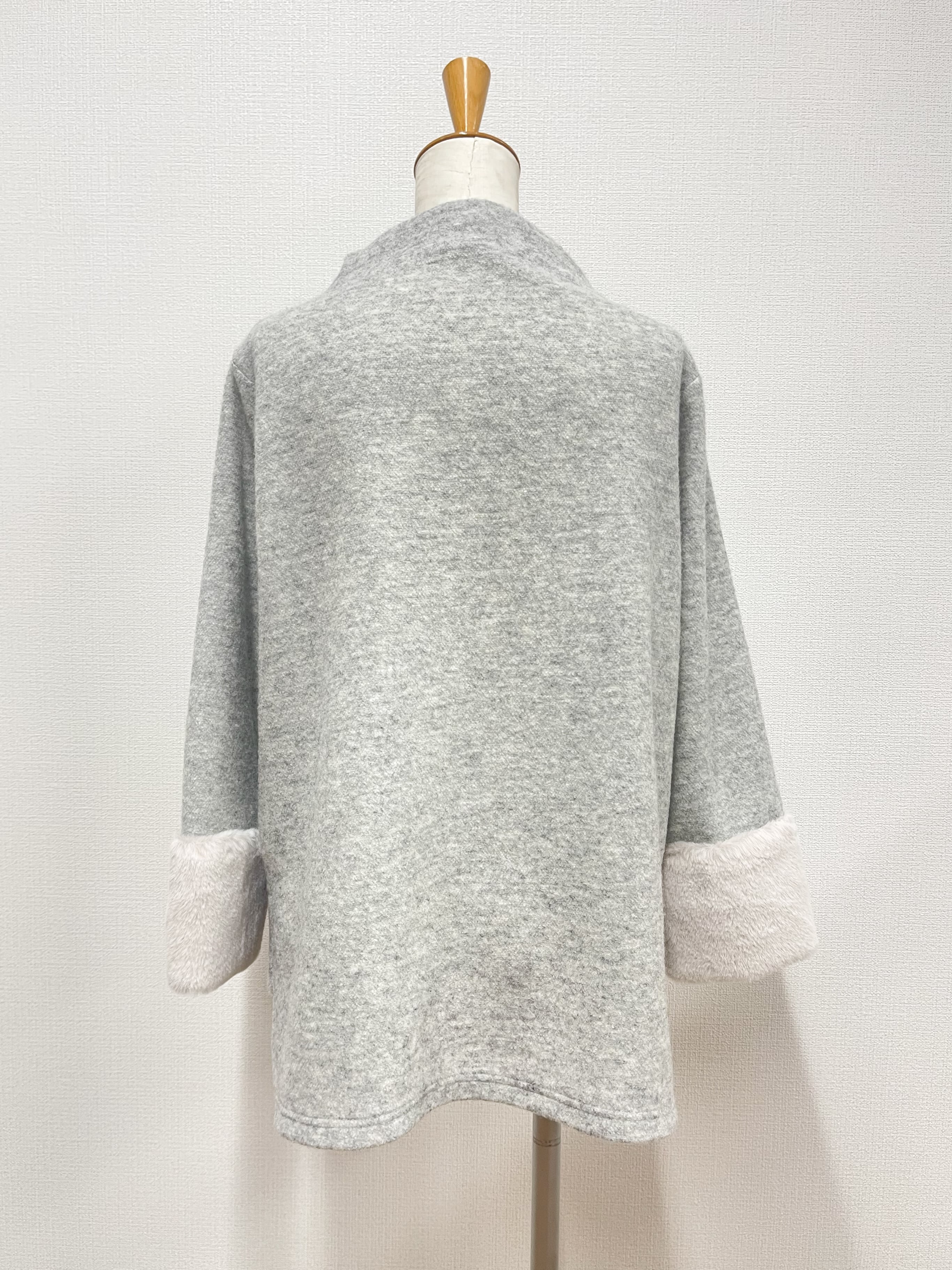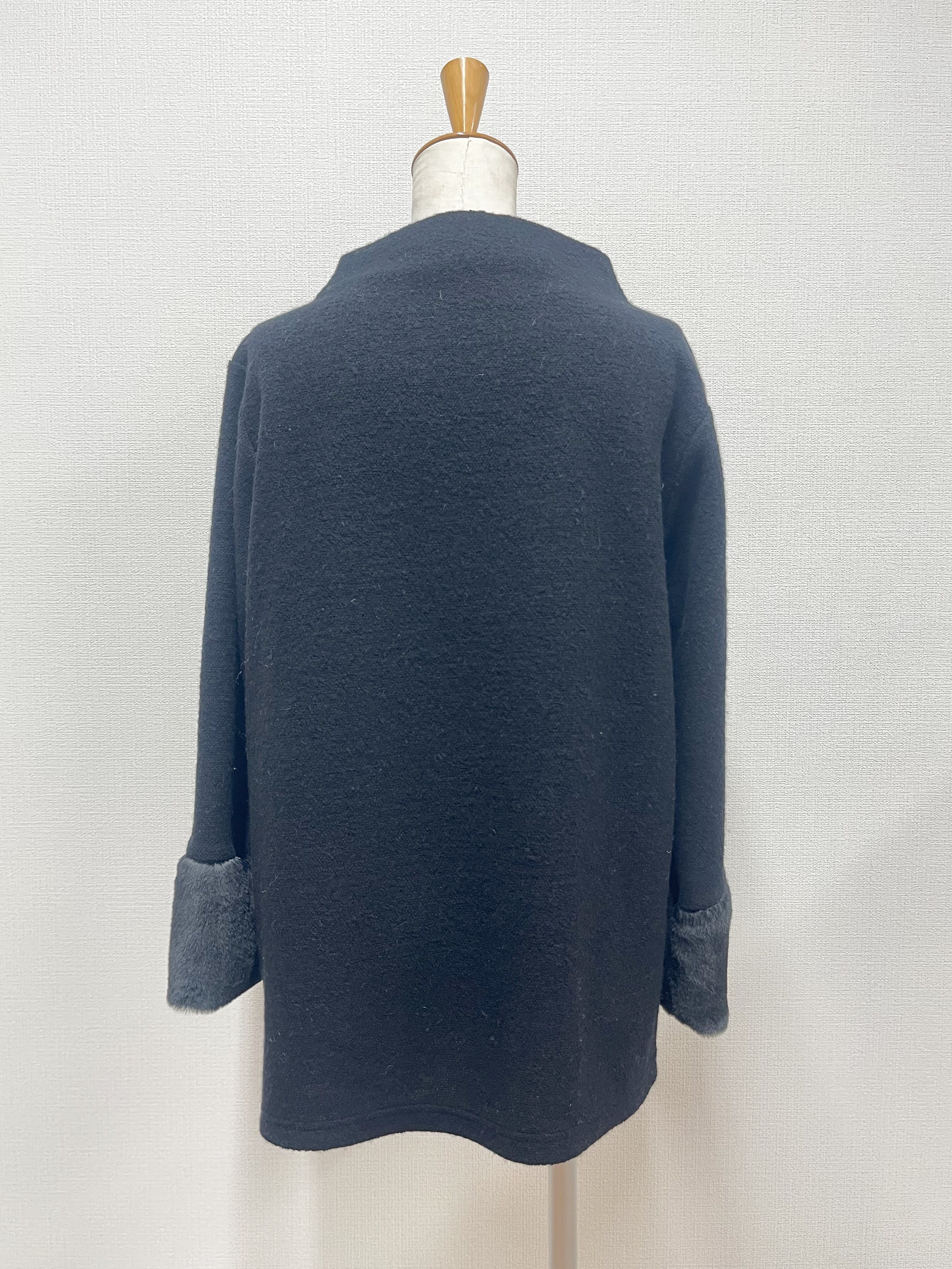 袖部分がファーデザインのモードとエレガンスがミックスされた大人カジュアルアイテム。首周りはゆとりあるボトルネックにAラインシルエットとストレスフリー。後ろが長めのサイドスリットで腰回りも安心。
