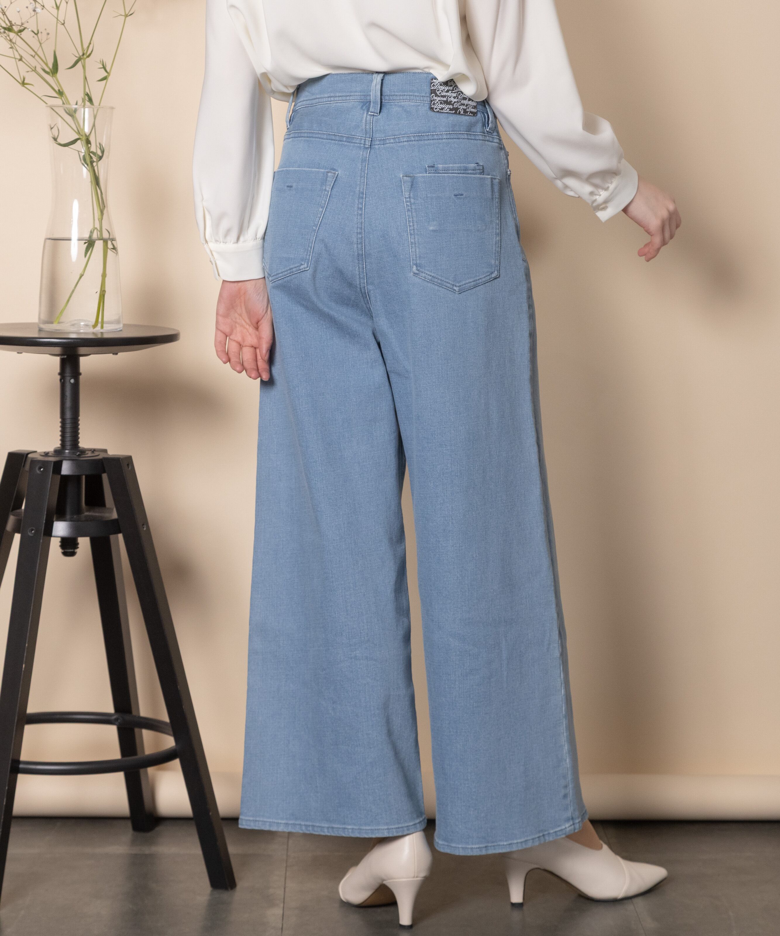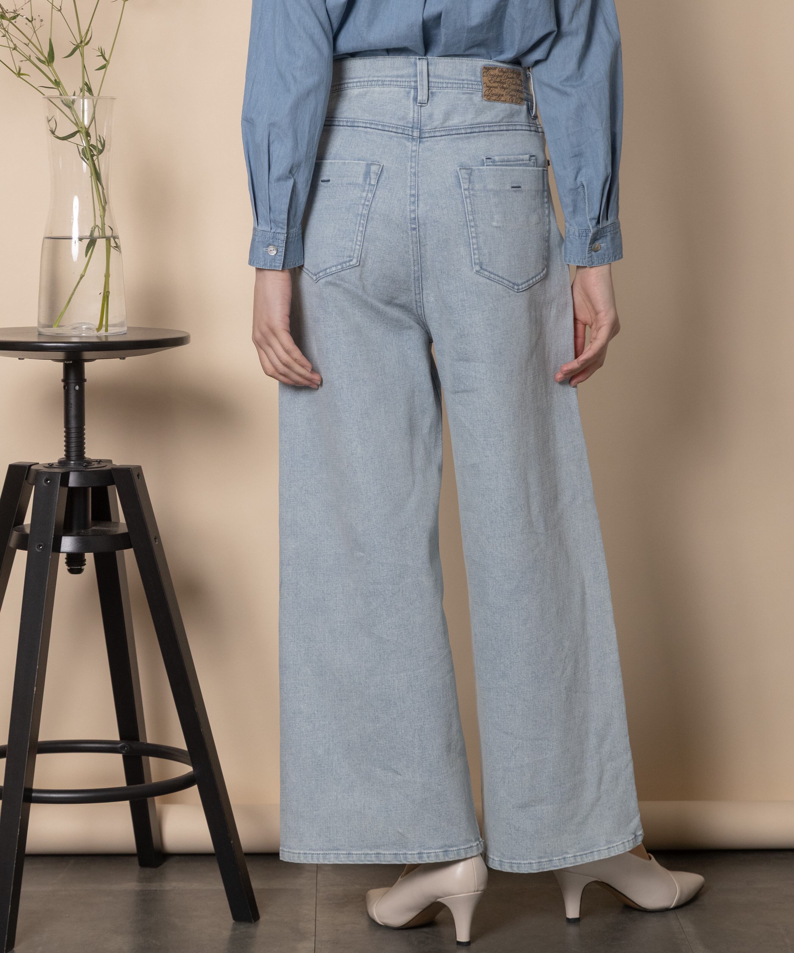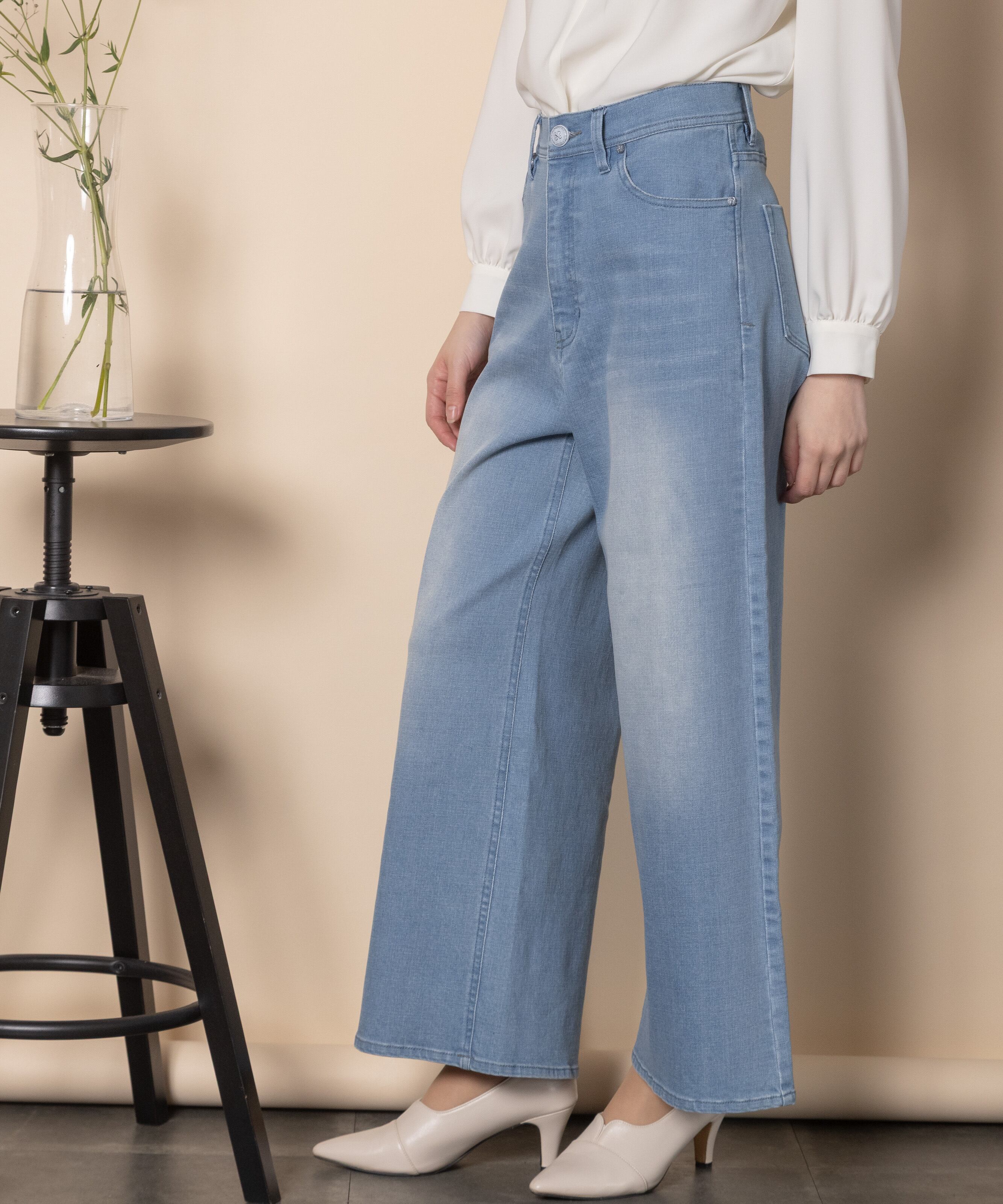 9オンスの定番ワイドフレアシルエット。通常のウエスト位置、程よい太さのワイドストレートタイプで脚長効果を叶えるデニムパンツ。