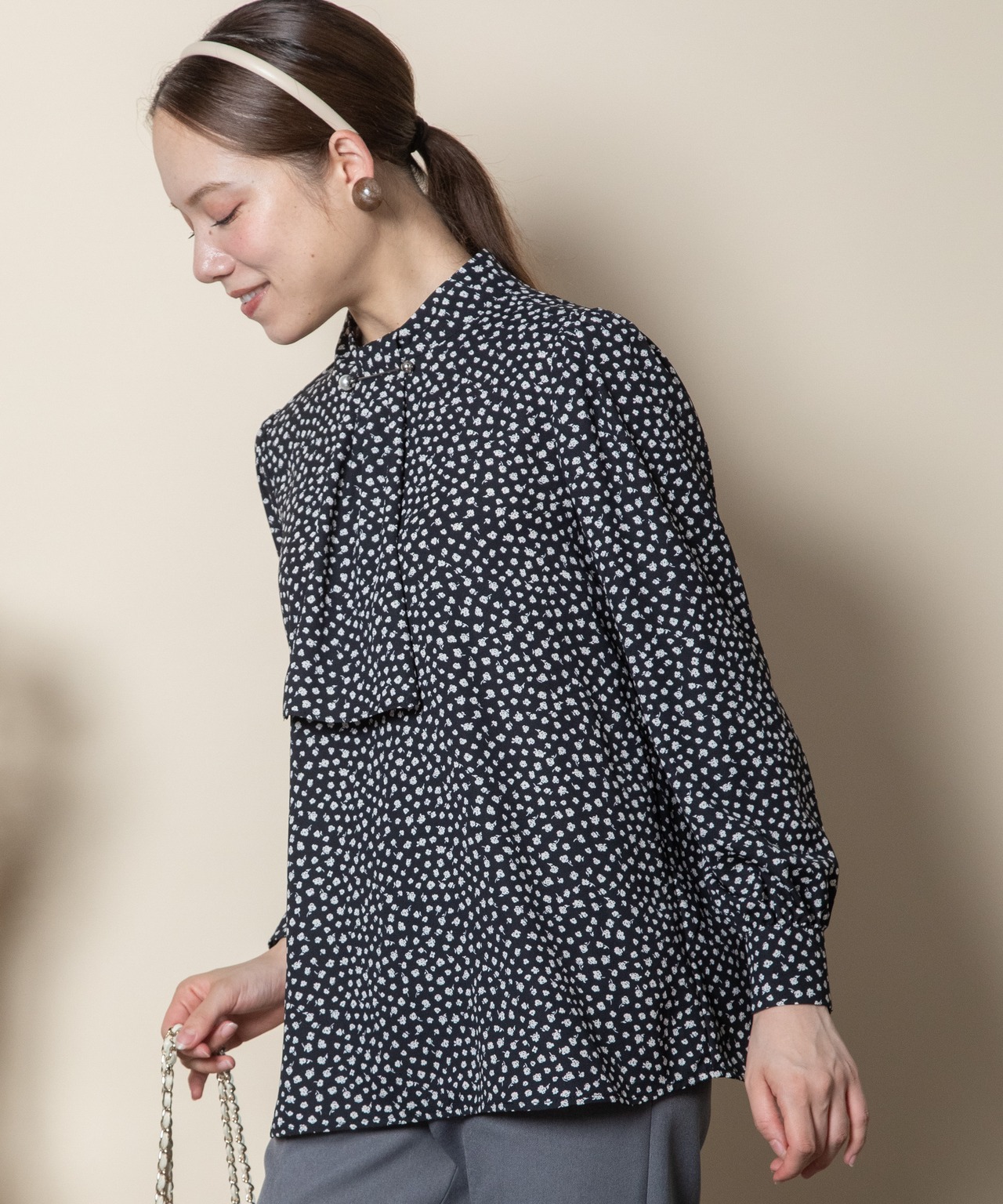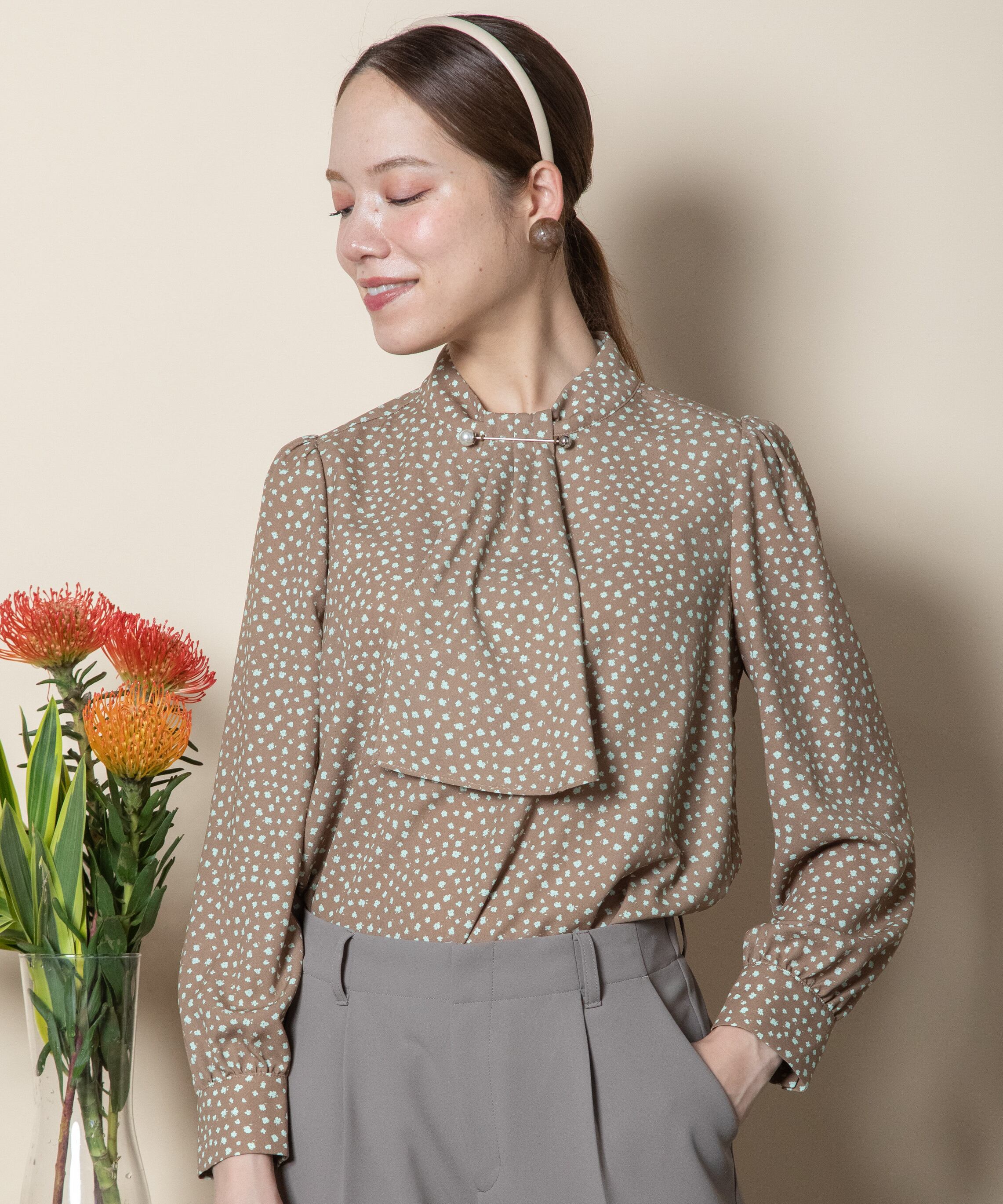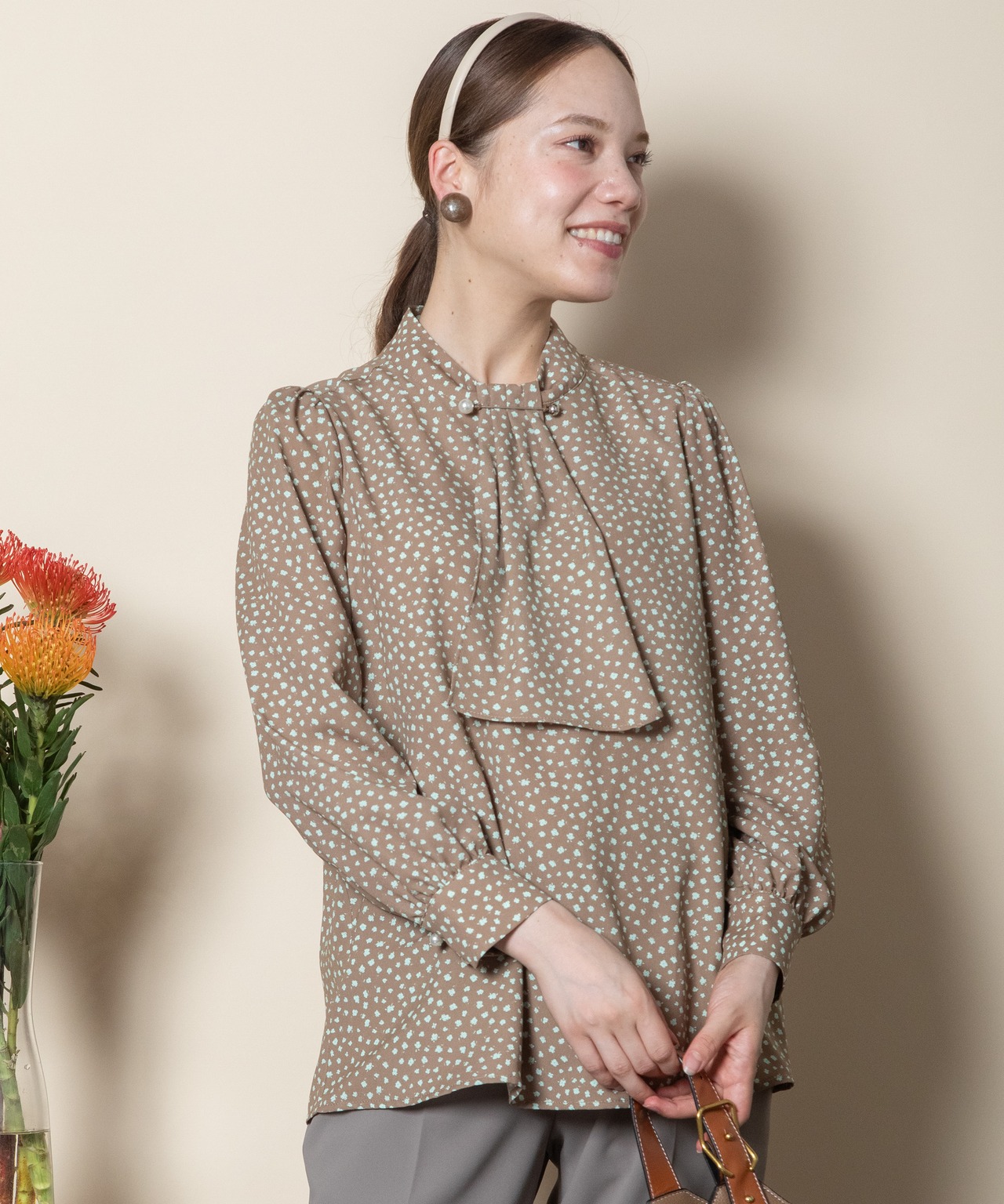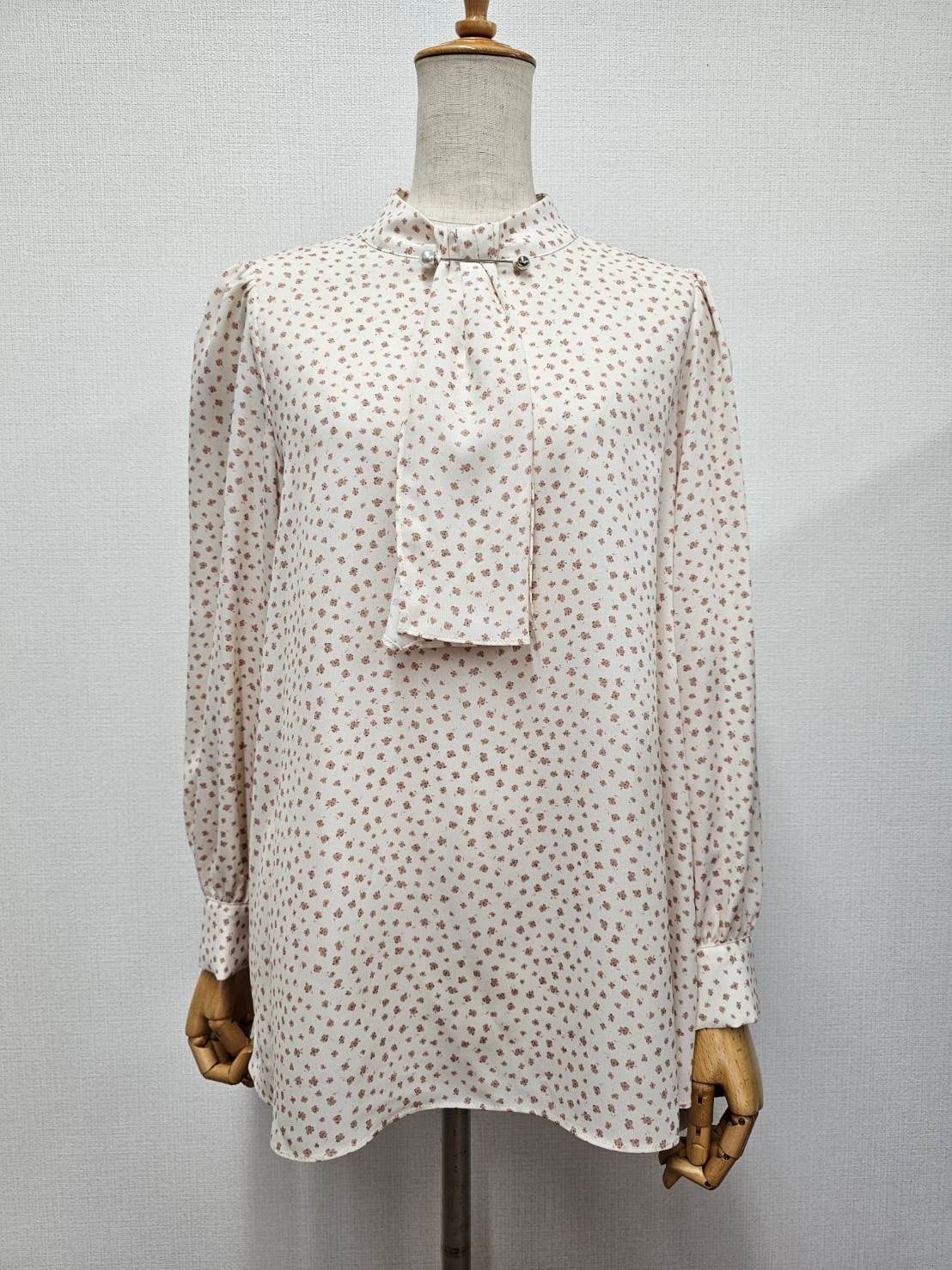 首元におしゃれなパール付きピンバーがついたクラシカルな雰囲気のボウタイブラウス。ニュートラルカラーの単色リトルフラワープリント。サラッと着れる一枚で決まるアイテム。ニットやジャケットとのコーデもおすすめ