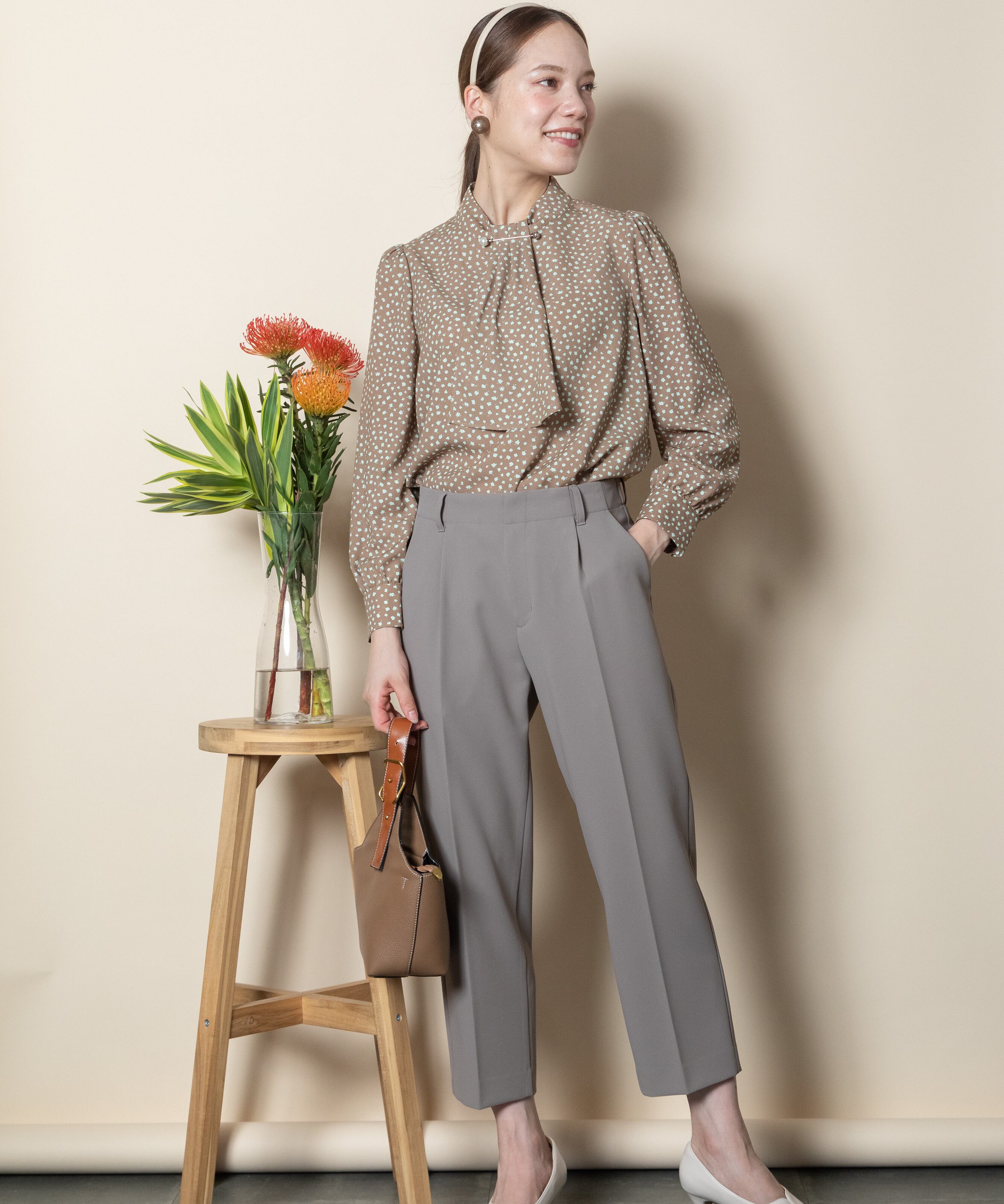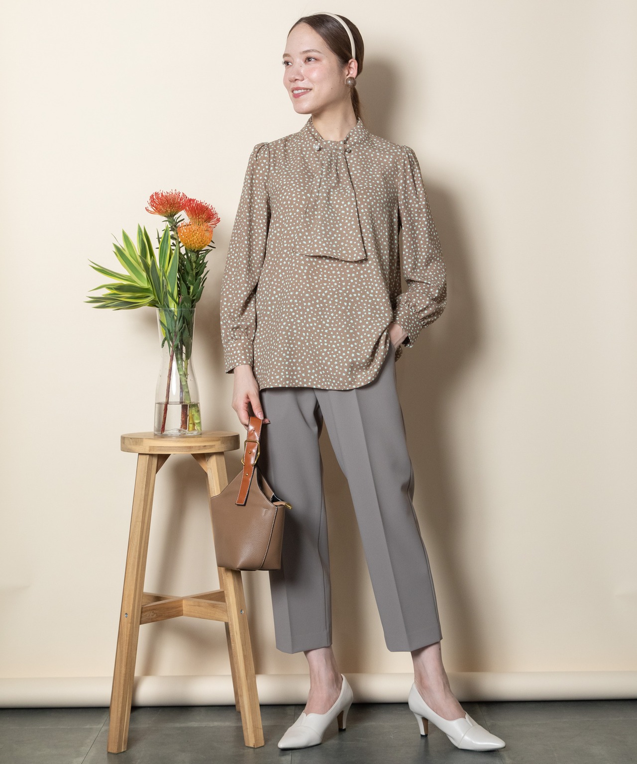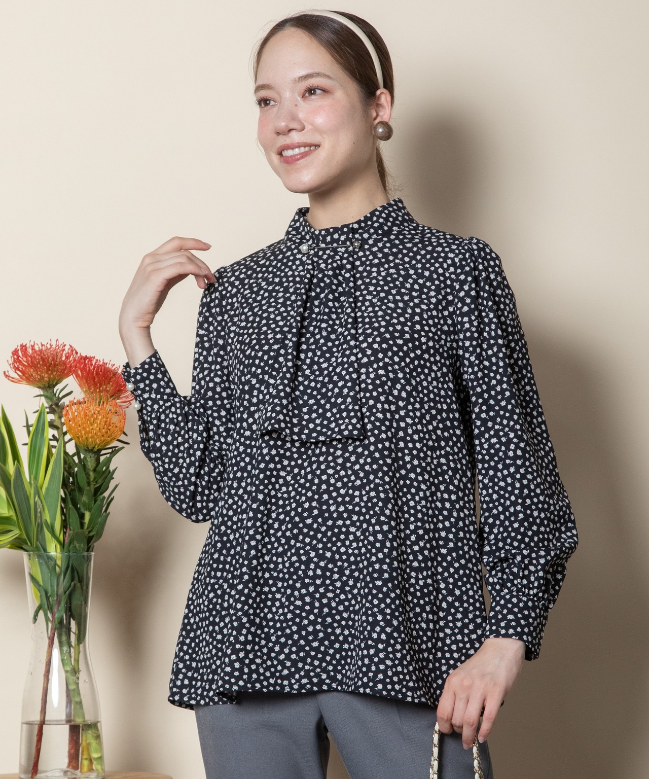 首元におしゃれなパール付きピンバーがついたクラシカルな雰囲気のボウタイブラウス。ニュートラルカラーの単色リトルフラワープリント。サラッと着れる一枚で決まるアイテム。ニットやジャケットとのコーデもおすすめ