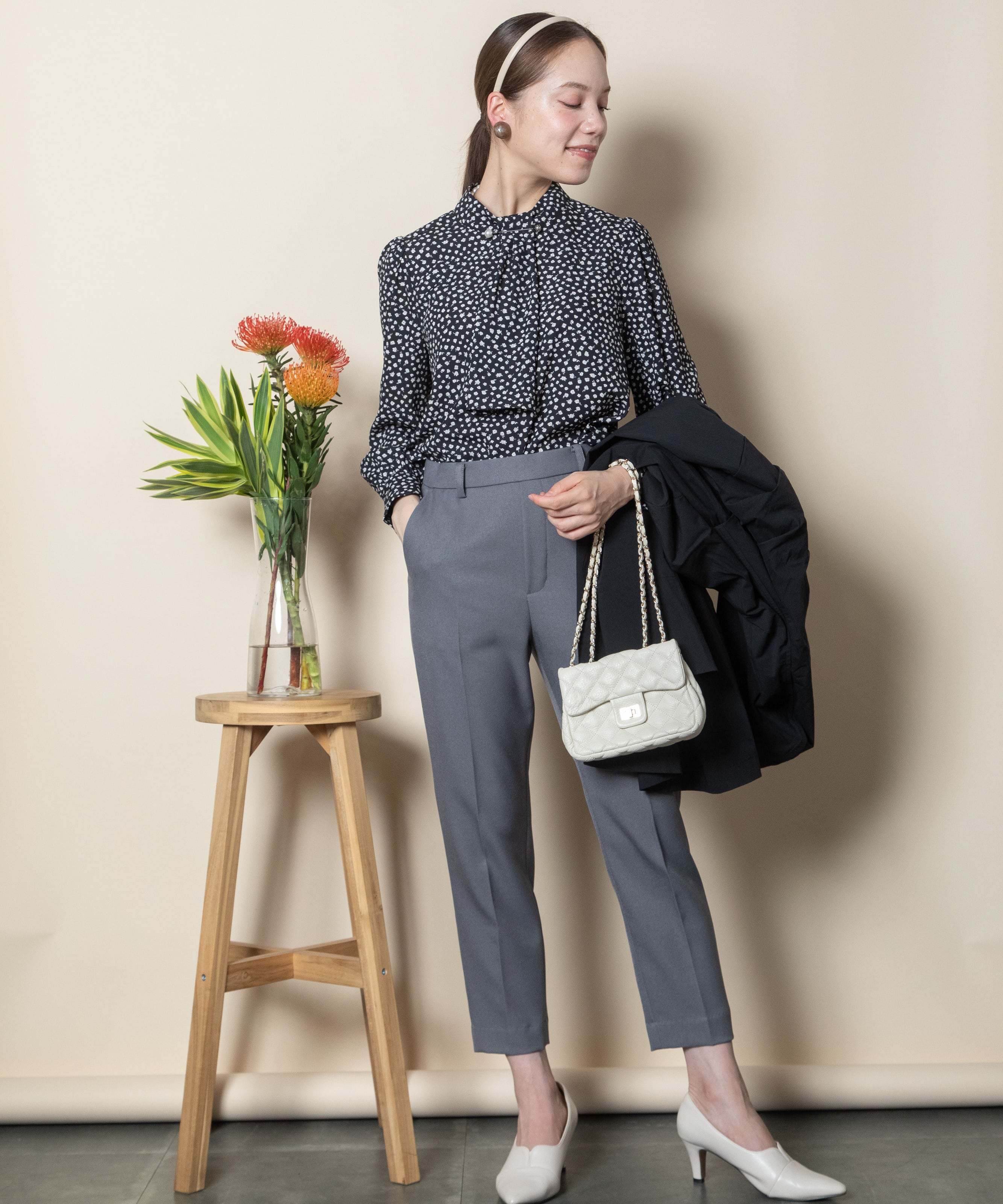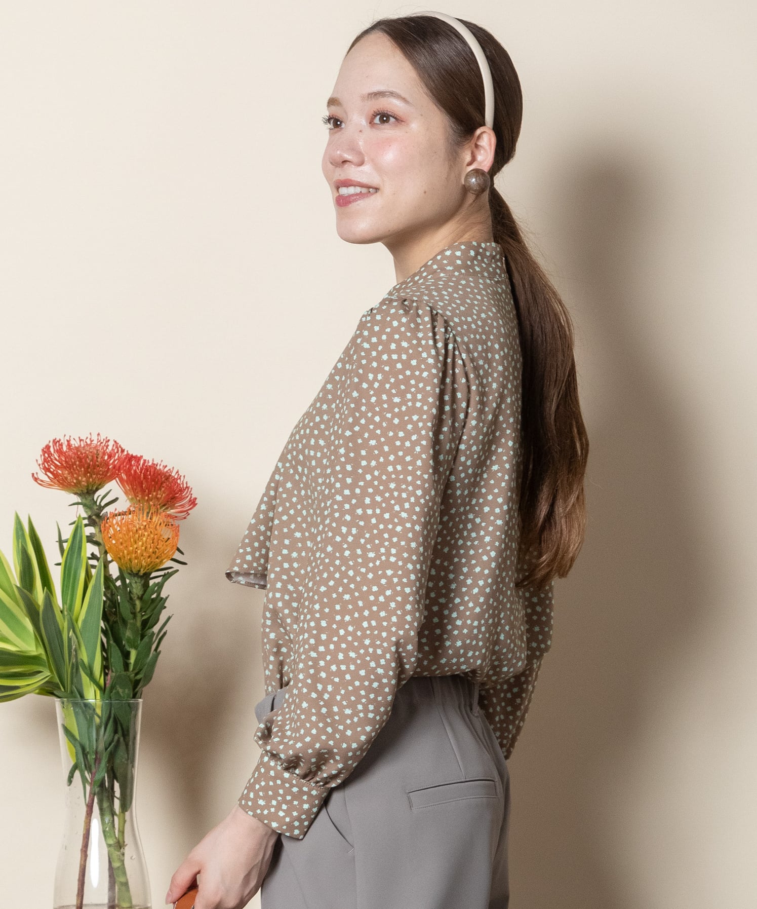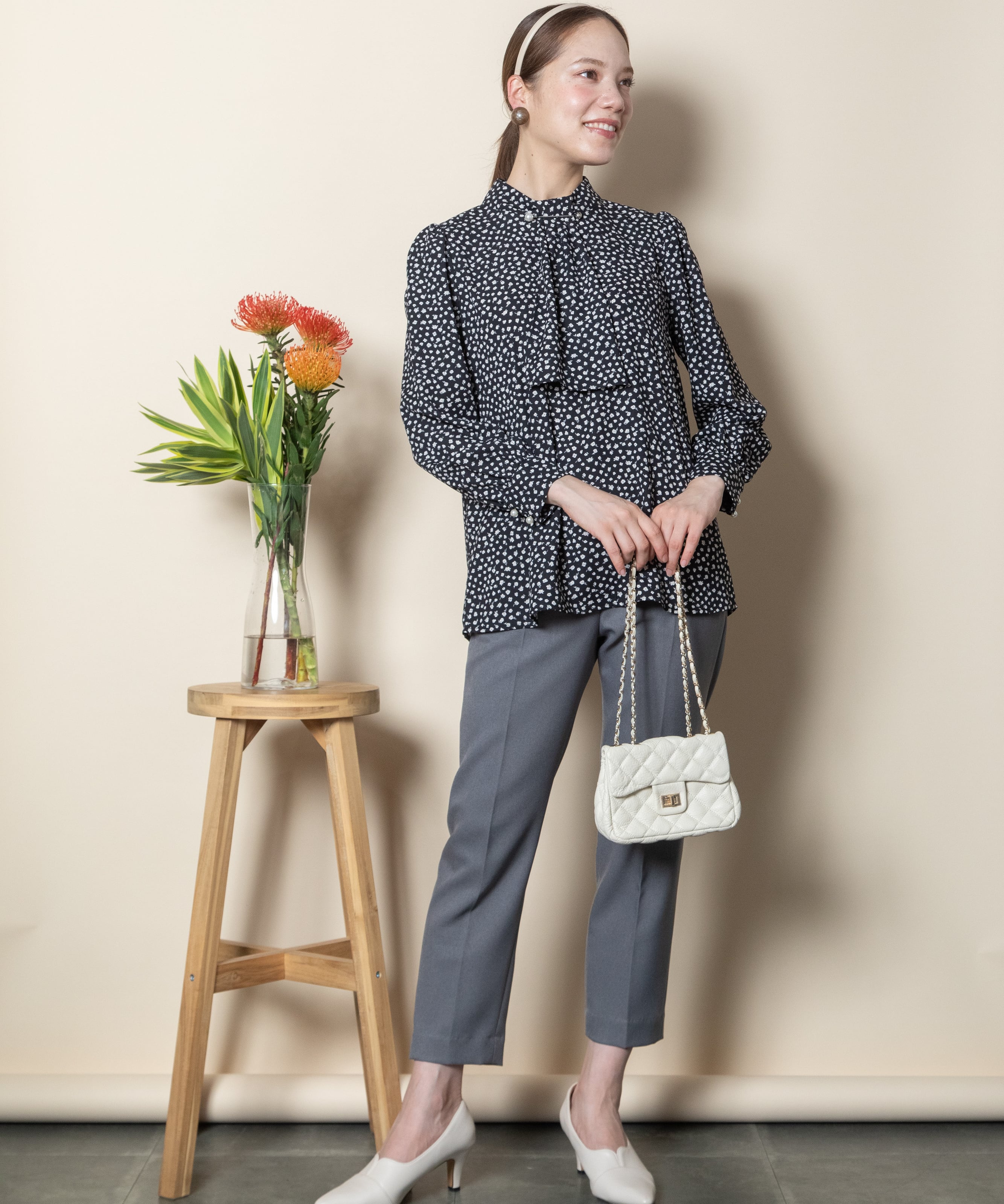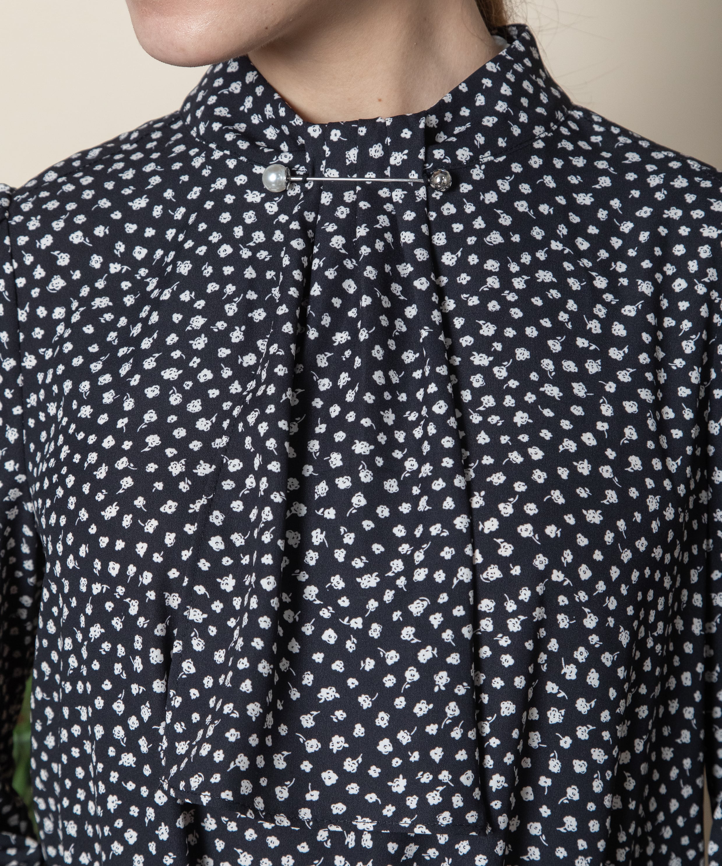 首元におしゃれなパール付きピンバーがついたクラシカルな雰囲気のボウタイブラウス。ニュートラルカラーの単色リトルフラワープリント。サラッと着れる一枚で決まるアイテム。ニットやジャケットとのコーデもおすすめ
