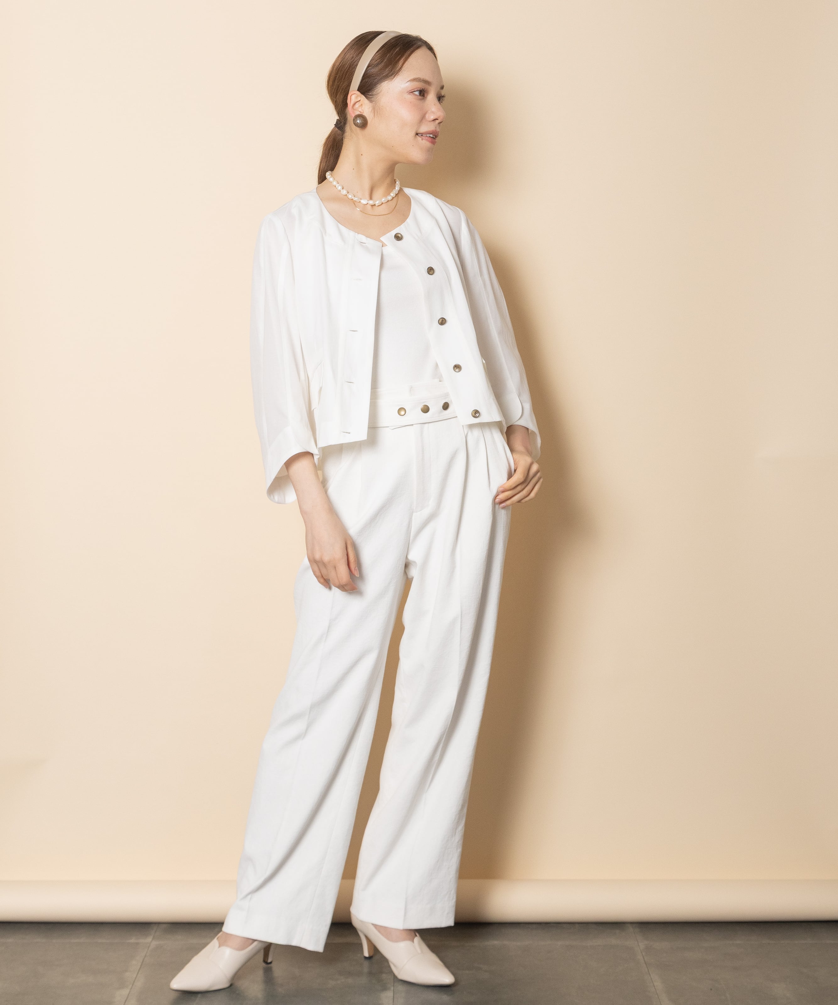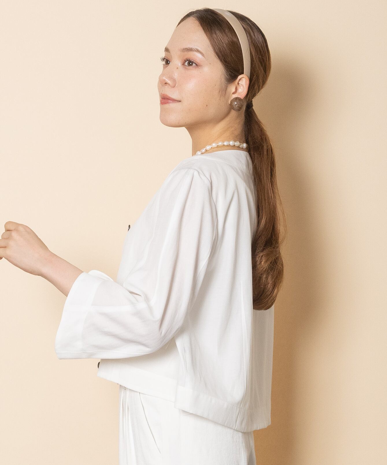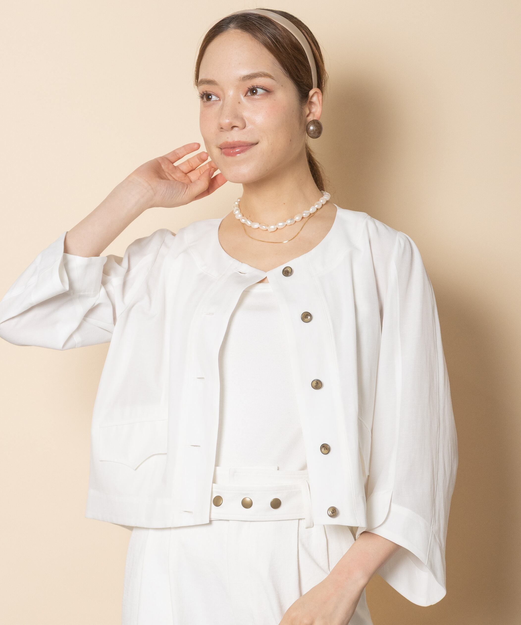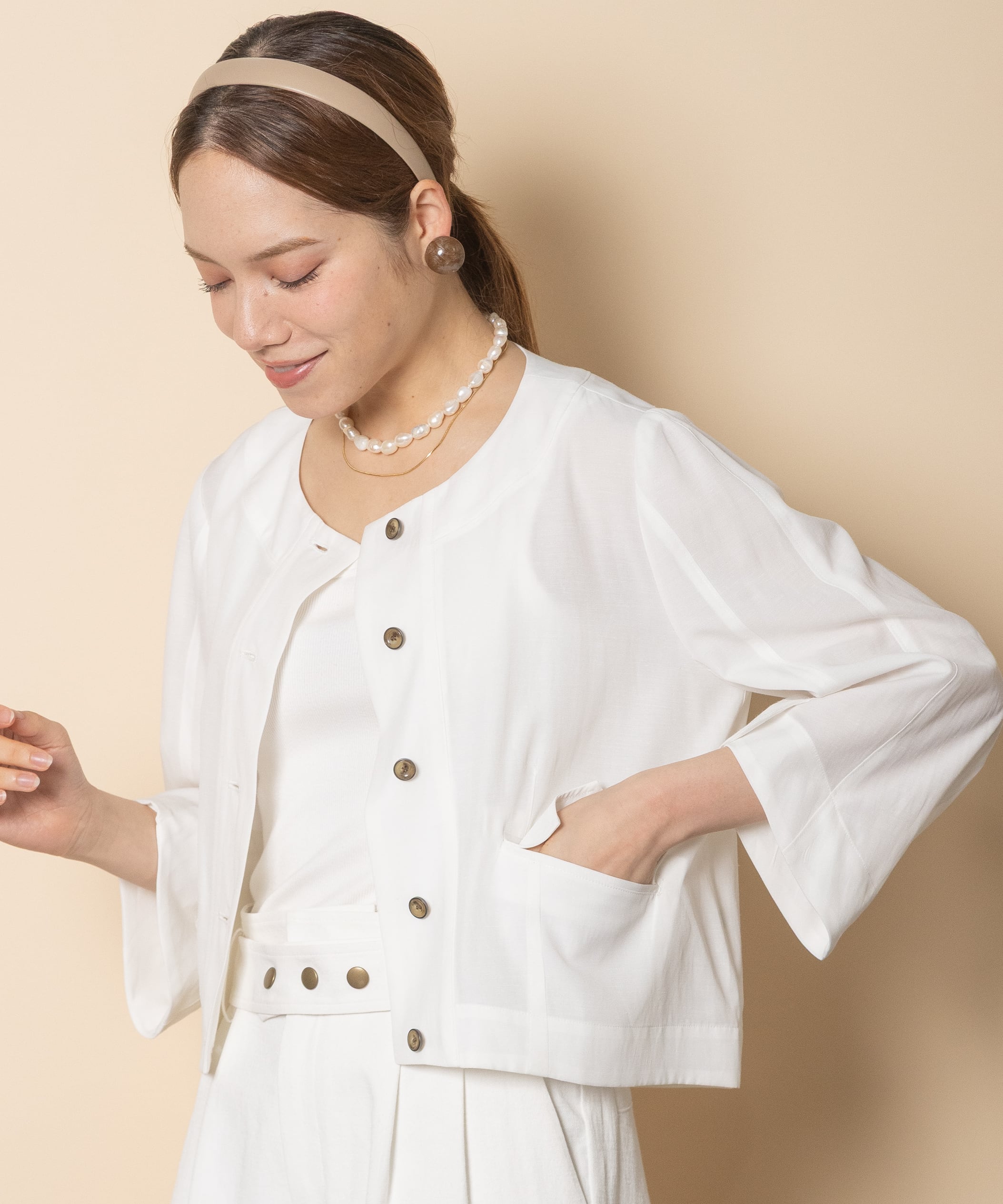 季節の端境期に大活躍するライトなノーカラージャケット。少しカジュアル感のあるフロントボタンとフラップポケットと丸さを持たせた立体的な袖シルエットがポイント。これからの季節、紫外線、日焼け、冷房対策にもおすすめ。