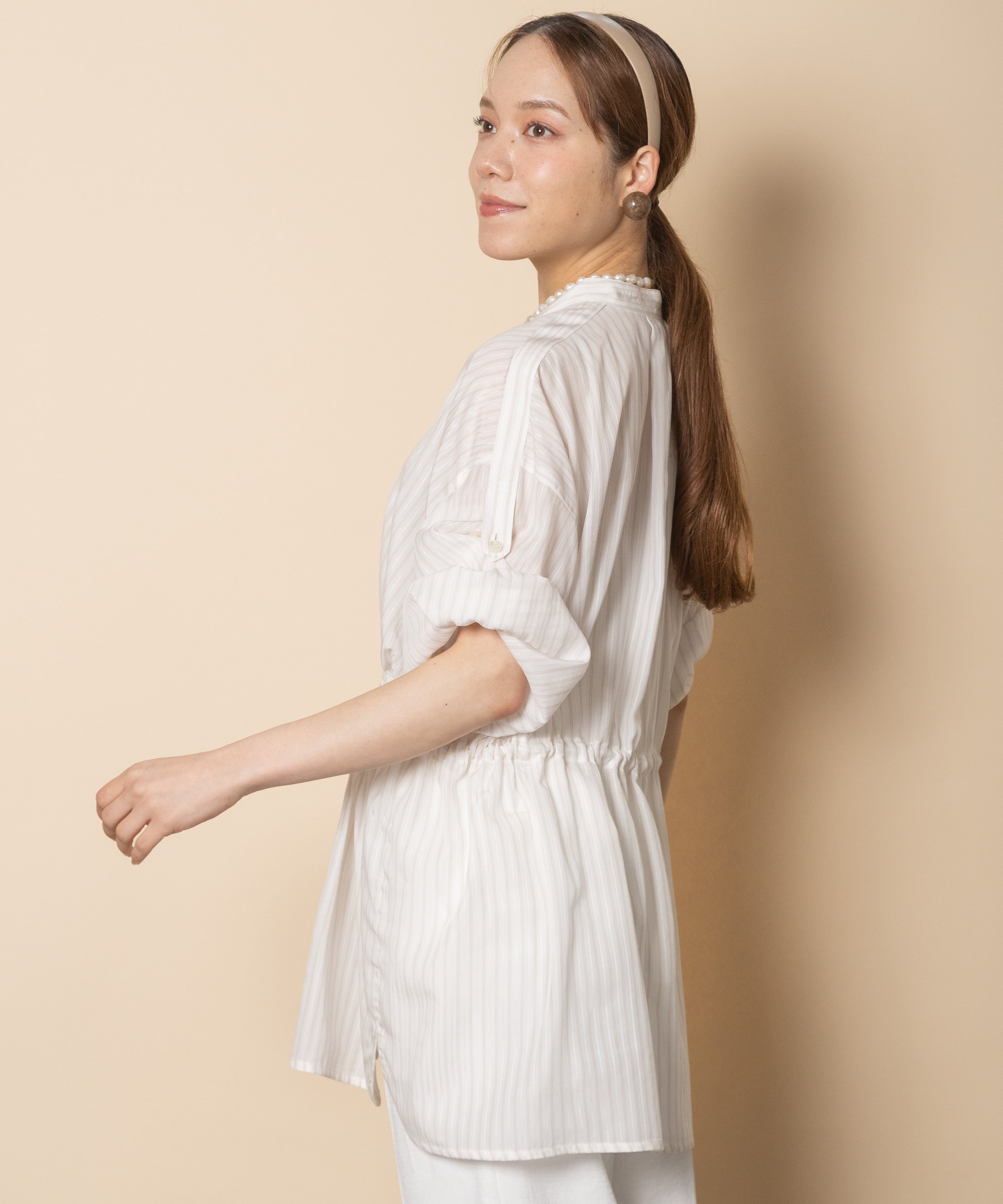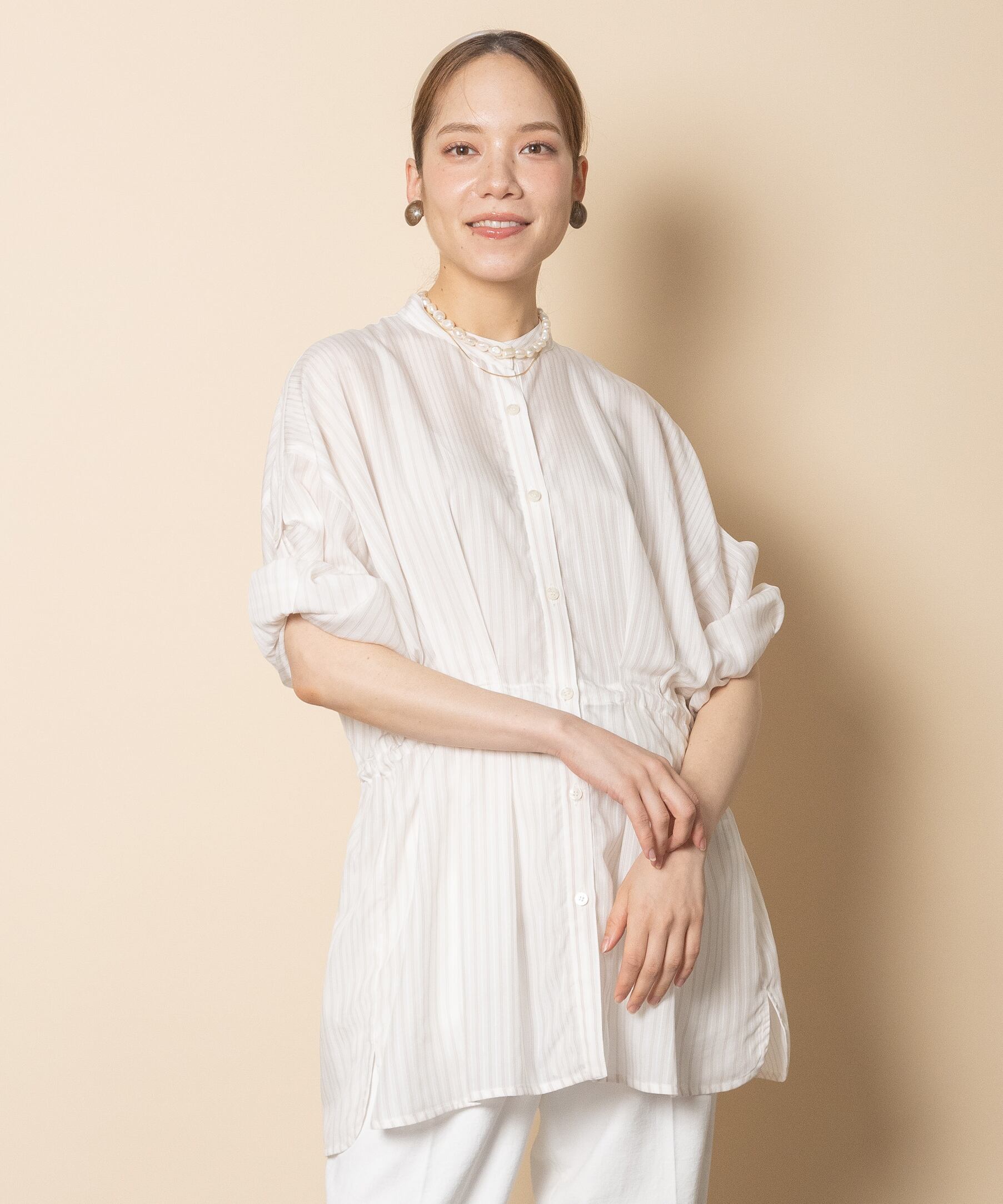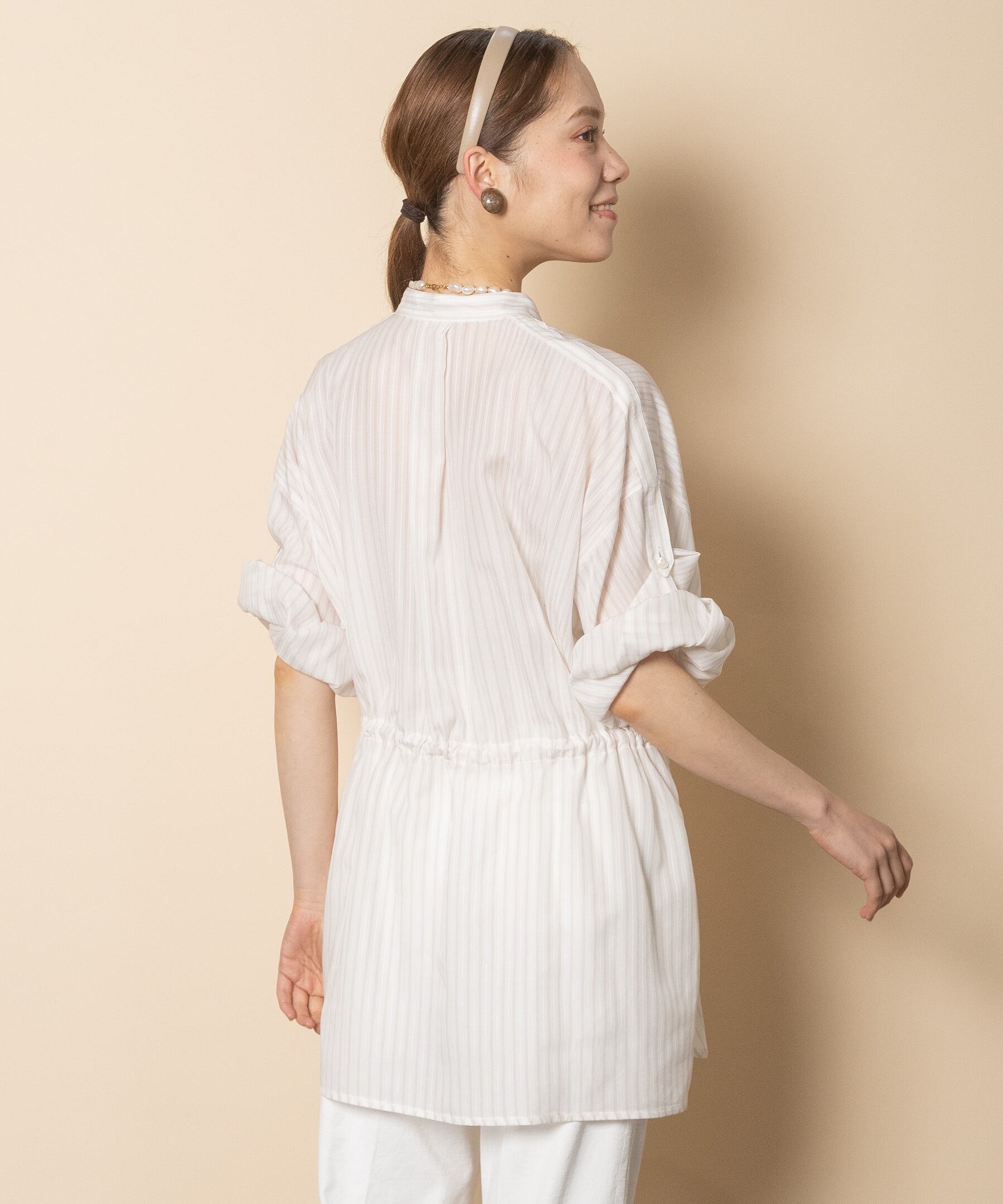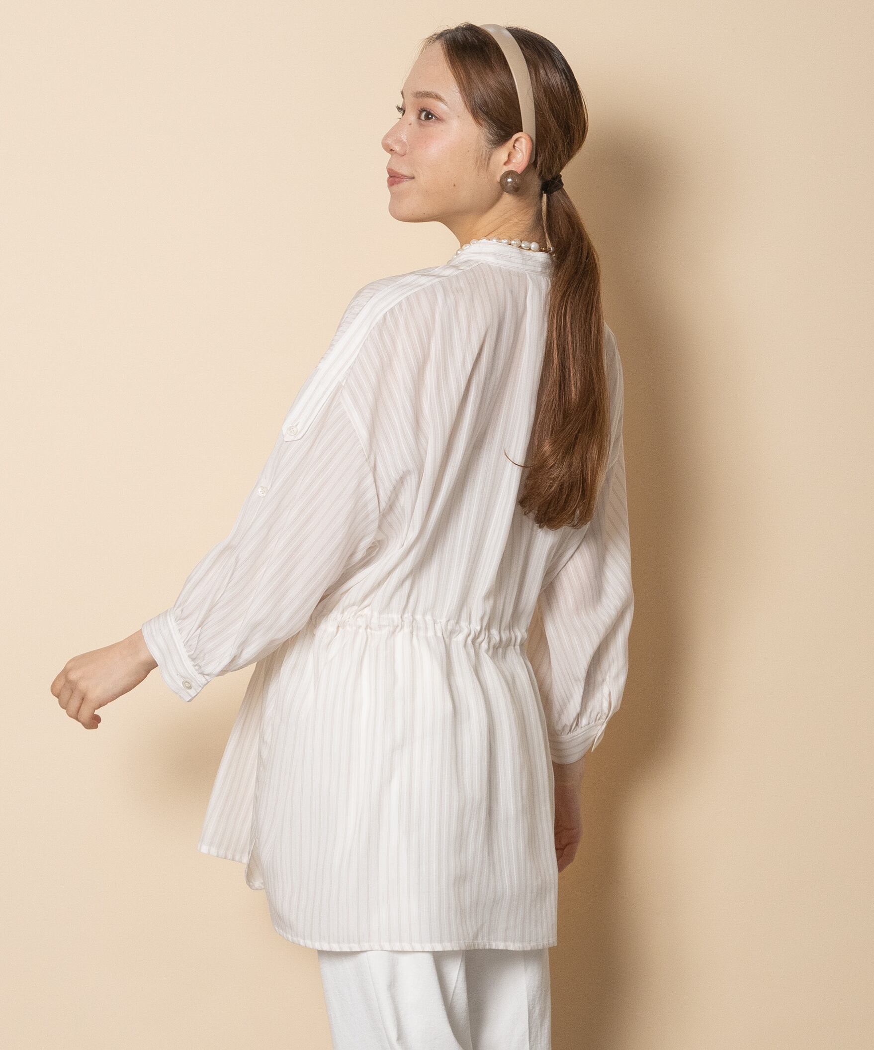 カジュアルだけどエレガンス。大人の雰囲気あるシャドーストライプのシャツブラウス。。首元はシンプルなノーカラー、袖はロールアップ、ウエストはドロストコードと細部までこだわりのあるアイテム。季節の端境期にライトアウターとして大活躍するアイテム。