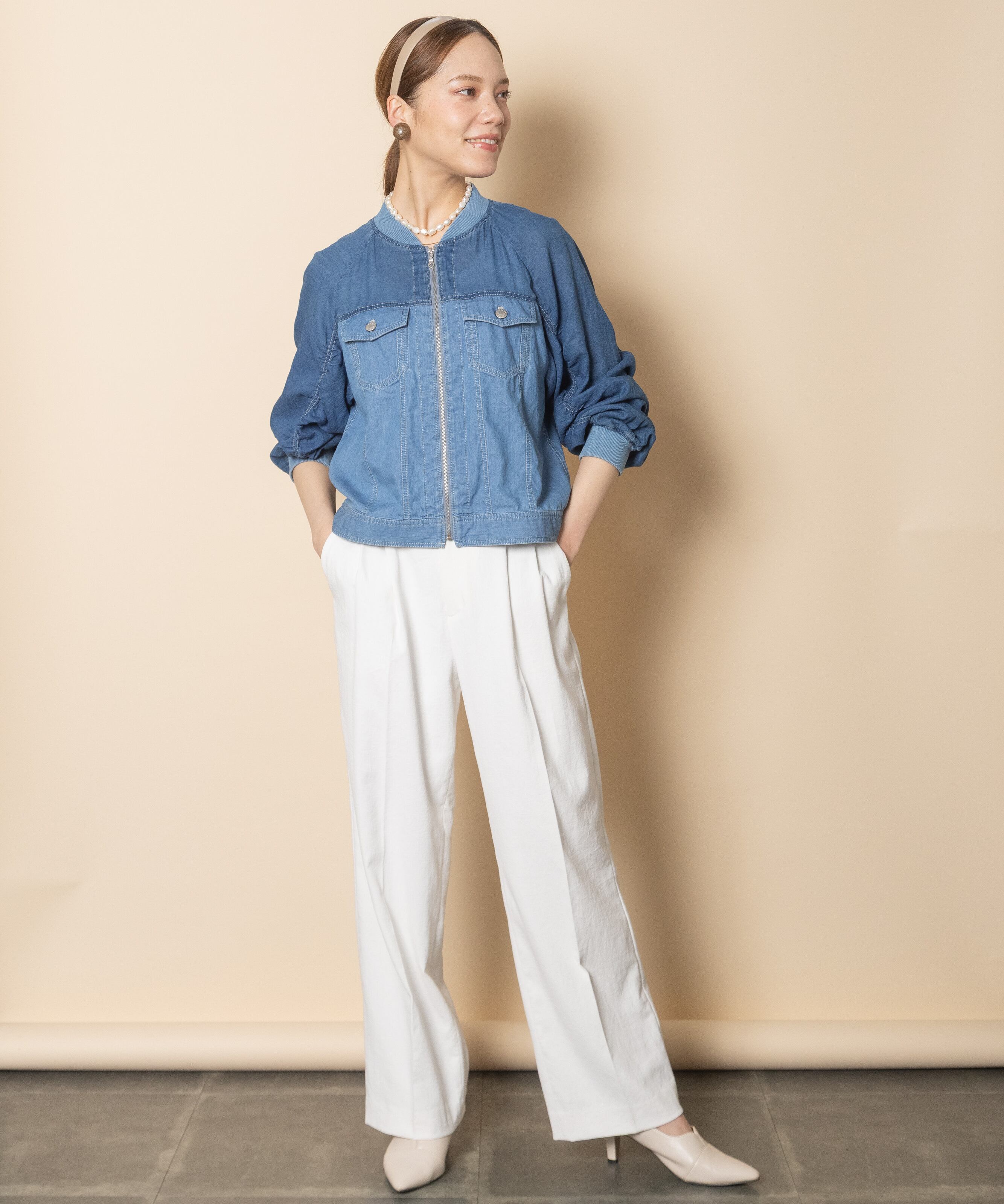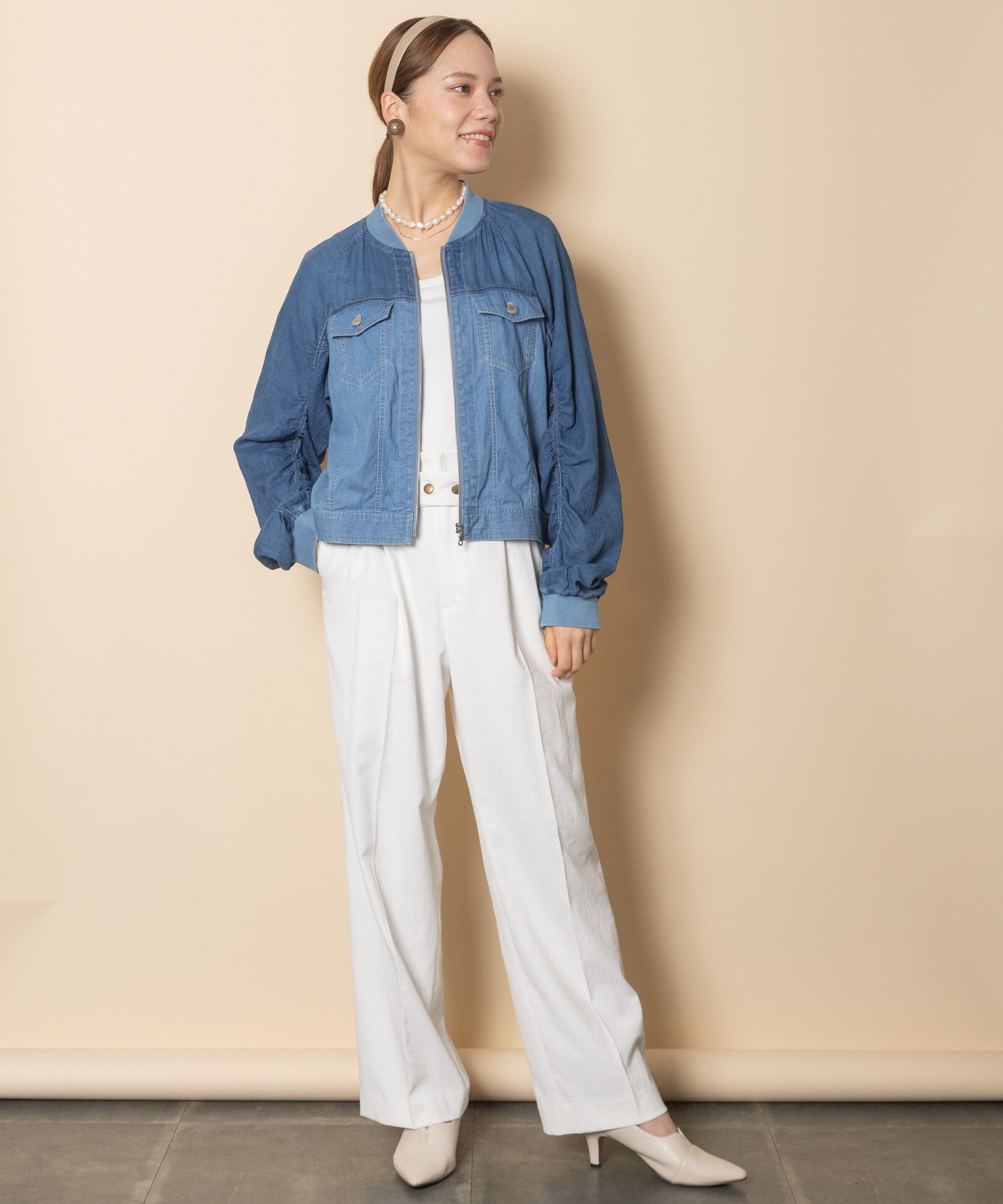 気軽に羽織れてデイリーに大活躍のデニムジップブルソン。軽量デニムを身頃に使用し、デニムらしい表情を出し、袖は透け感のあるシアーデニムで切り替え。襟元と袖口はリブ仕様でカジュアル感があり、たくし上げもOK。