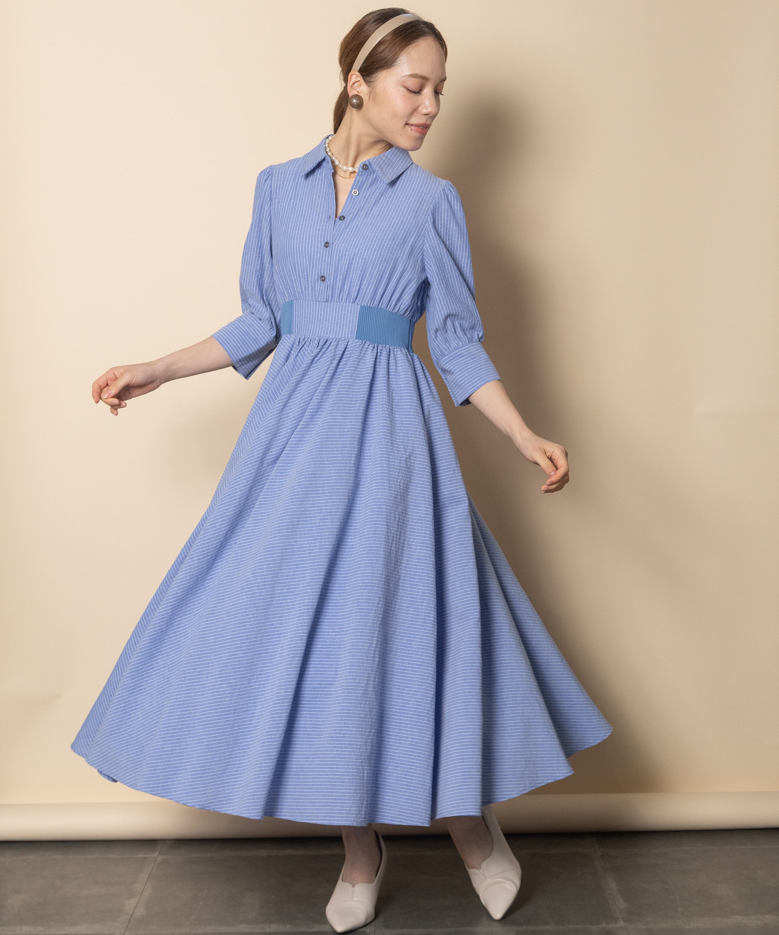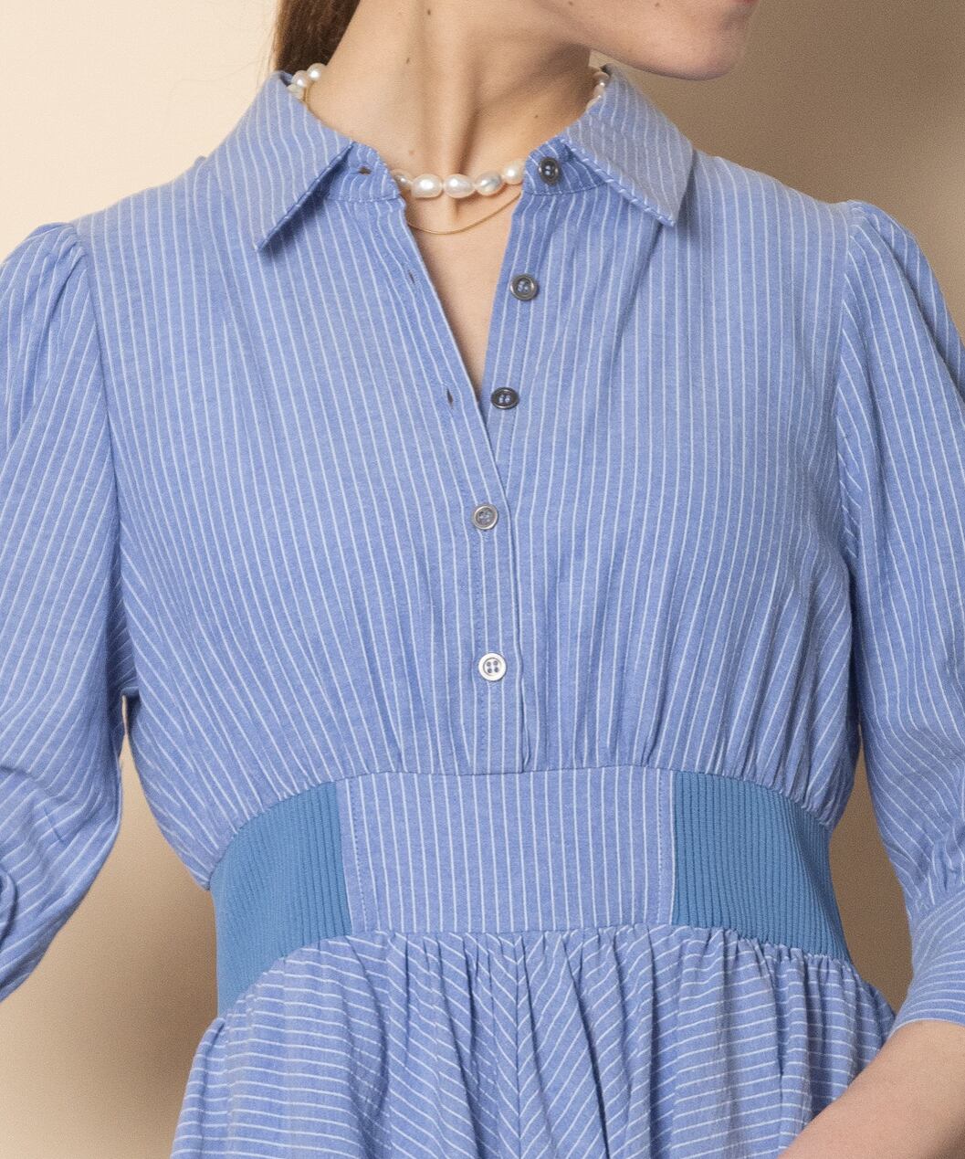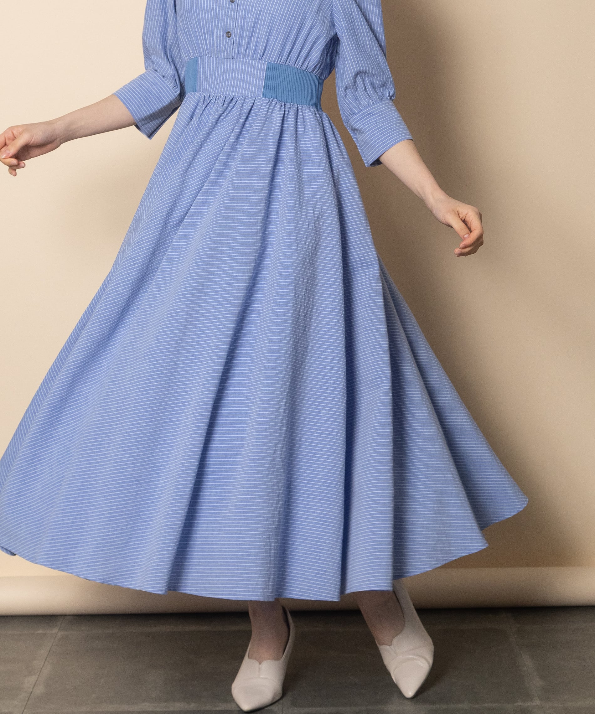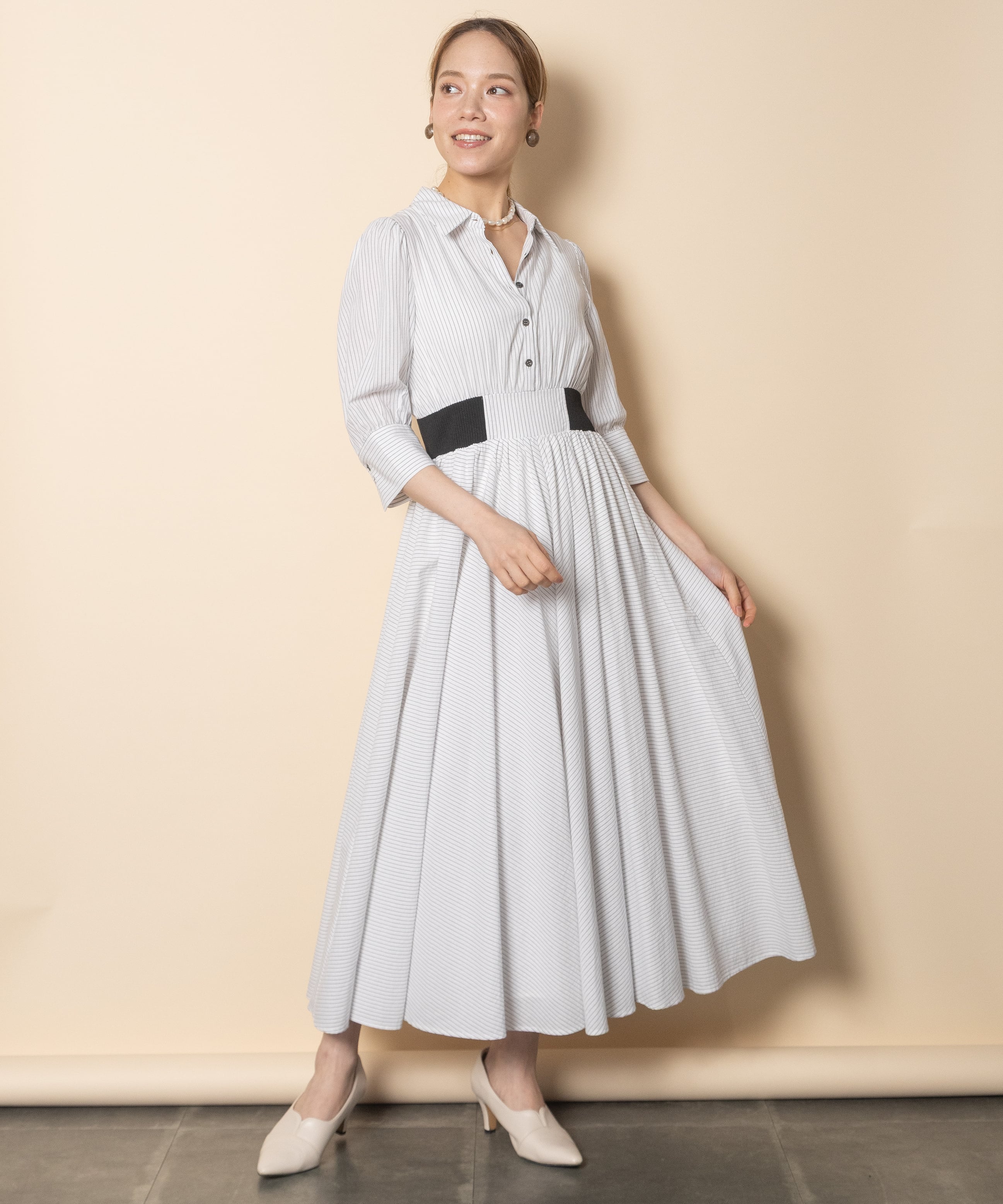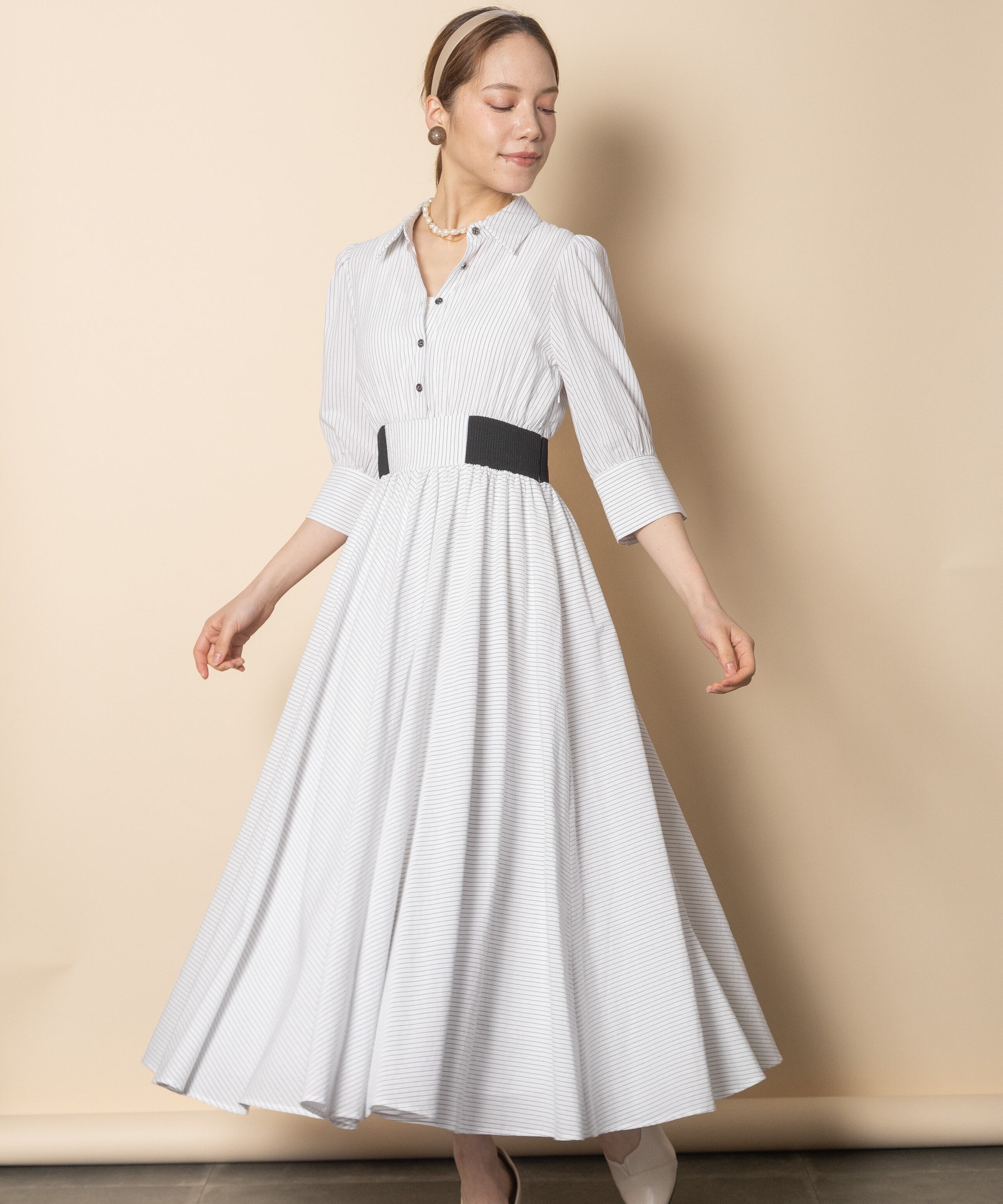 レディライクな雰囲気のピンストライプのシャツワンピース。たっぷりとしたフレアが魅力。ウエスト両サイドがリブ仕様で美しいフット&フレアーシルエット。夏のお出かけが似合う上品でエレガントな雰囲気のアイテムです。