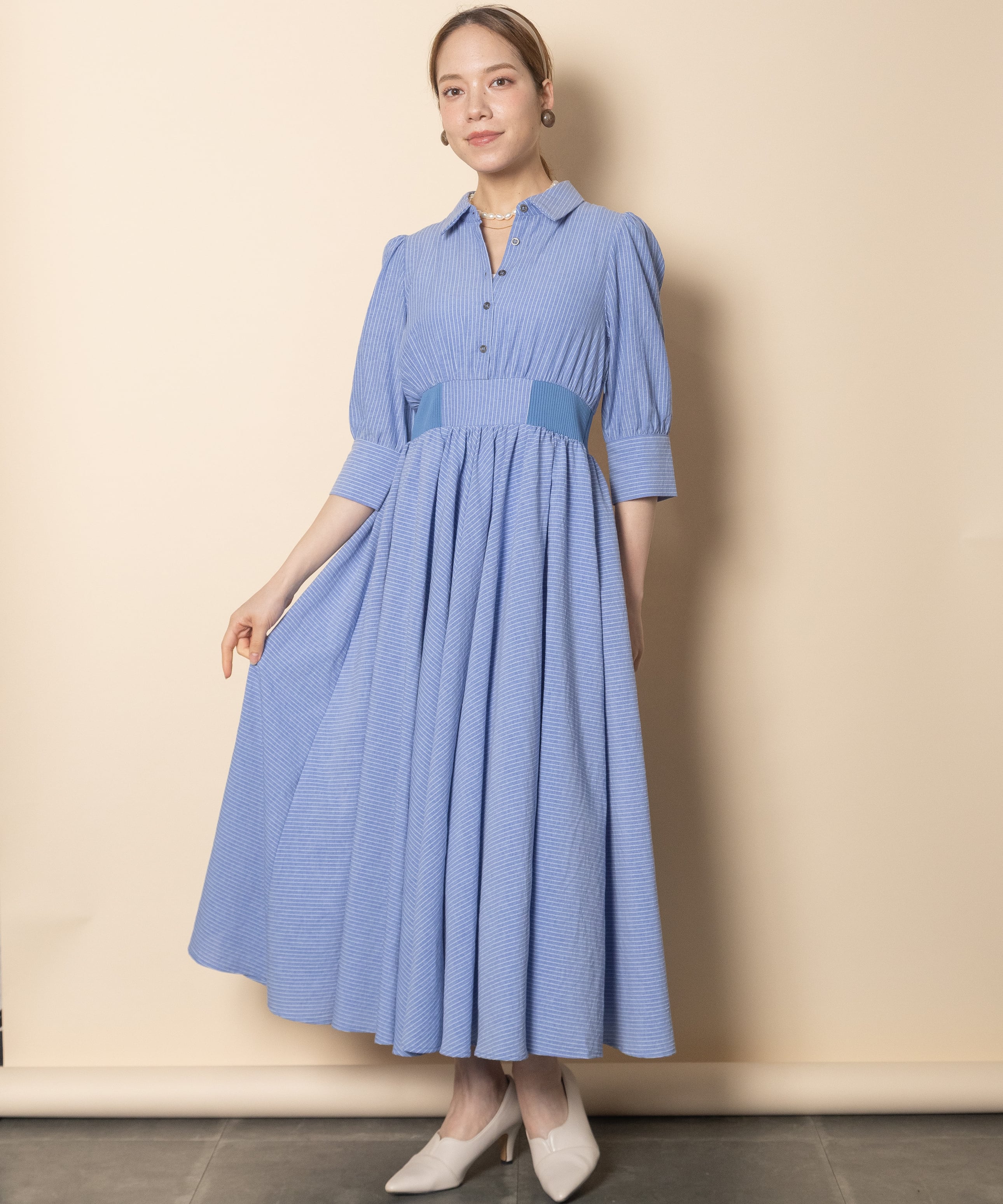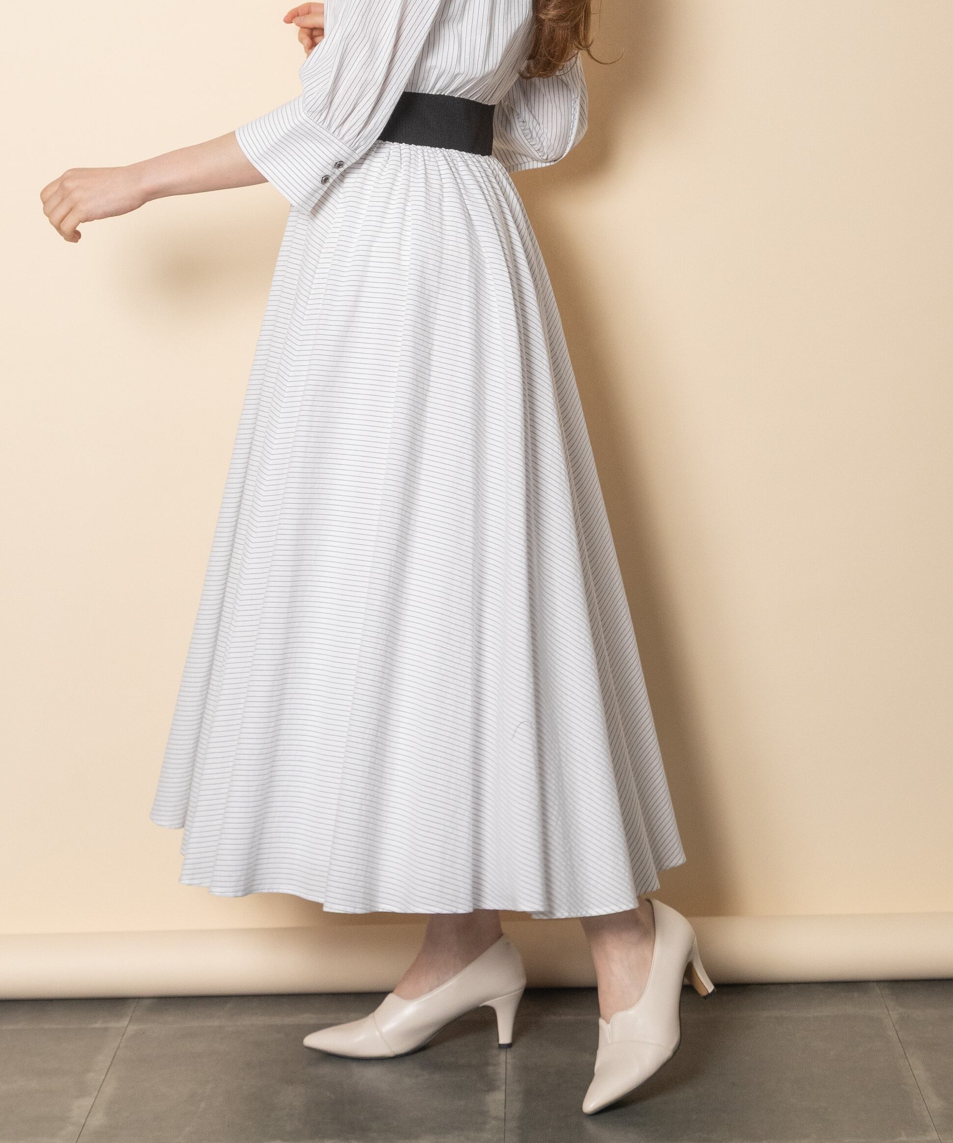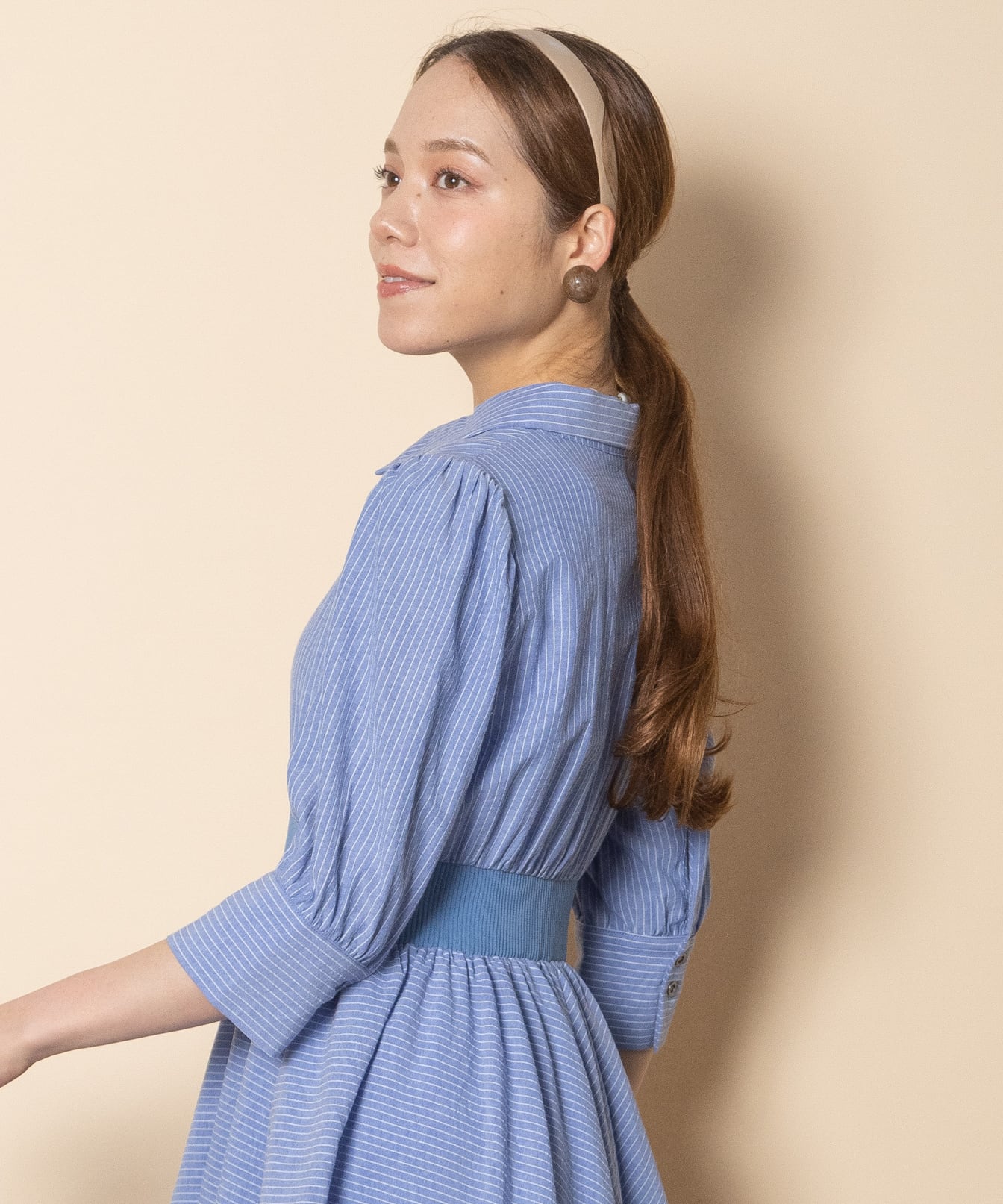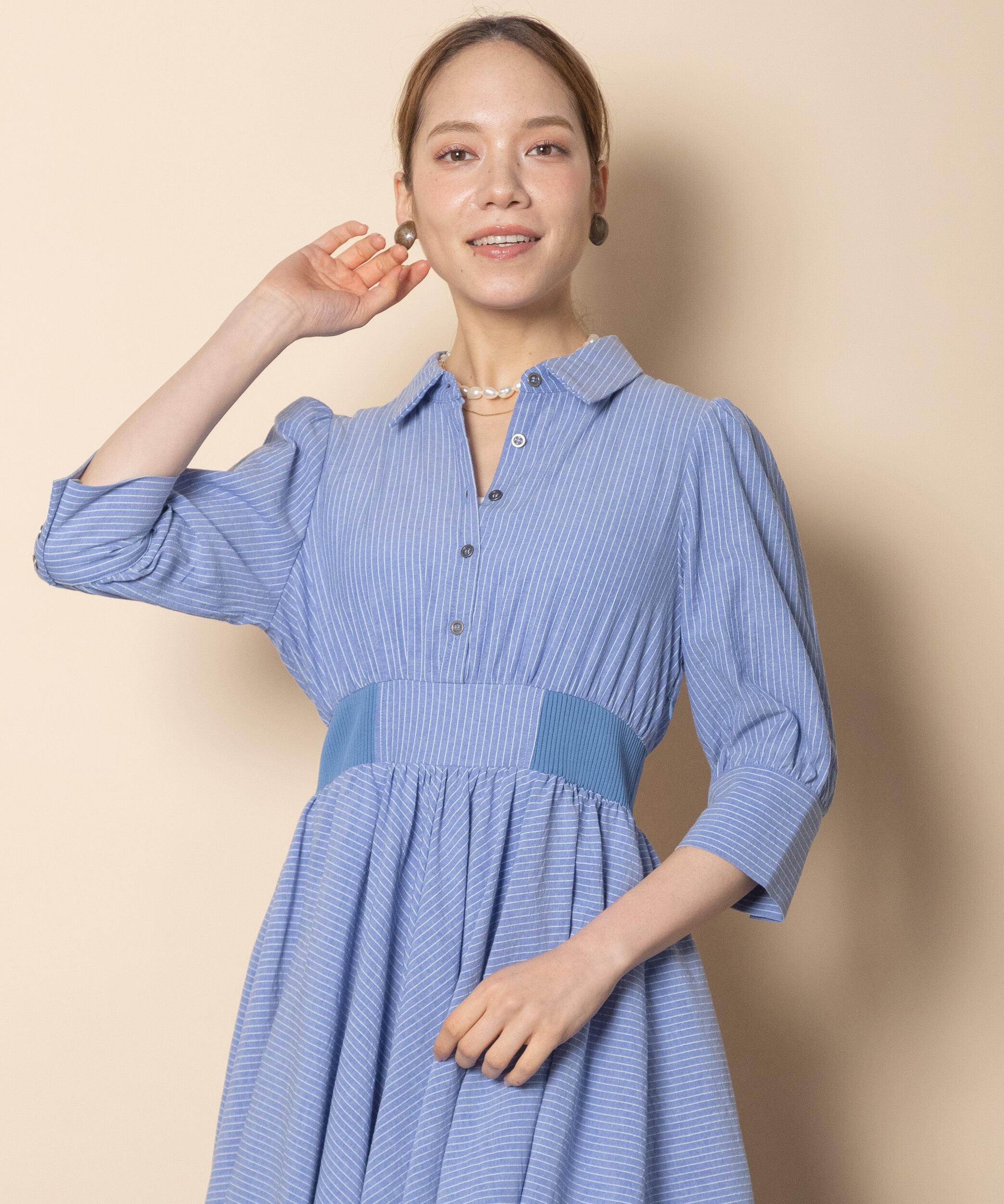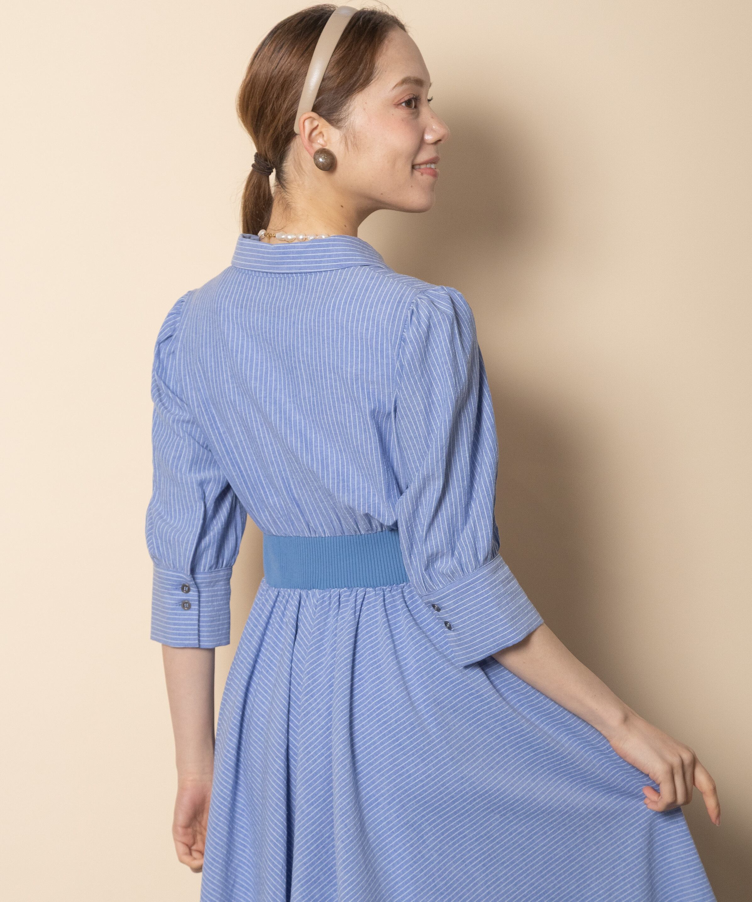 レディライクな雰囲気のピンストライプのシャツワンピース。たっぷりとしたフレアが魅力。ウエスト両サイドがリブ仕様で美しいフット&フレアーシルエット。夏のお出かけが似合う上品でエレガントな雰囲気のアイテムです。