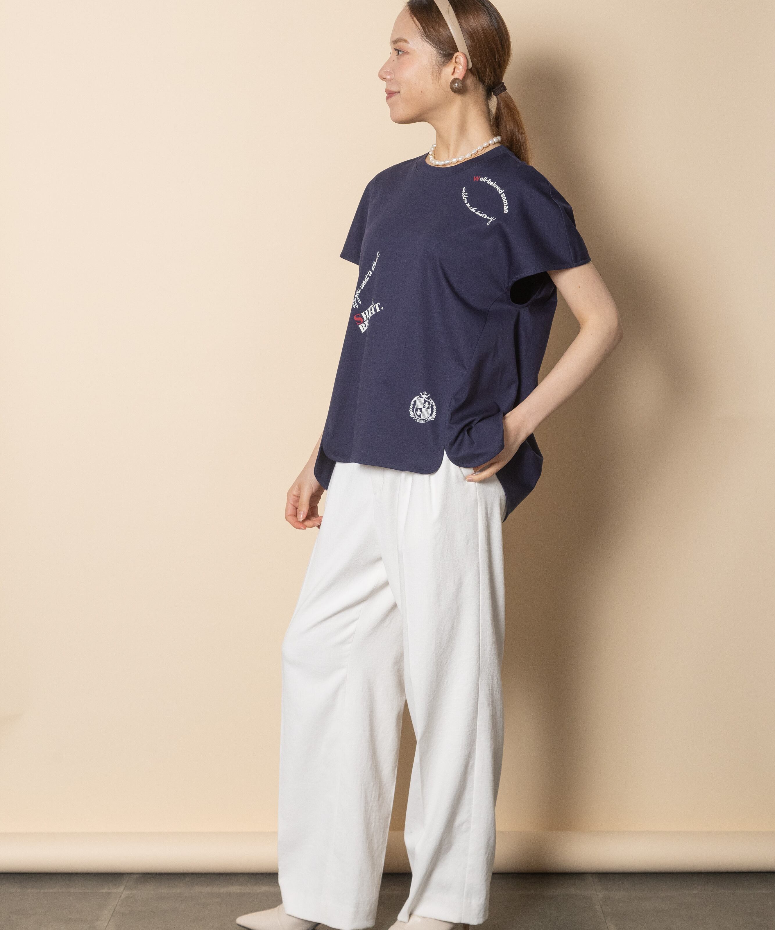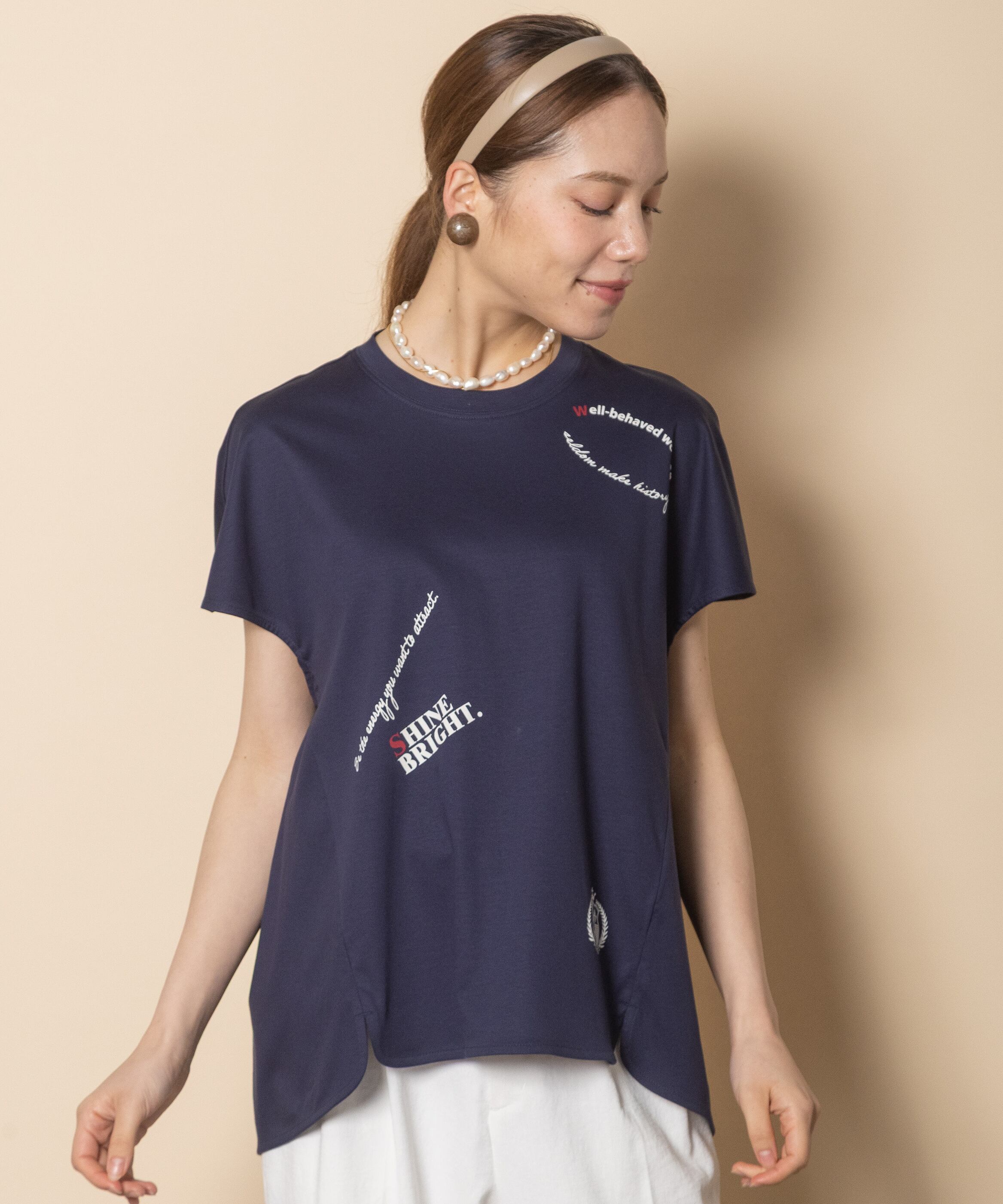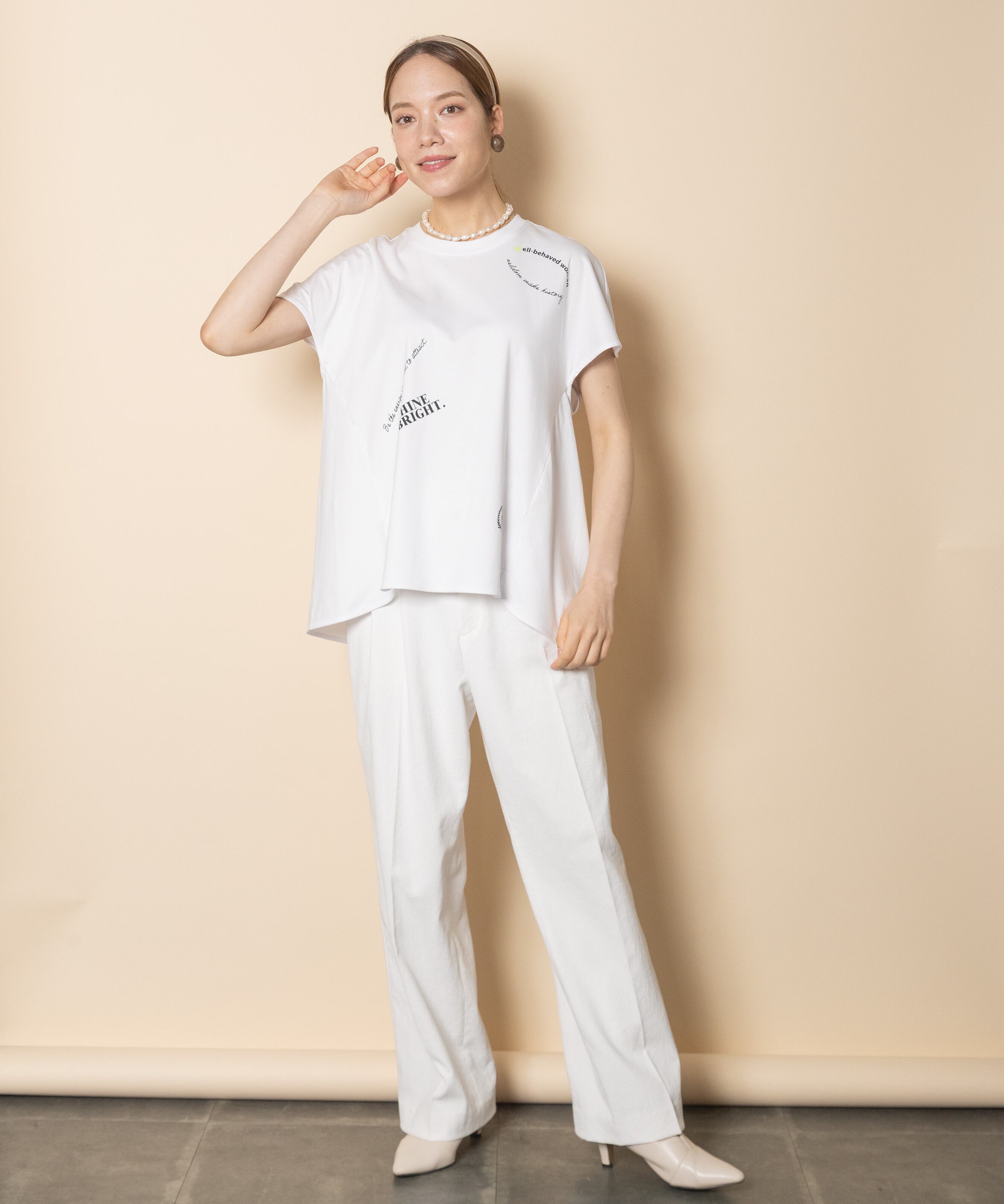 程よい光沢感のある素材でキレイめカジュアル派におすすめ。アメリカの歴史学者から引用したロゴ文章のプリントがされたデザインTシャツ。フロント両サイドにはスリット、フレンチ袖とデザイン性のあるアイテムです。