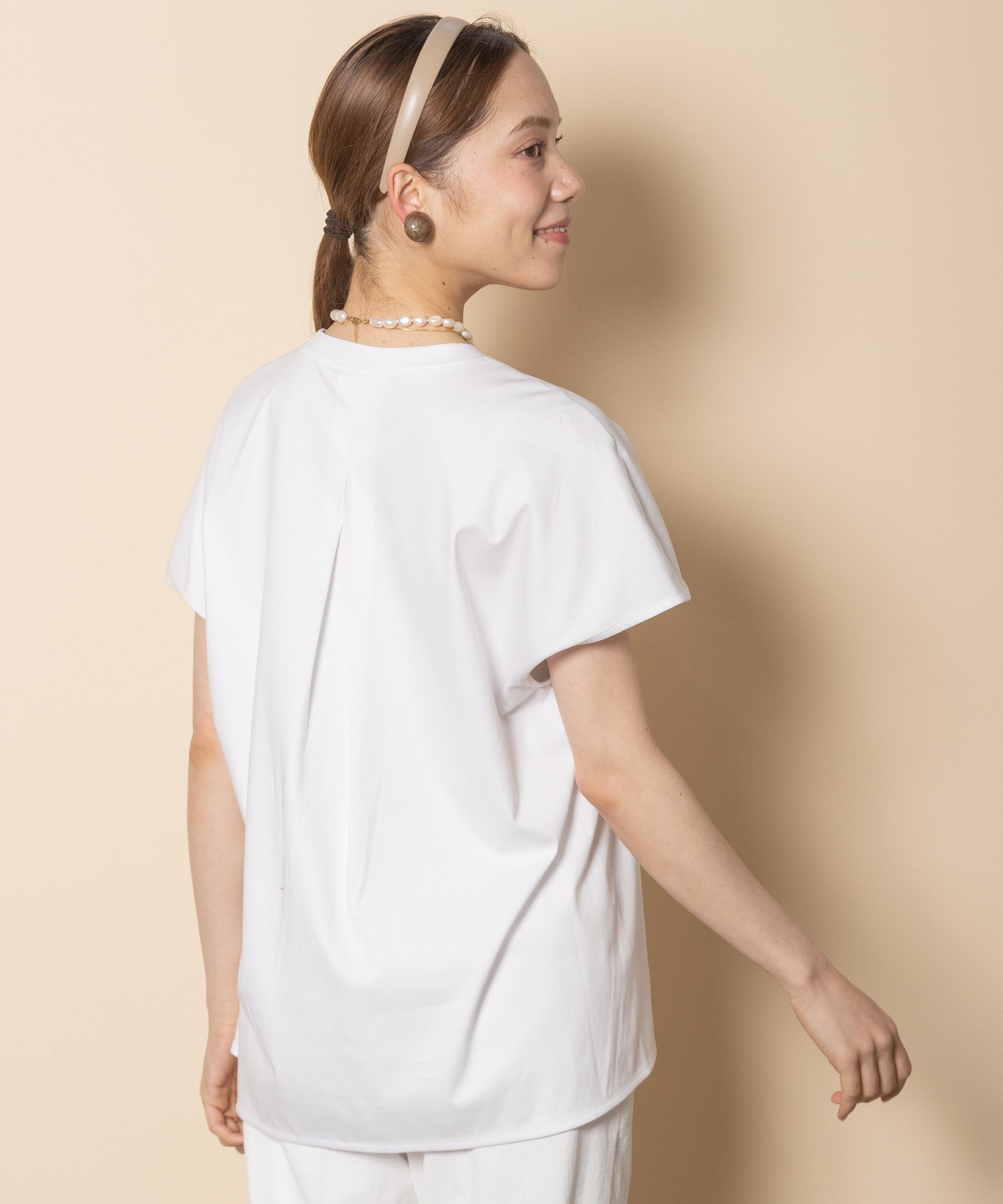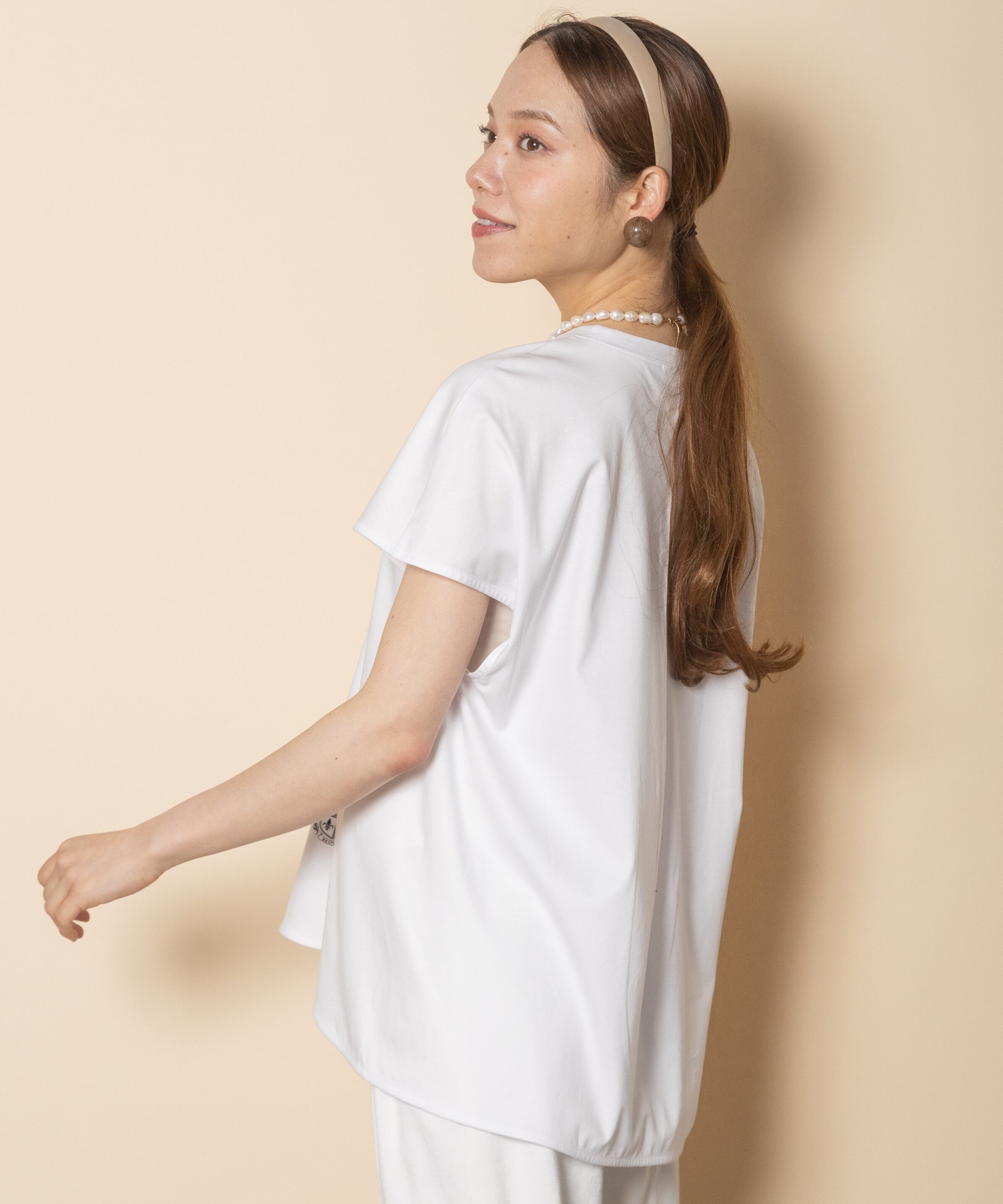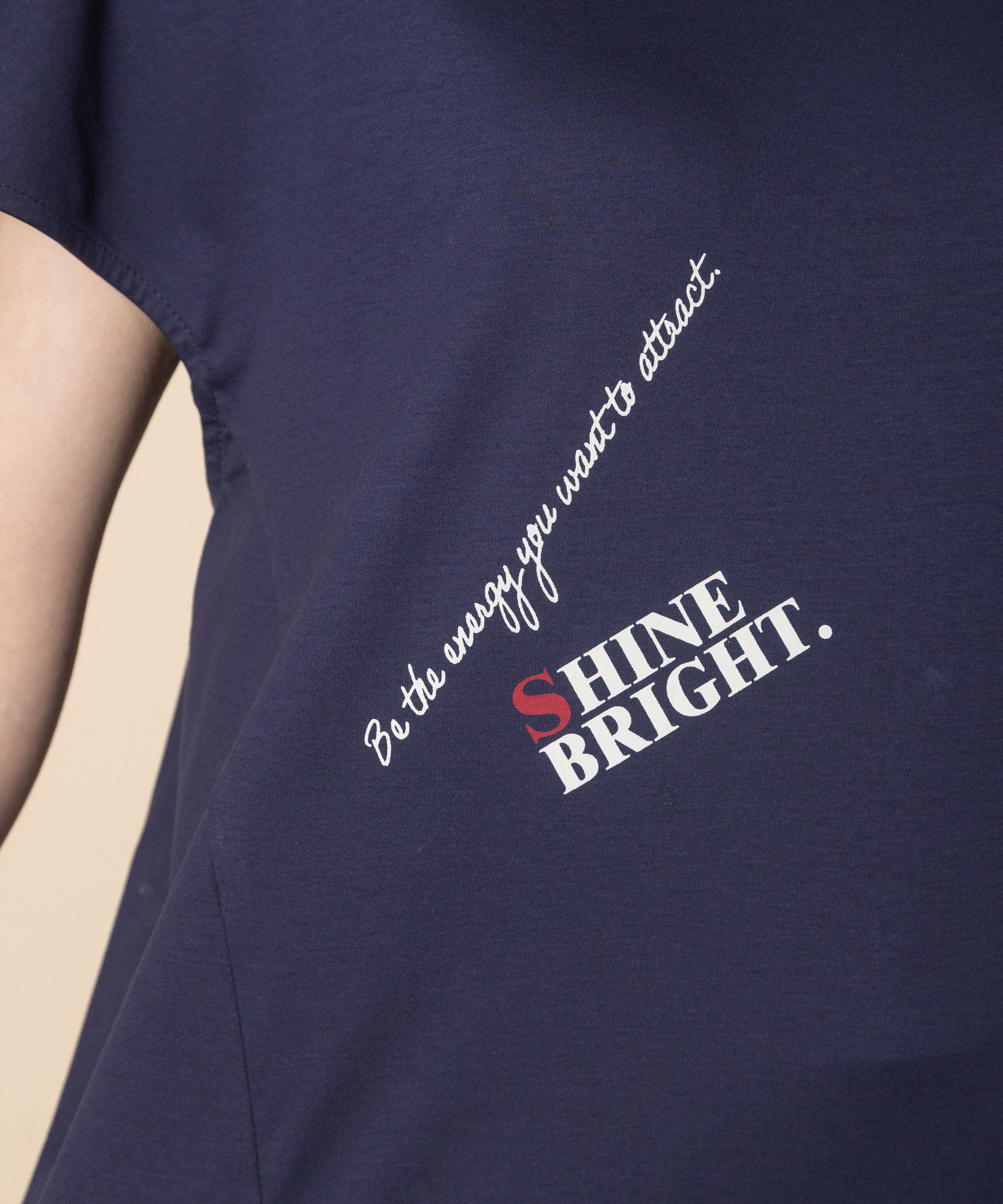 程よい光沢感のある素材でキレイめカジュアル派におすすめ。アメリカの歴史学者から引用したロゴ文章のプリントがされたデザインTシャツ。フロント両サイドにはスリット、フレンチ袖とデザイン性のあるアイテムです。