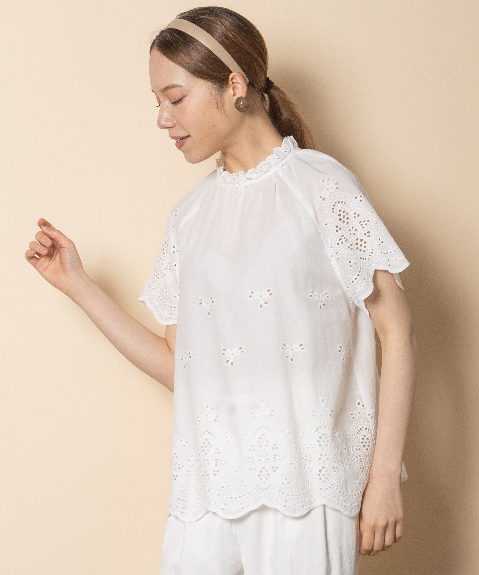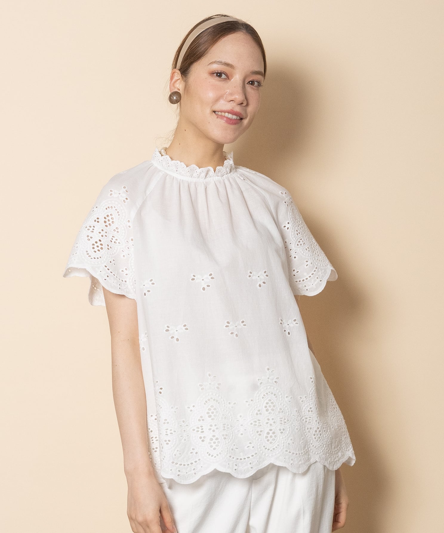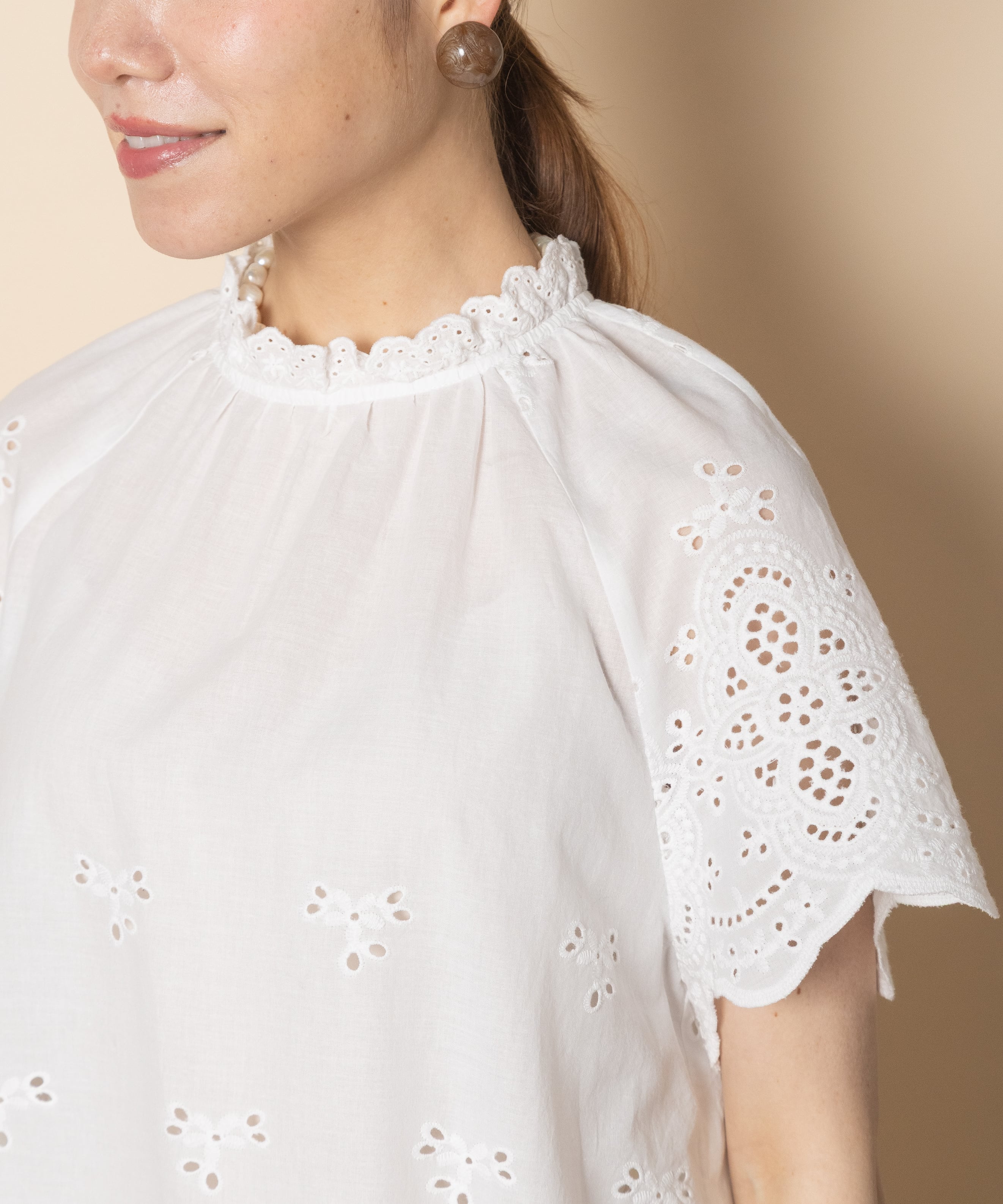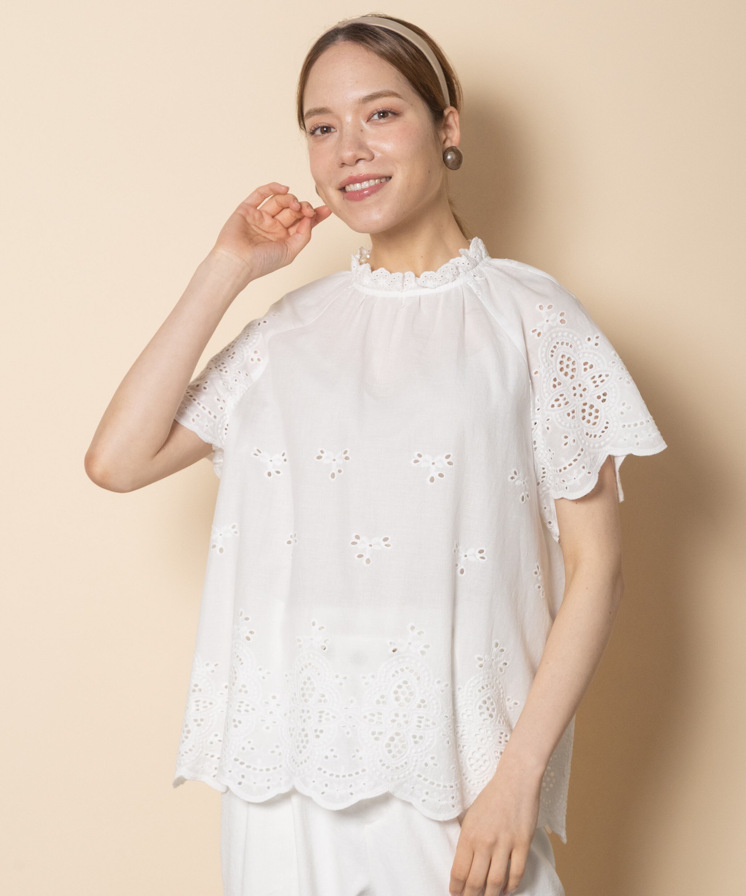フェミニン派の夏の定番アイテムのカットワークブラウス。首元はプチスタンド襟にフレンチ袖がガーリーな雰囲気。程よいフレア感でノンストレスでご着用頂けるアイテムです。