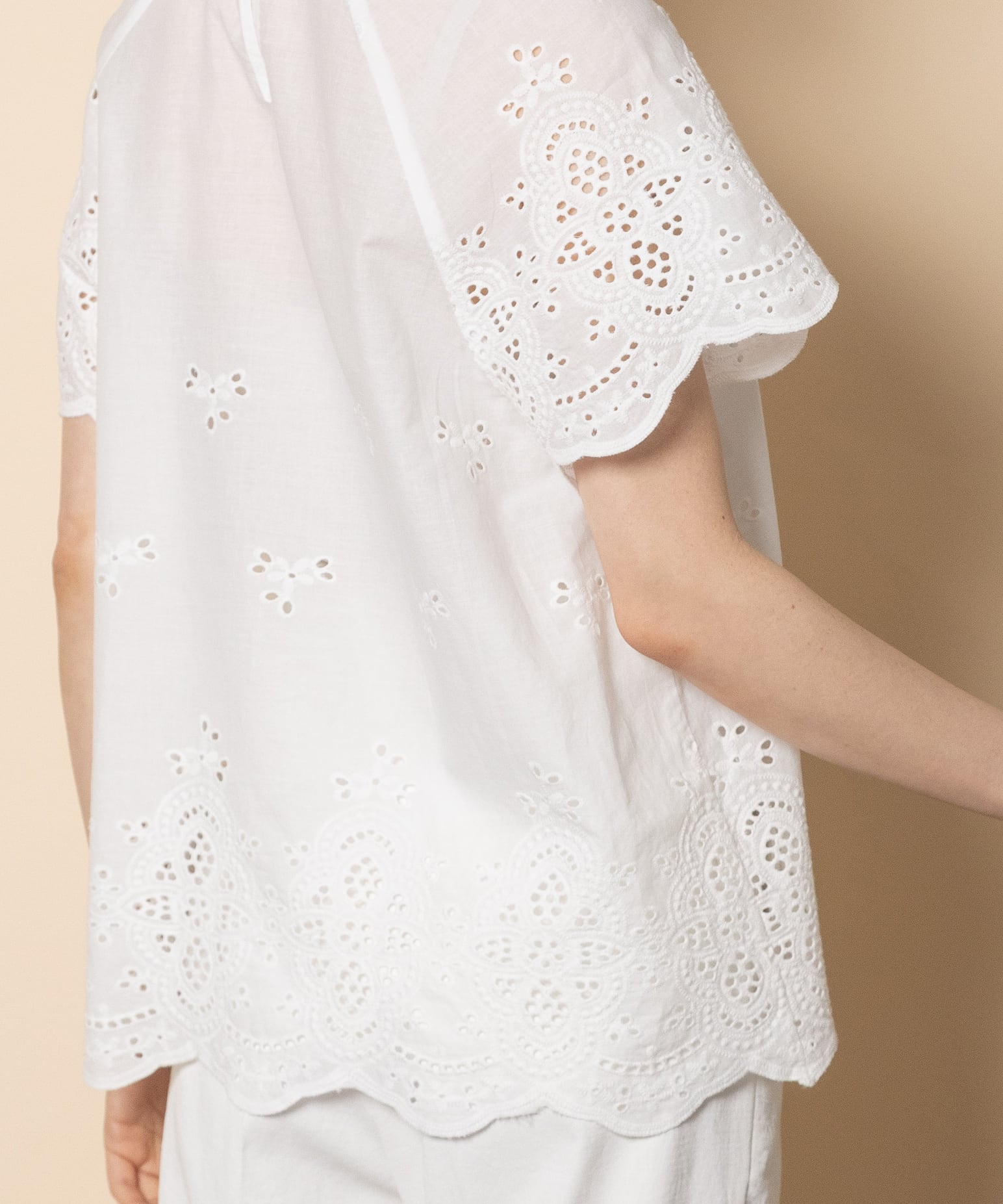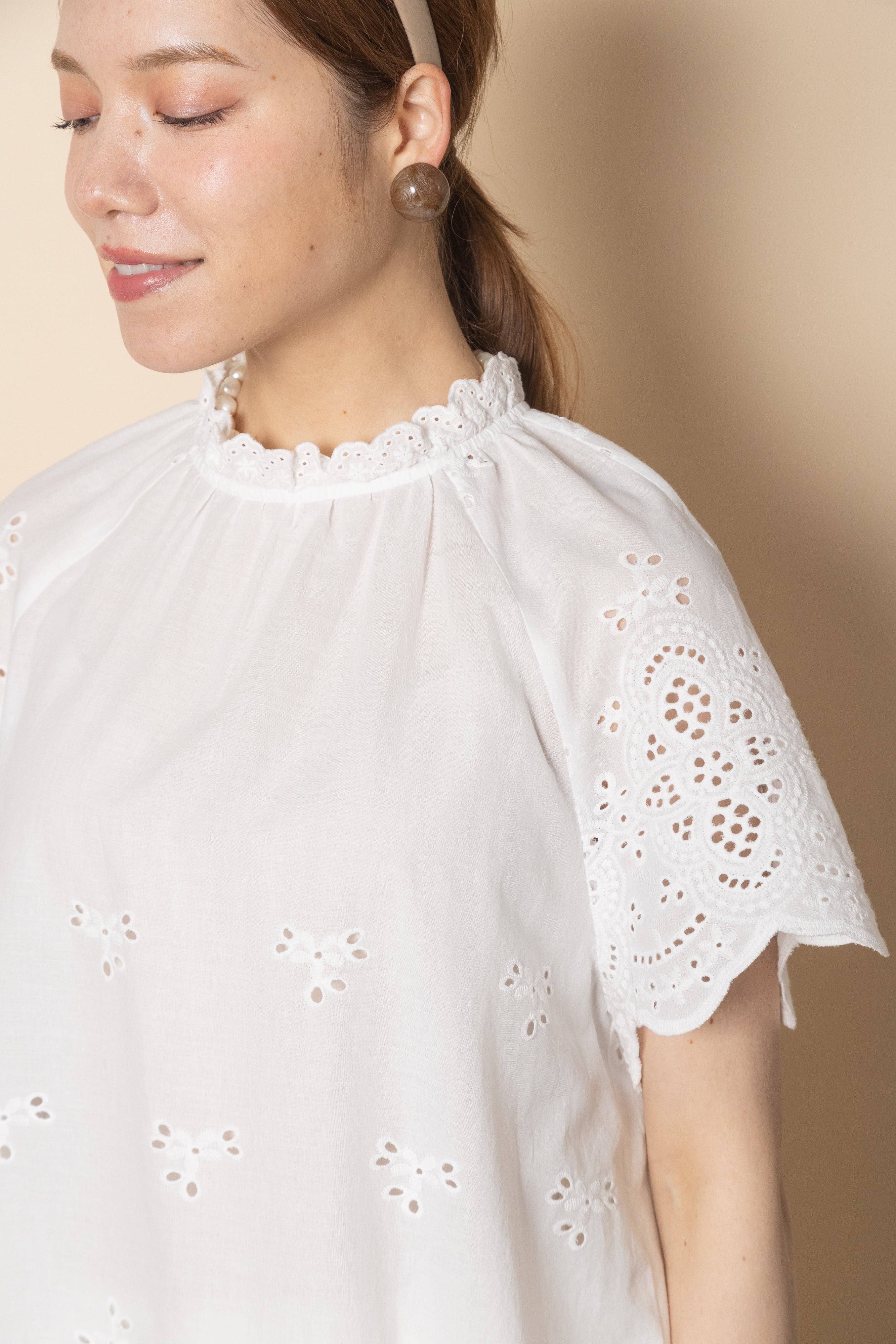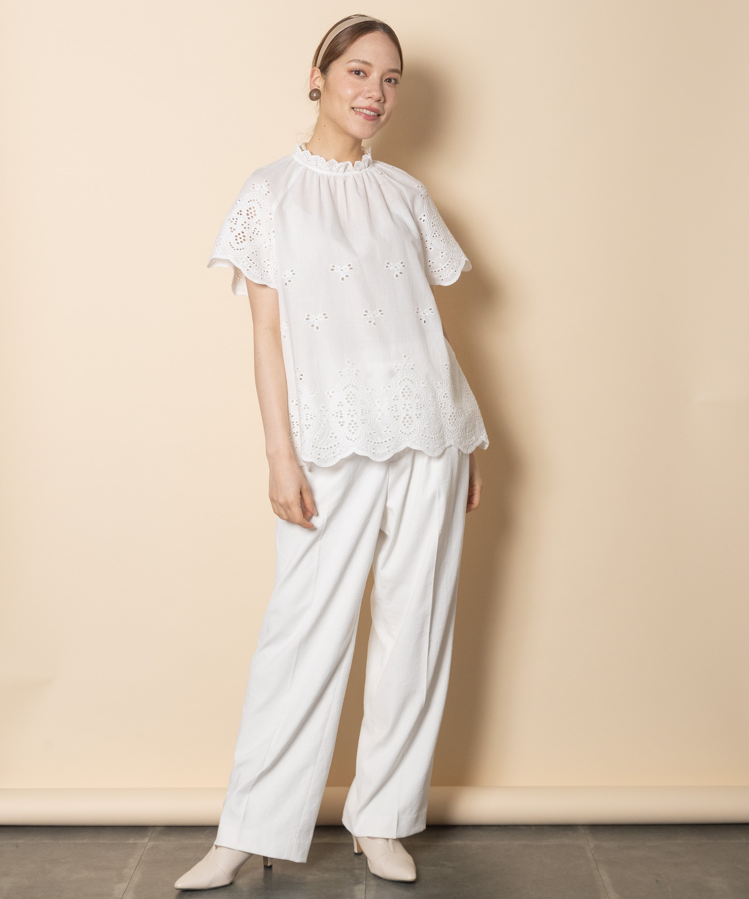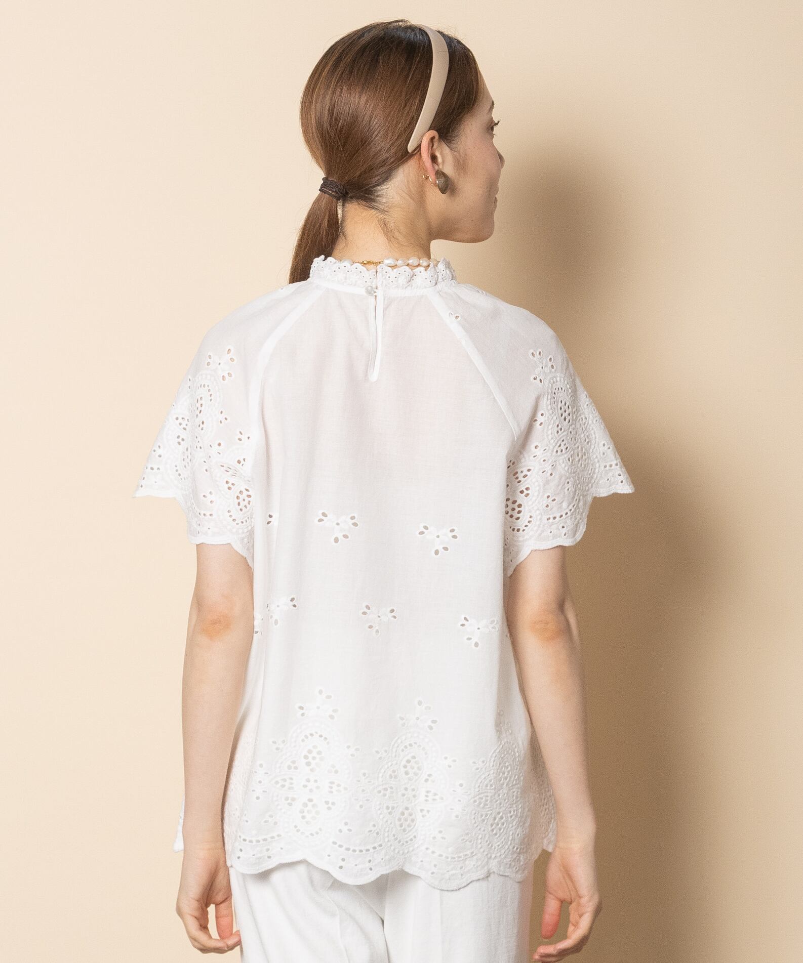 フェミニン派の夏の定番アイテムのカットワークブラウス。首元はプチスタンド襟にフレンチ袖がガーリーな雰囲気。程よいフレア感でノンストレスでご着用頂けるアイテムです。