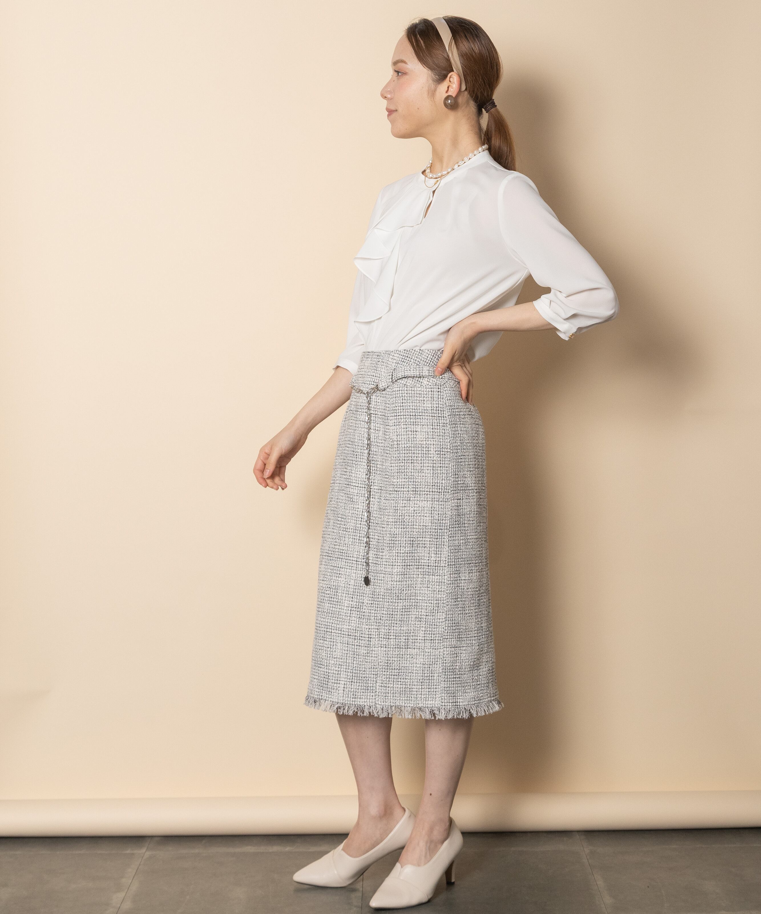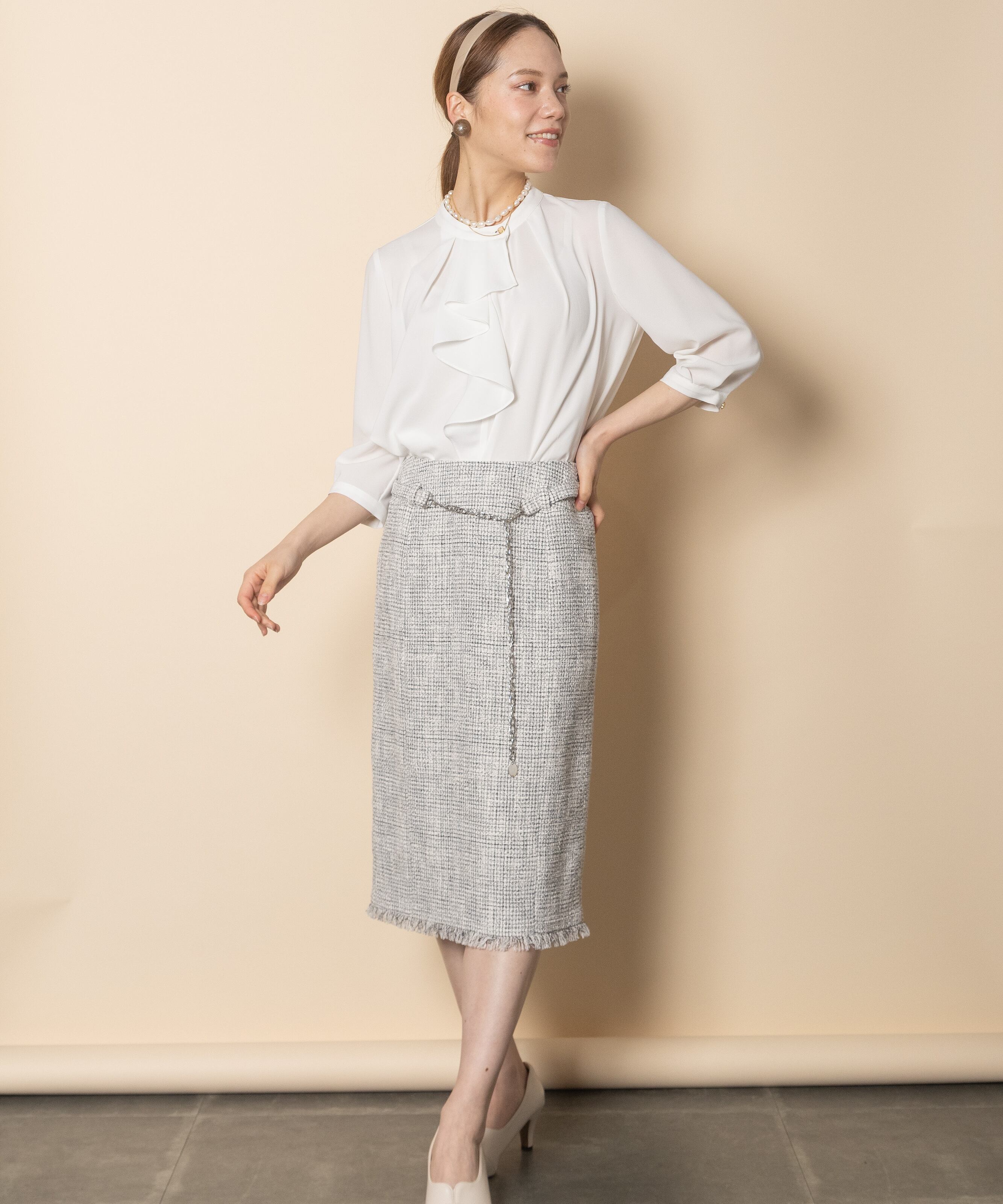 セレモニーシーン・オフィスシーンでおすすめ。キレイめブラウスと相性の良いスカートです。