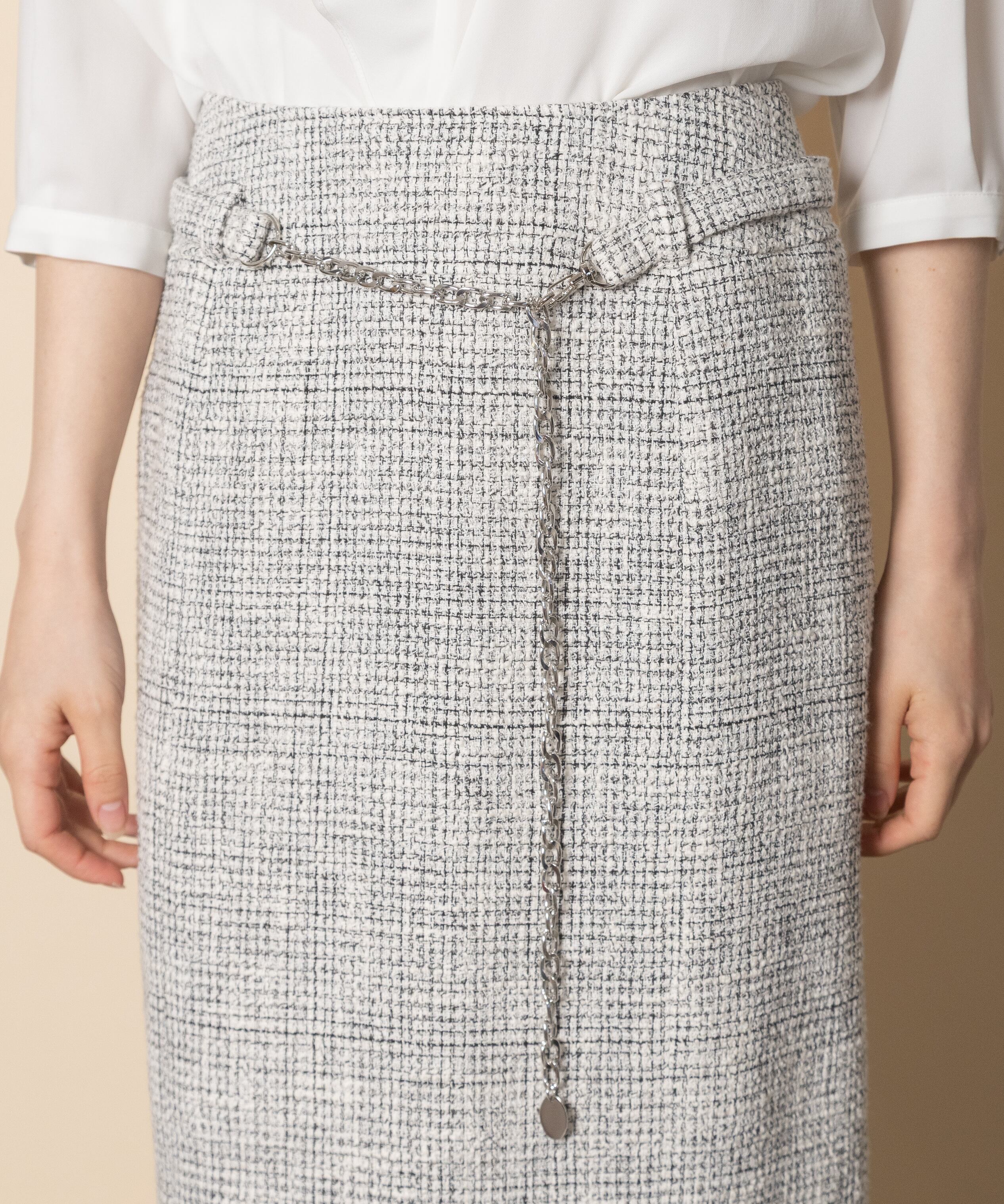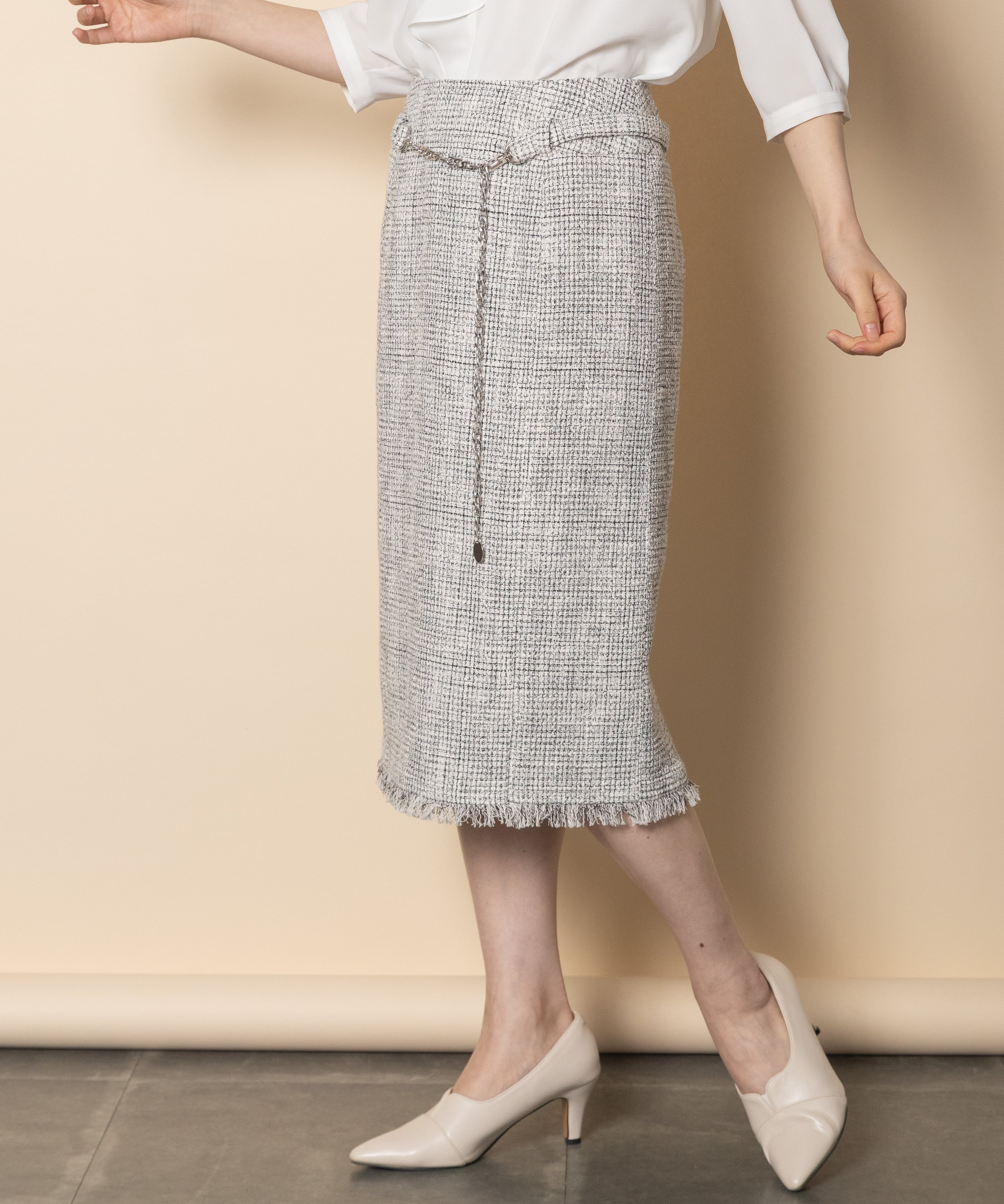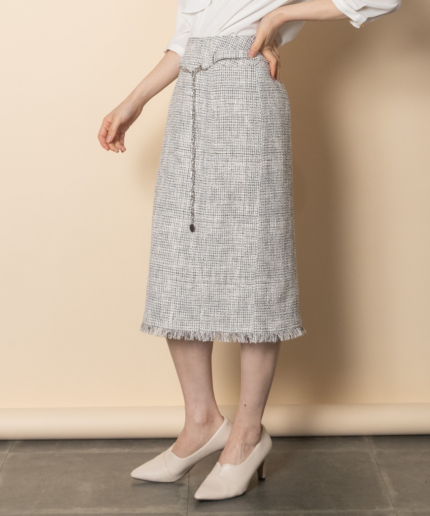 大人の魅力あるエレガントなスカート。断ち切りのフリンジにレトロなウエストチェーンベルト付き。Iライン縦長効果のある仕立てのキレイなスカートです。同素材のジャケットとセットアップでもおすすめ。