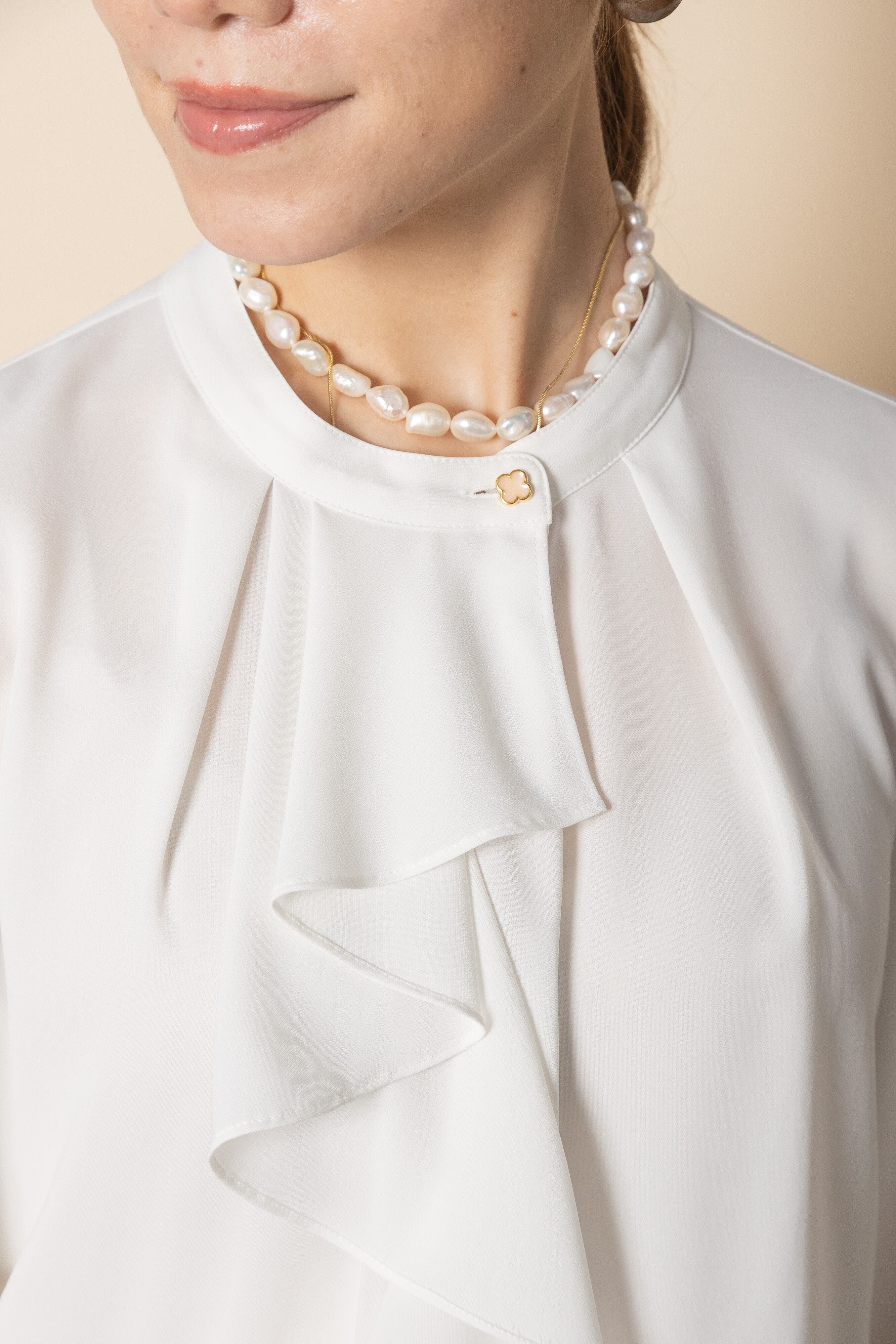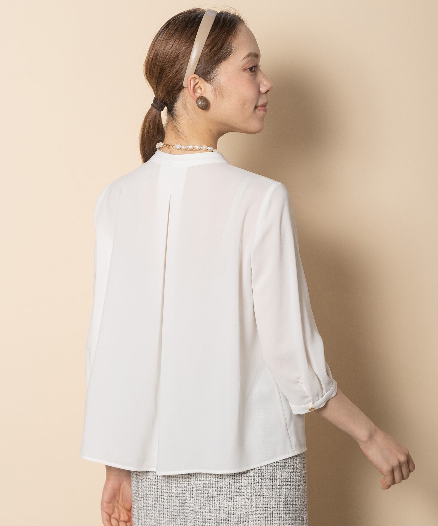 エレガント派のオフィシャルシーンやお出かけシーンにおすすめ。キレイめのテーパードパンツやタイトスカートなどミニマルなボトムと相性の良いブラウスです。