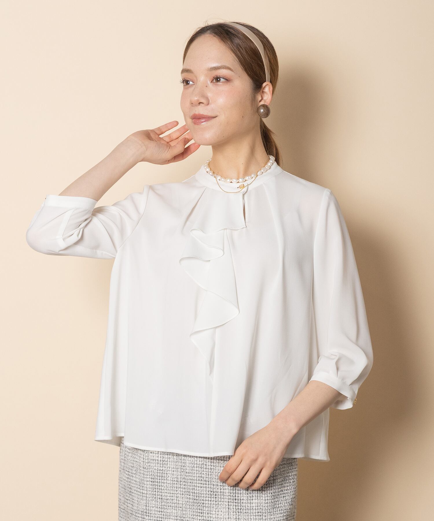 エレガントでクラシカルな雰囲気のフリルブラウス。フロントのゴージャスなラッフルフリルと八部袖が魅力。胸元フリル部分がジャケットと相性もよく、お仕事シーンやお出かけシーンにおすすめのブラウスです。背中にタックが入っており、アウトでもキレイに決まるブラウス。