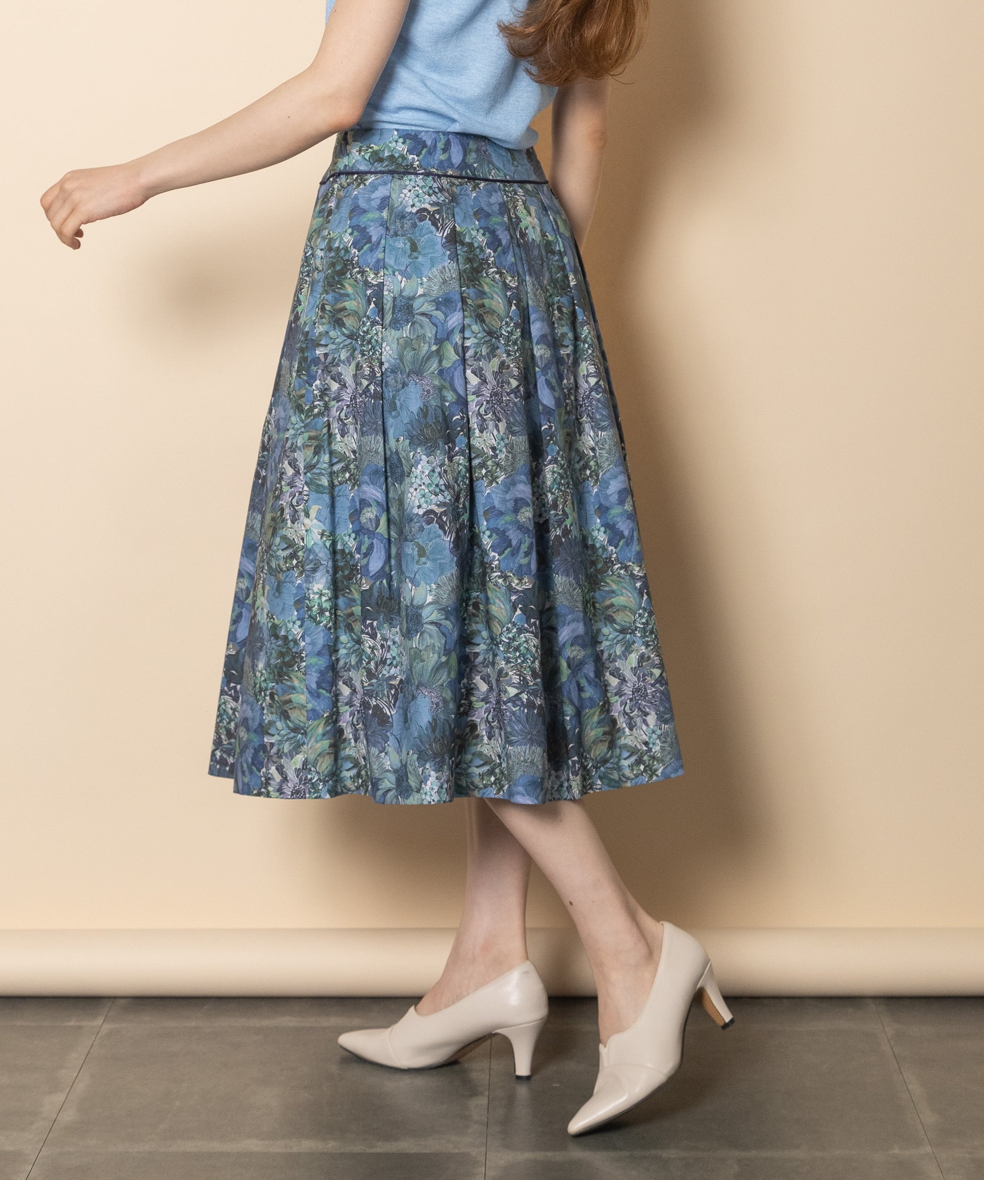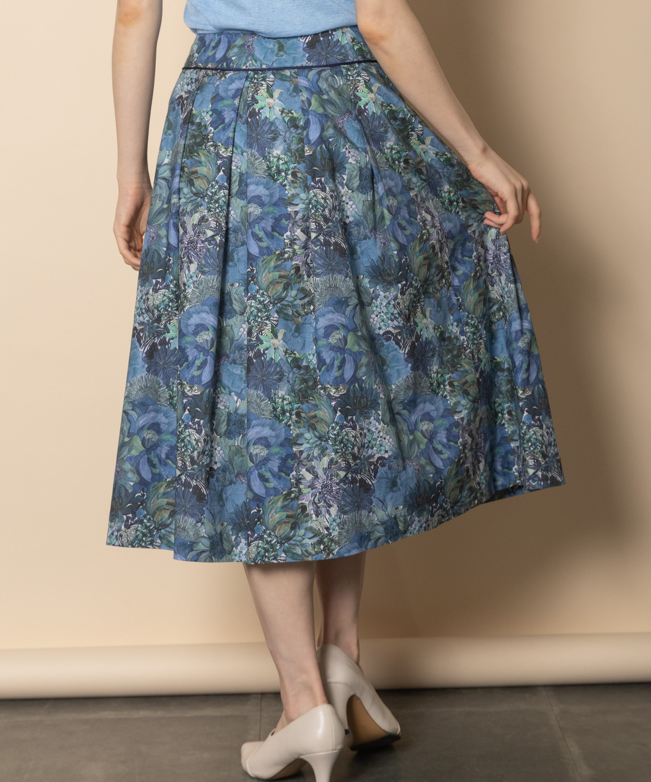 英国調のアートタッチなフラワープリントのフェミニンなスカート。仕立ての良いクラシカルなタックフレアデザイン。キレイめ派におすすめの1枚で映える上品なスカートです。同素材のブラウスとセットアップもおすすめ。