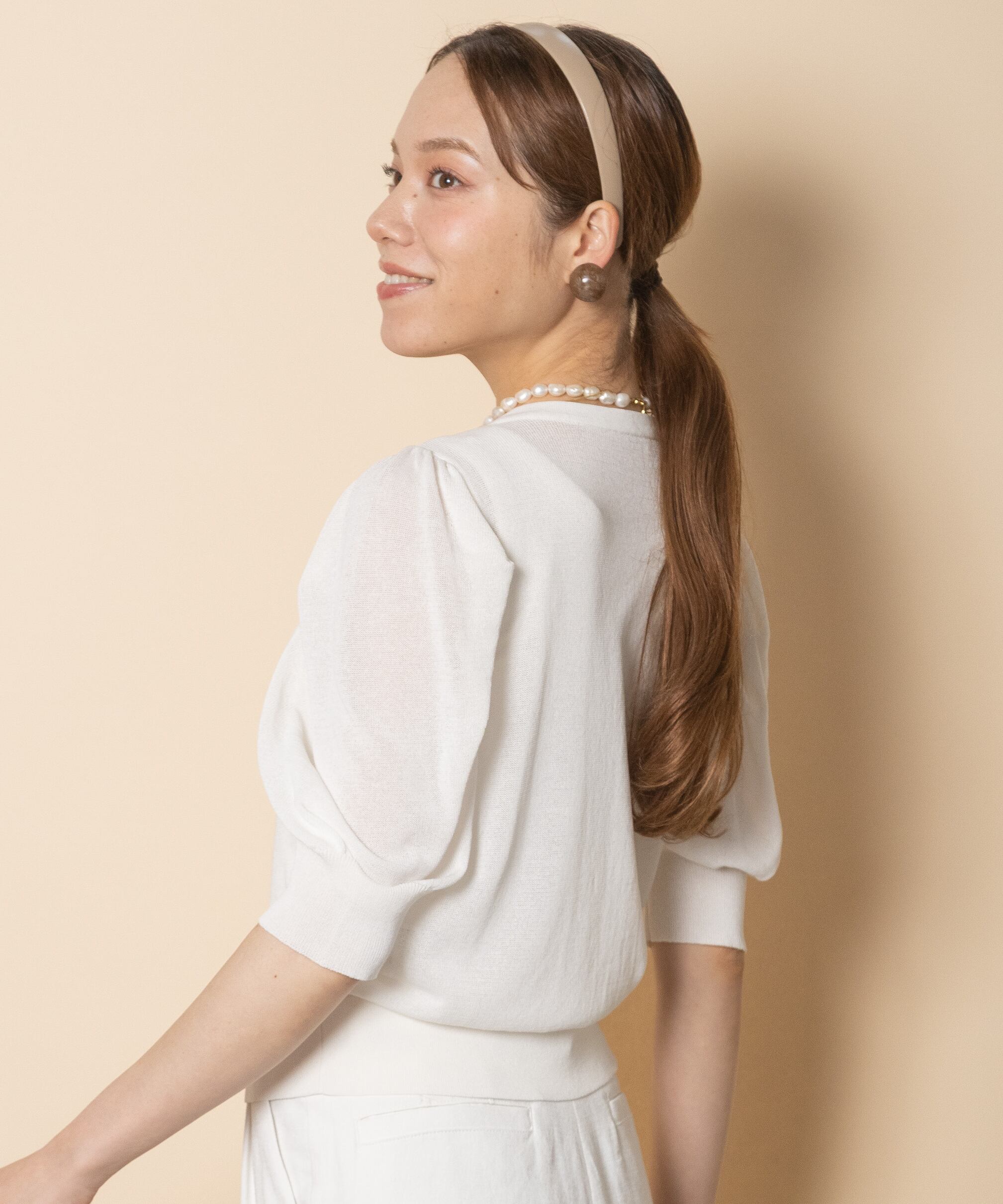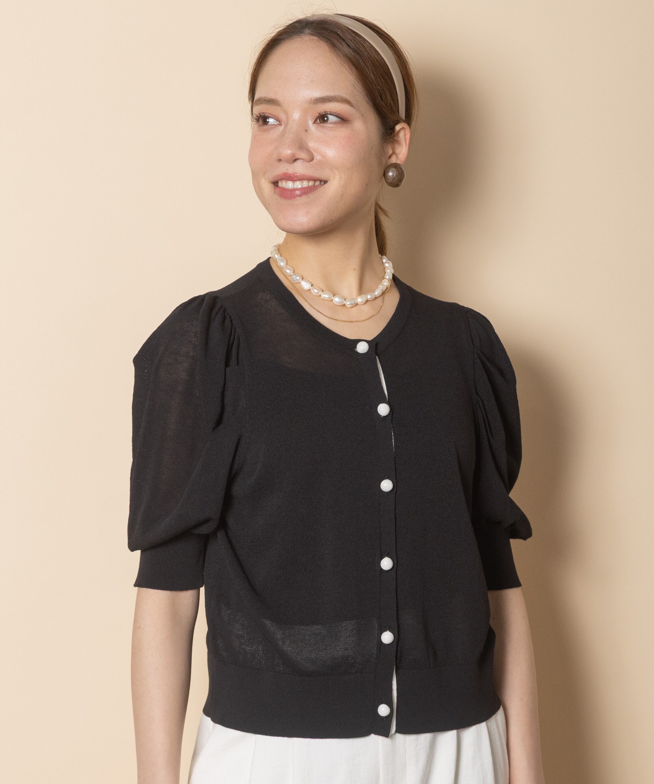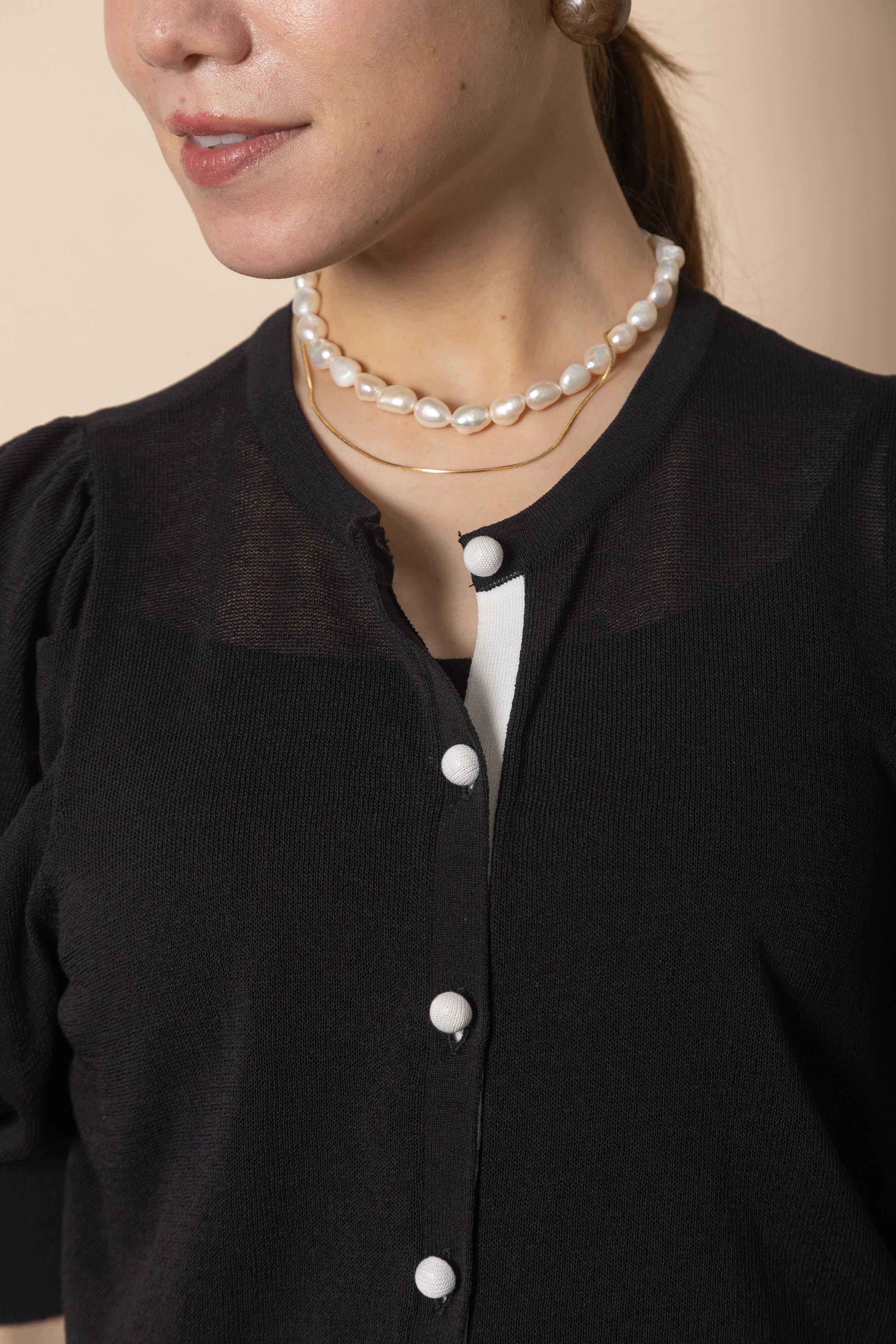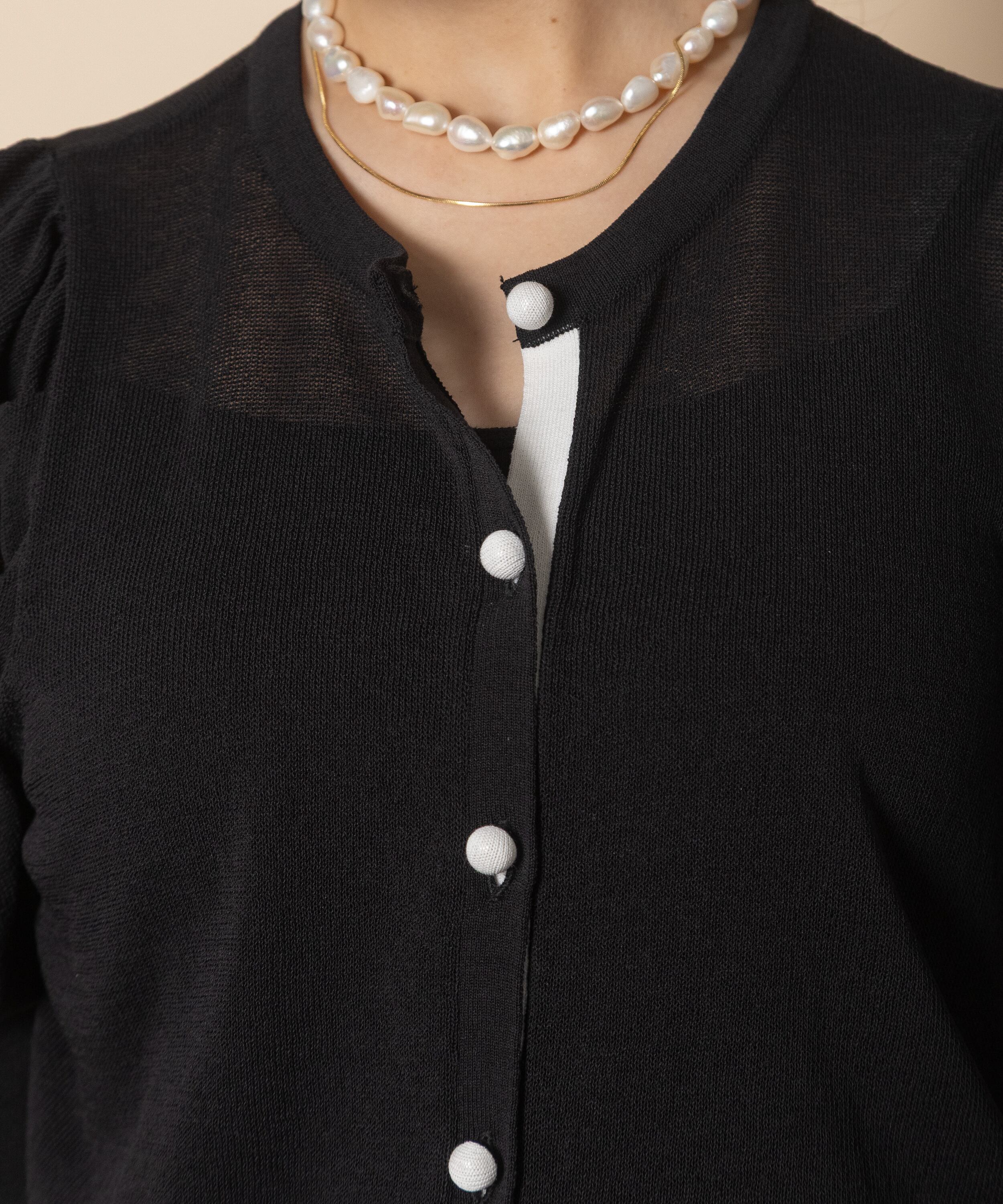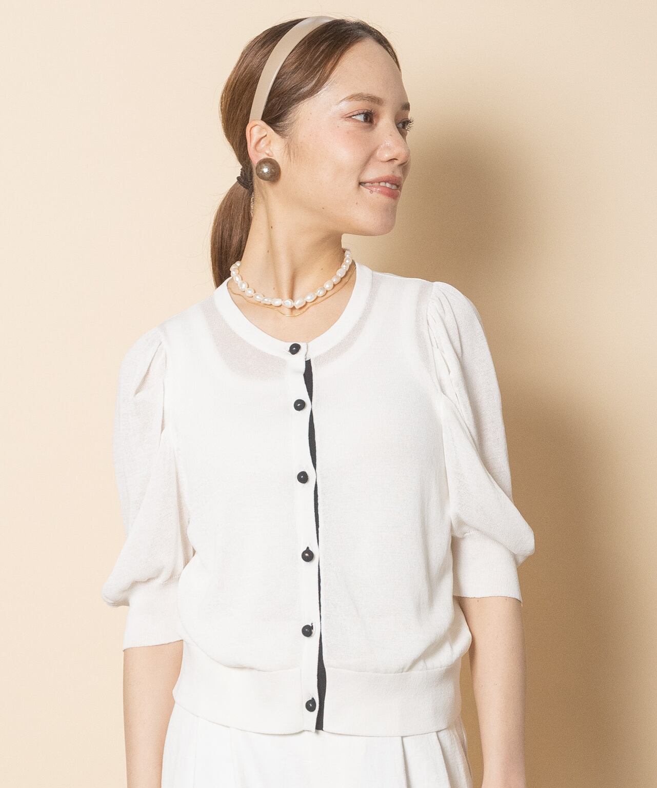 夏におすすめの五部袖のバイカラーカーデ。前縦が配色バイカラー仕様、ボタンはニット包みボタンと細部にまでこだわりのあるアイテムです。ショート丈で合わせやすく、スカートにもパンツにも相性のよいデザイン。