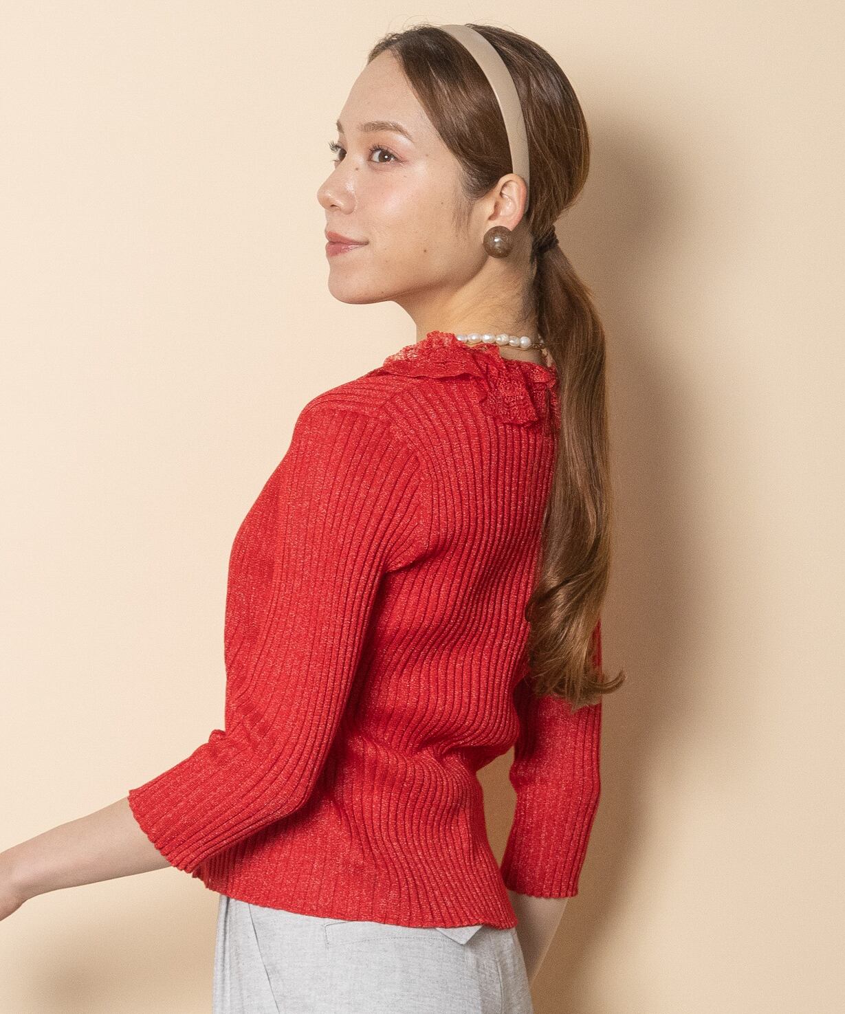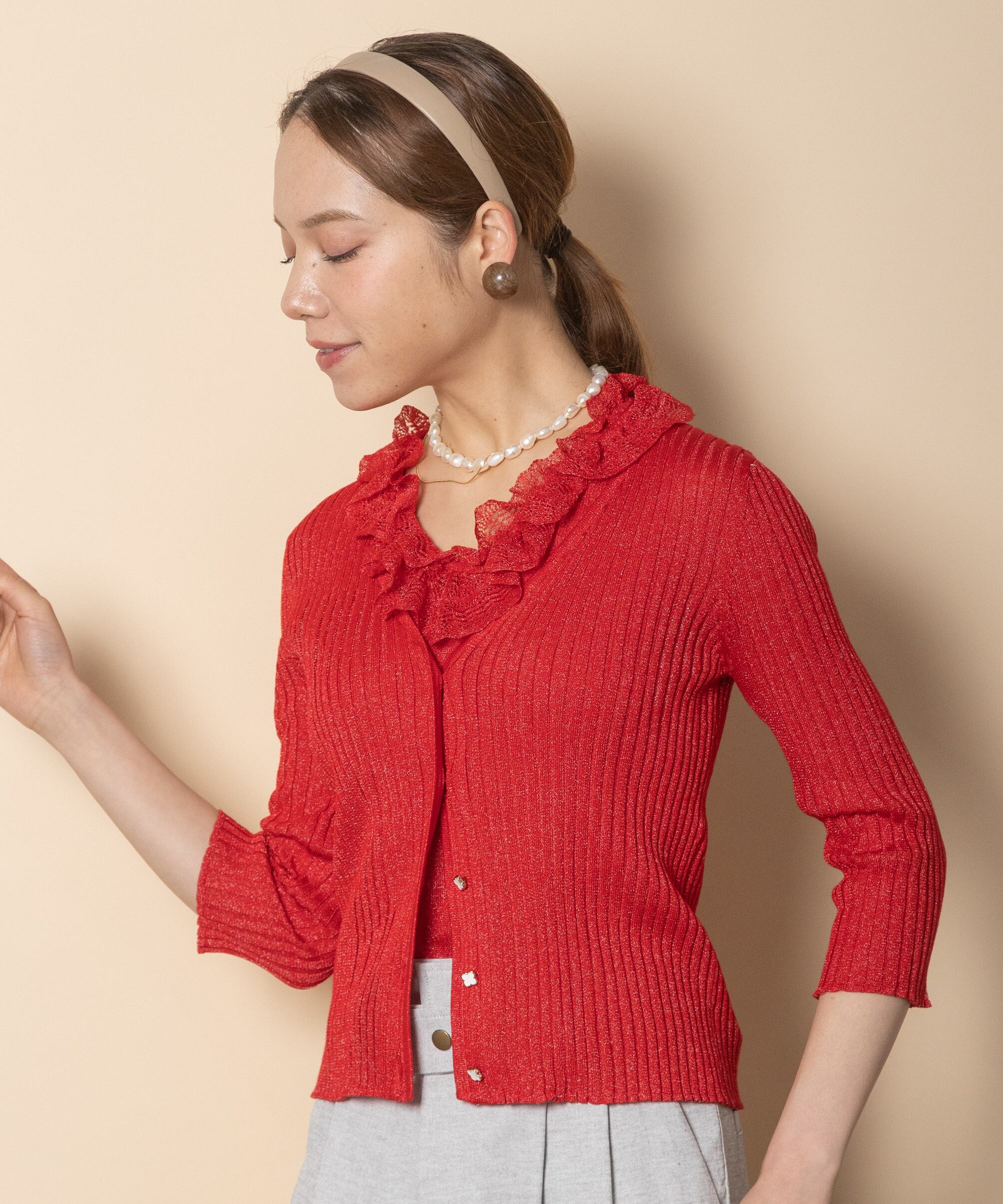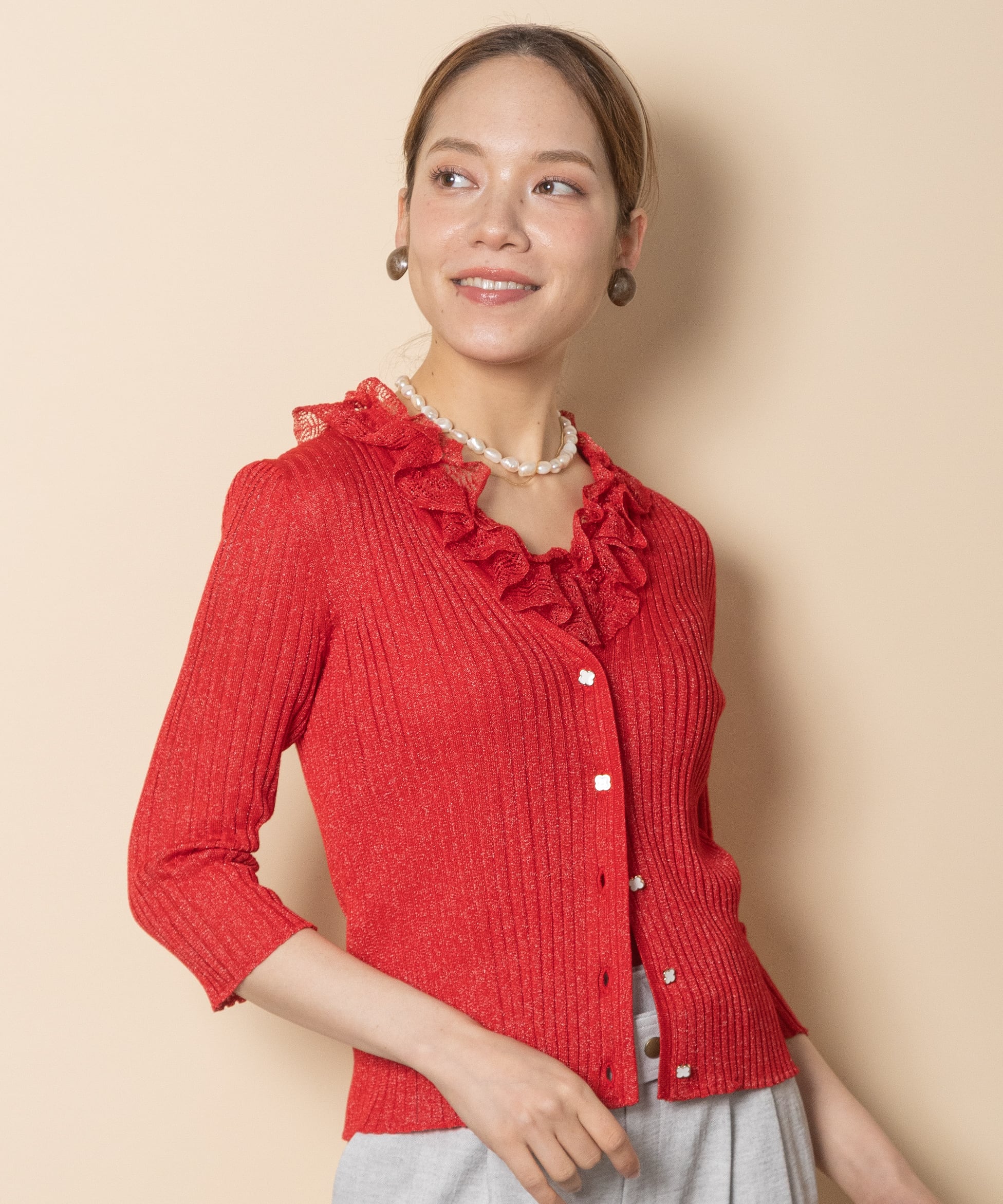 エレガンス派におすすめのニットカーデ。エレガントな雰囲気のラメ混、花をモチーフにしたようなこだわりのボタン、バランスの良いVネックと七部袖と細部にまでこだわりのあるアイテムです。ショート丈で合わせやすく、スカートにもパンツにも相性のよいデザイン。