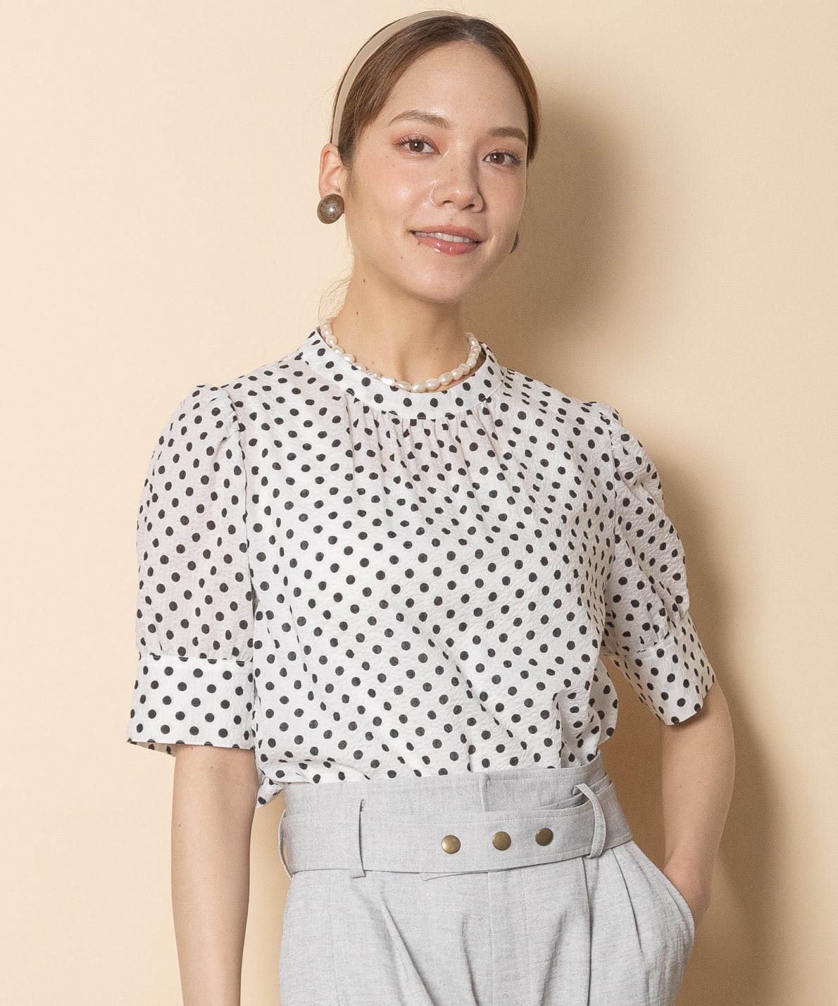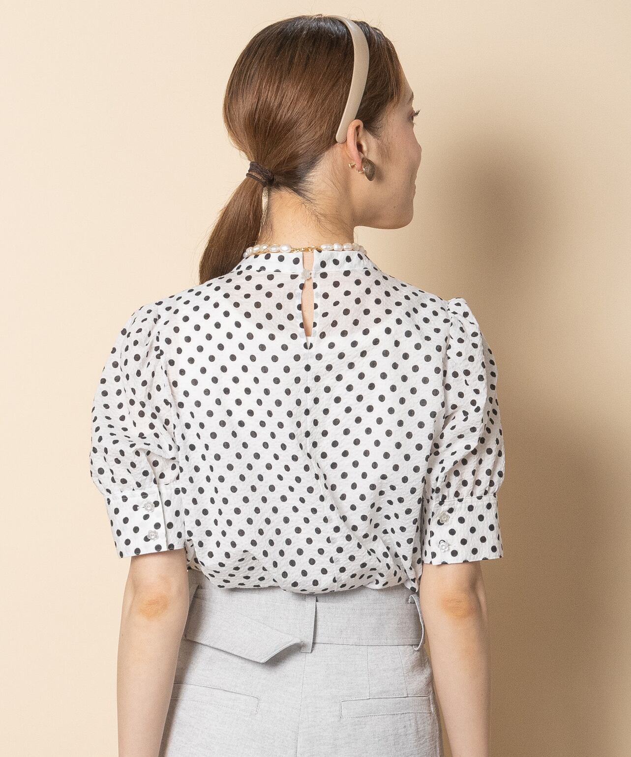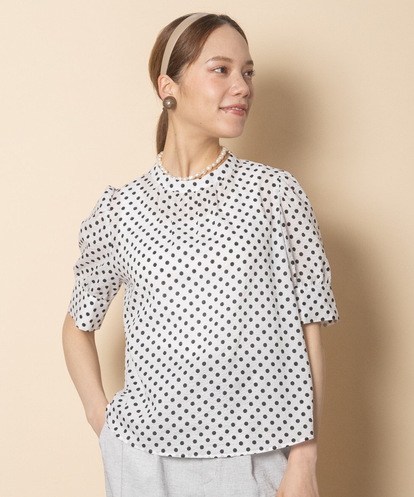 フェミニン派の定番ドットプリントのブラウス。クラシカルな雰囲気のノーカラーギャザー使い、肘上の程よいパフ袖。バックファスナーのプルオーバータイプで上品な印象のアイテムです。