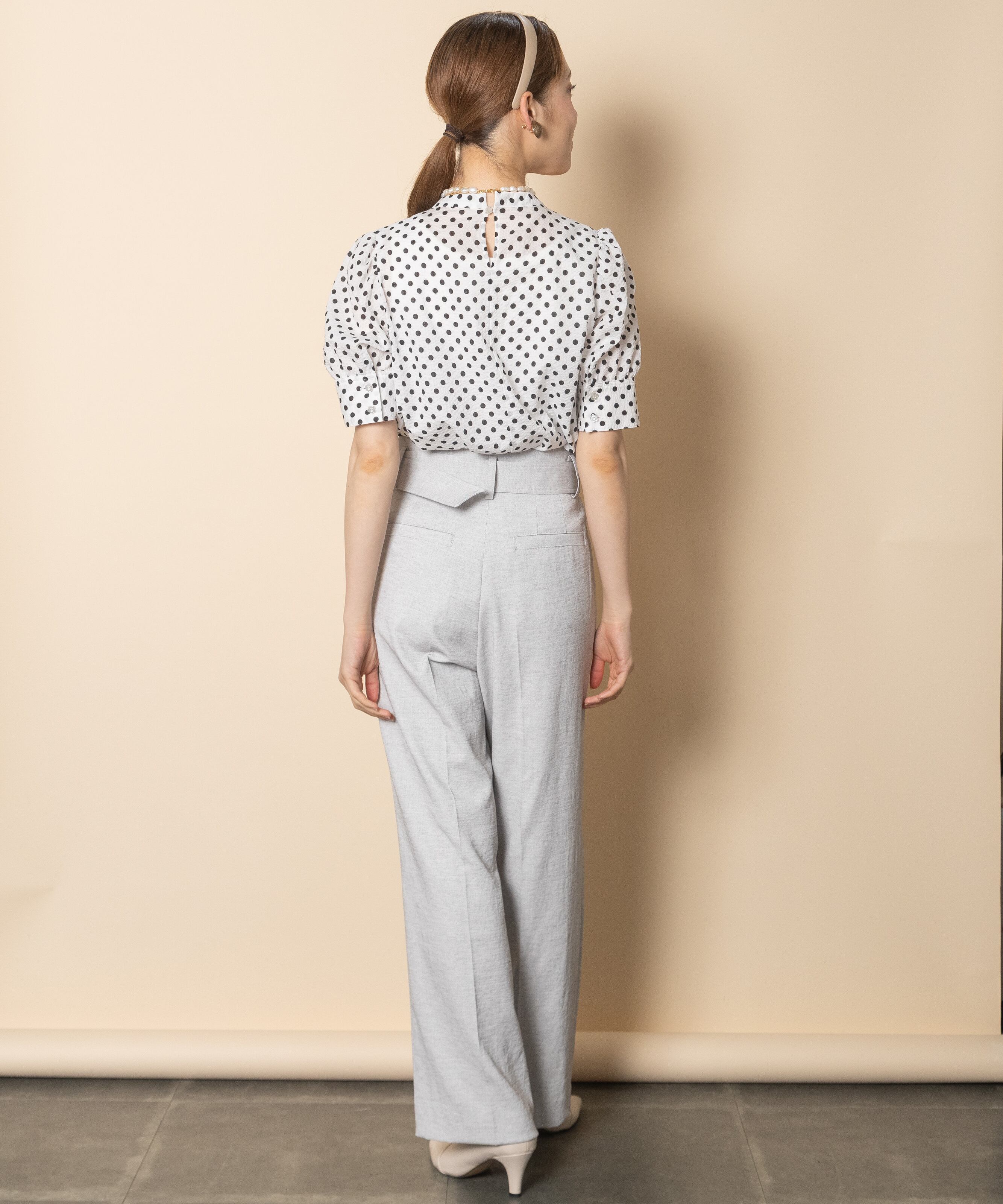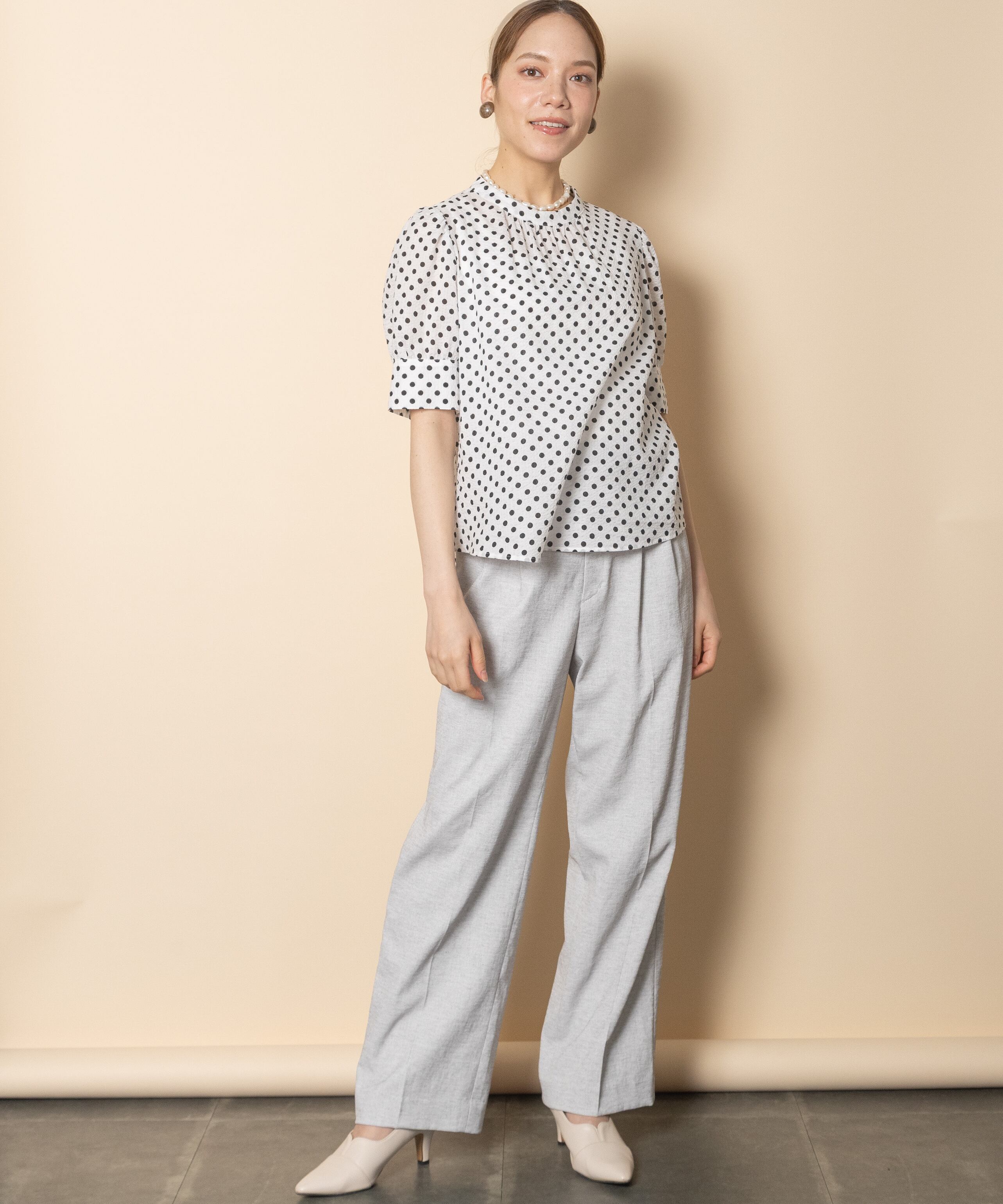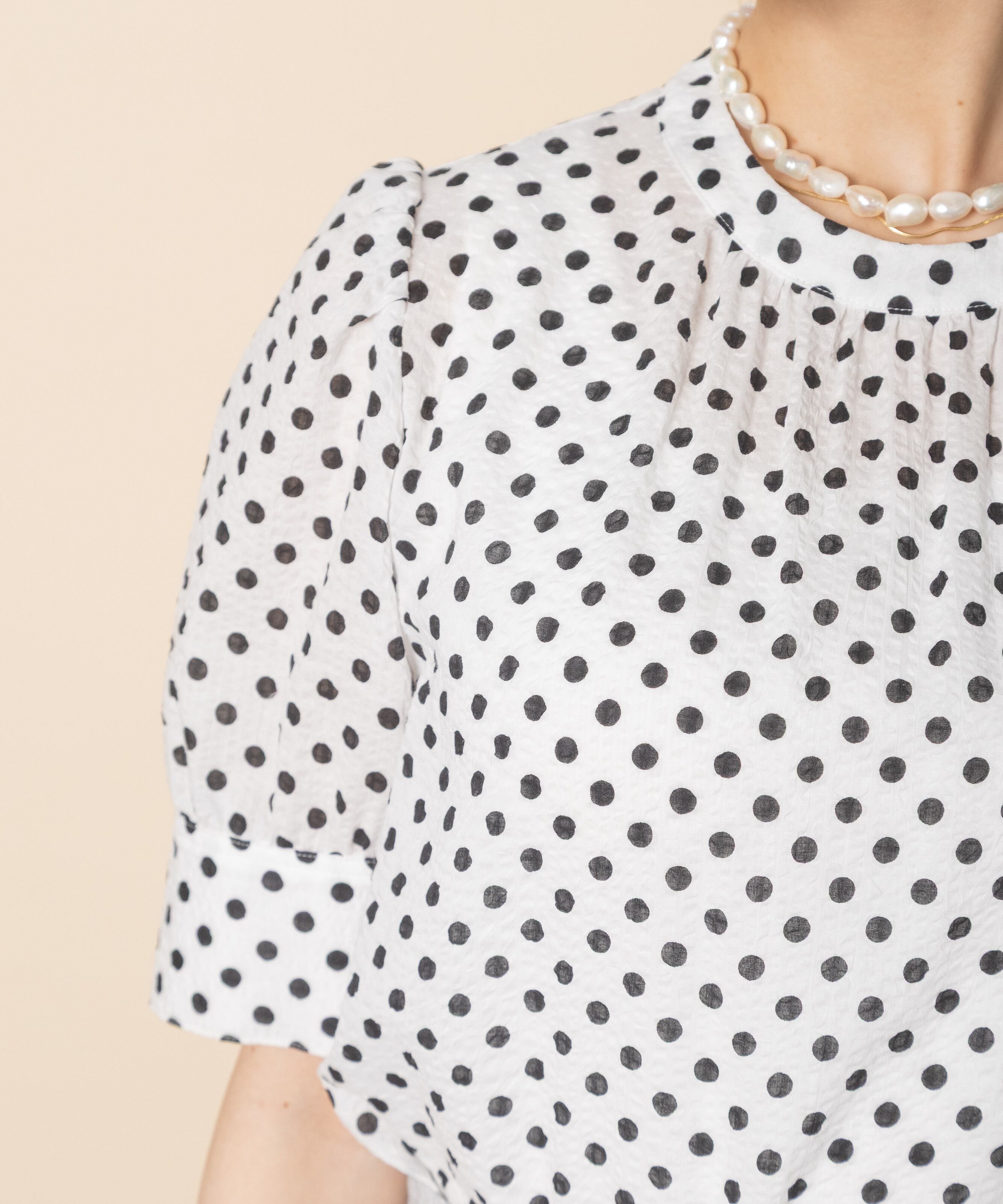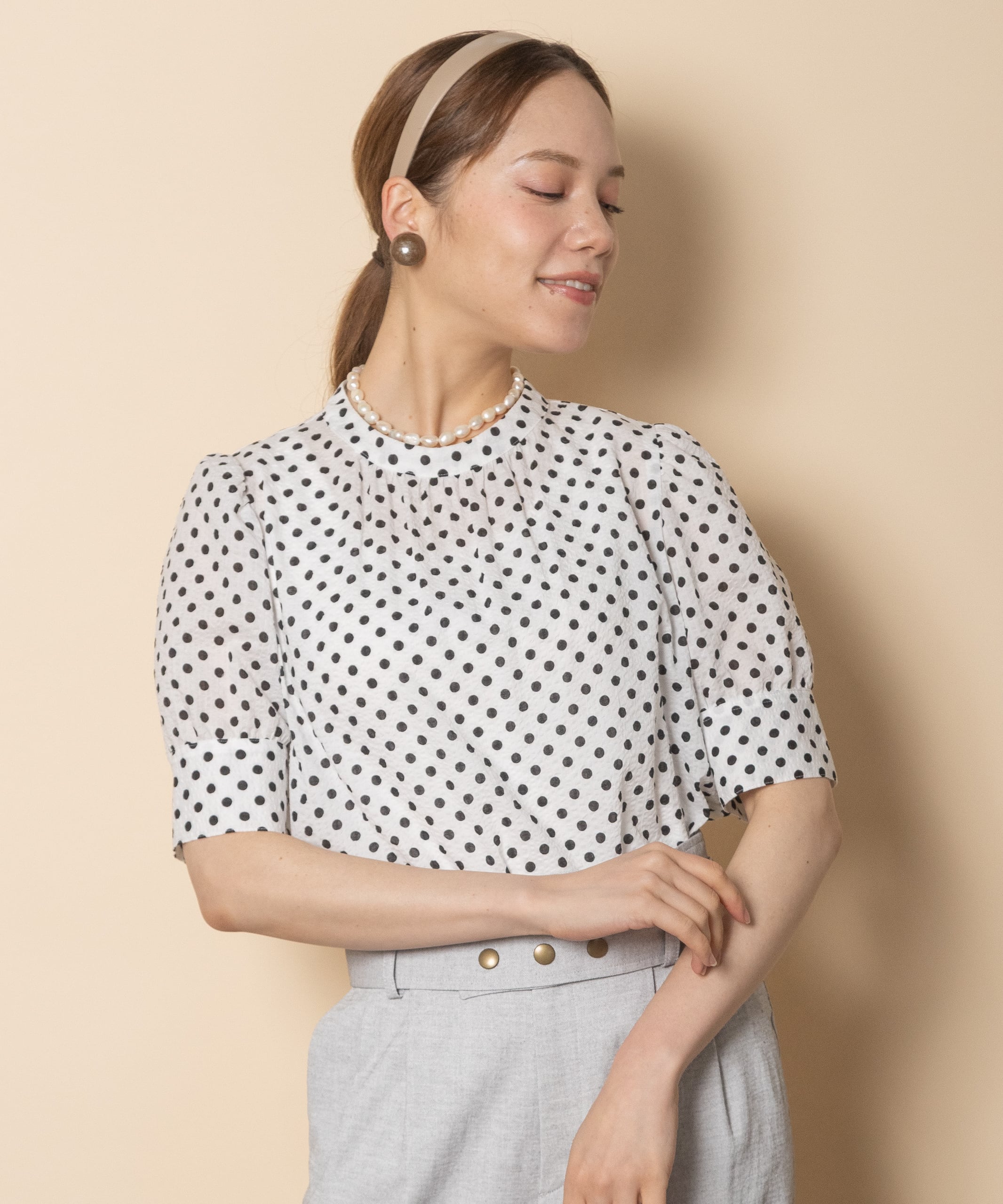 フェミニン派の定番ドットプリントのブラウス。クラシカルな雰囲気のノーカラーギャザー使い、肘上の程よいパフ袖。バックファスナーのプルオーバータイプで上品な印象のアイテムです。