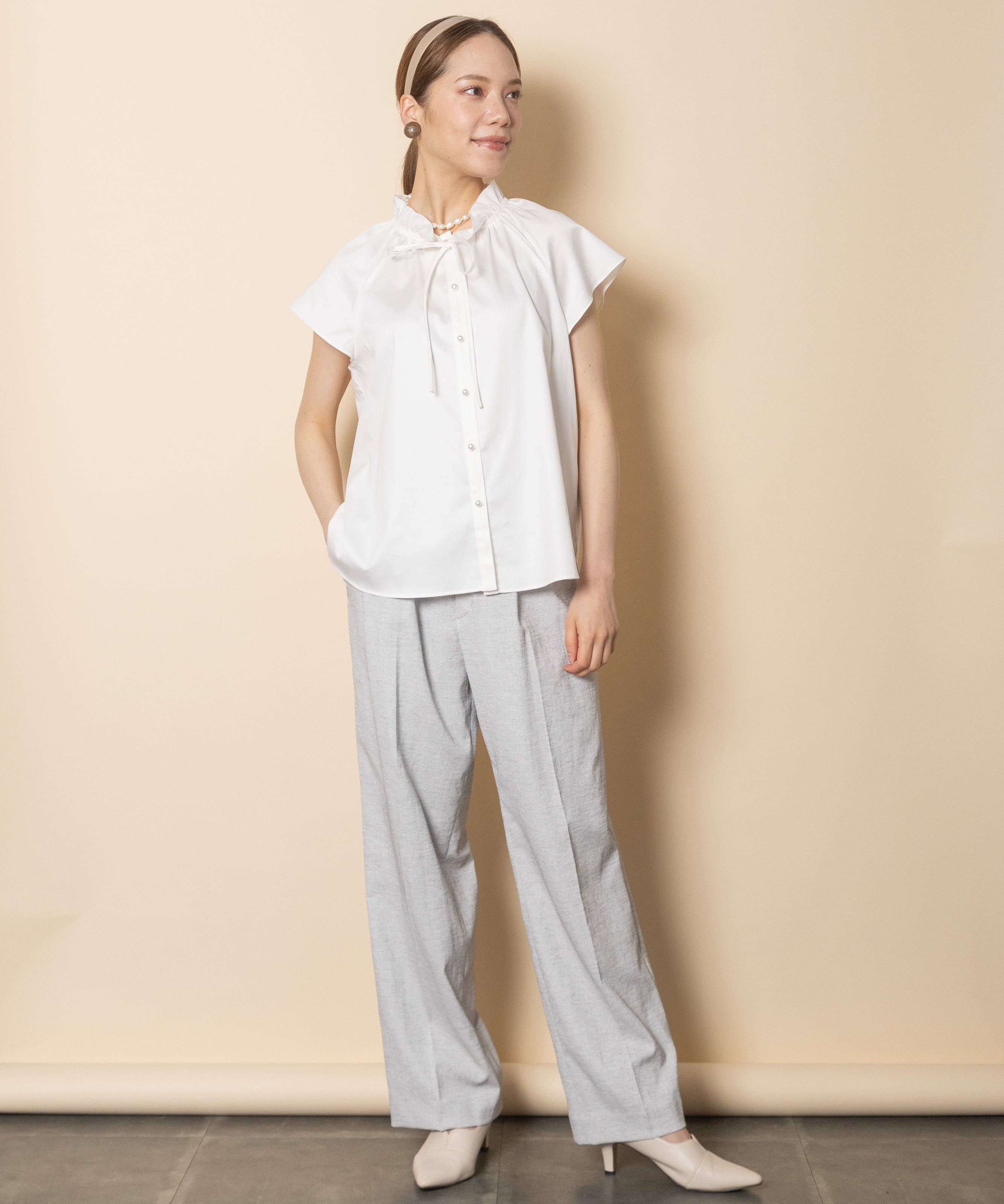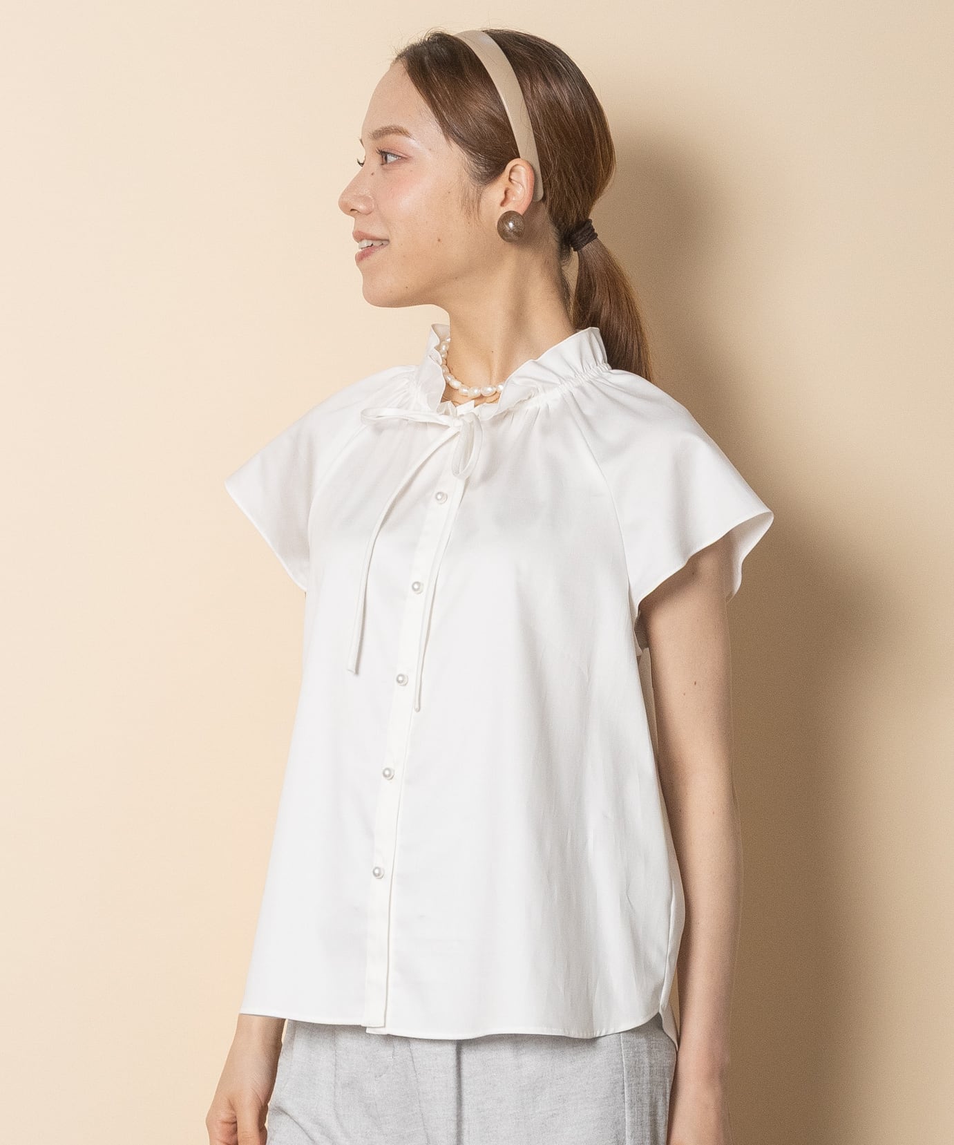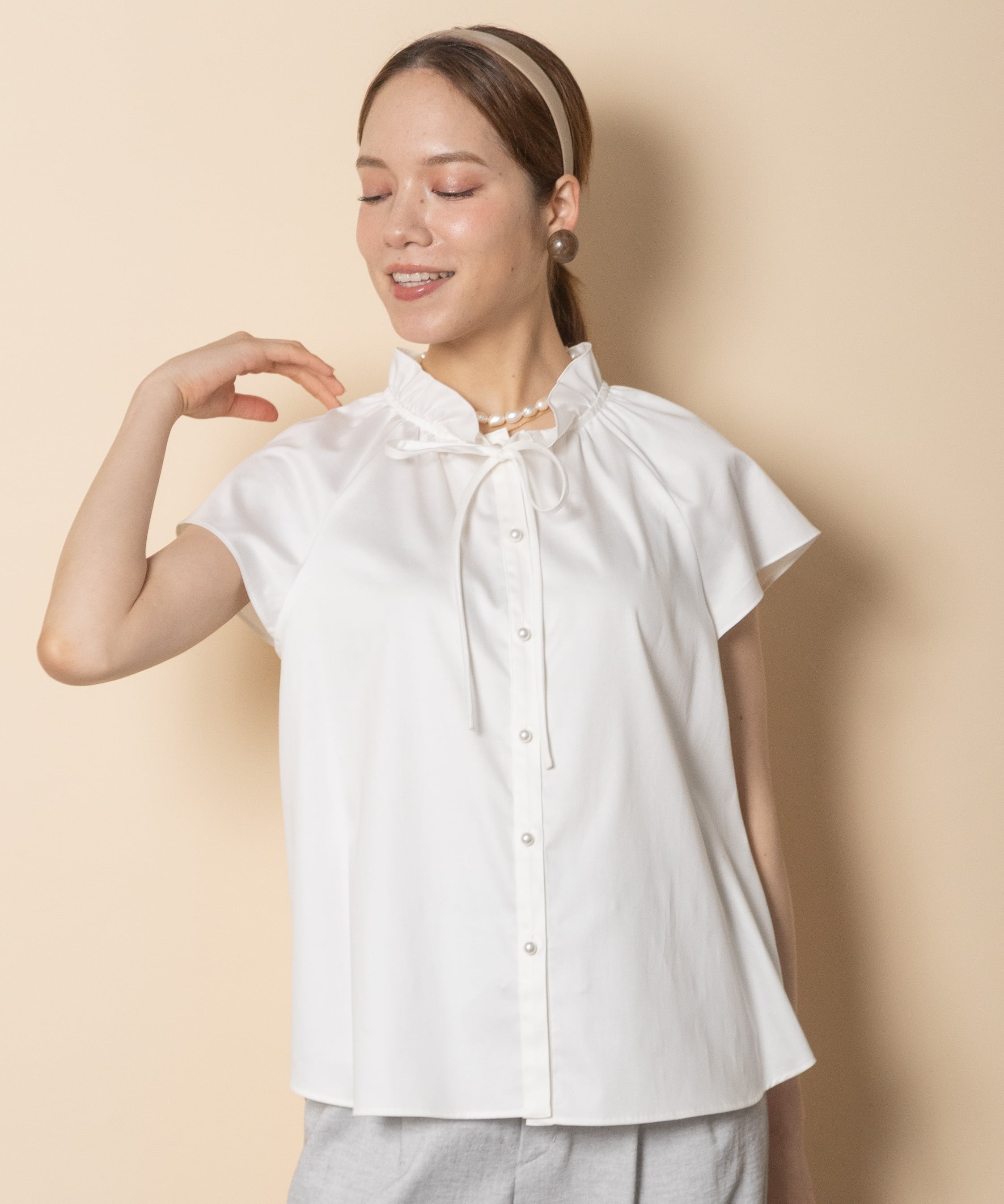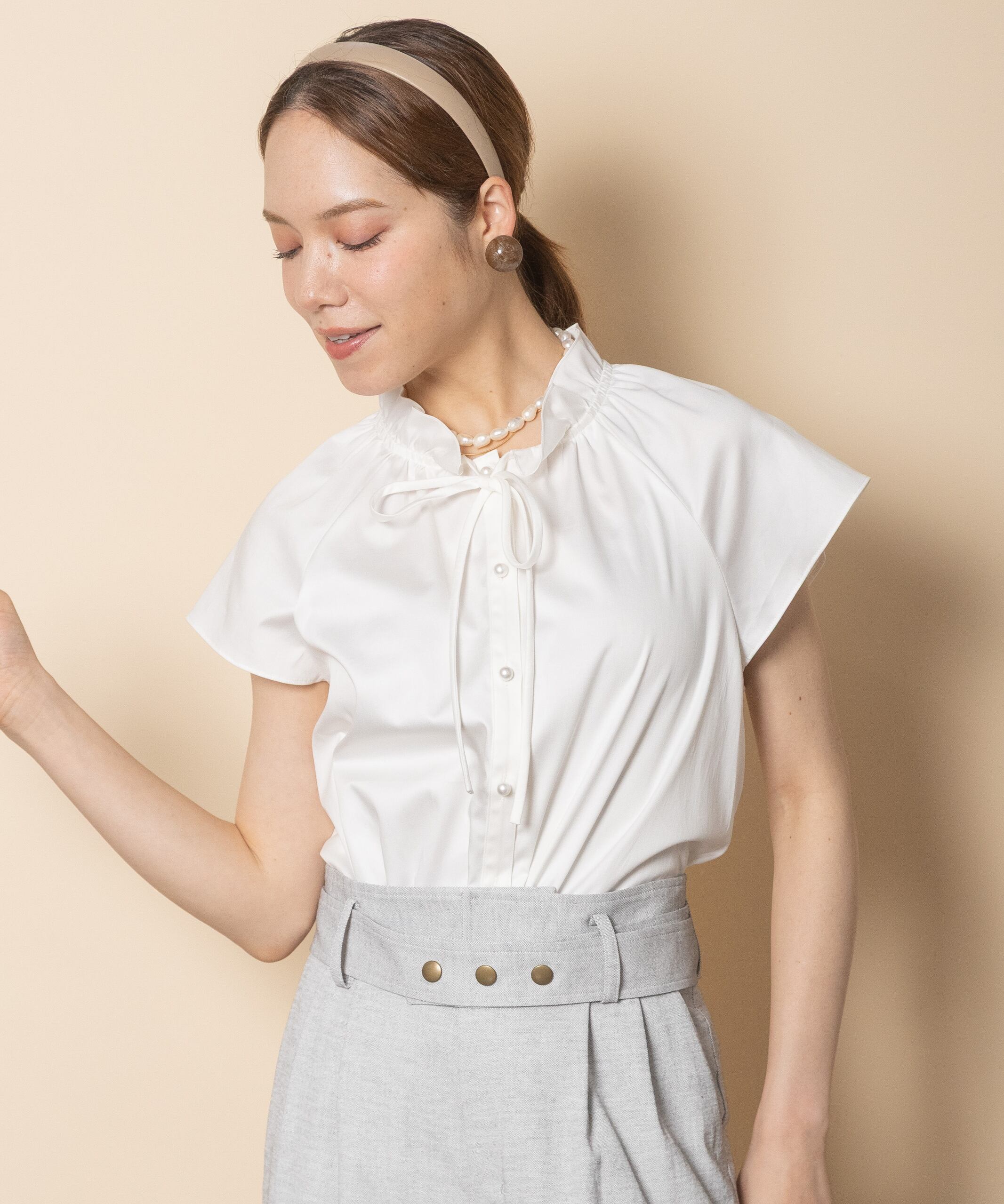 フェミニン派の定番フリルリボンのブラウス。パールボタンにフレンチ袖と可愛らしさのあるフェミニンな雰囲気のデザイン。程よく肩をカバーしてくれるフレンチ袖で上品な印象のアイテムです。ジャケットインナーとしてもおすすめ。