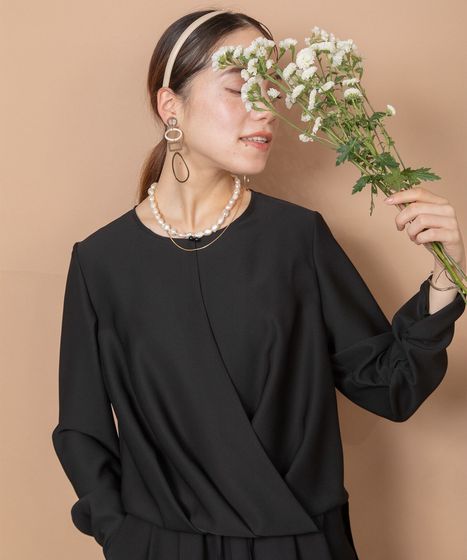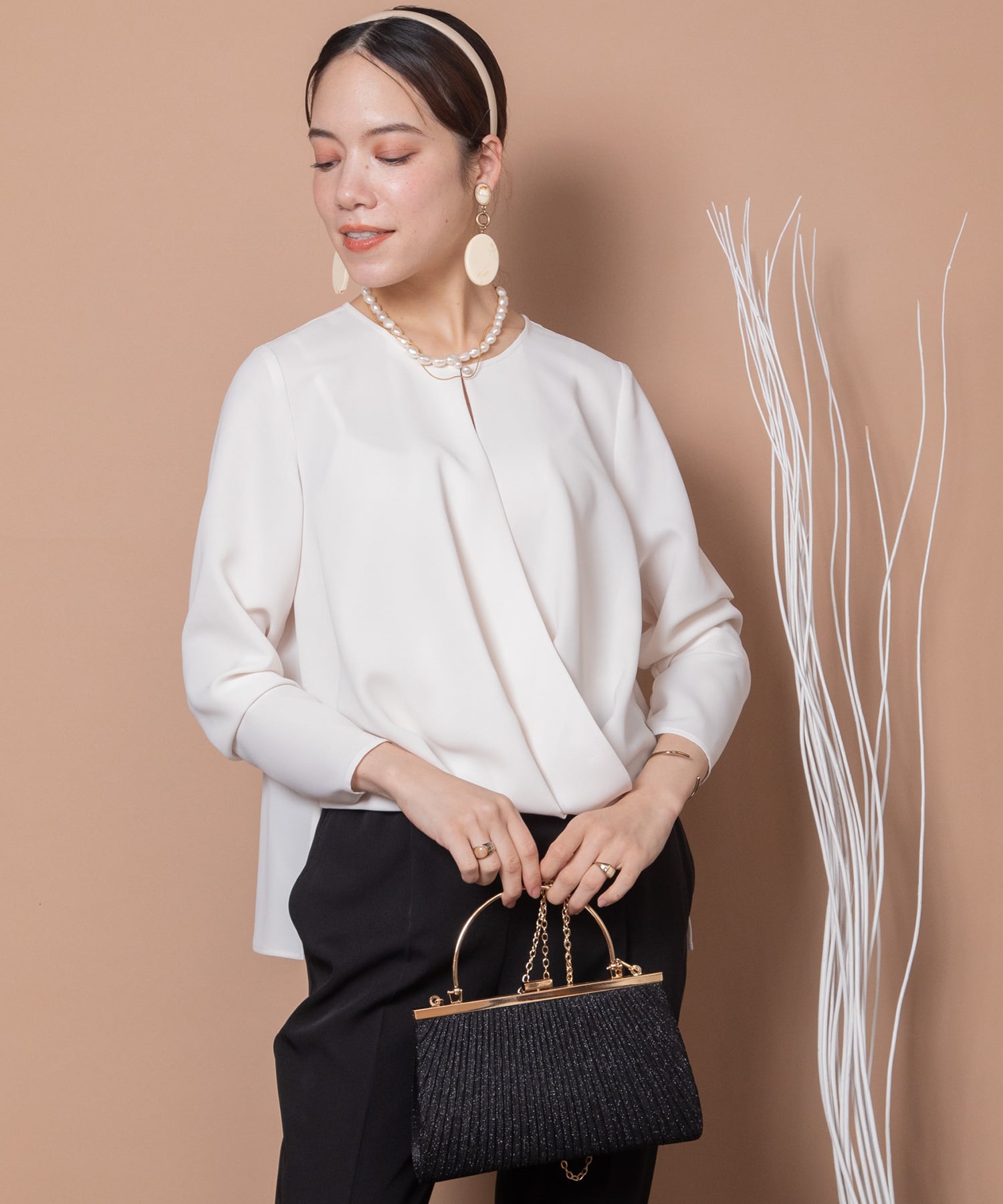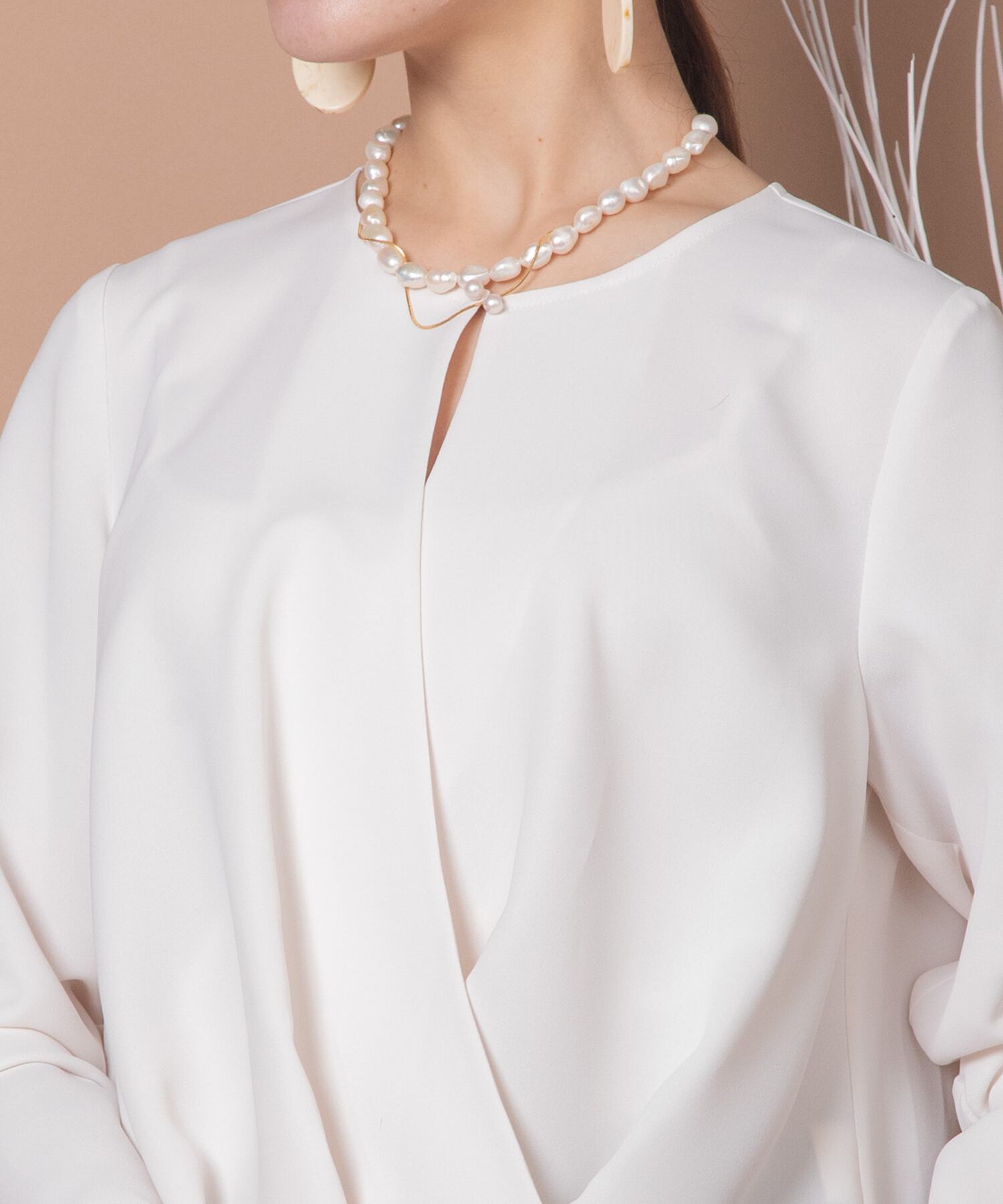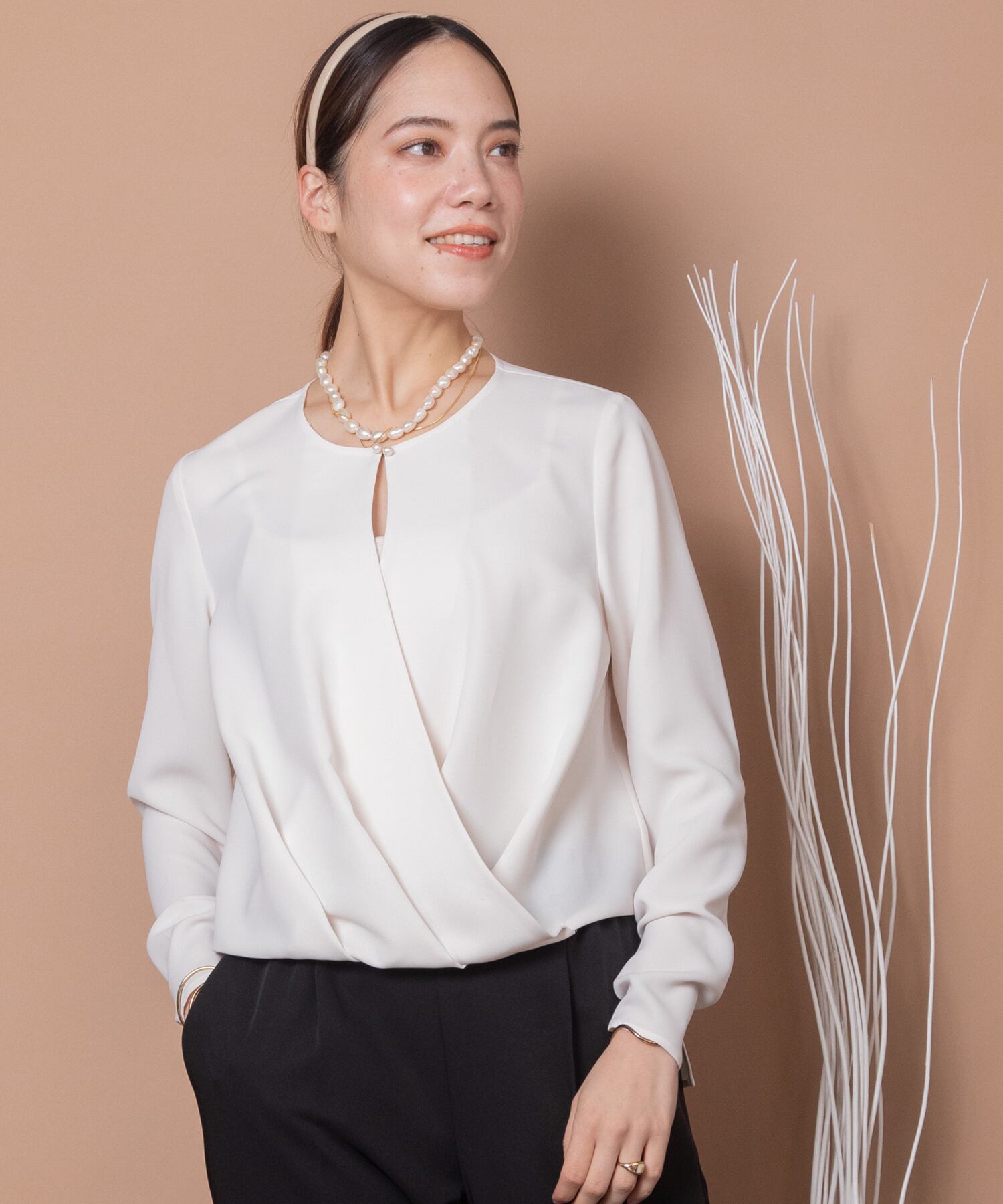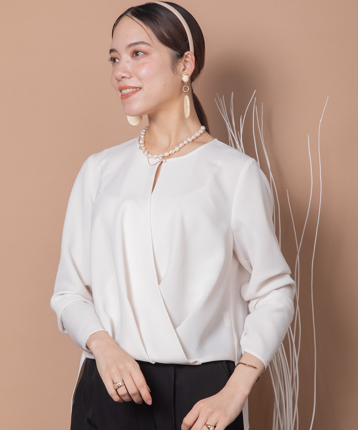 カシュクールのシルエットが美しく縫製映えするエレガントなブラウス。フロントを裾でクロスさせブラウジング風のこだわりデザイン。