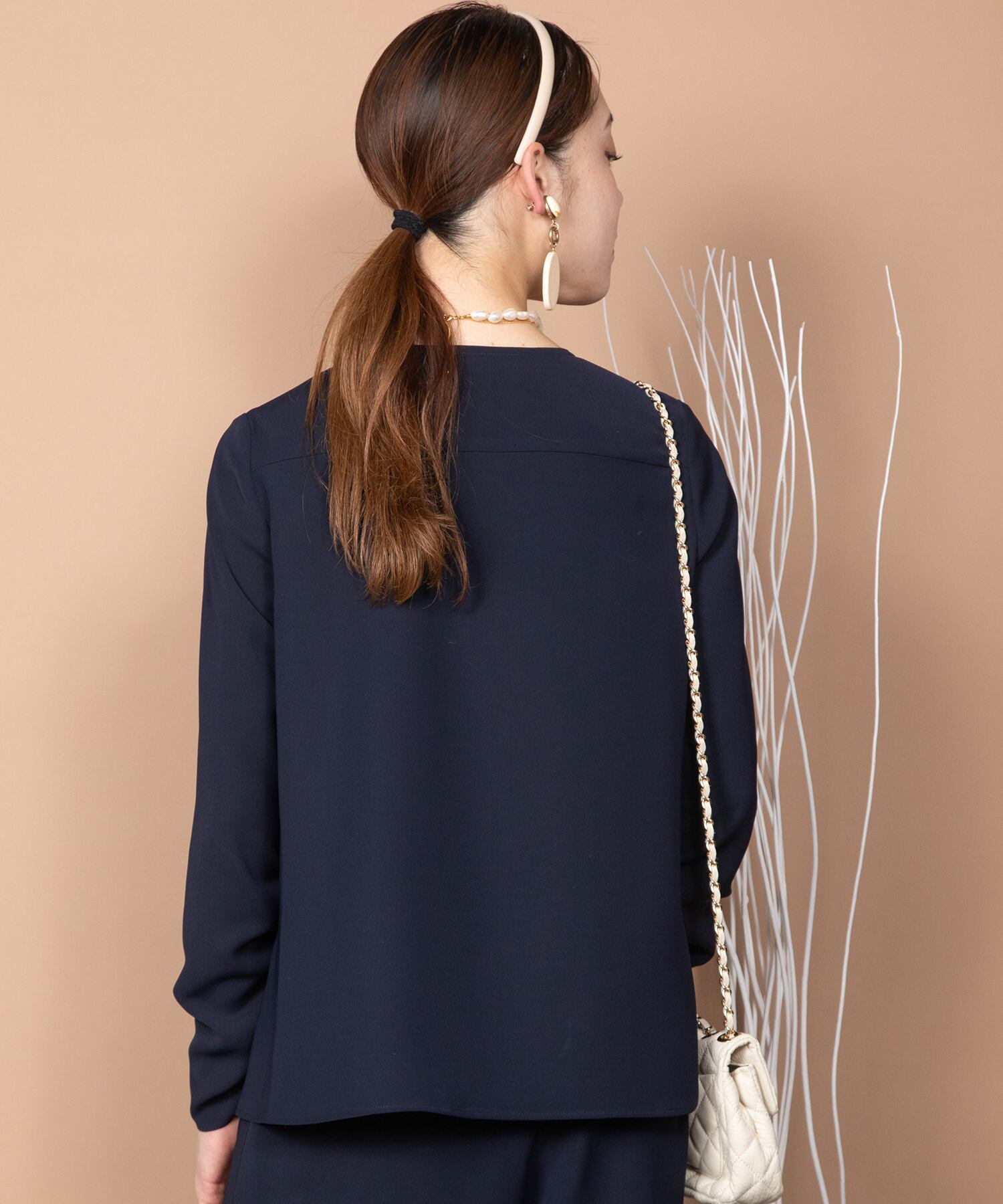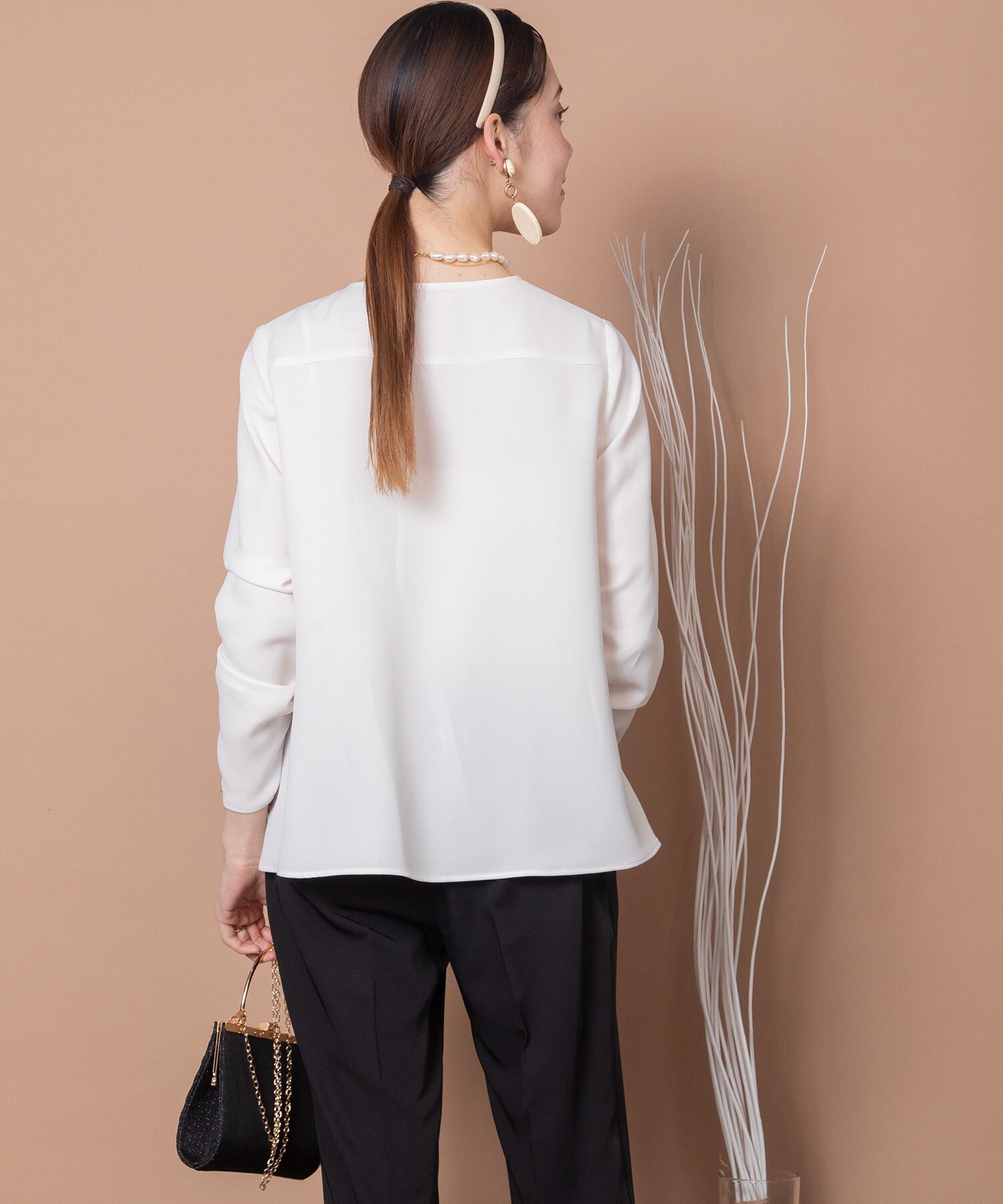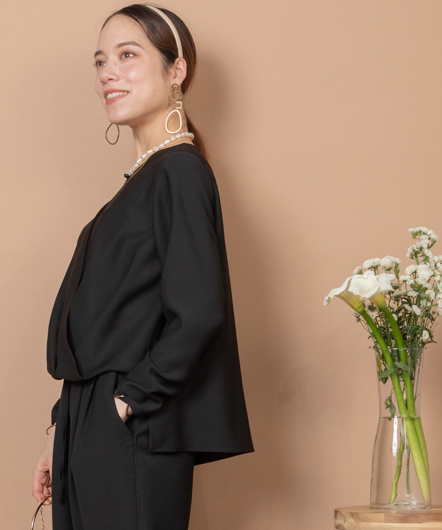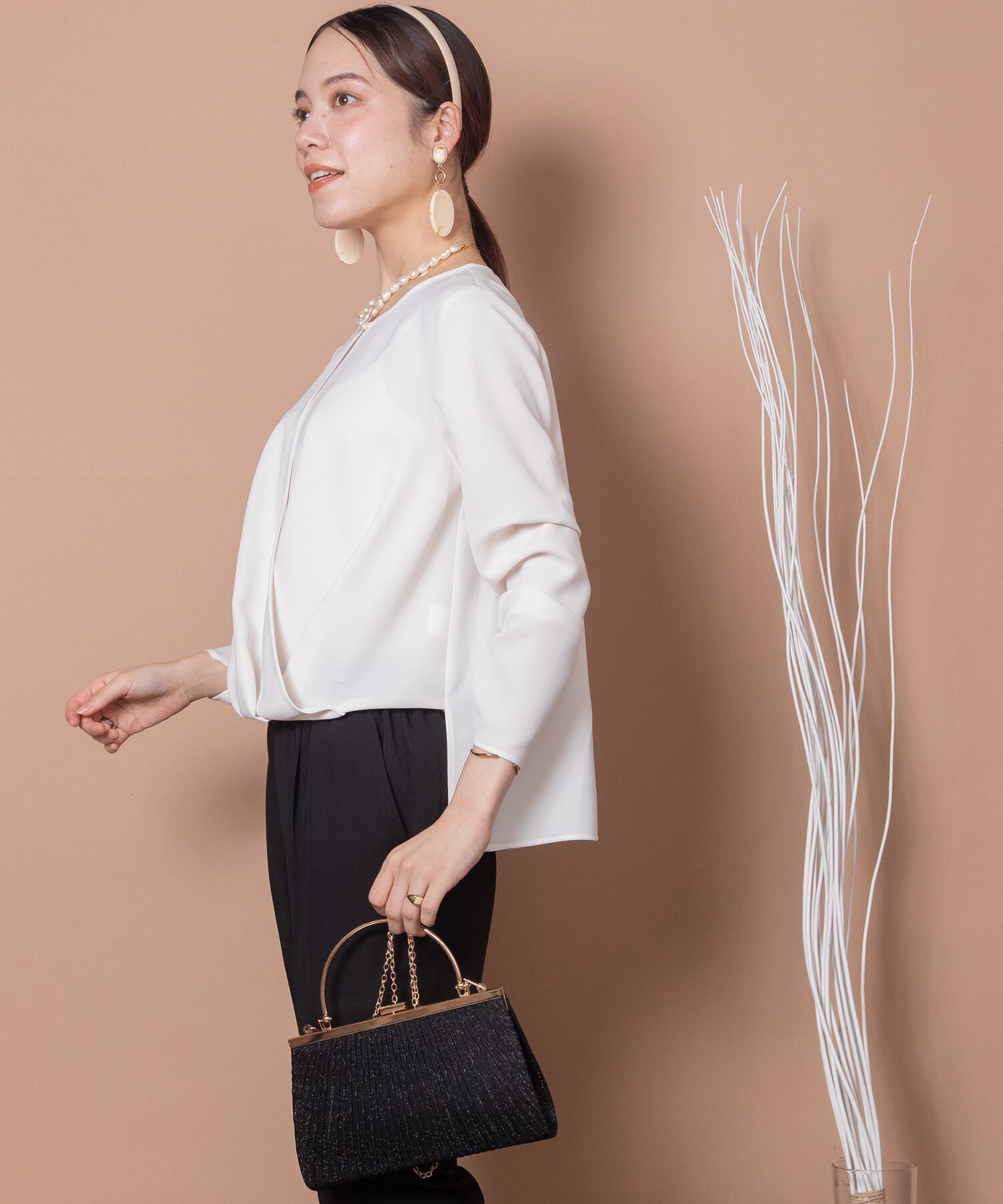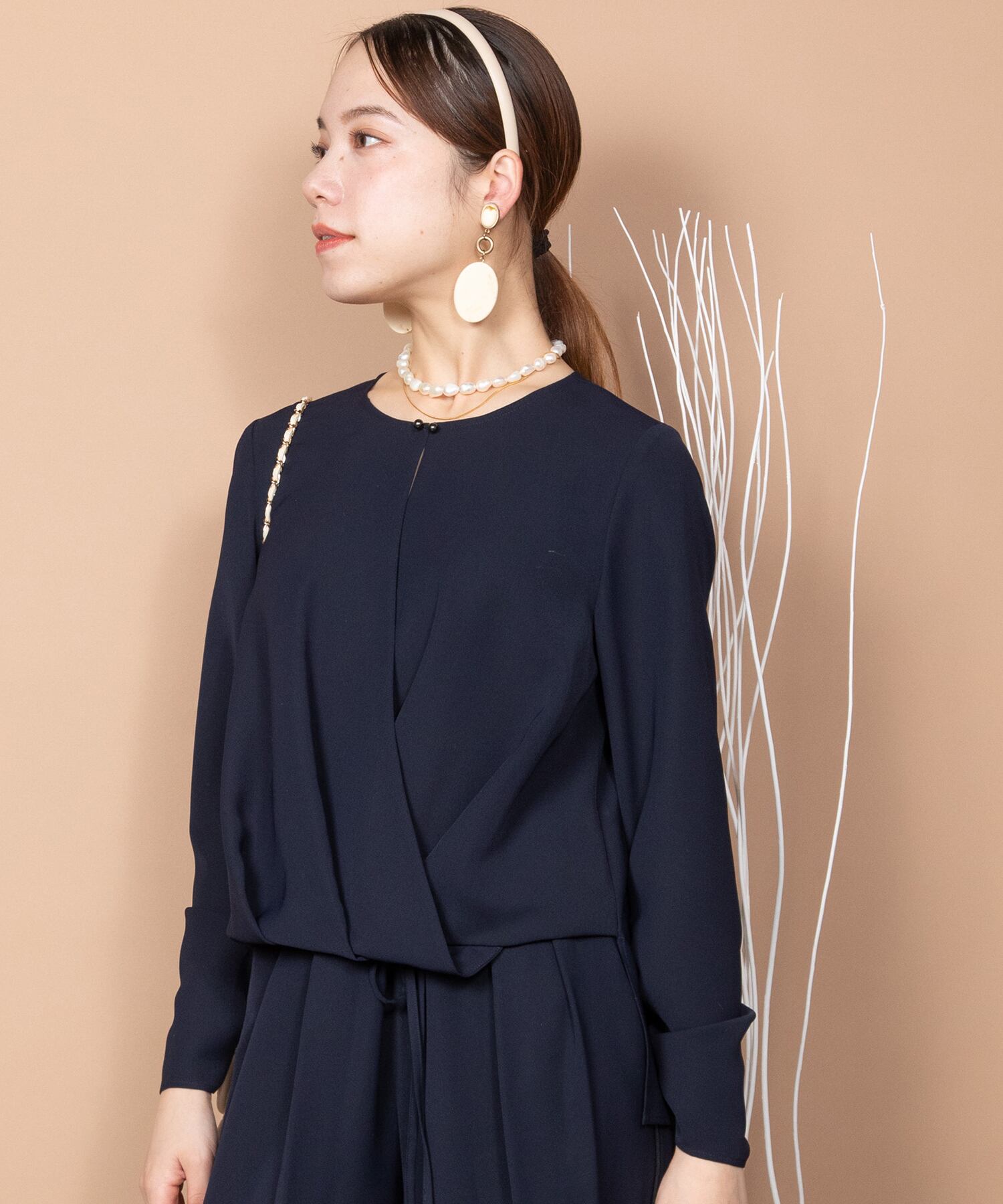 カシュクールのシルエットが美しく縫製映えするエレガントなブラウス。フロントを裾でクロスさせブラウジング風のこだわりデザイン。