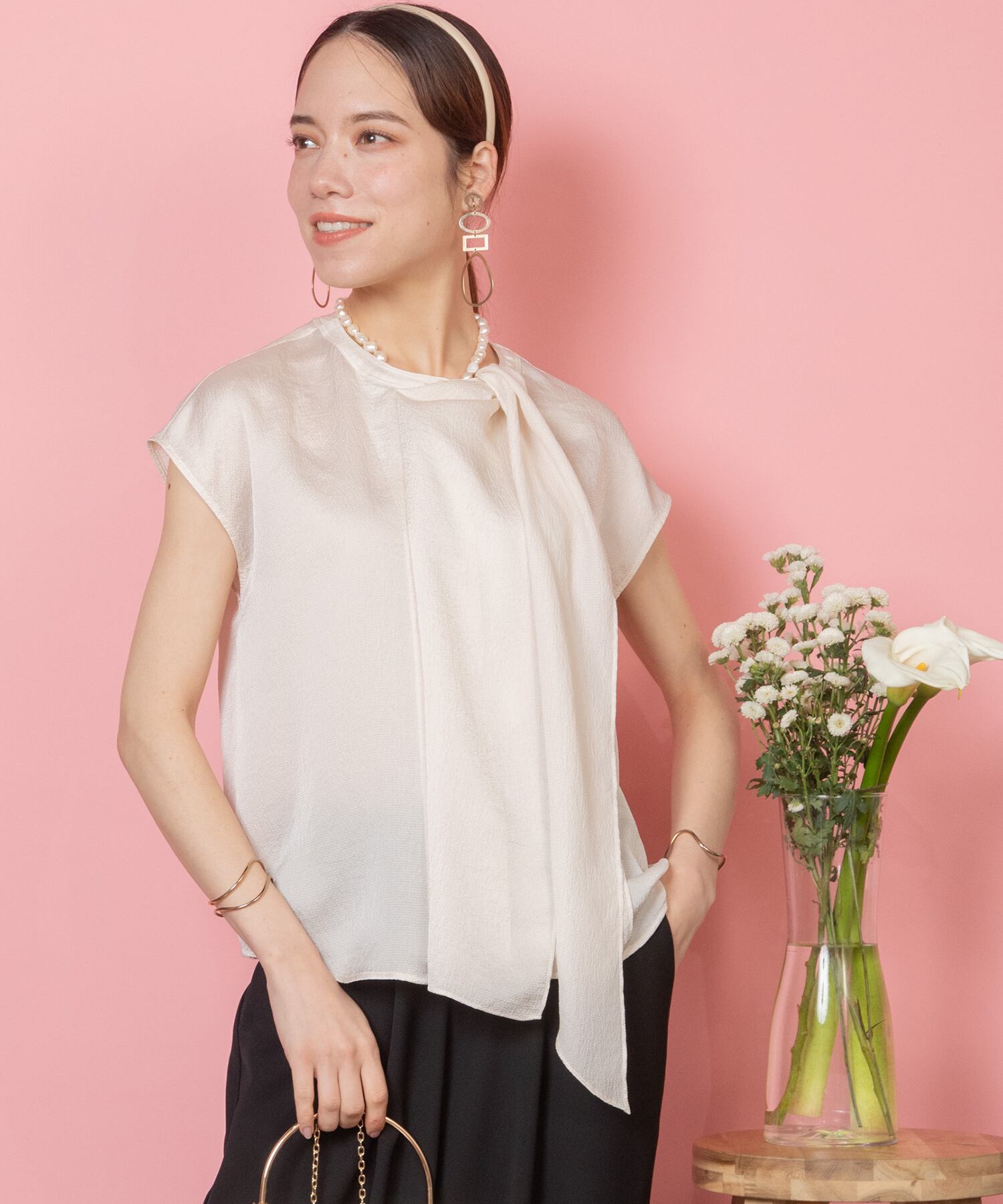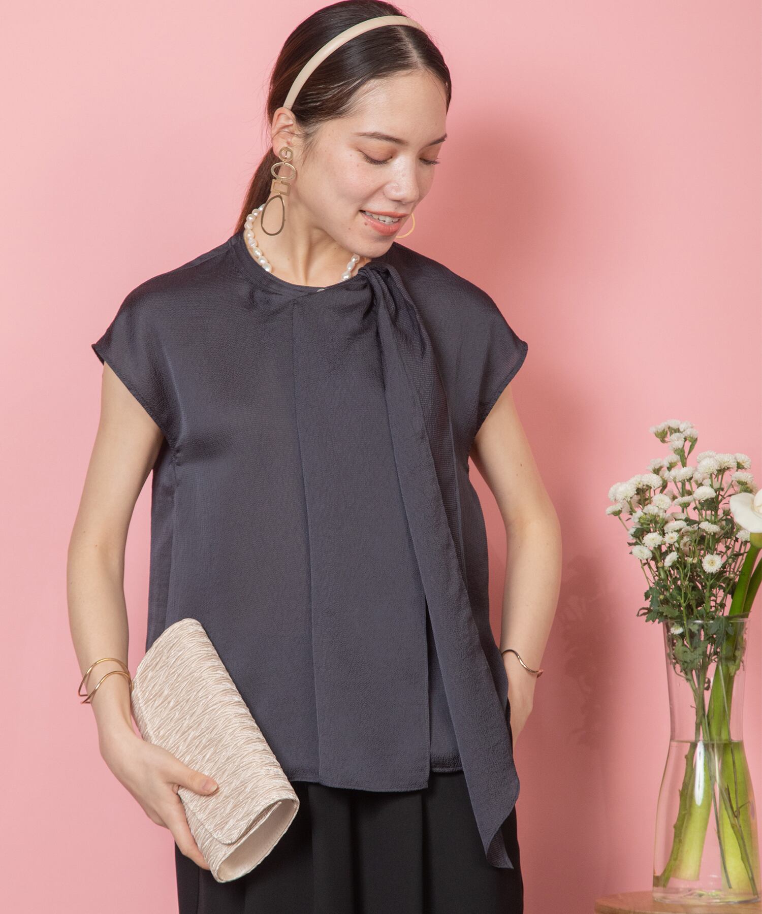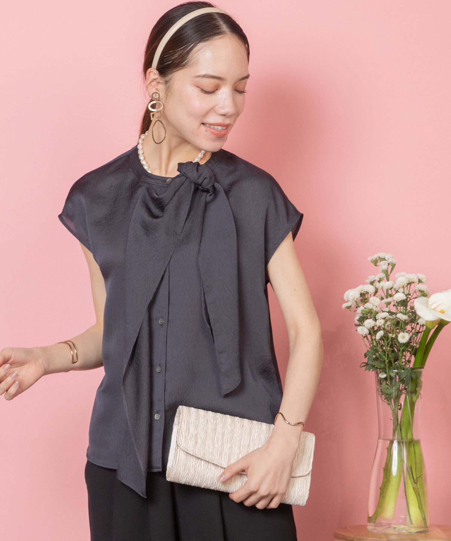 襟元美人な艶感あるボウタイドレープブラウス