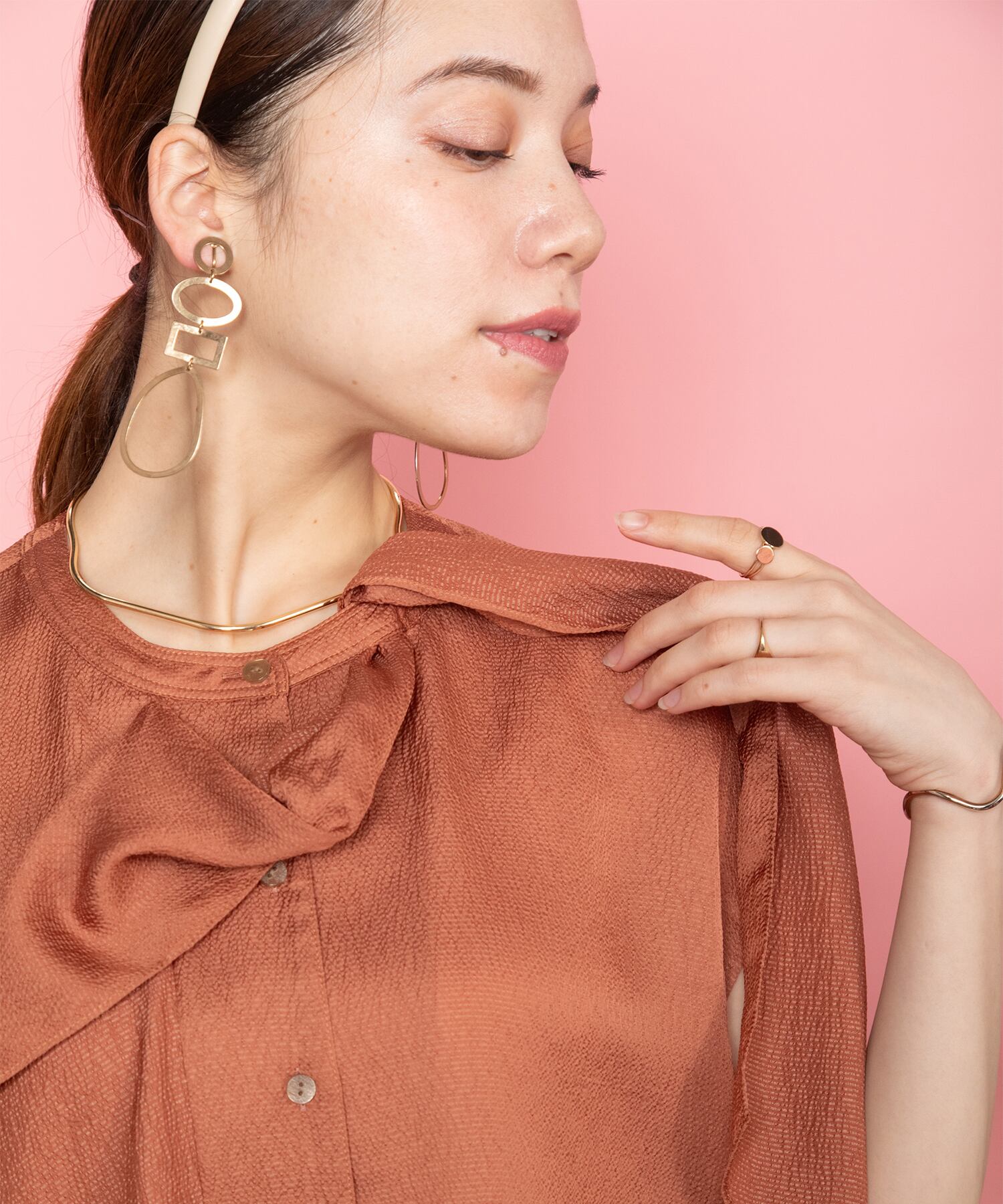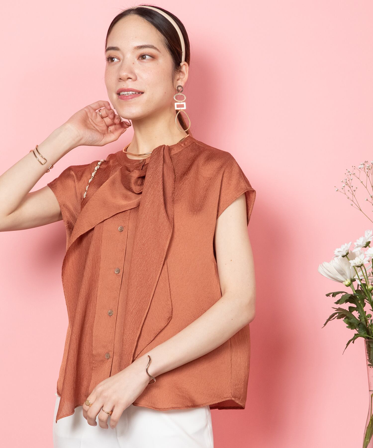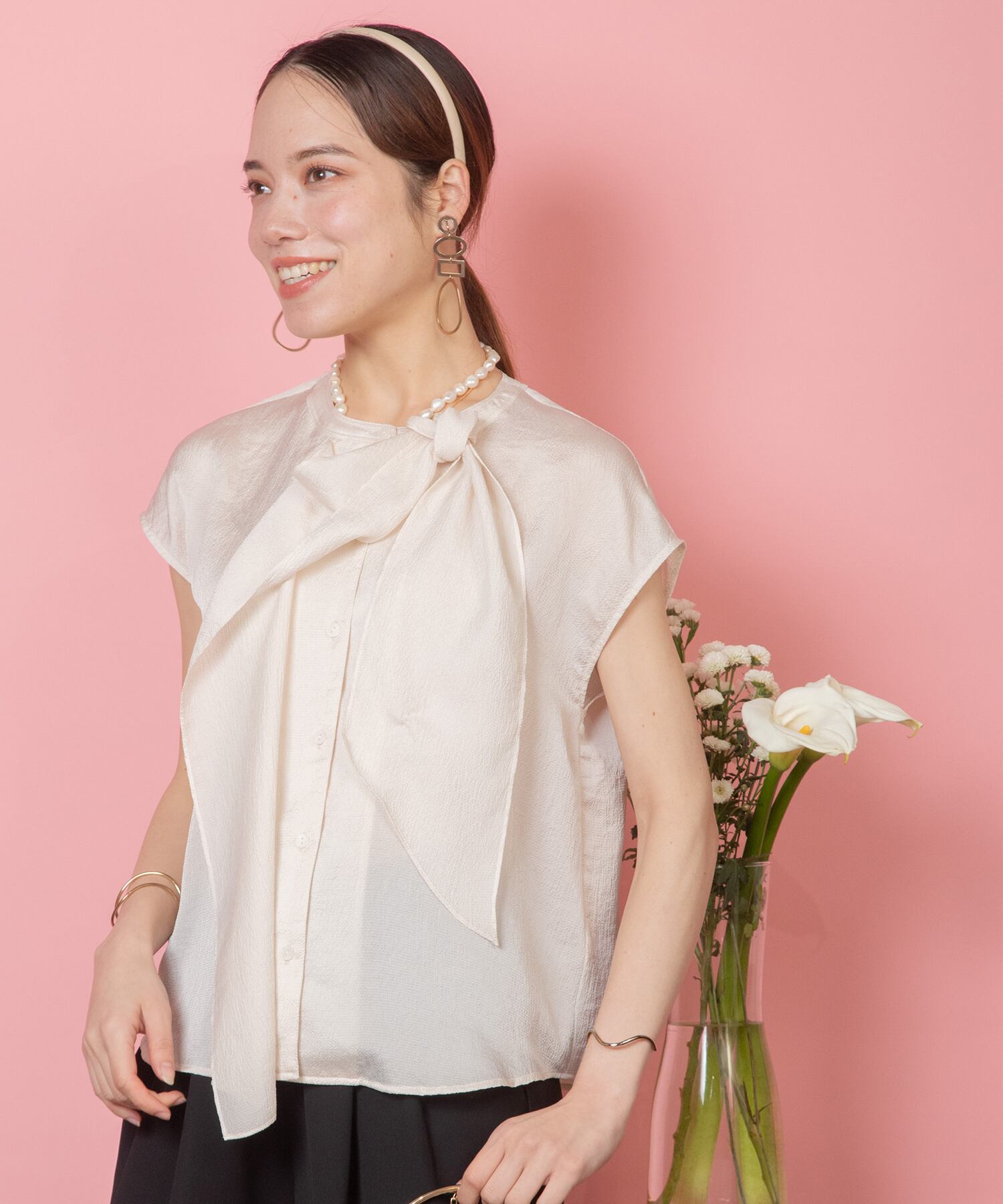 襟元美人な艶感あるボウタイドレープブラウス