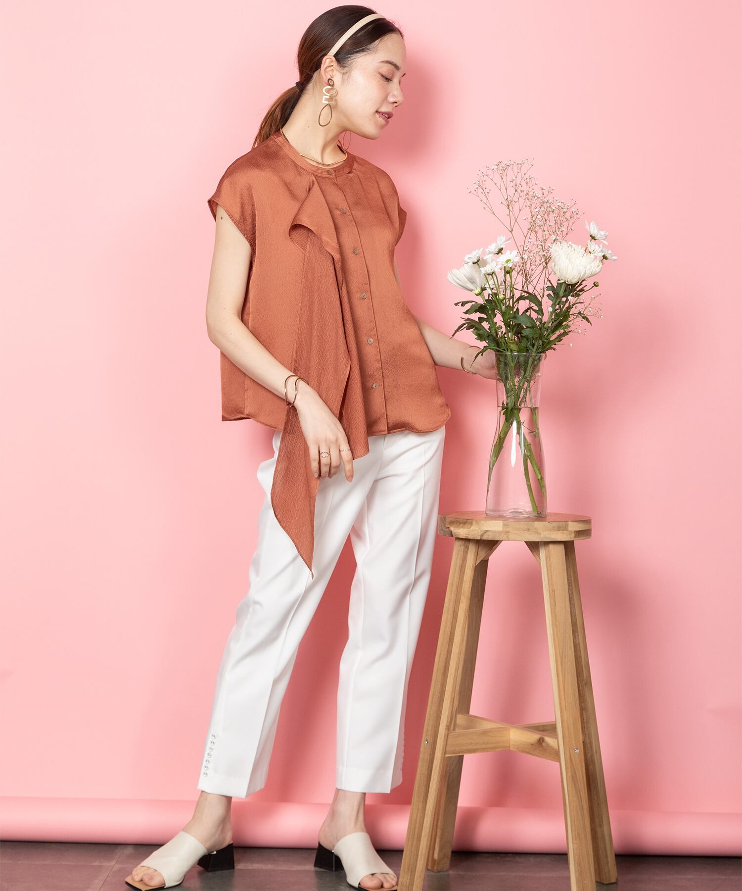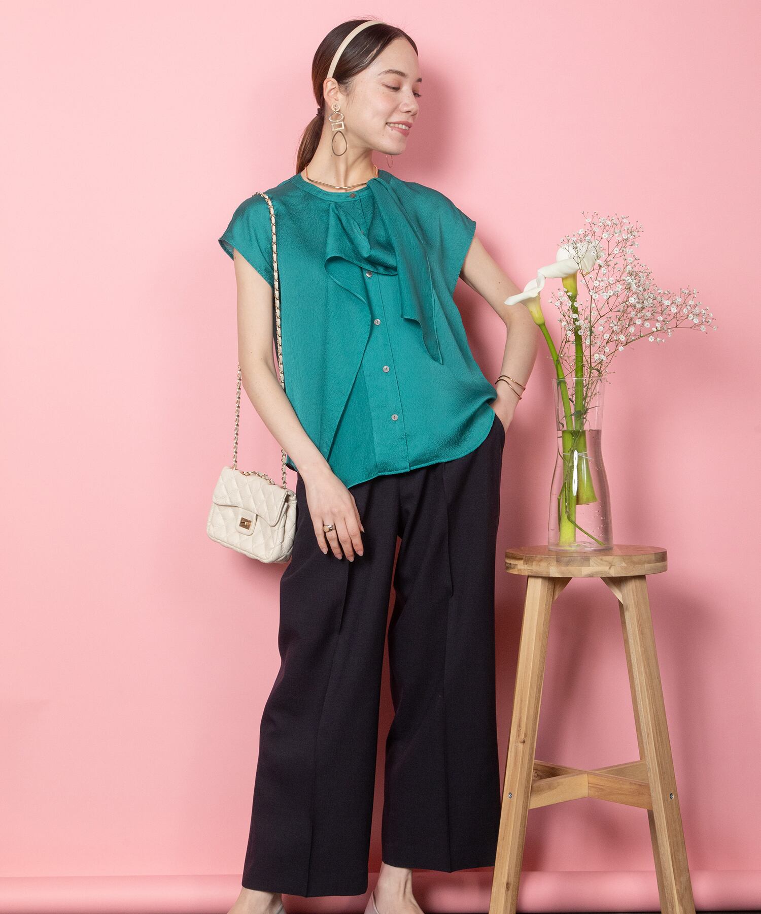 艶のある上品さ。軽くて美しいドレープが出るサテン素材を使用。メロウ処理されたラッフルフリルが優雅に揺れるエレガントさ。