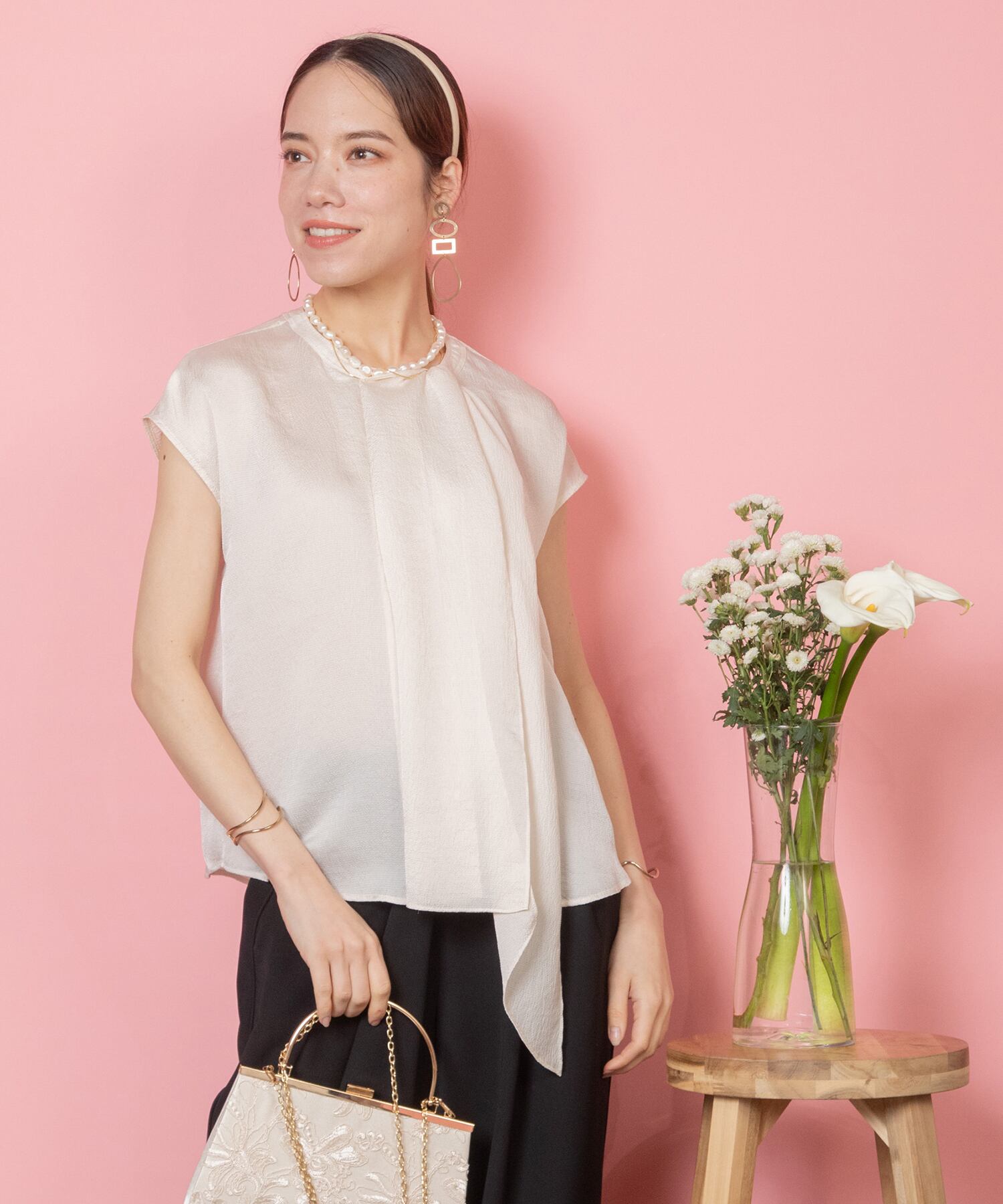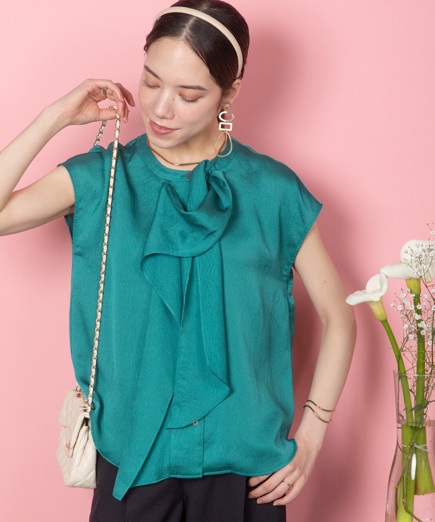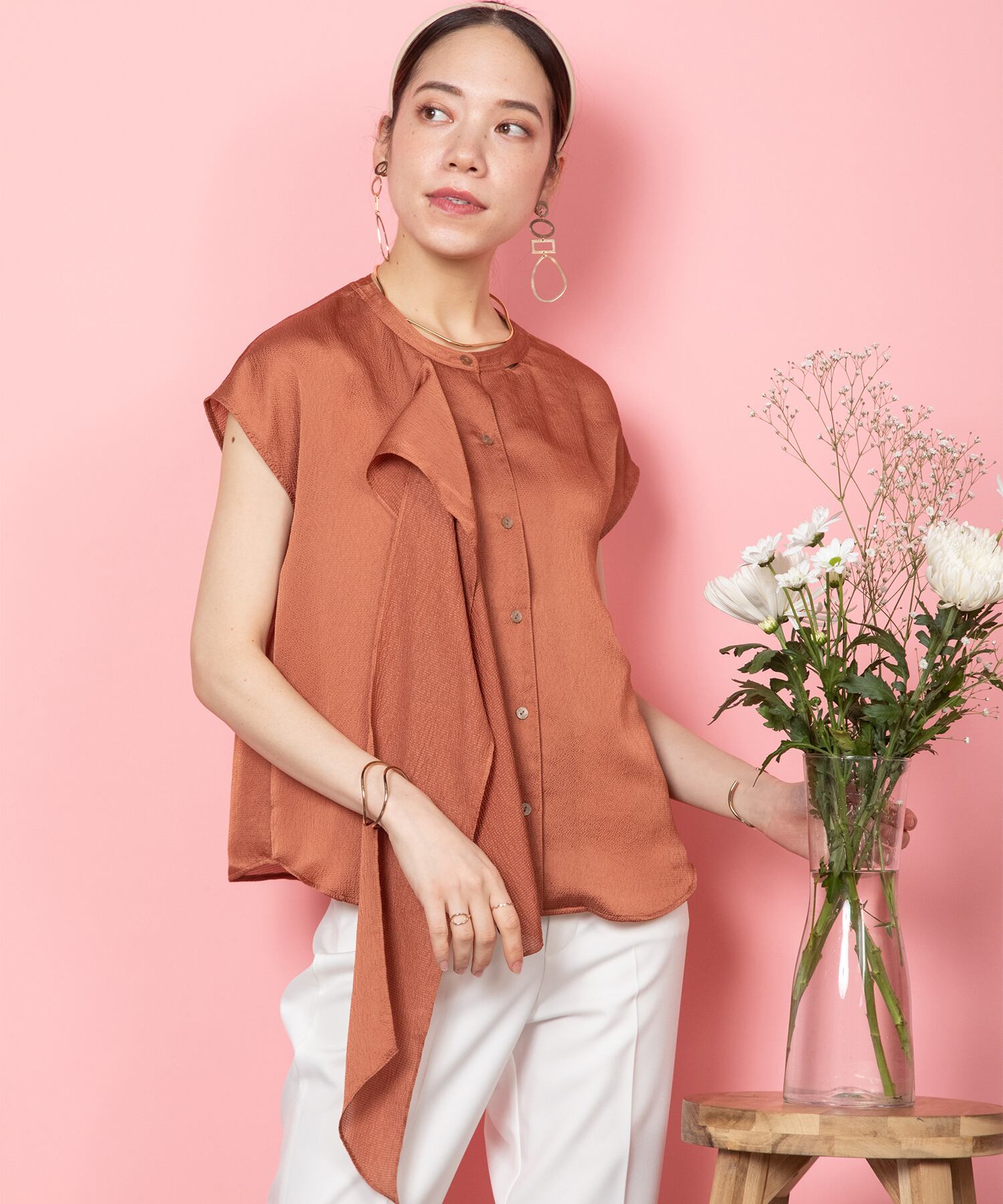 エレガントでフェミニンなフォルムが美しい揺れ感がきれいなラッフルフリルのブラウス。左前襟ぐりの穴に通してボウタイにするこだわりデザイン。ジャケットのインにもバランスがよい首元にフリルがくるデザイン。
