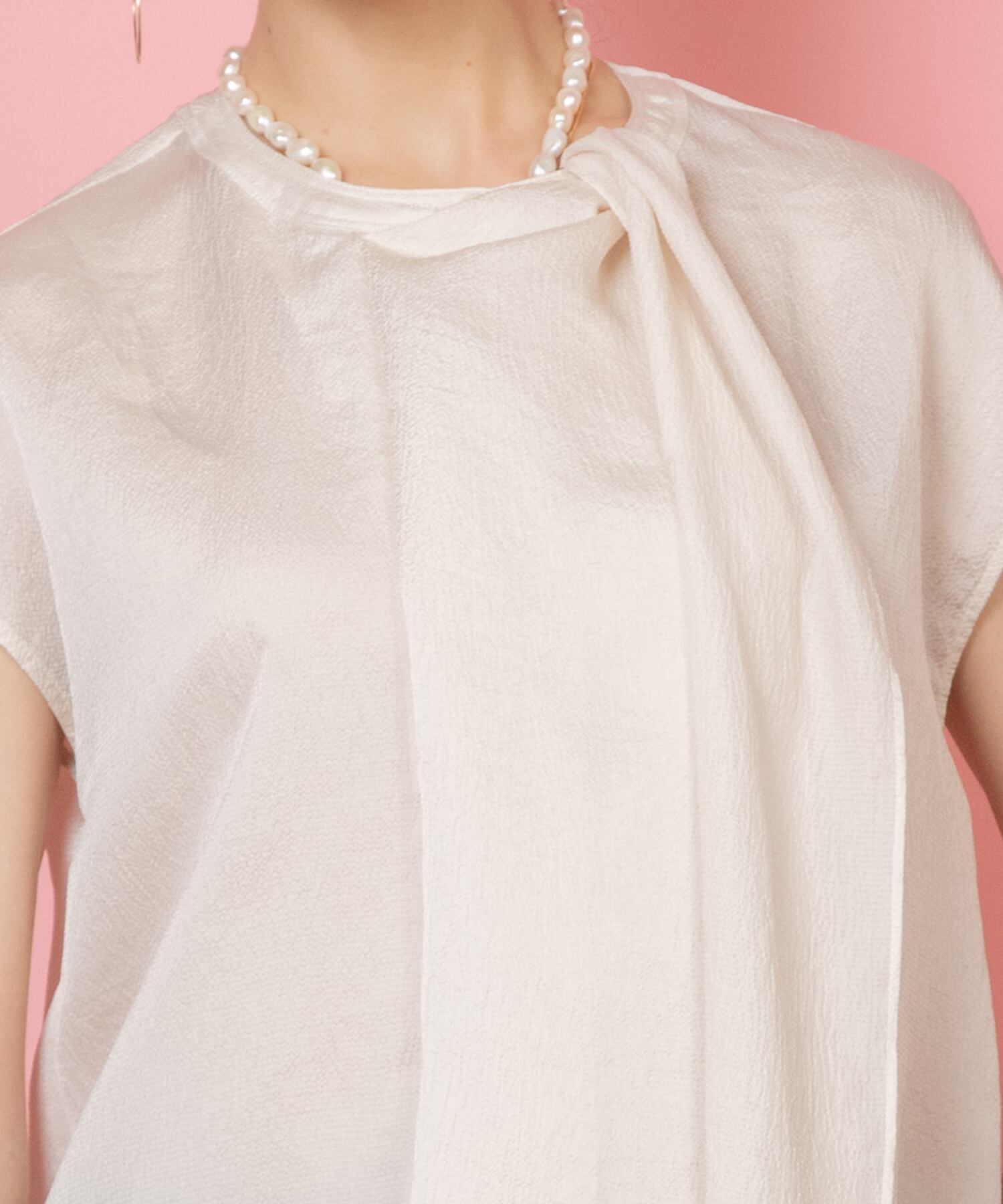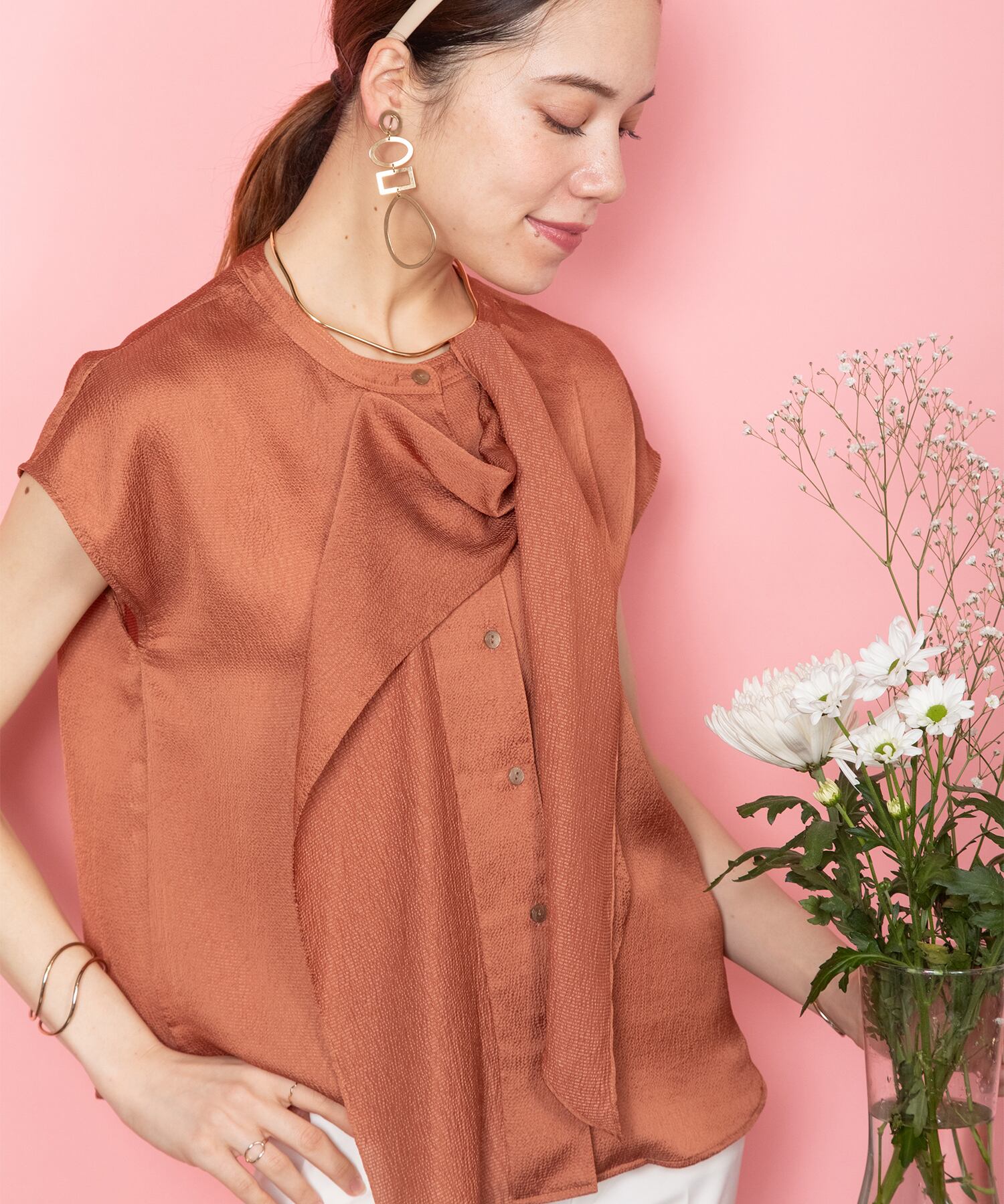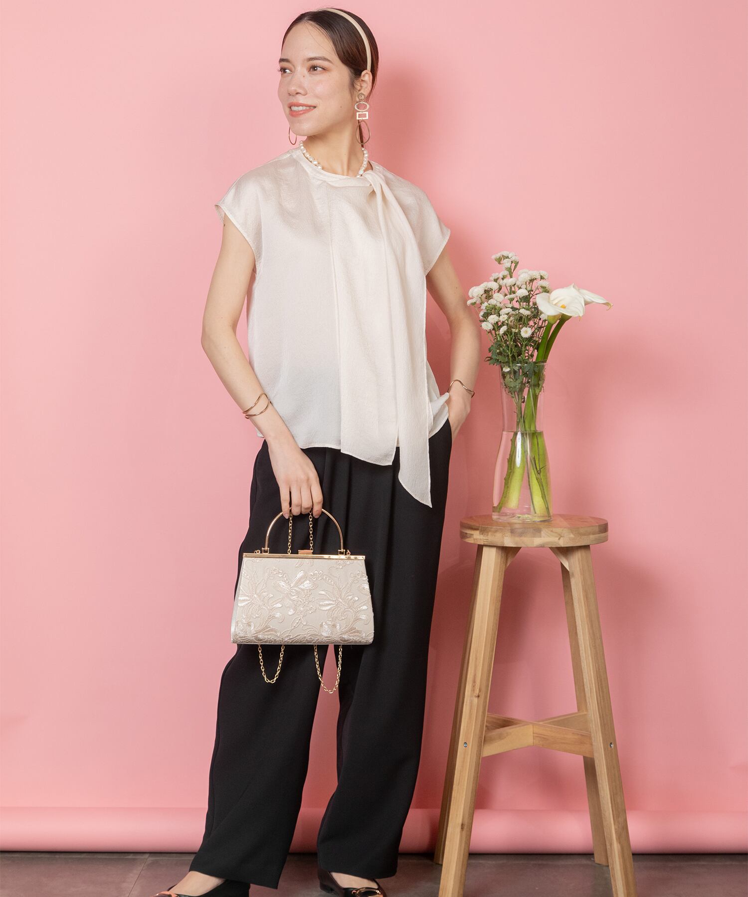 エレガントでフェミニンなフォルムが美しい揺れ感がきれいなラッフルフリルのブラウス。左前襟ぐりの穴に通してボウタイにするこだわりデザイン。ジャケットのインにもバランスがよい首元にフリルがくるデザイン。
