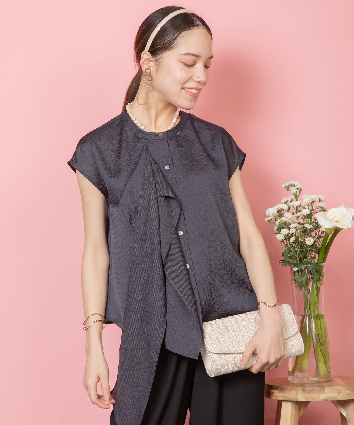 艶のある上品さ。軽くて美しいドレープが出るサテン素材を使用。メロウ処理されたラッフルフリルが優雅に揺れるエレガントさ。