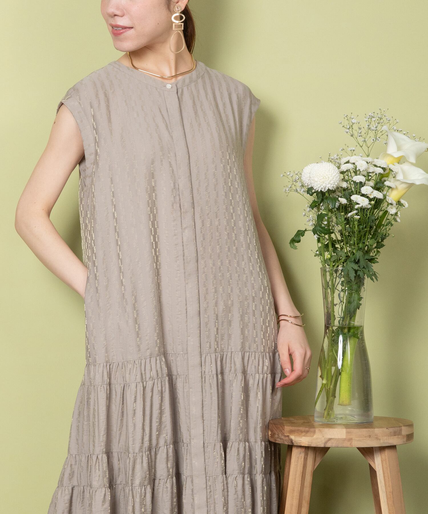 これからのシーズンにおすすめのキレイめリラックスワンピース。裾にかけて4段ティアードのギャザーフレアーが美しいキレイめワンピース。首元にワンボタン、ノースリーブのシャツを伸ばしたようなシャツ型ティアードワンピース。