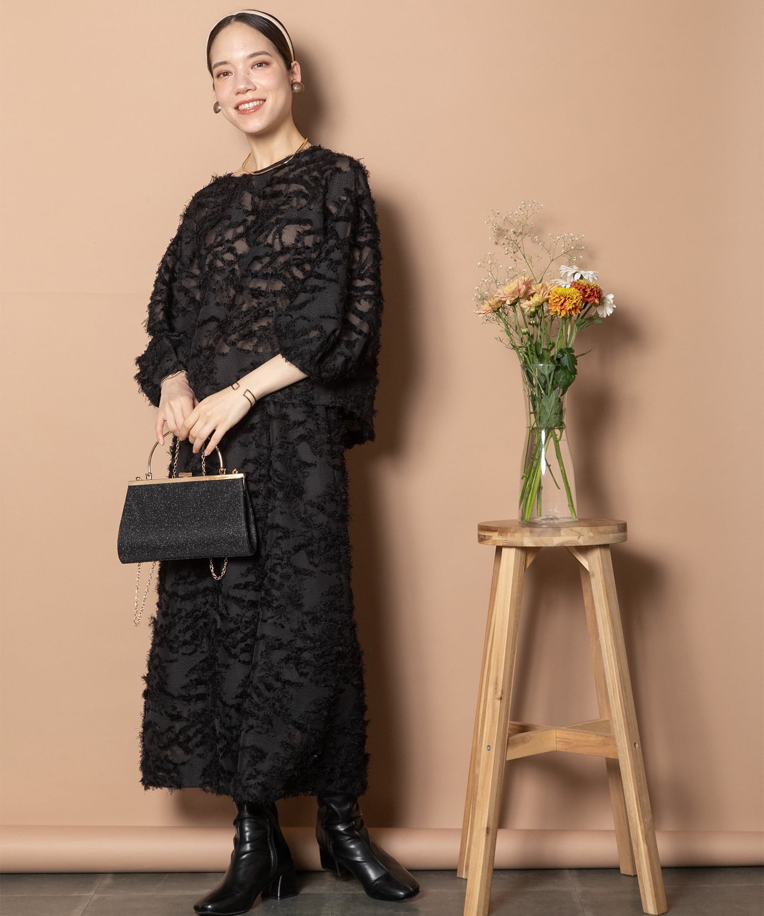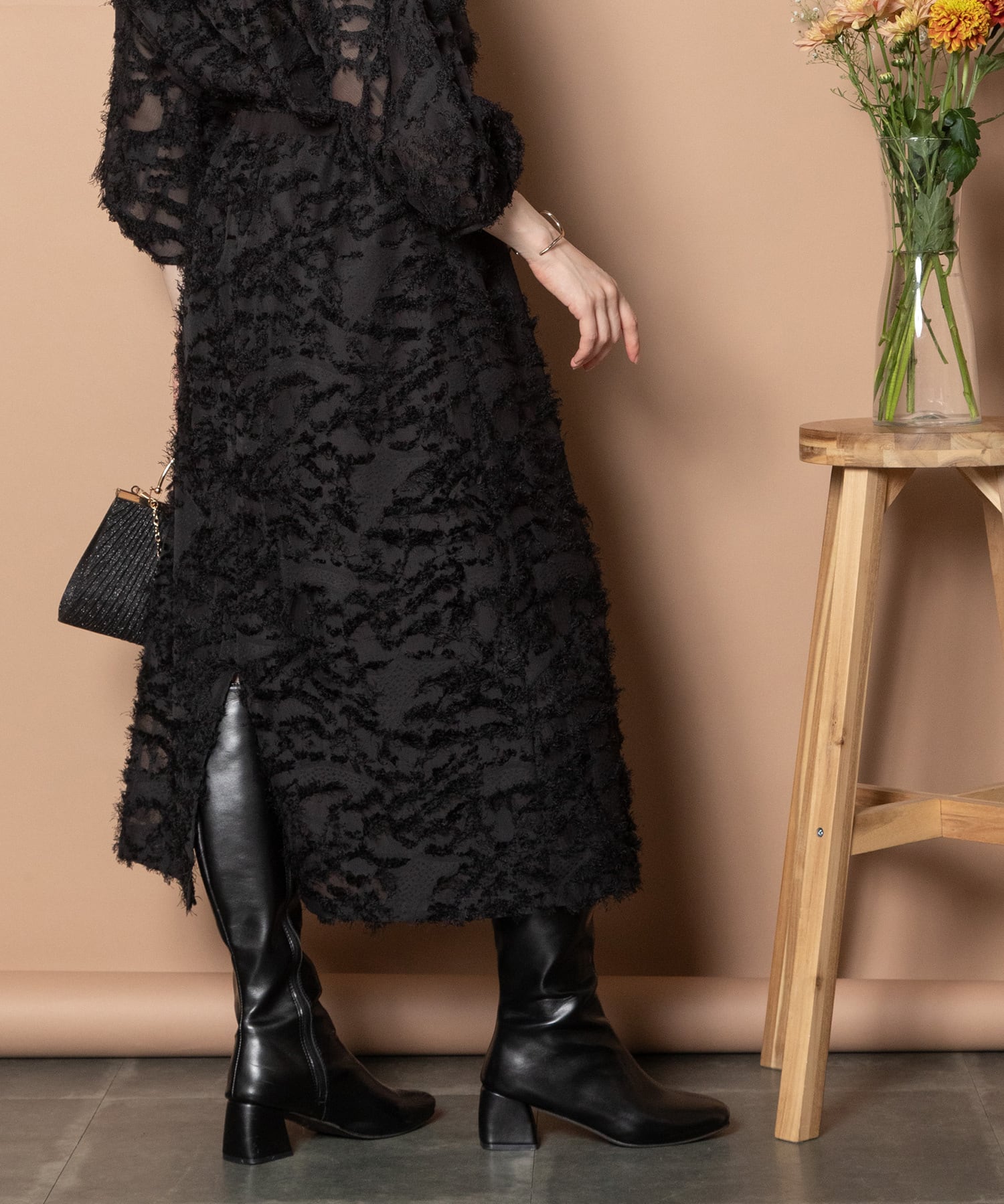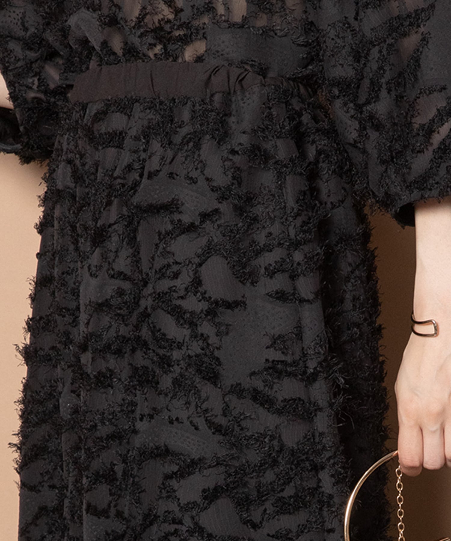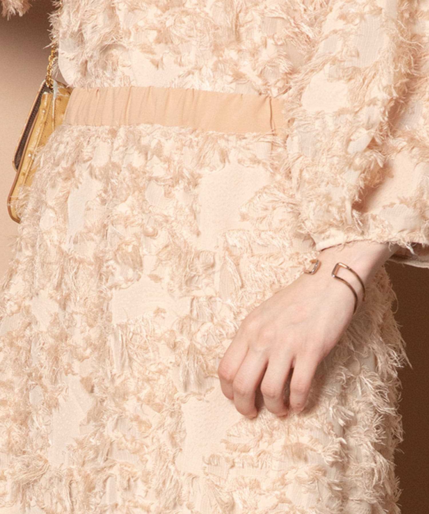 今シーズントレンドのヘアリーなふわふわしたジャガード。揺れ感と透け感を同時に楽しめる素材です。