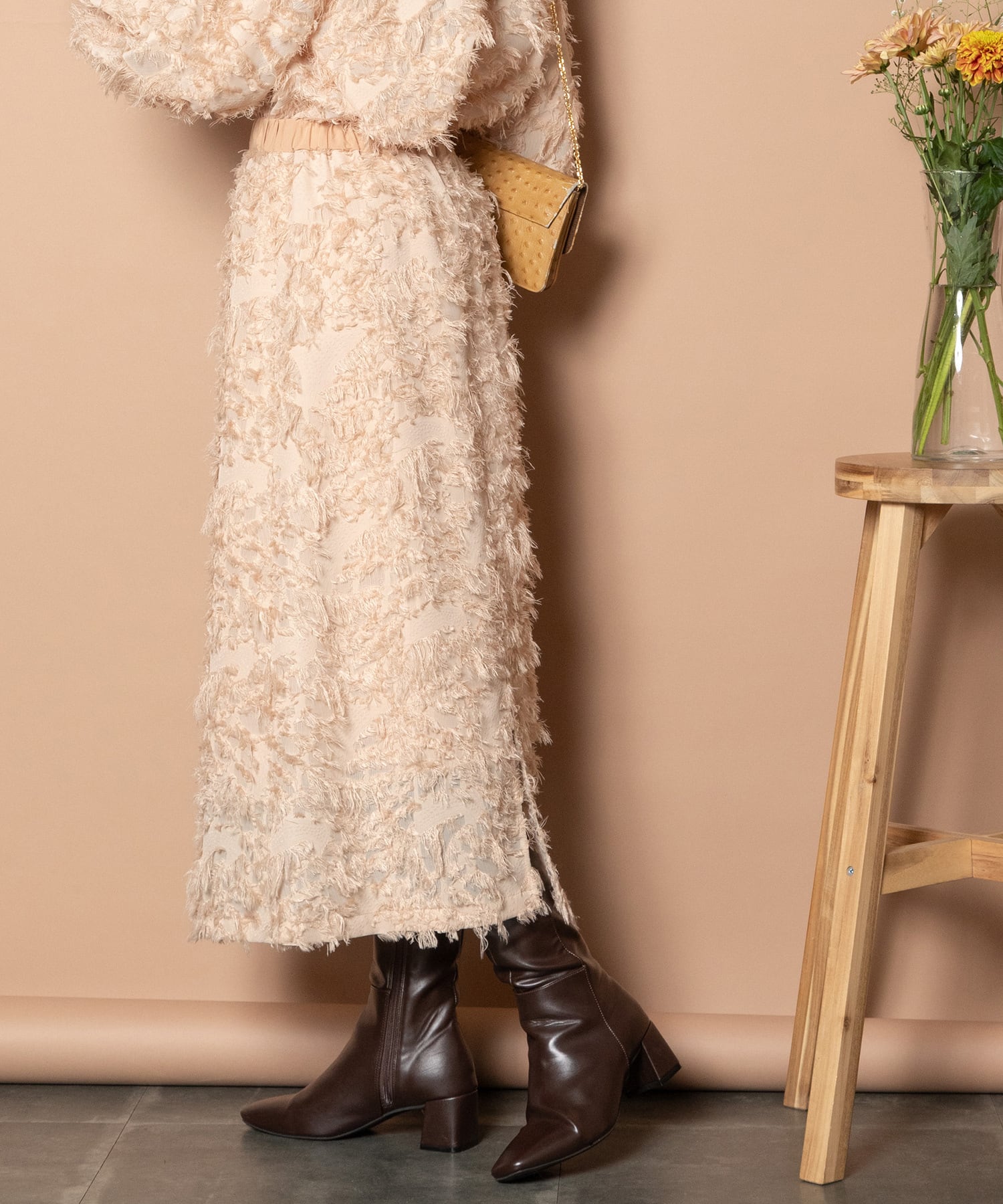 上品な可愛らしさのある揺れるヘアリージャガード。表面感が特徴的なジャガード素材を主役にシンプルなAラインのナロースカート。初秋にサラッと着用できる秋立ち上がりの主役アイテム。