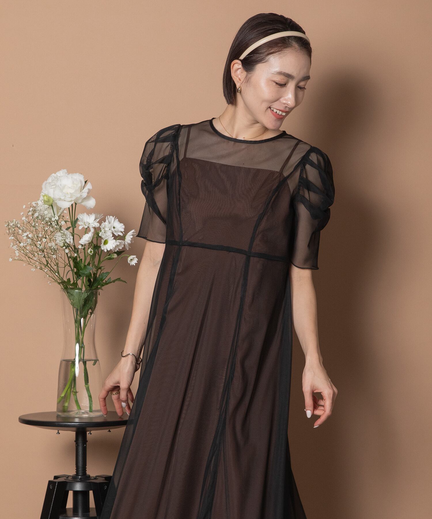 チュールワンピースはソフトタッチなチュール素材。ブラウン系キャミワンピースは光沢あるサテン素材。