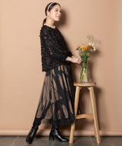 モノトーンの大きめのアート風プリントの上からソフトチュールが重ねられたノーブルな雰囲気のフレアースカート。共布ベルト付き。裾部分が透けてブーツ合わせがバランスよくおすすめ。ちょっとしたお出かけにおすすめのスカート。