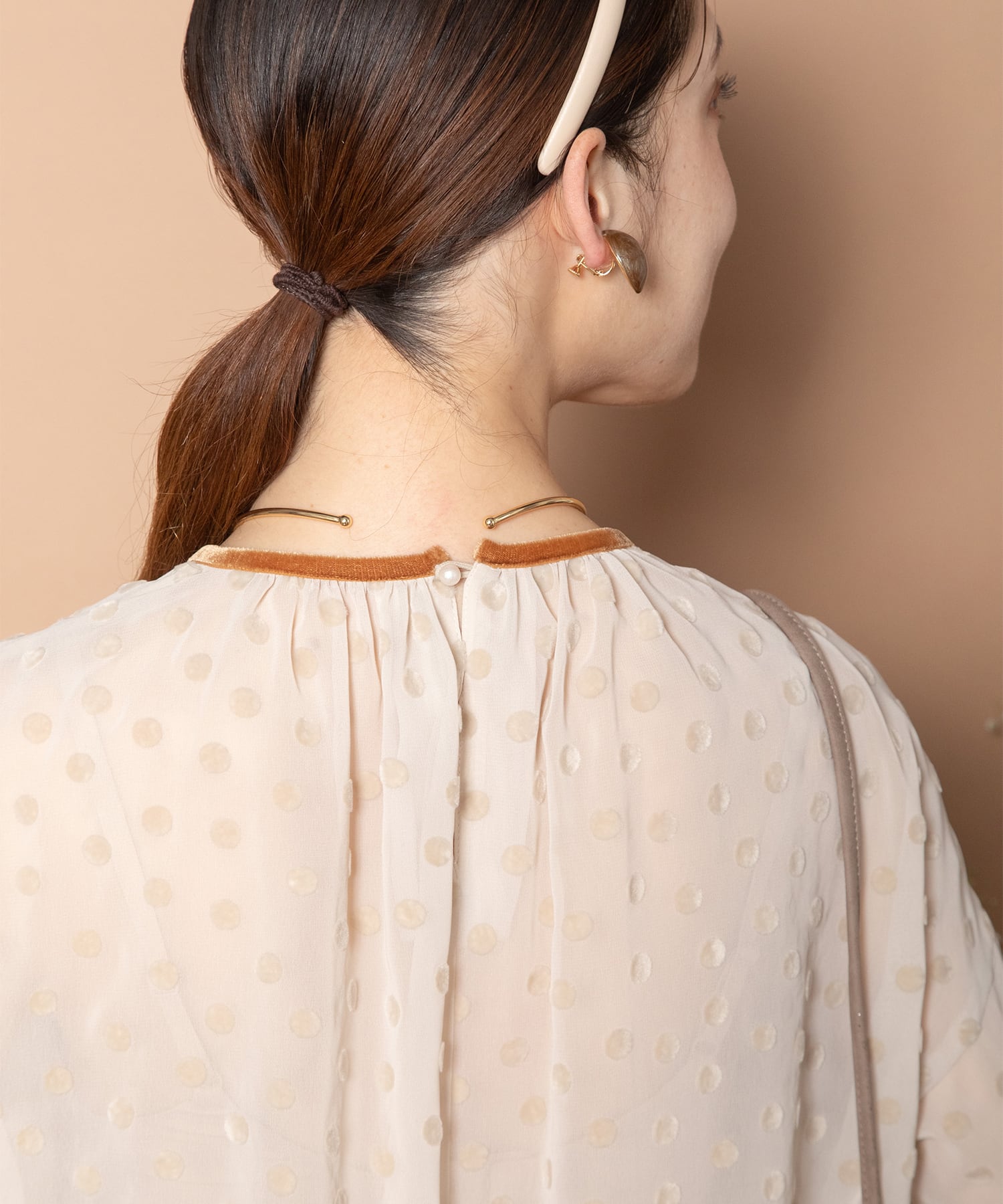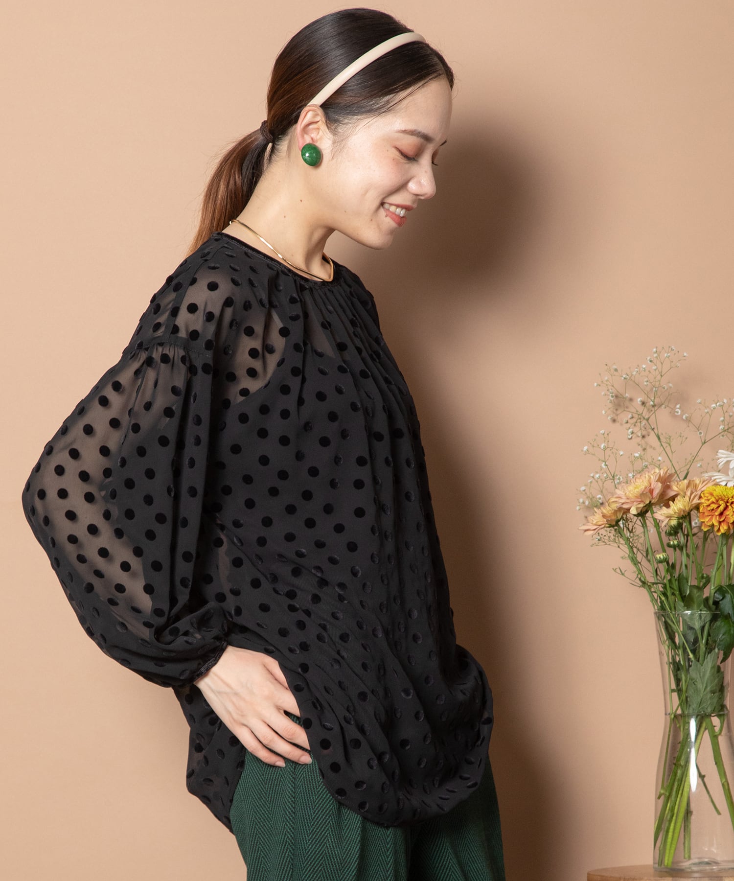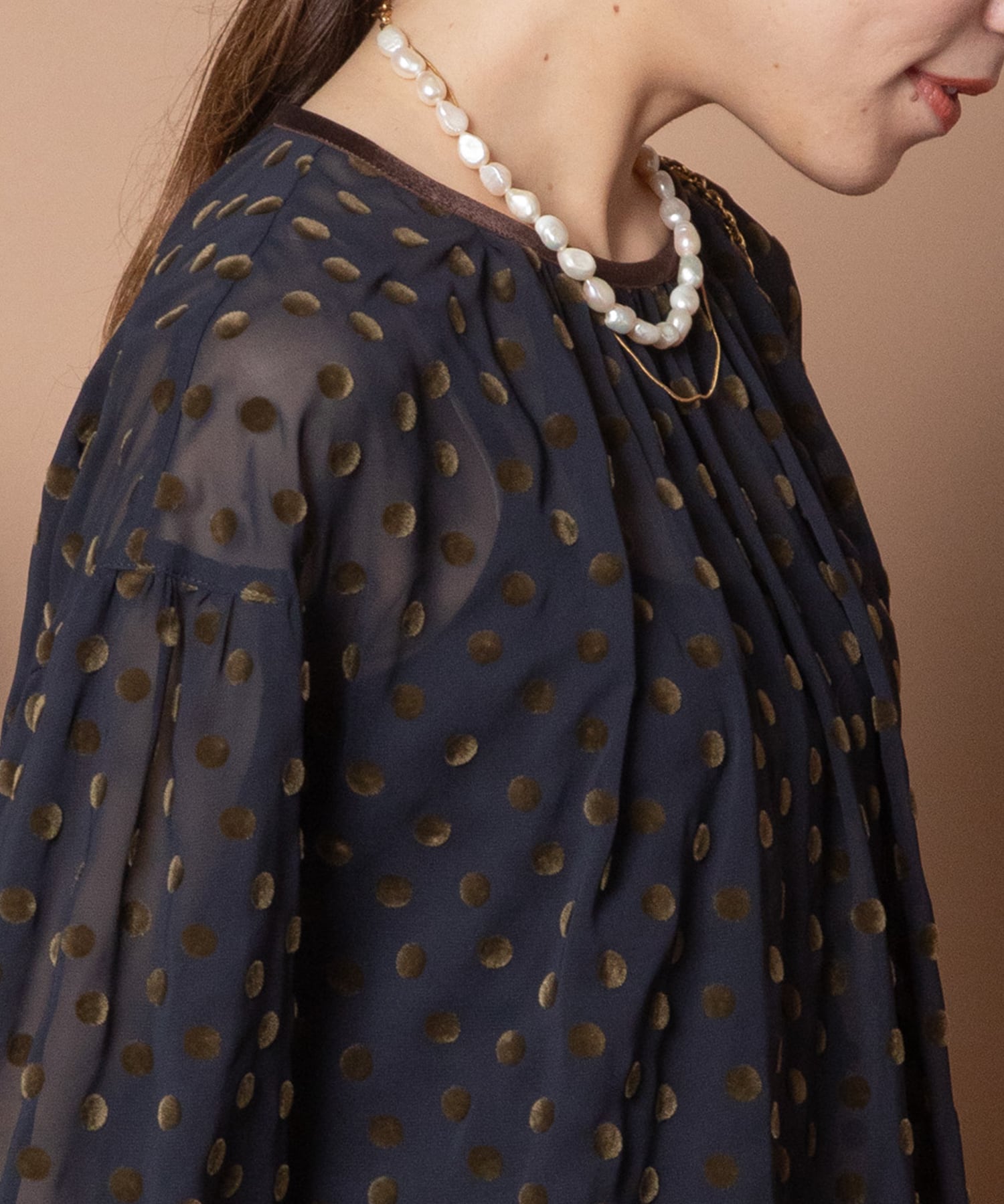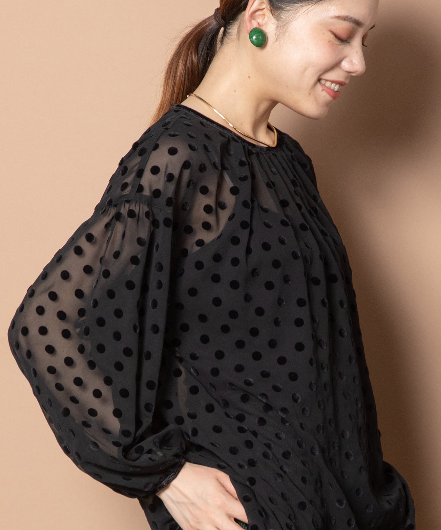 上品な可愛らしさのあるフロッキードット柄プルオーバーブラウス。表面感が特徴的なドットジャガード素材を主役に首元と袖口はベロアトリミングで上品な仕上げ。初秋にサラッと着れる一枚で決まるアイテム。