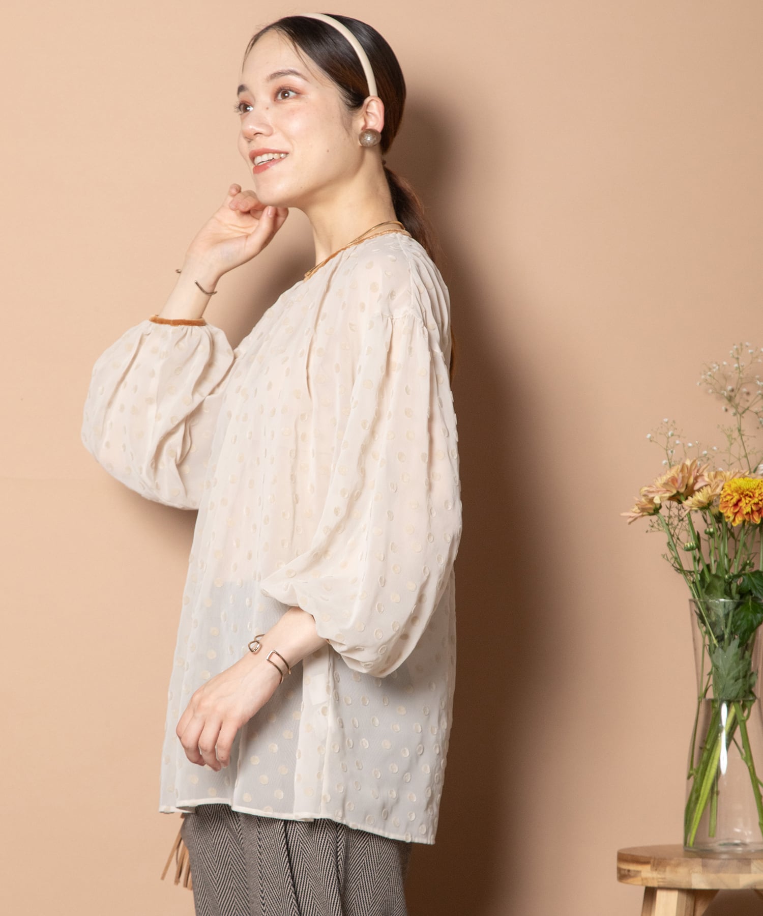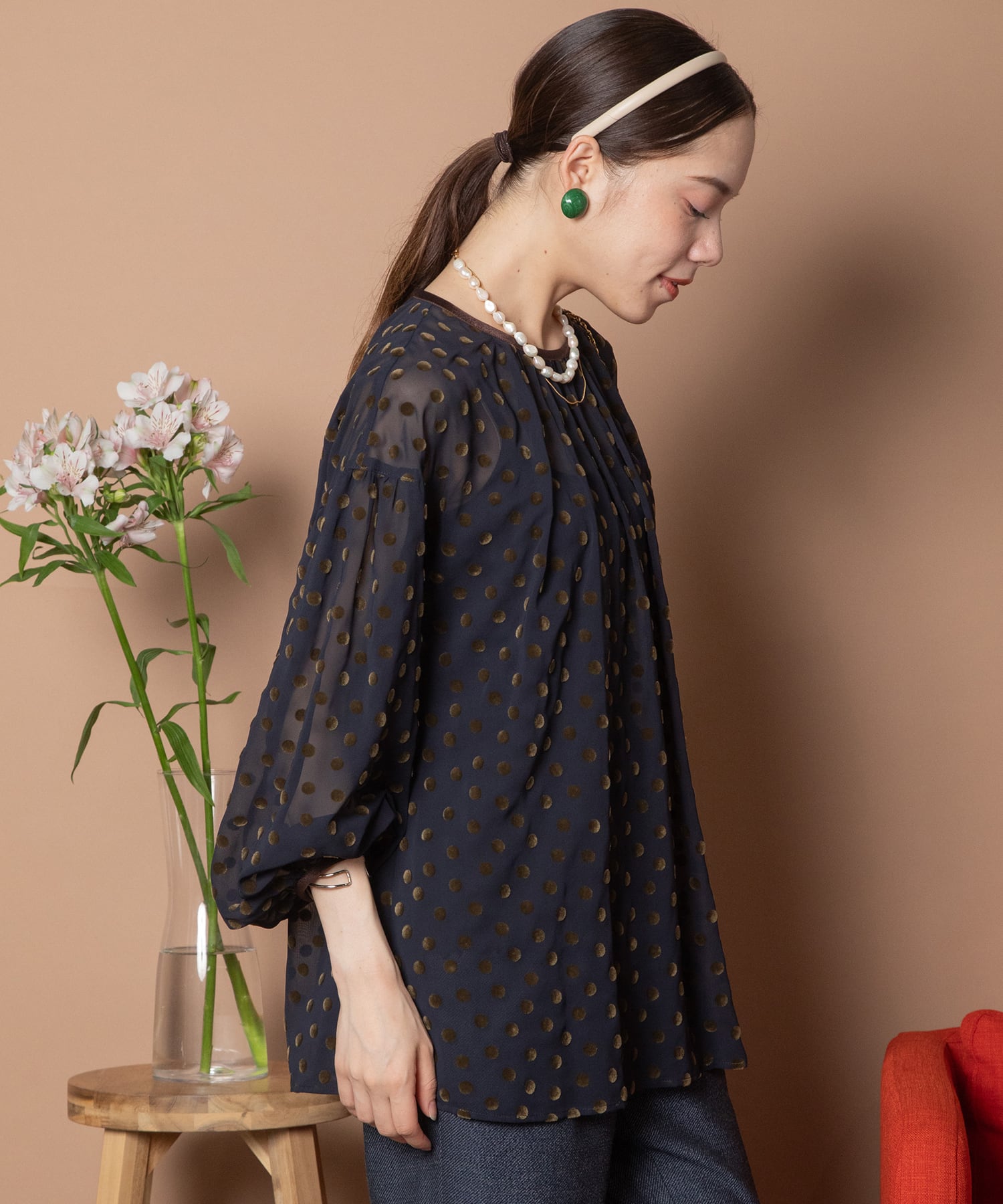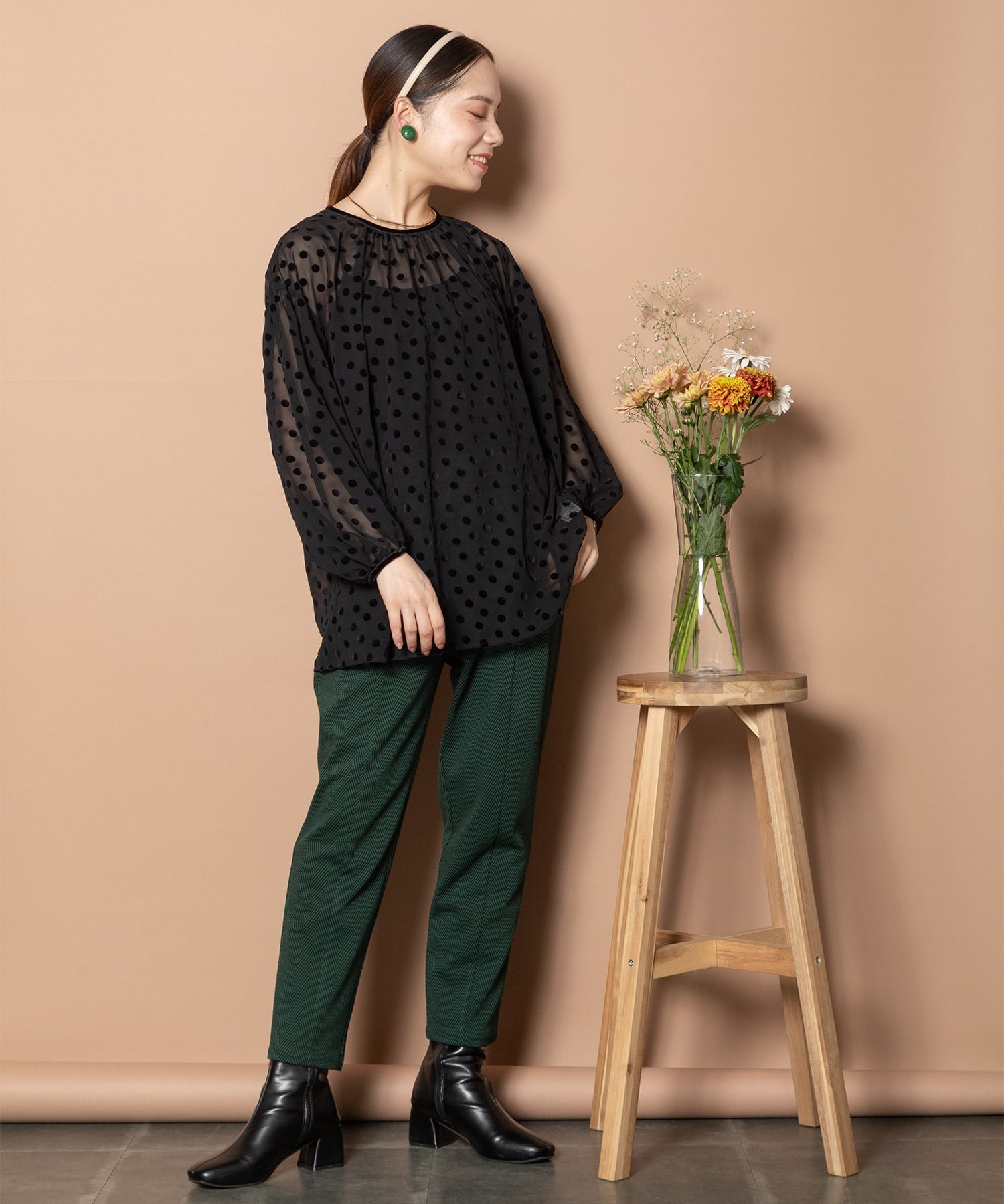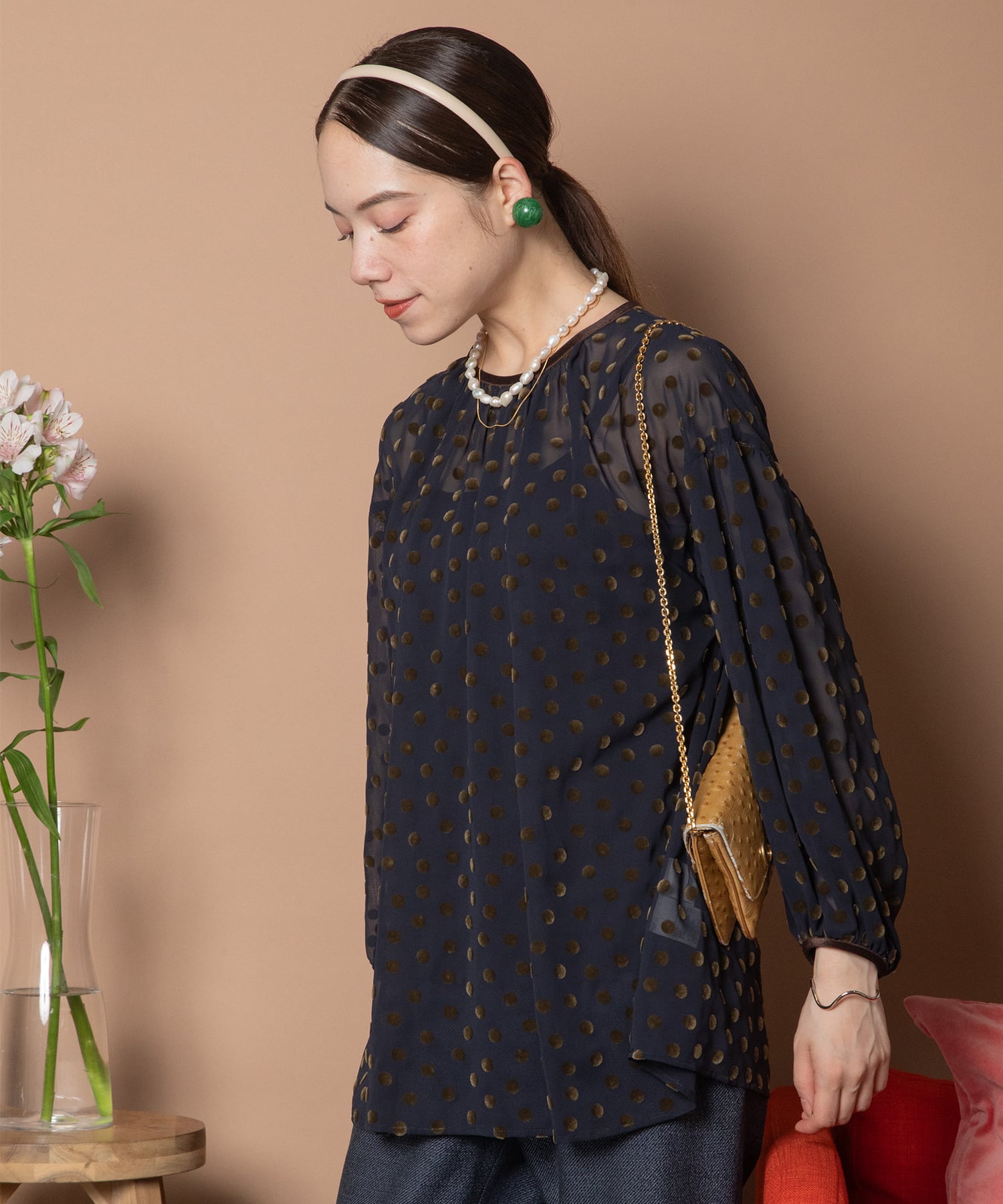 上品な可愛らしさのあるフロッキードット柄プルオーバーブラウス。表面感が特徴的なドットジャガード素材を主役に首元と袖口はベロアトリミングで上品な仕上げ。初秋にサラッと着れる一枚で決まるアイテム。