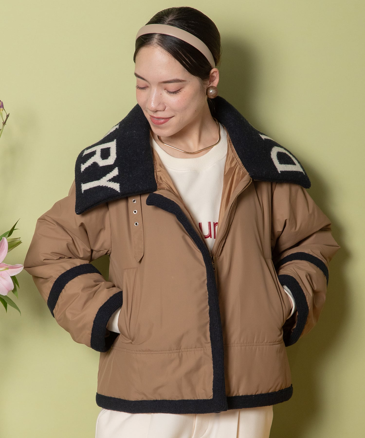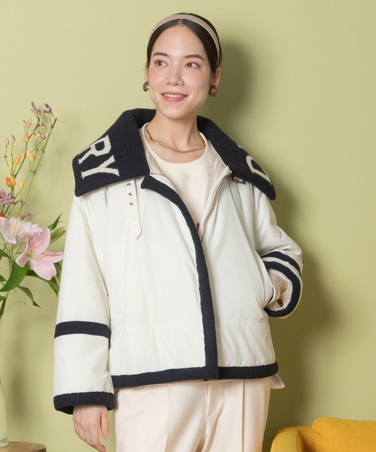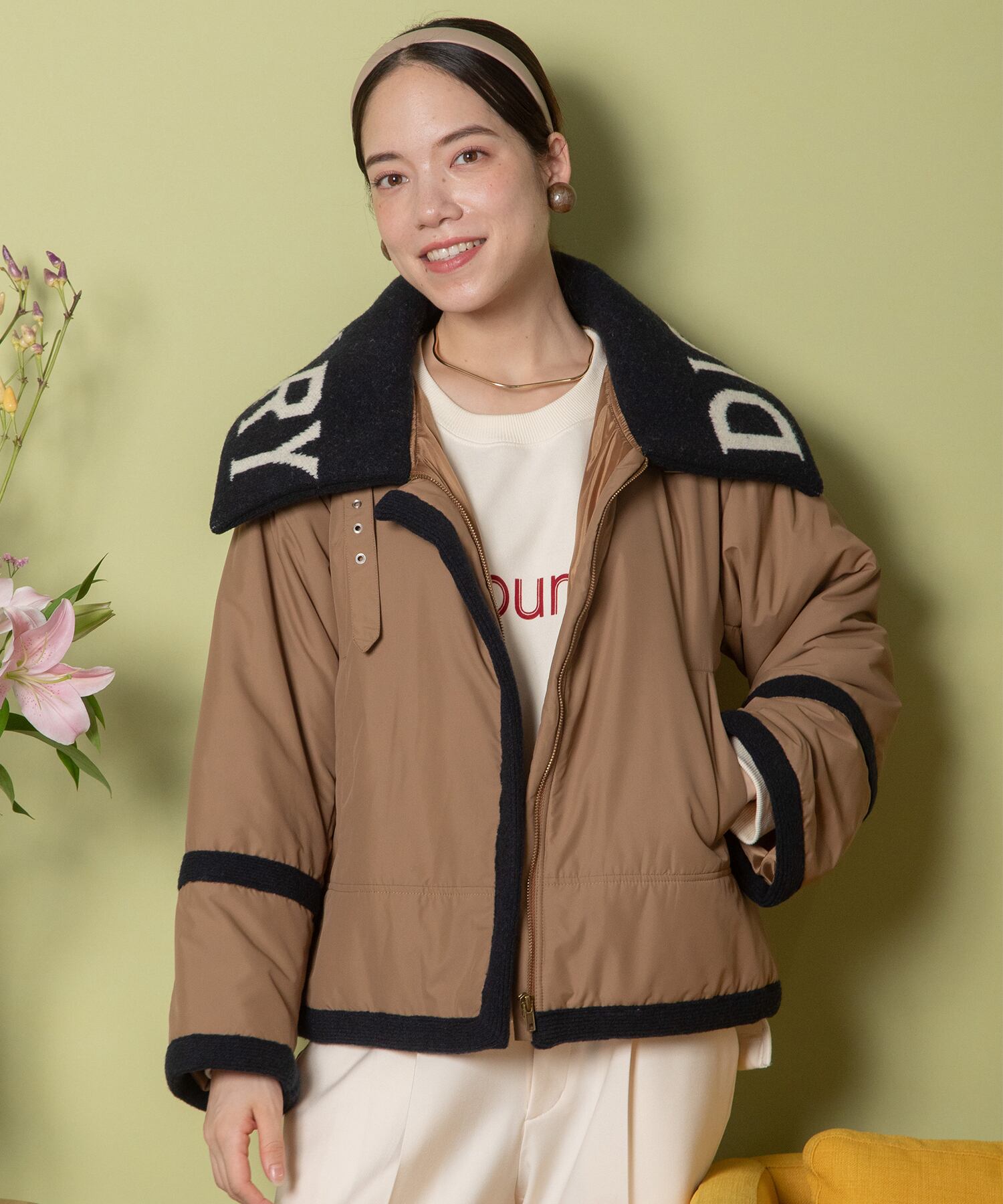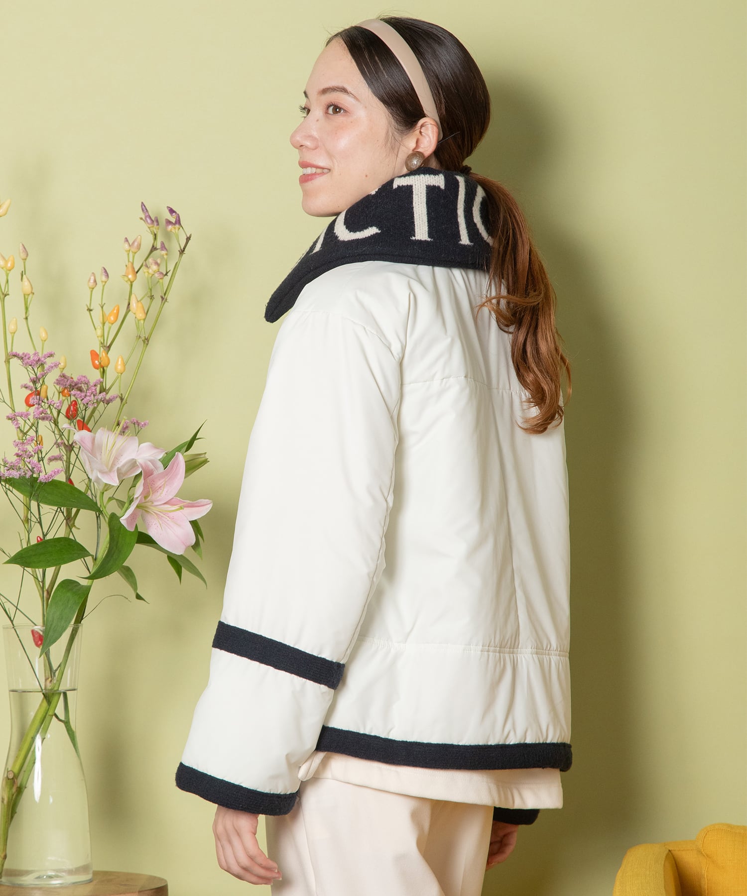 ロゴニットジャガード襟とニットトリミング使いの中綿ジップブルソン。メンズのフライトジャケットから着想を得たデザイン。襟元はスタンド襟、開襟襟と2WAYでご着用頂けます。