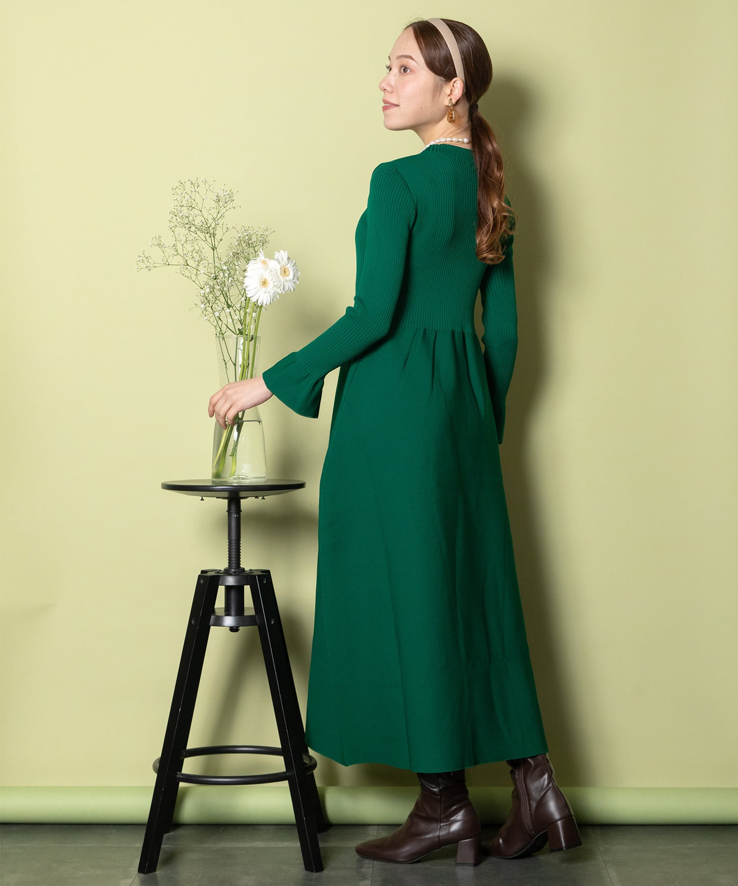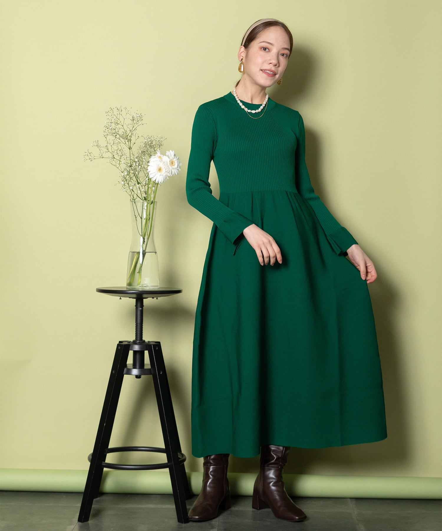 スボンディングニットのキレイめフレアーニットワンピース