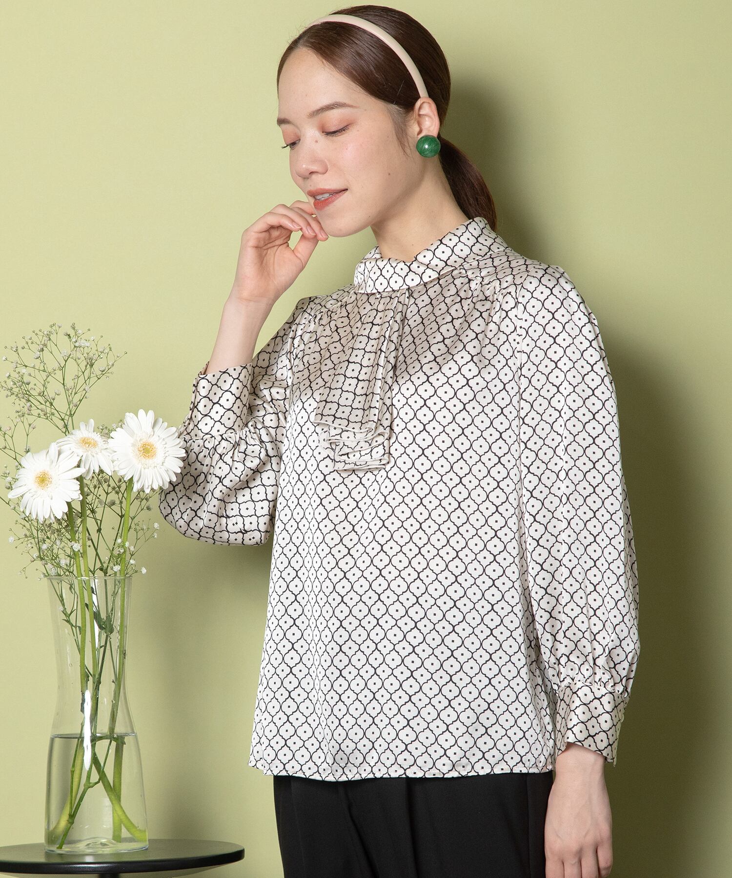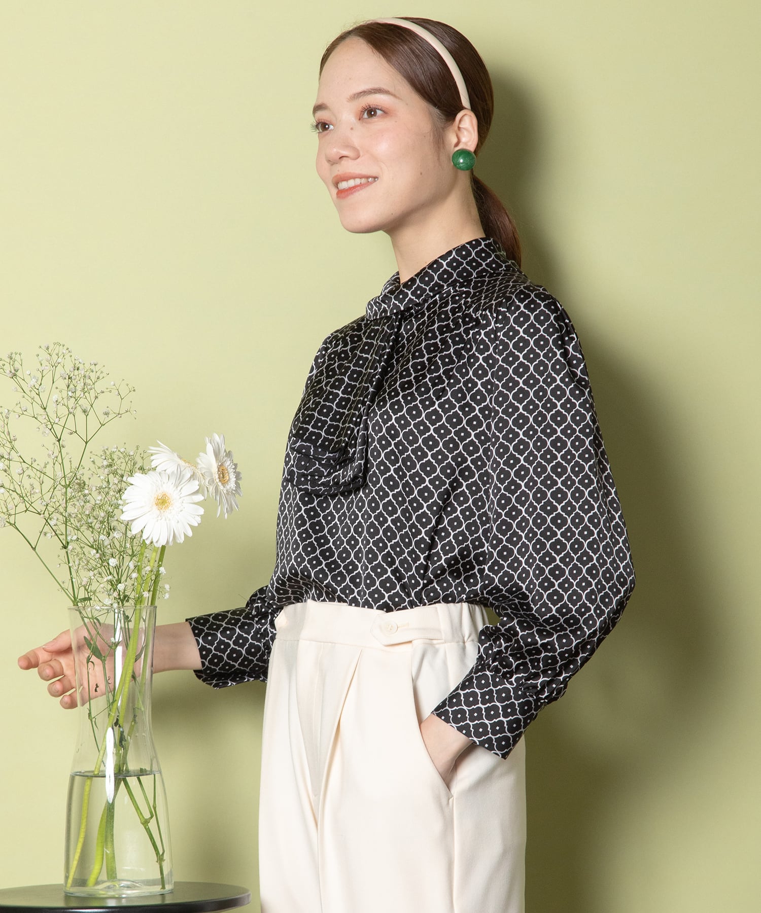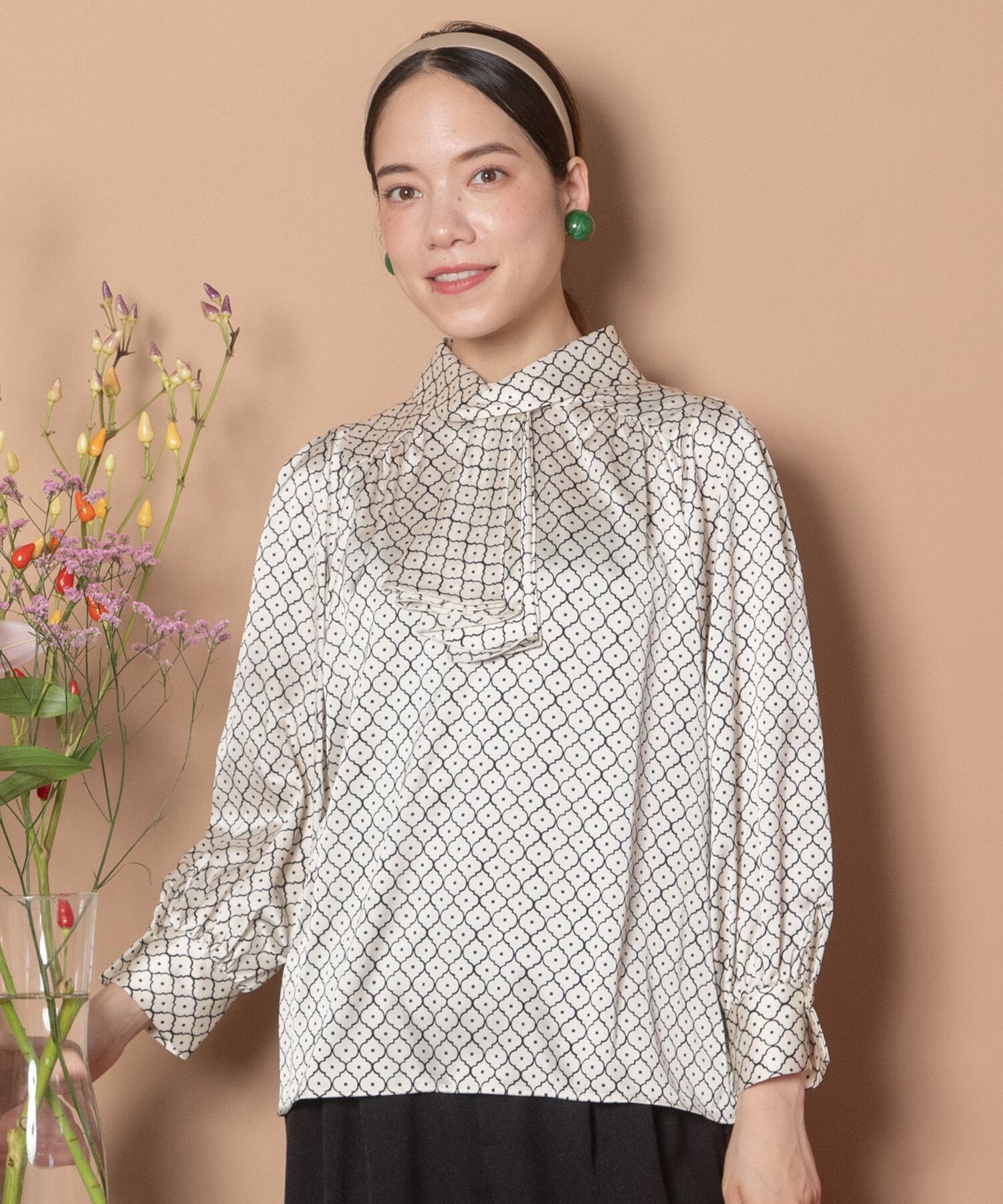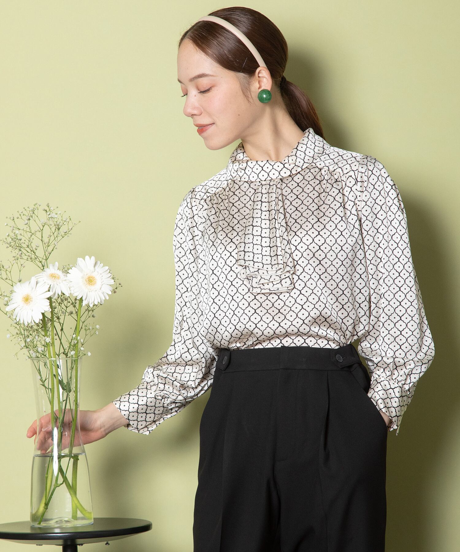 クラシカルな雰囲気の幾何学柄。ロールカラーのブラウスの襟元に、ボタンで脱着可能なボウタイが着いたデザイン。コーデに合わせて2WAYで楽しんで頂けるブラウス。ジャケットの印にもバランス良いボウタイデザイン。