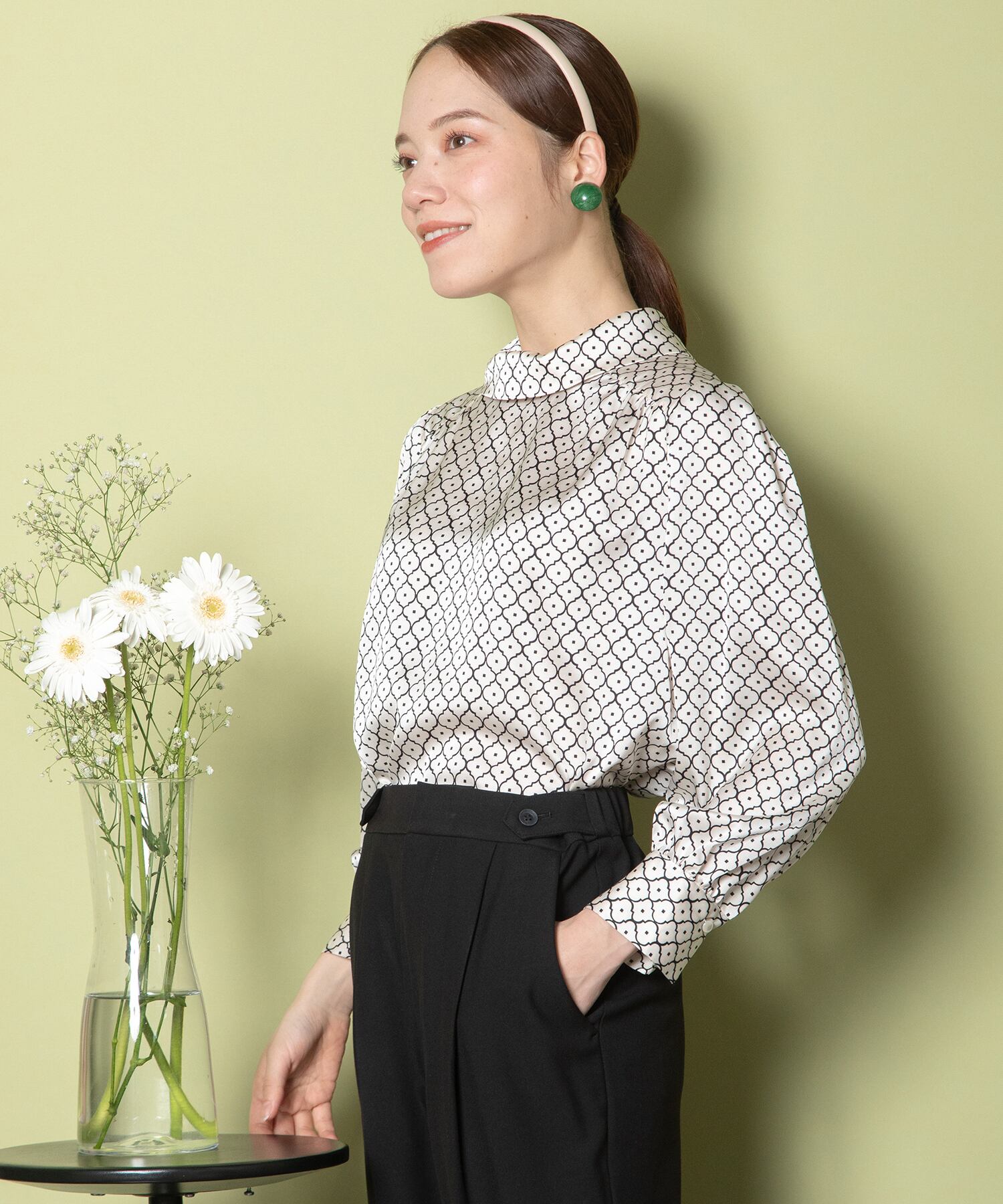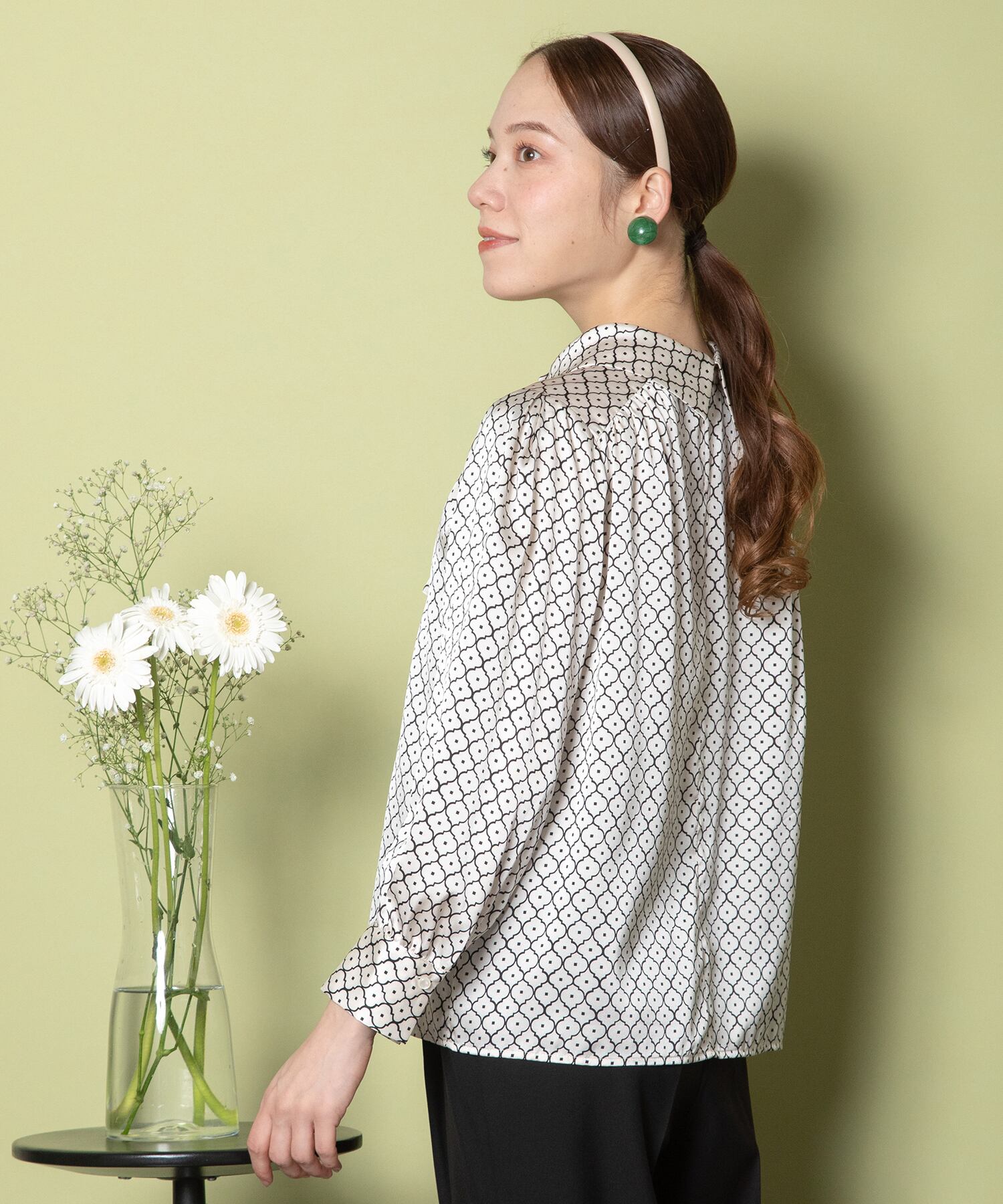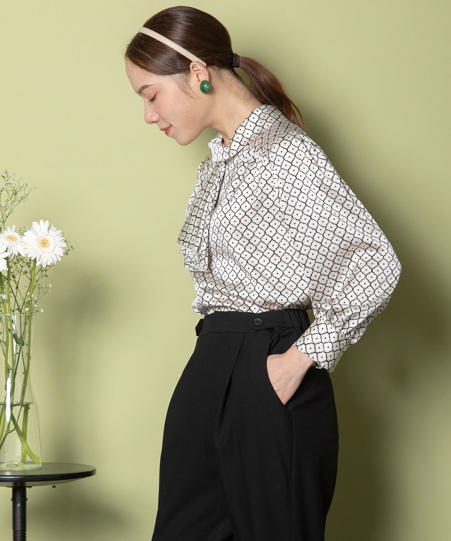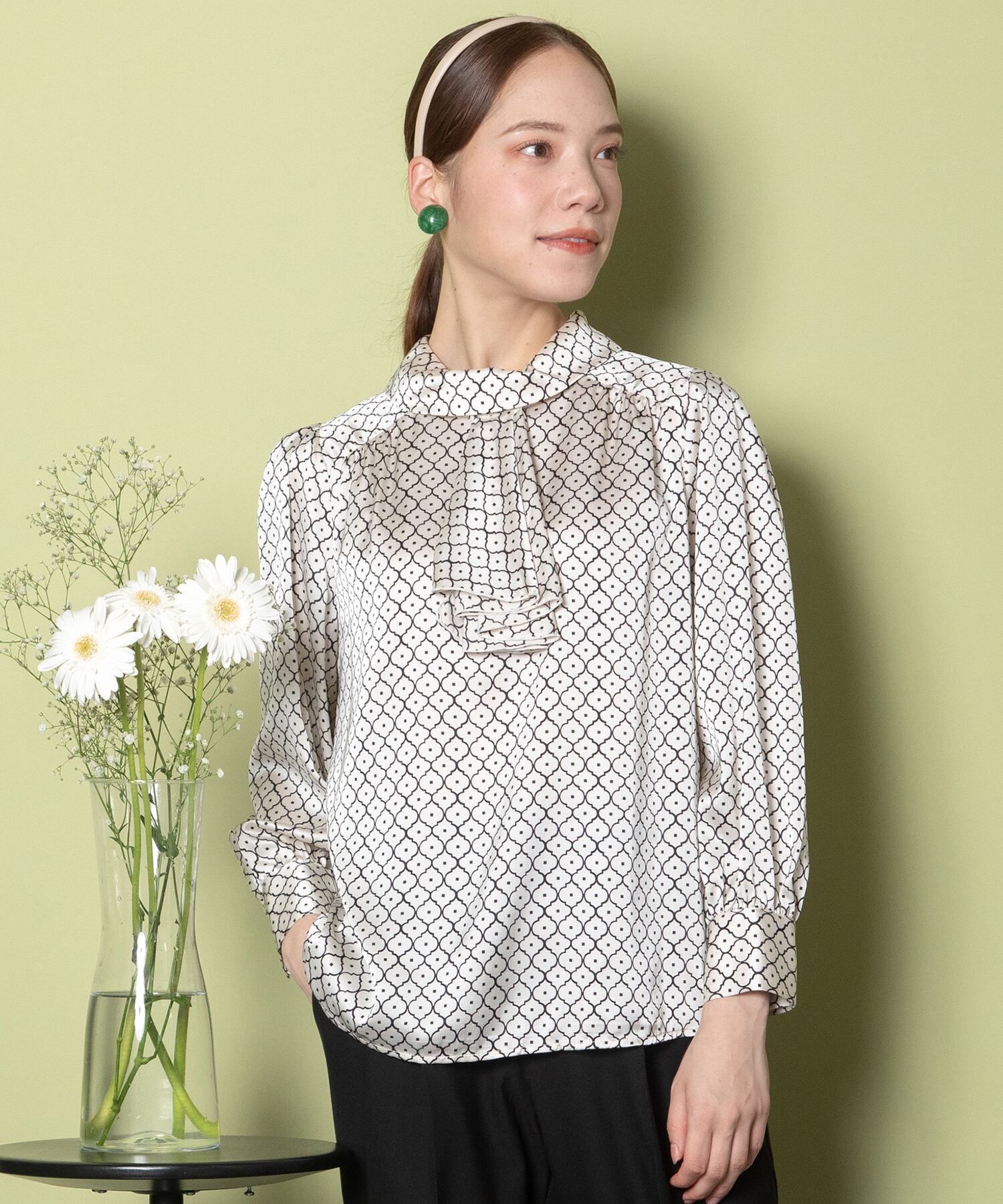 クラシカルな雰囲気の幾何学柄。ロールカラーのブラウスの襟元に、ボタンで脱着可能なボウタイが着いたデザイン。コーデに合わせて2WAYで楽しんで頂けるブラウス。ジャケットの印にもバランス良いボウタイデザイン。