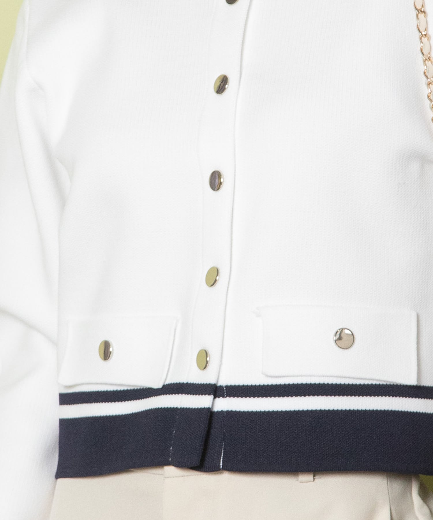 気軽に羽織れて人気のノーカラーニットジャケット。トレンドの短めのクロップド丈。裾と袖に配色ラインとスナップボタンデザインで程よいカジュアル感のあるアイテム。